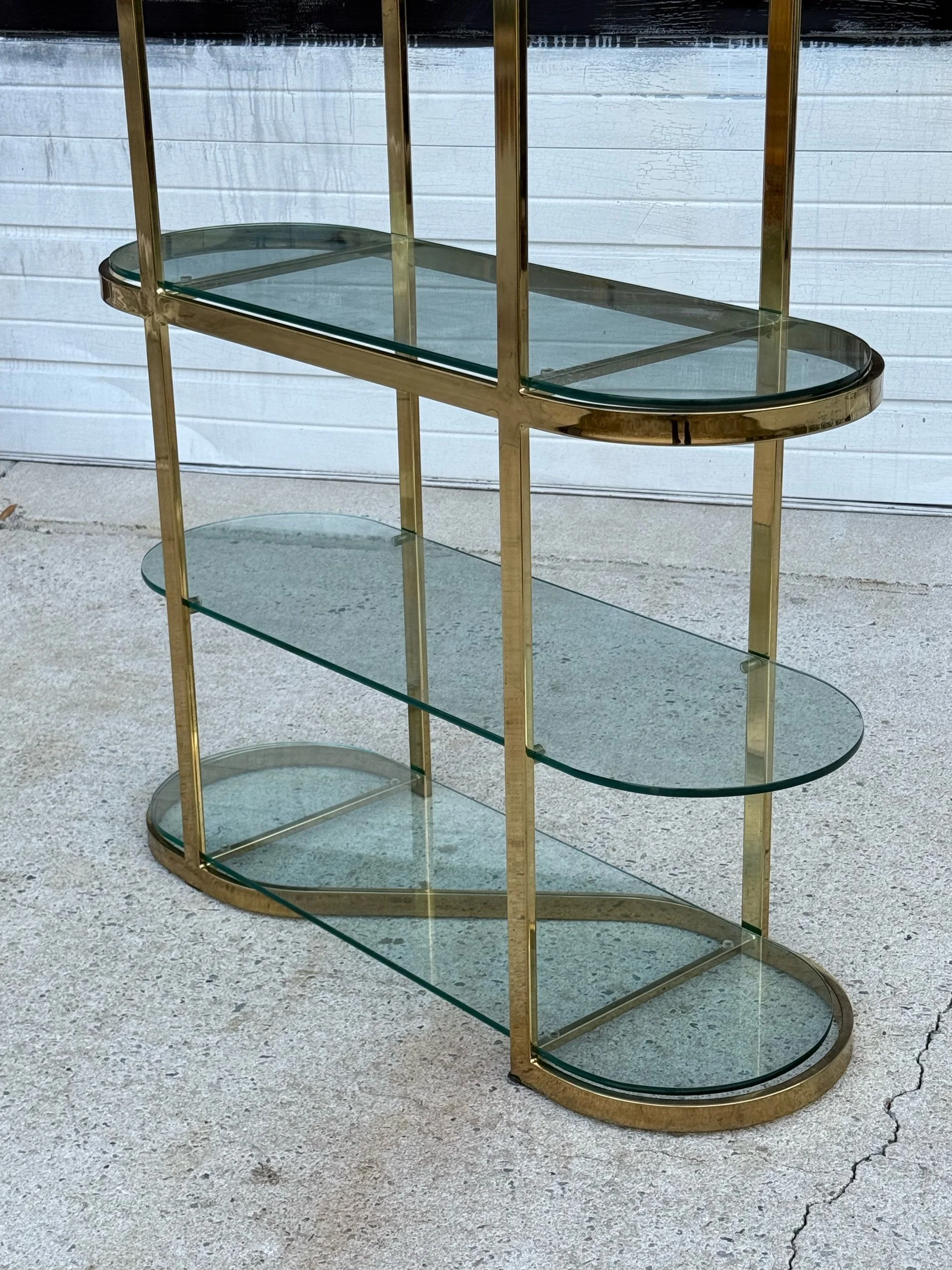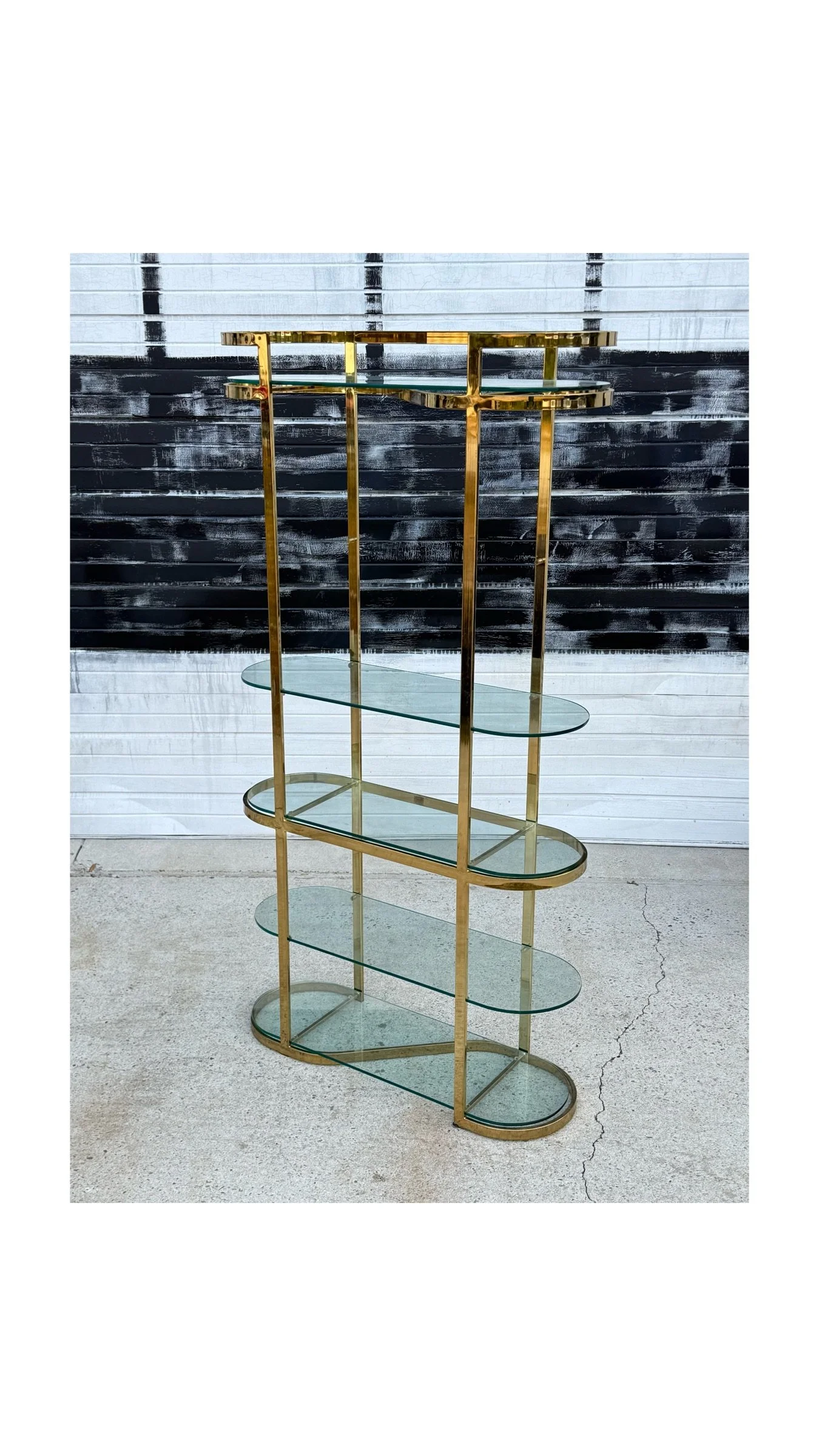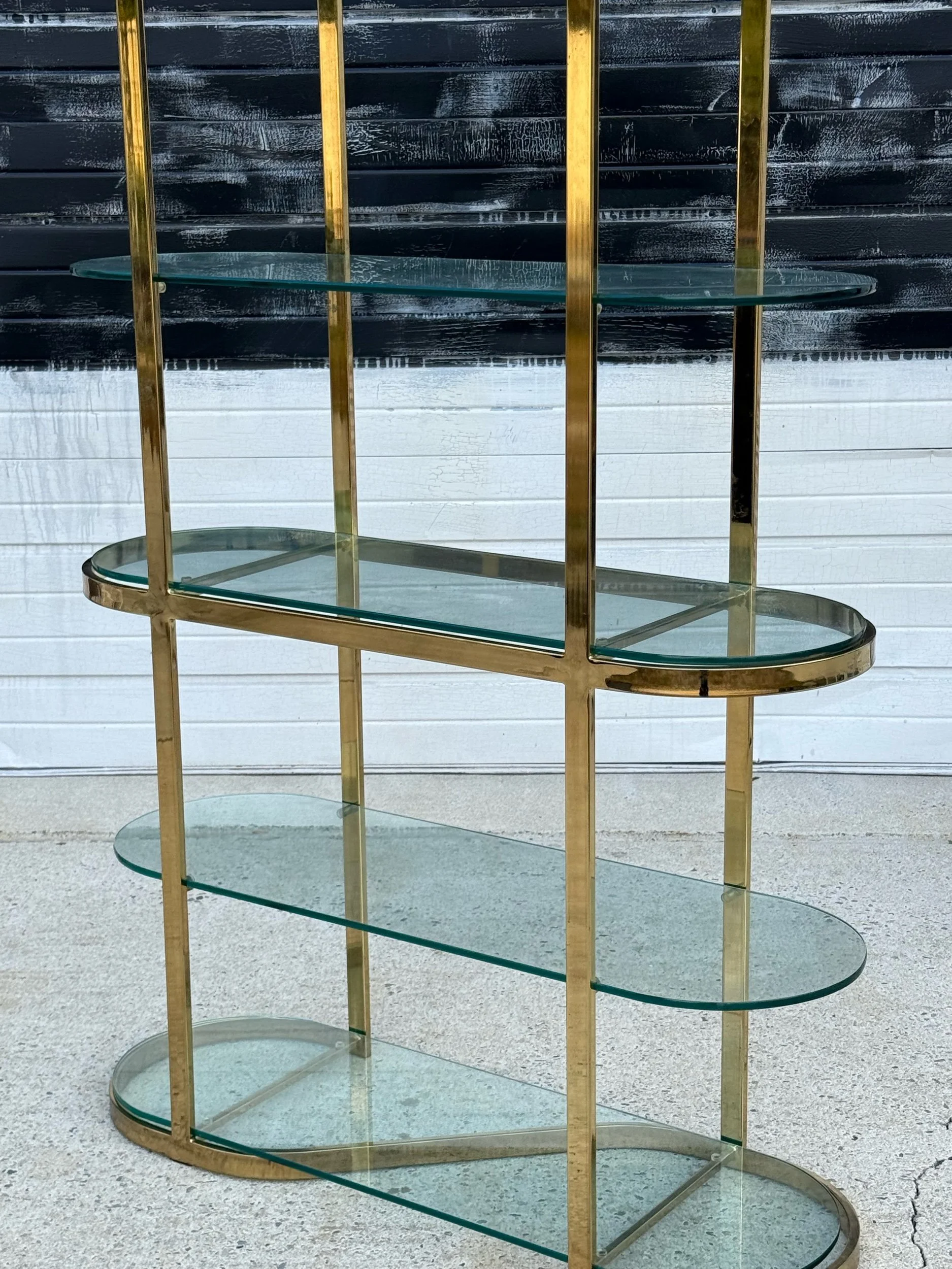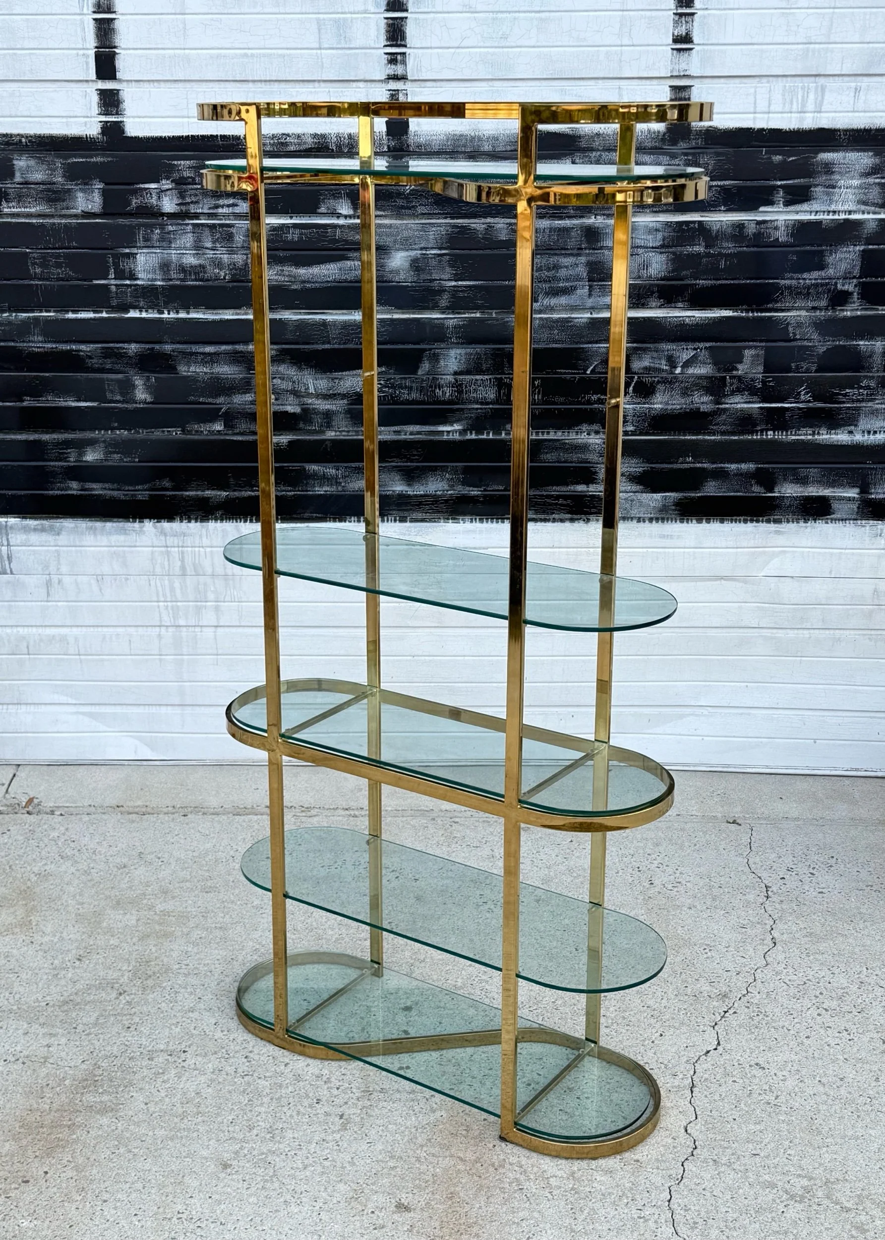 Brass and glass etagere in the style of Milo Baughman. This piece is tall, but also quite slender which allows a perfect display without sacrificing too much floor space. Featuring five oval shaped glass inserts that create shelving. The brass has an s-shape at both the top and bottom that adds stability while giving the piece a more art deco aesthetic. A wonderful piece to display a collection of glassware, perfume collection, books, or other trinkets. In good condition with minor wear present.