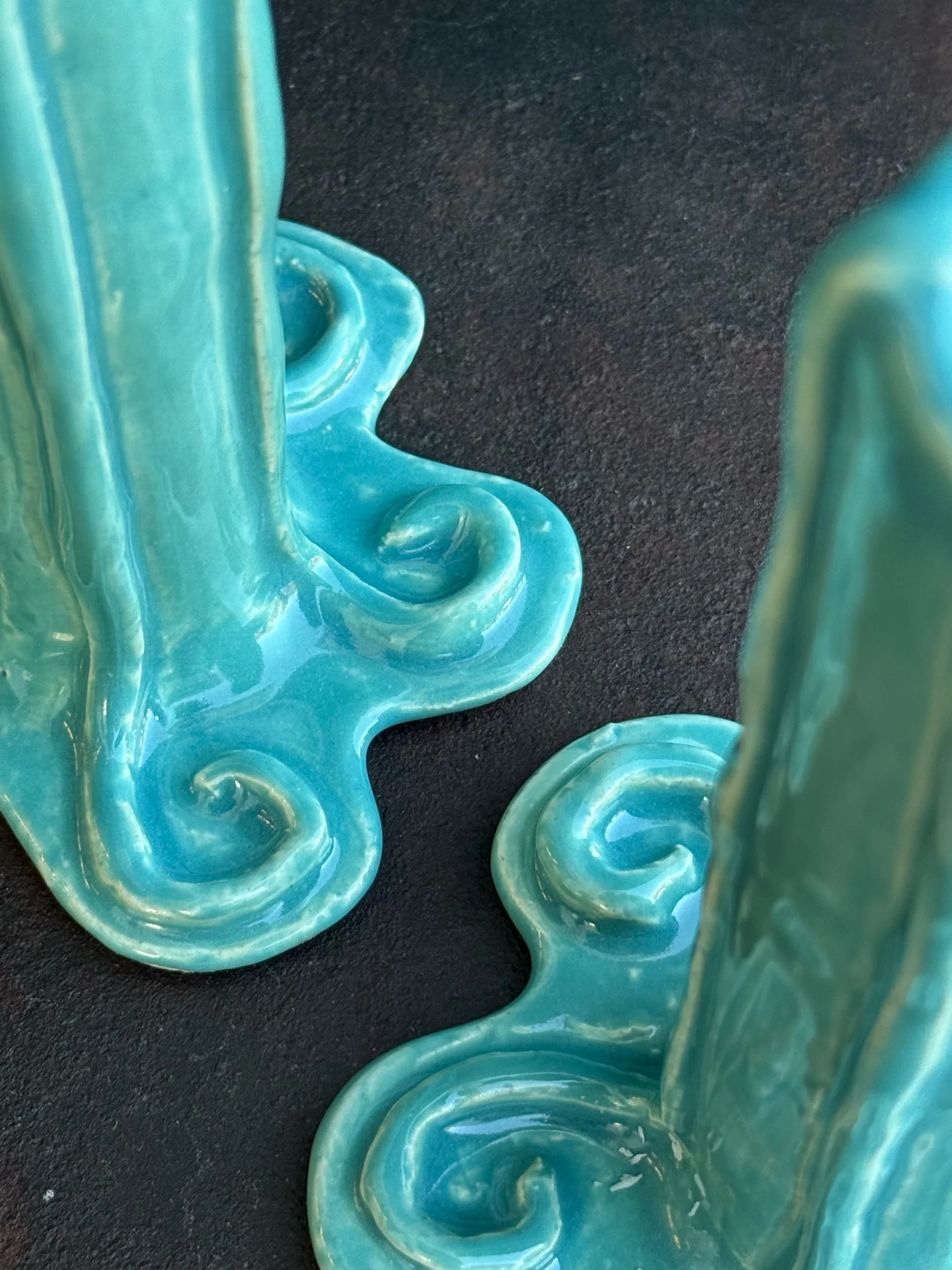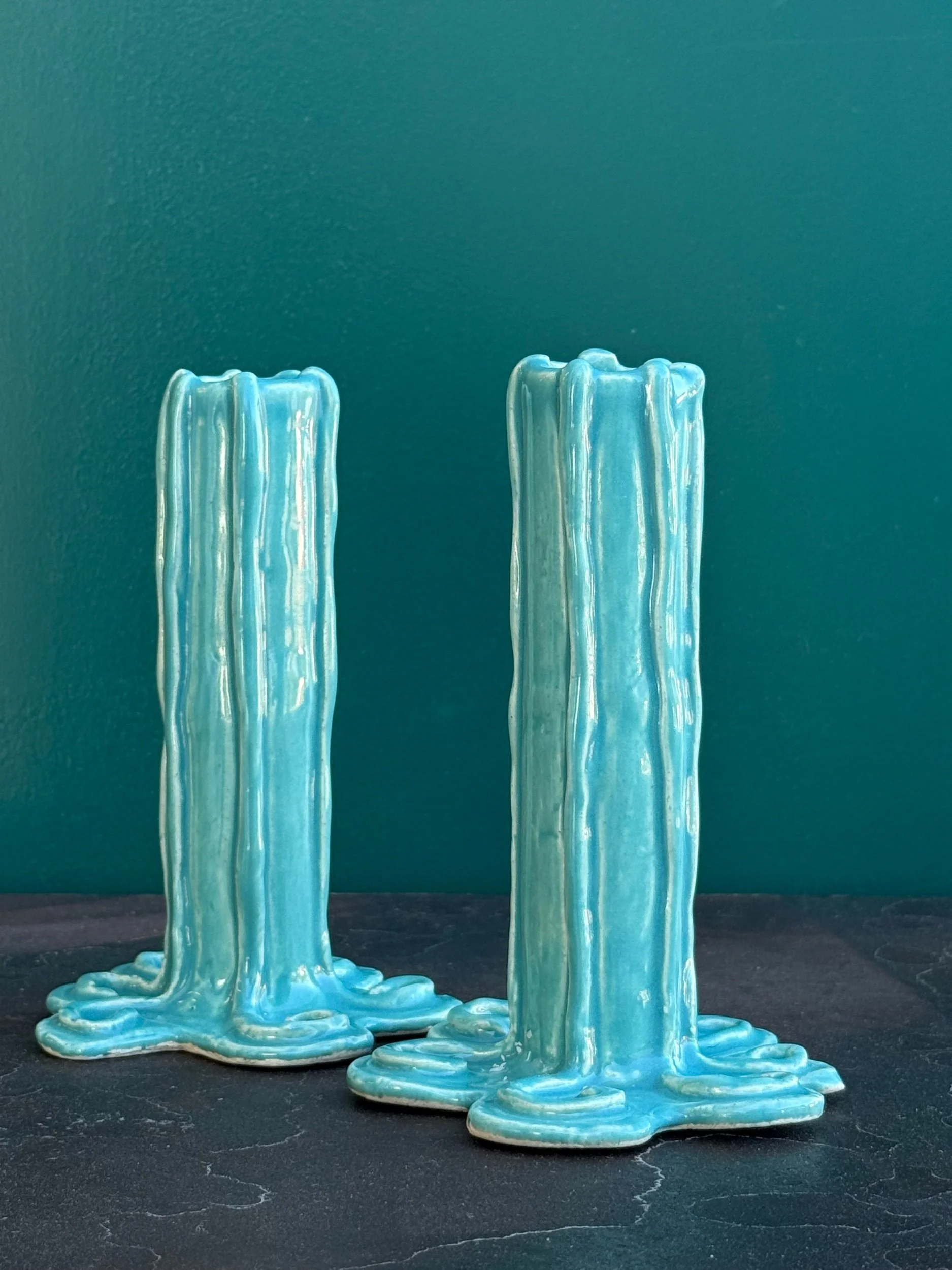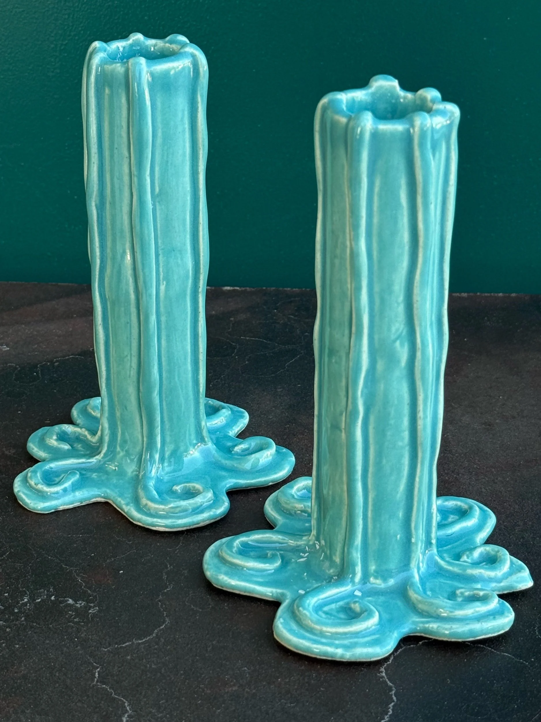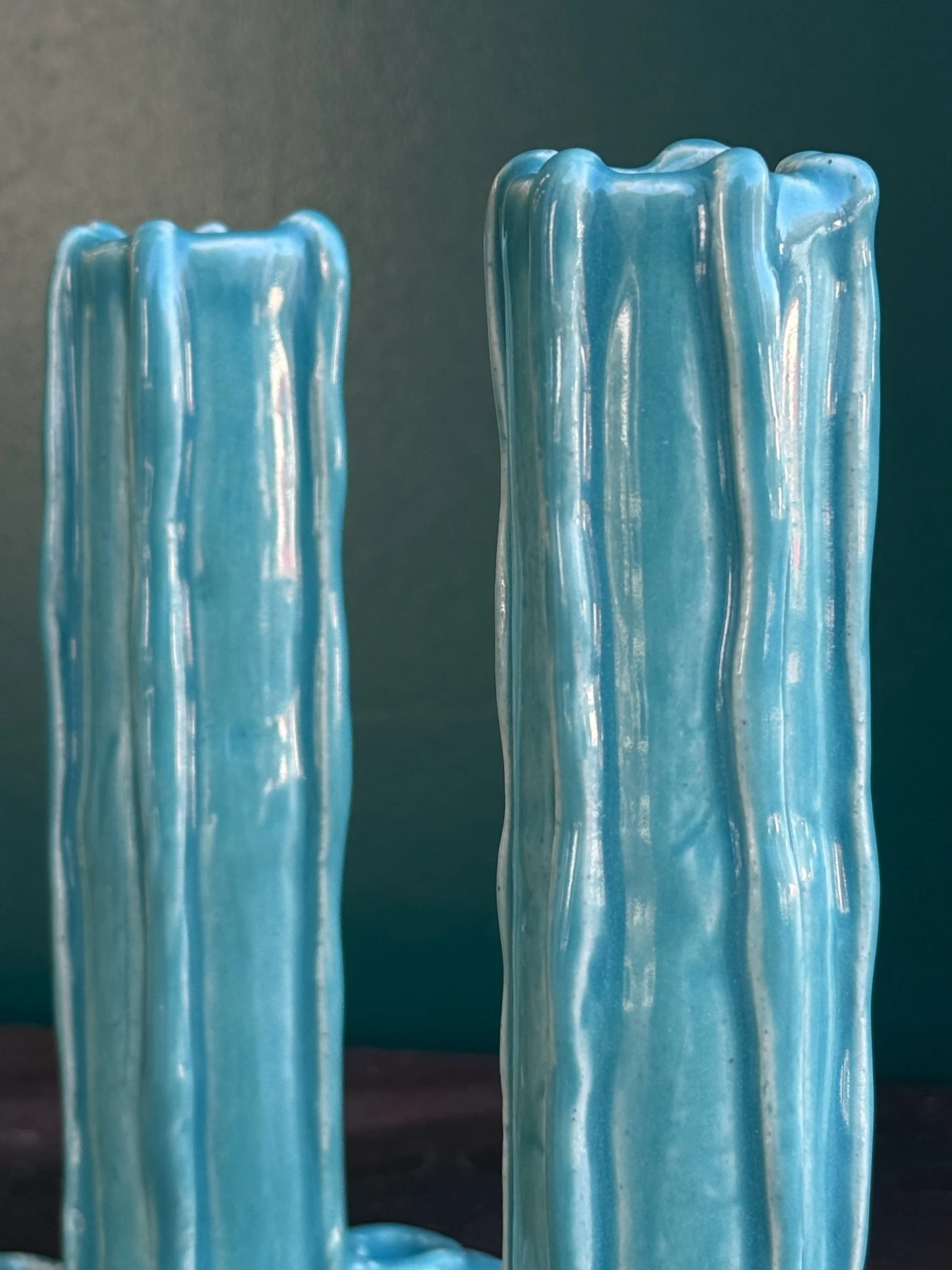 This version is the taller pair of the two pairs we have available by Portanova. A gorgeous light blue underglaze makes this pair pop and adds a bit of fun to your decor. The cylindrical body is accented with raised lines lead down the body and curve at the base. The lines create dimension and is reminiscent of a melted tapered candle or octopus tentacles. A perfect pair for your dining table decor or atop a credenza.
