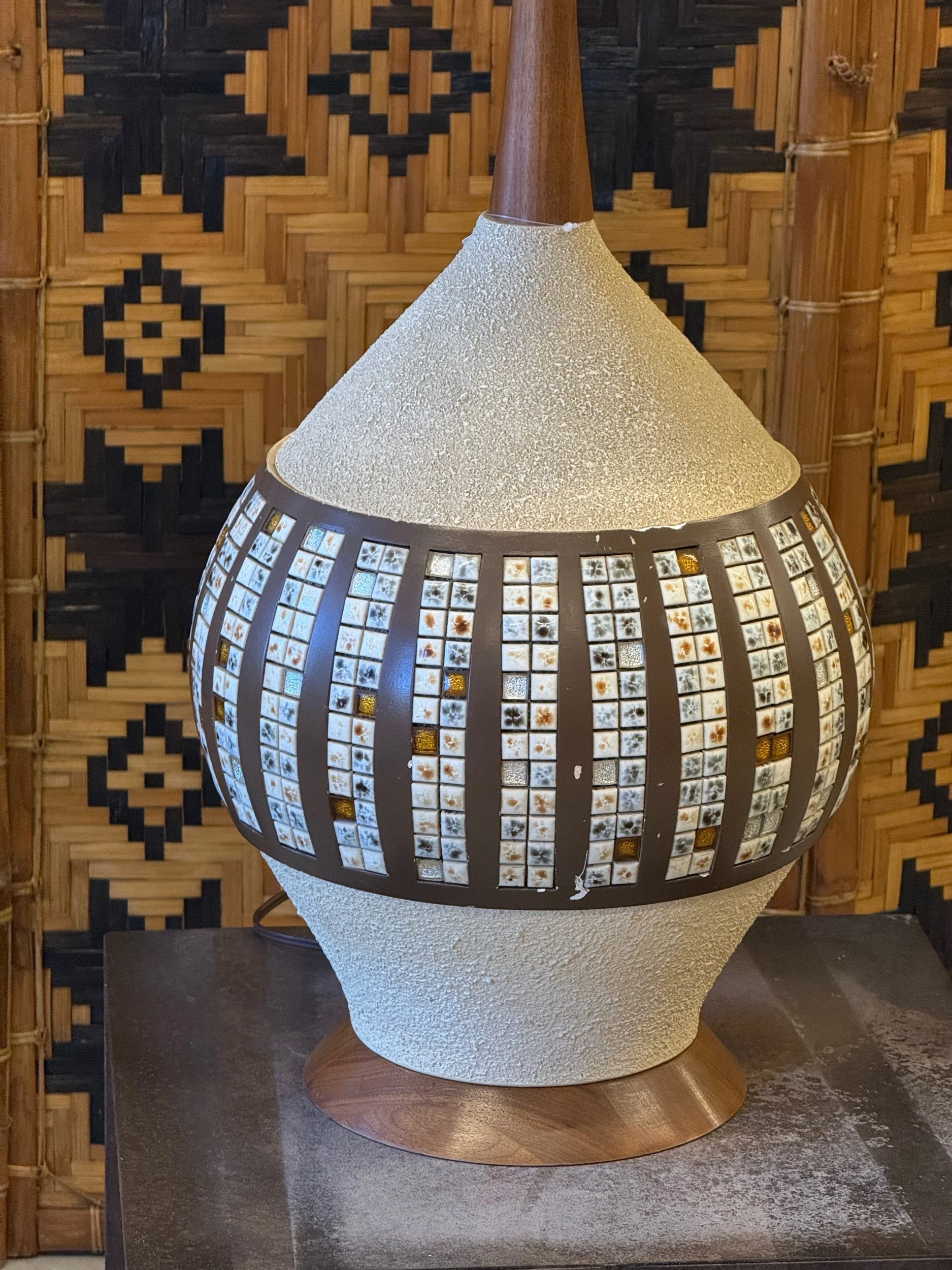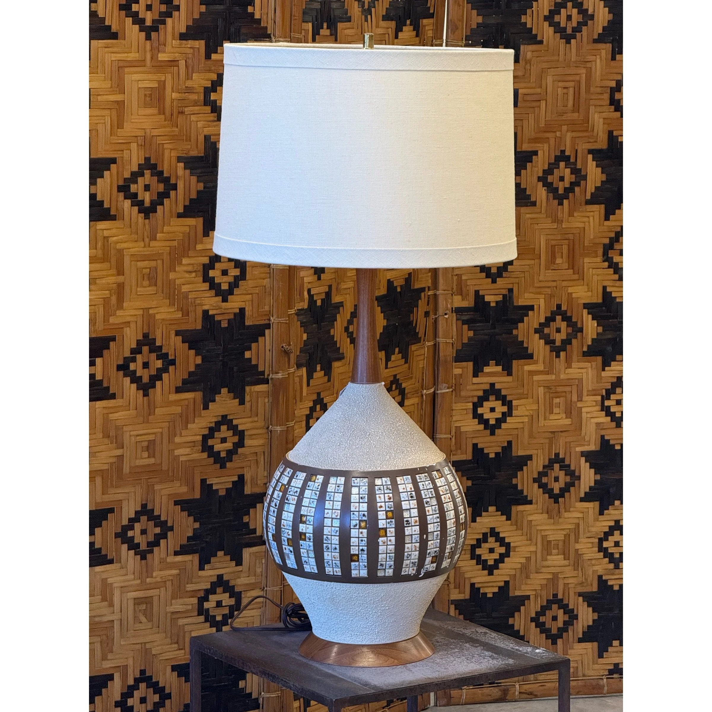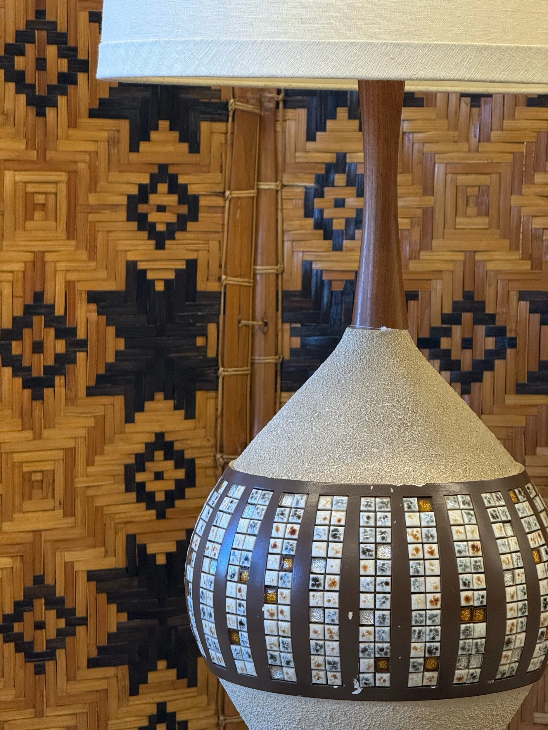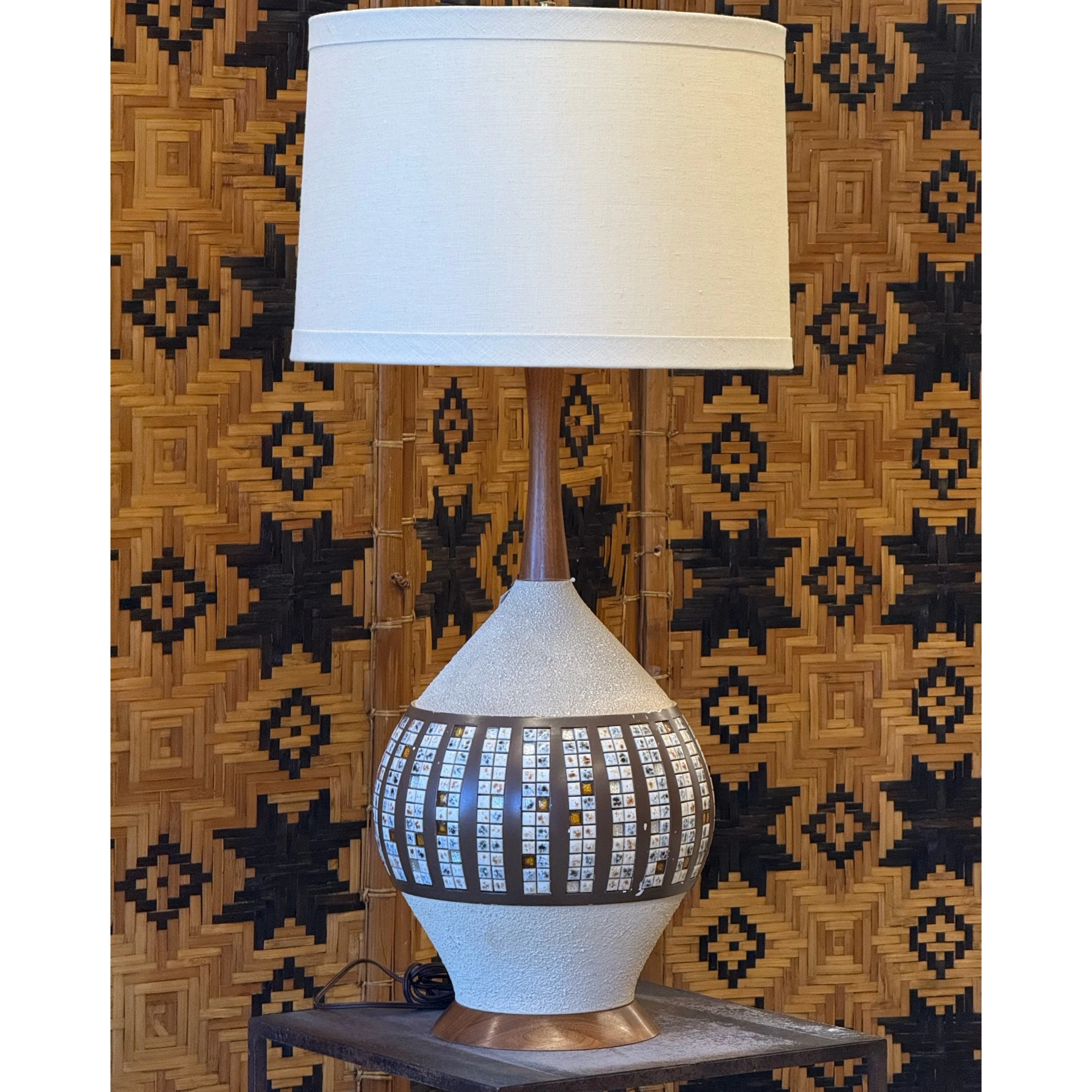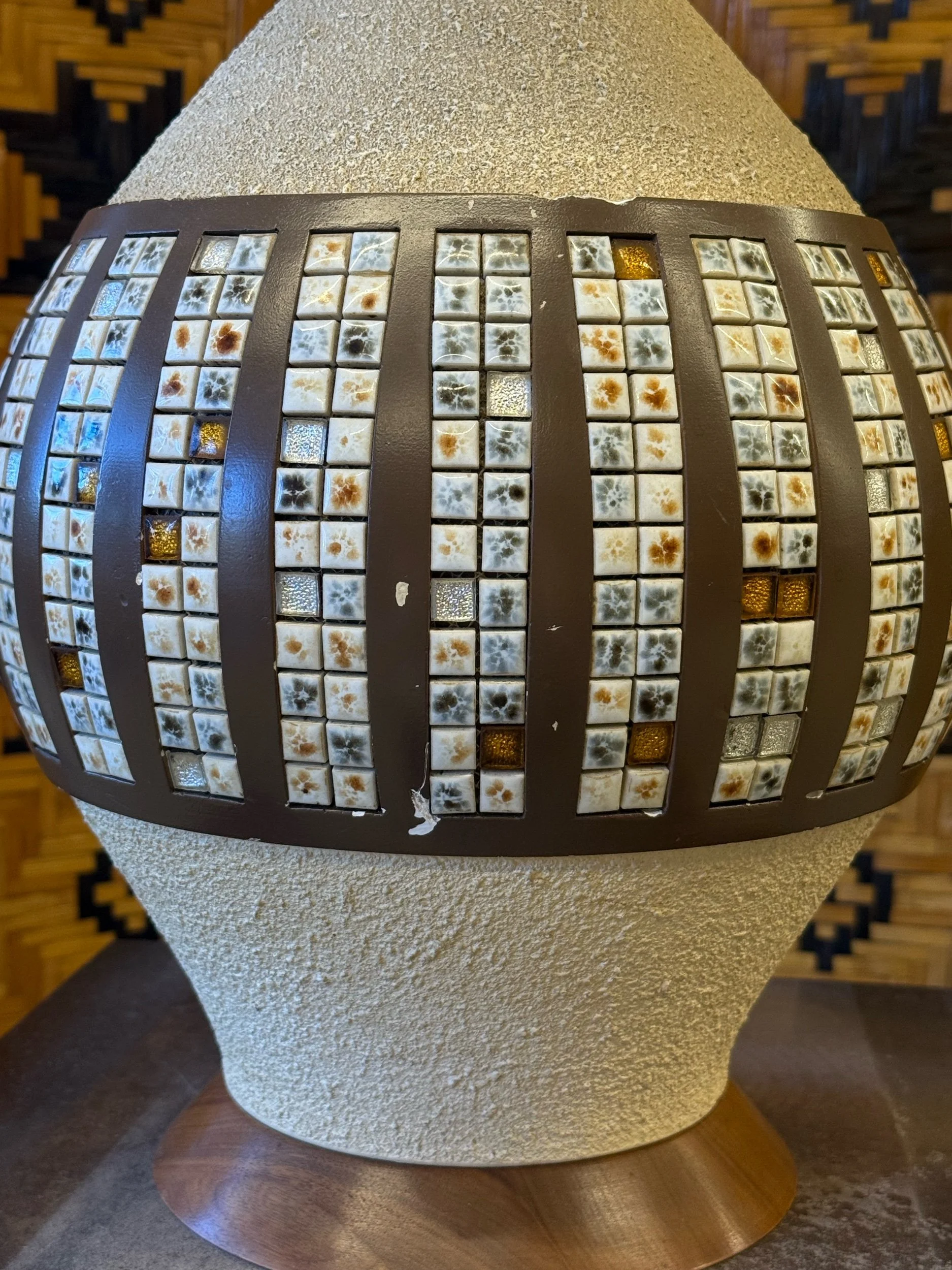 Single vintage large table lamp made by Quartite Ceramic Corp based out of New York. This tall lamp features a round ceramic body with mosaic tile accents that range in color. The ceramic is tan and textured. Sitting atop a rounded wooden base with a wooden neck. Perfectly mid-century with harp and shade included. In overall good vintage condition. Wear is present as pictured.