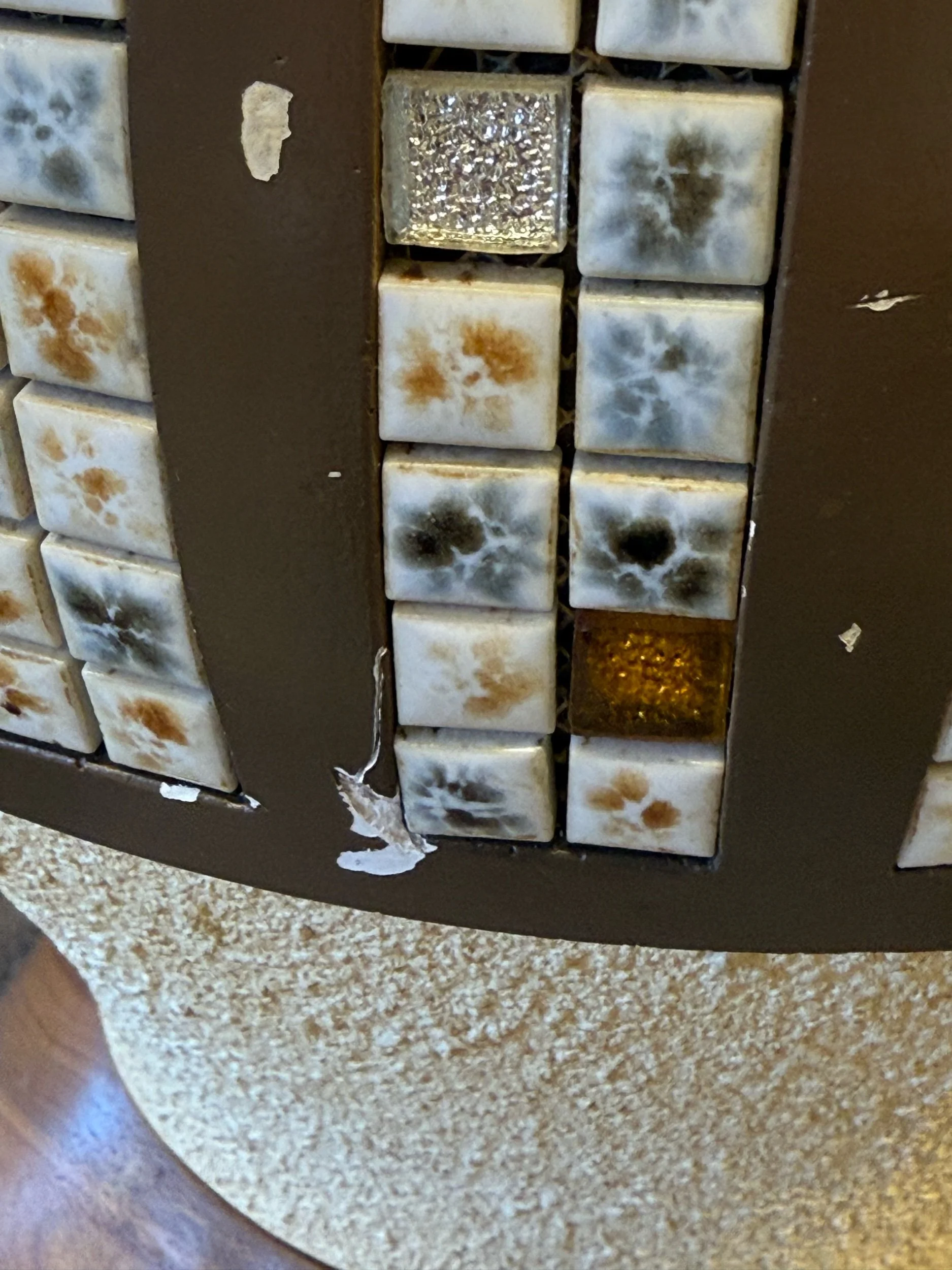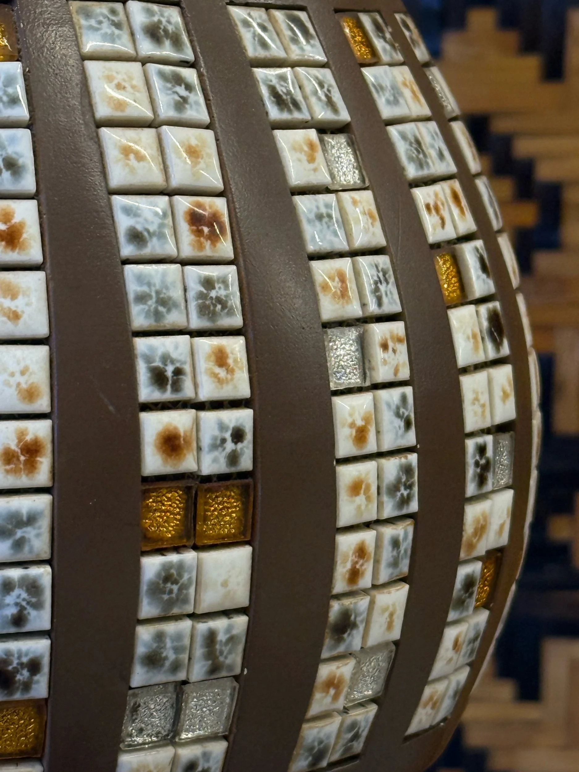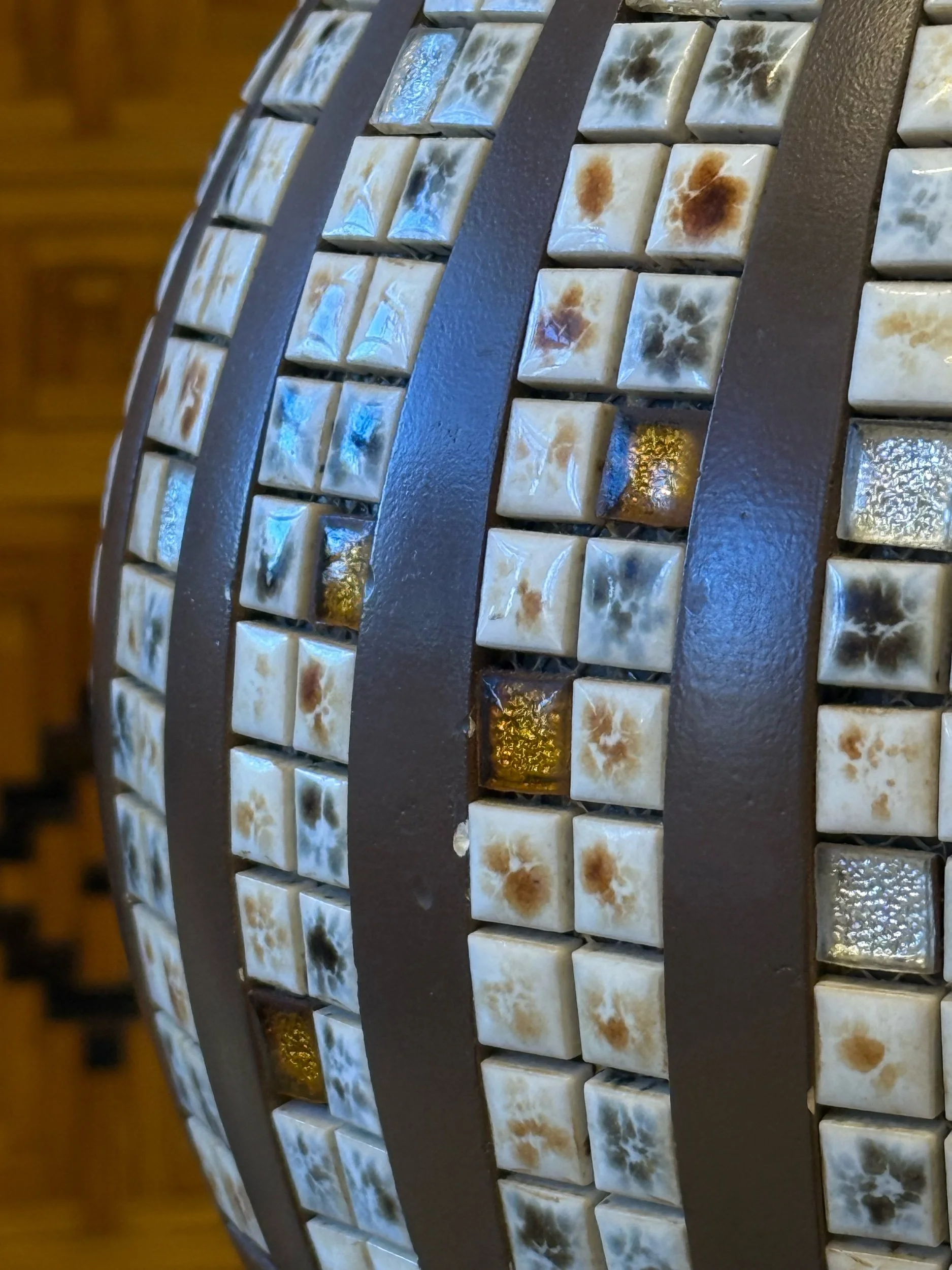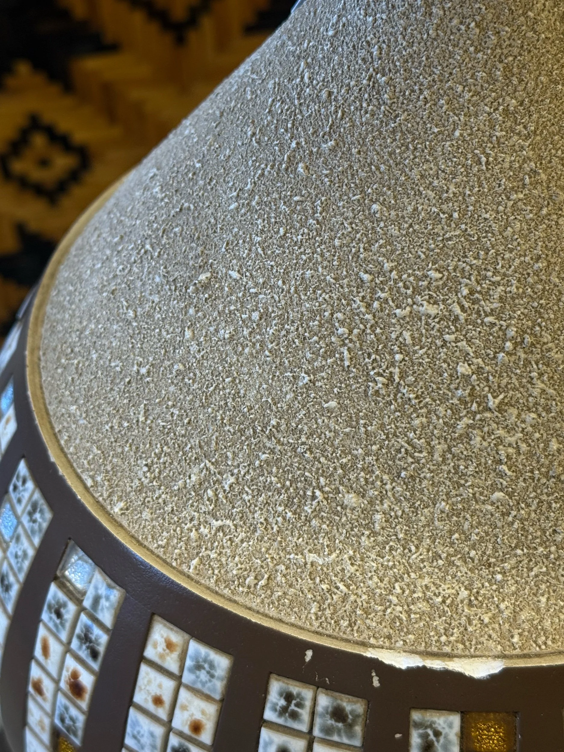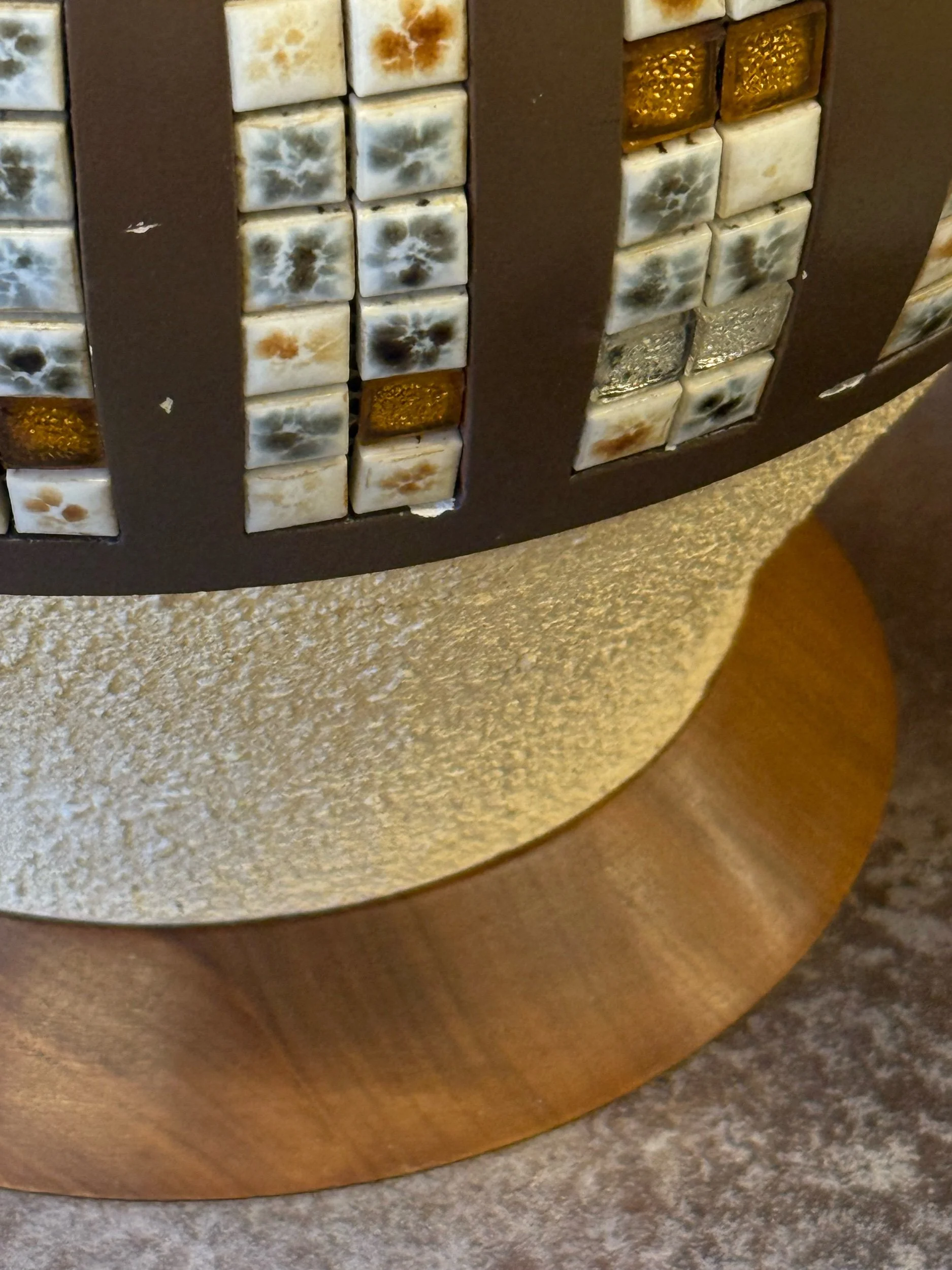 Single vintage large table lamp made by Quartite Ceramic Corp based out of New York. This tall lamp features a round ceramic body with mosaic tile accents that range in color. The ceramic is tan and textured. Sitting atop a rounded wooden base with a wooden neck. Perfectly mid-century with harp and shade included. In overall good vintage condition. Wear is present as pictured.