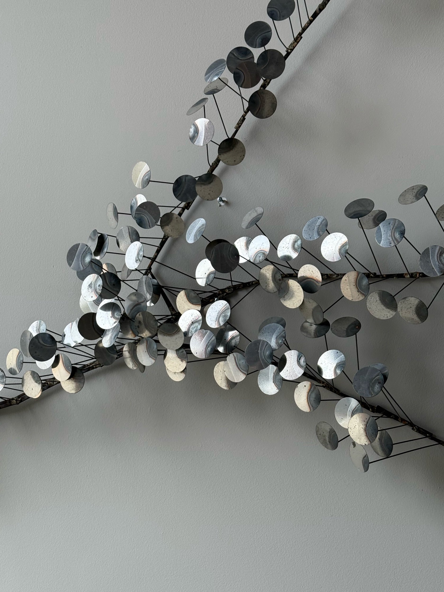 Large vintage metal wall art sculpture. Welded nail backing with circular metal discs protruding. This piece is in the style of Curtis Jere especially similar to the “raindrops” sculpture. It can be hung vertically as pictured or horizontally. In good vintage condition with minor patina consistent with age.