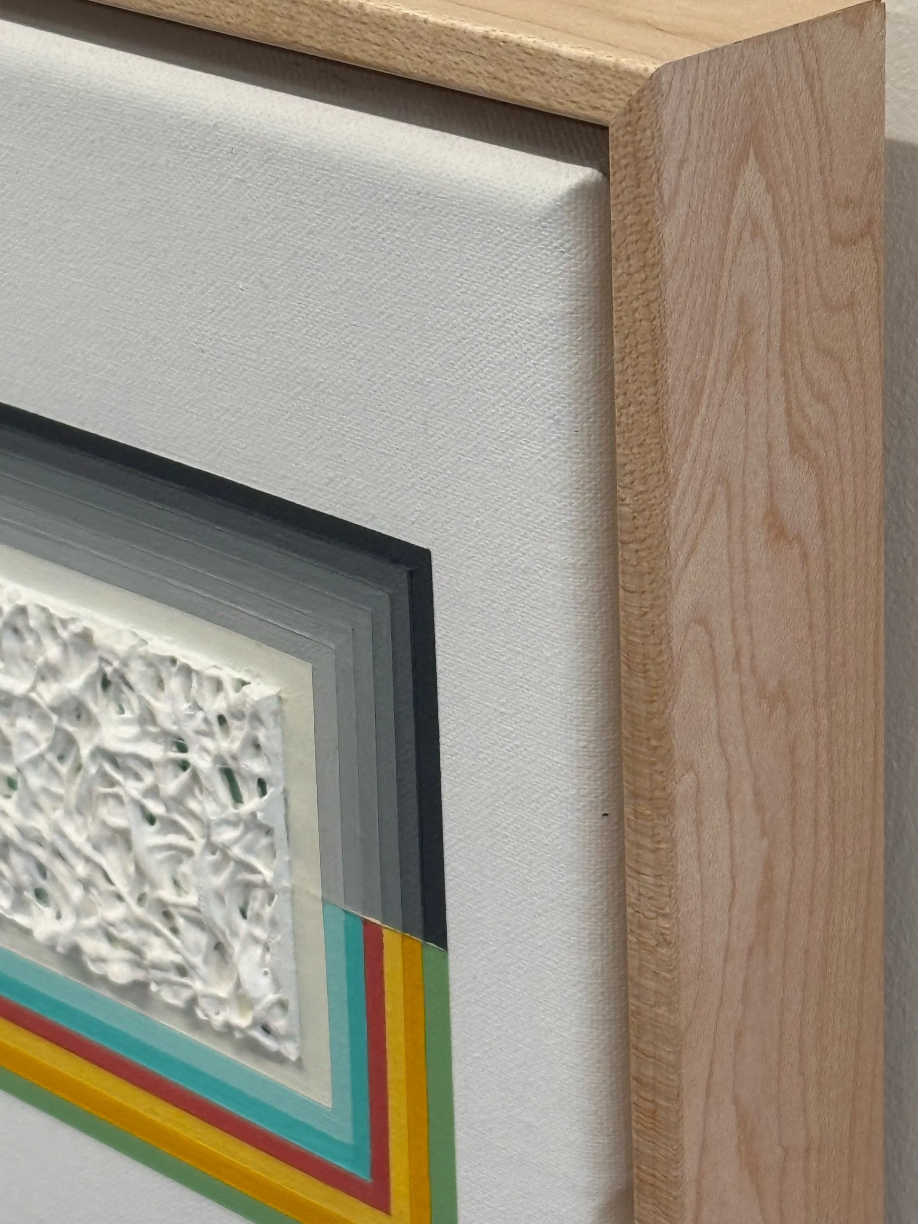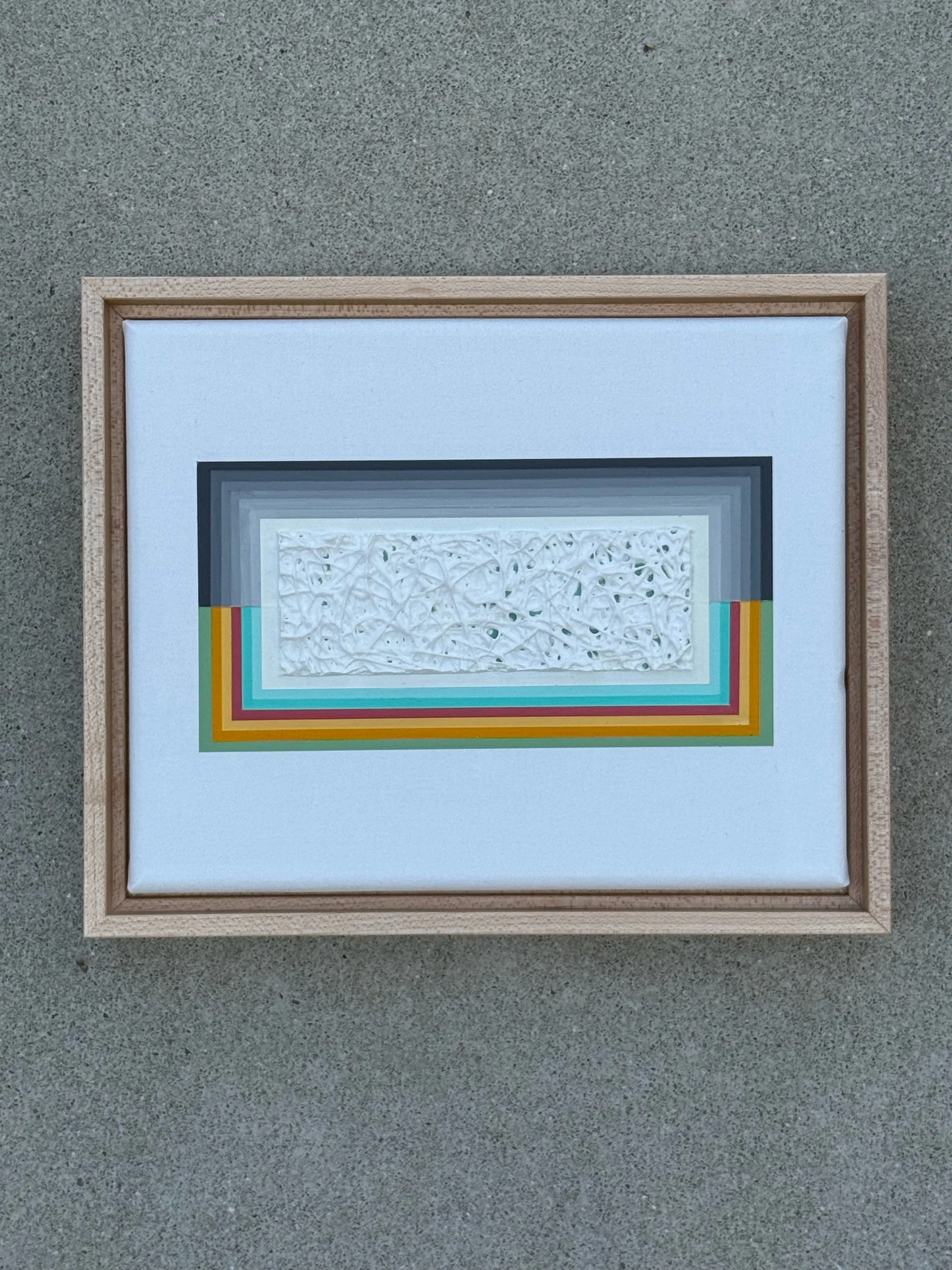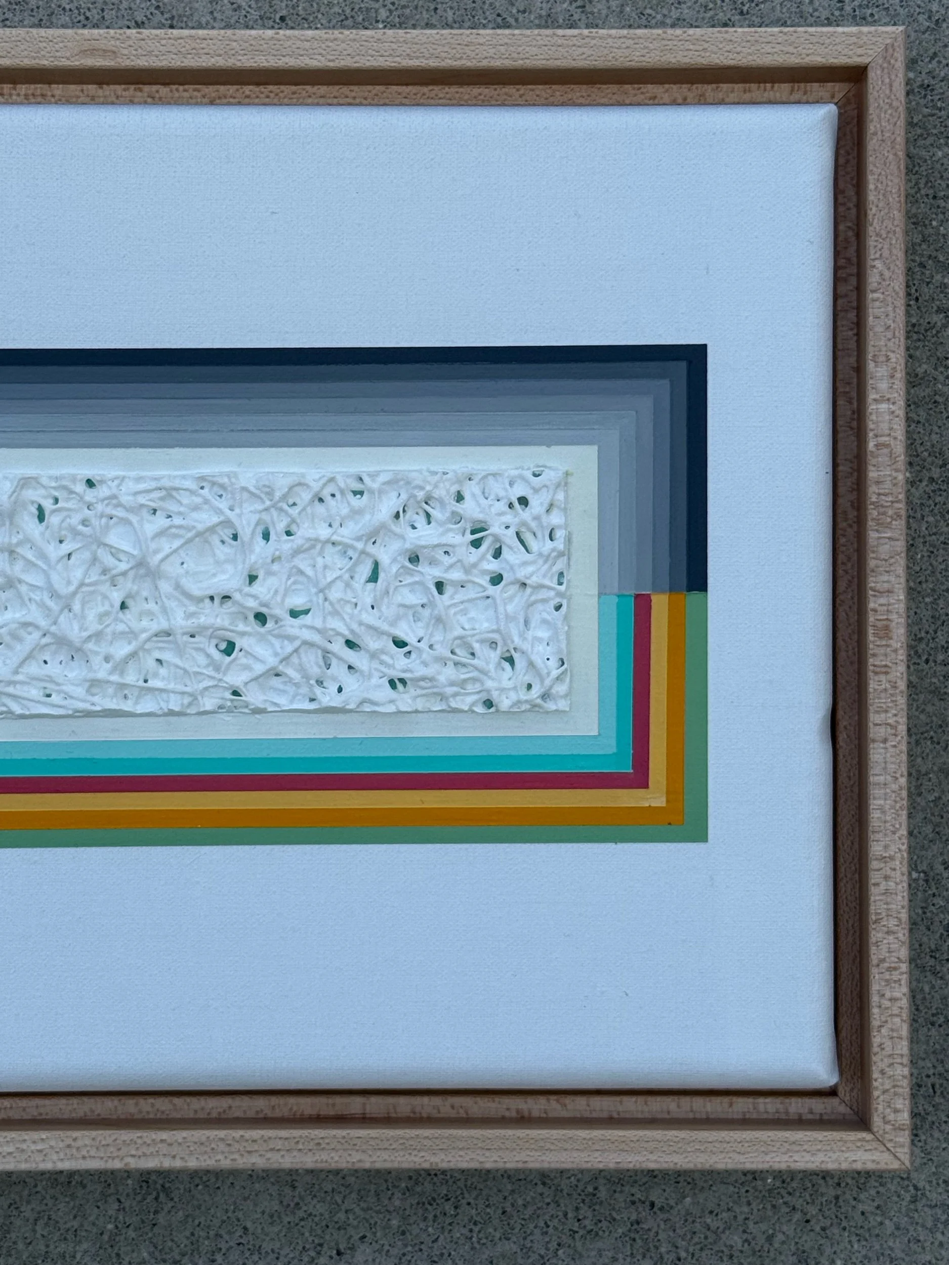 Mixed media artwork with black to gray gradient lines on the upper portion of the rectangular shape and vibrant almost rainbow colors on the lower portion. The focal point of the canvas leads to a heavily textured off-white middle with speckles of color showcasing underneath. McKellar contrasts fine and precise line work with texture - a wonderful and quite fun balance. Framed in a wooden maple floater frame. This piece is small-scale, yet draws you into it and would be a wonderful addition to those with vintage or contemporary style homes.