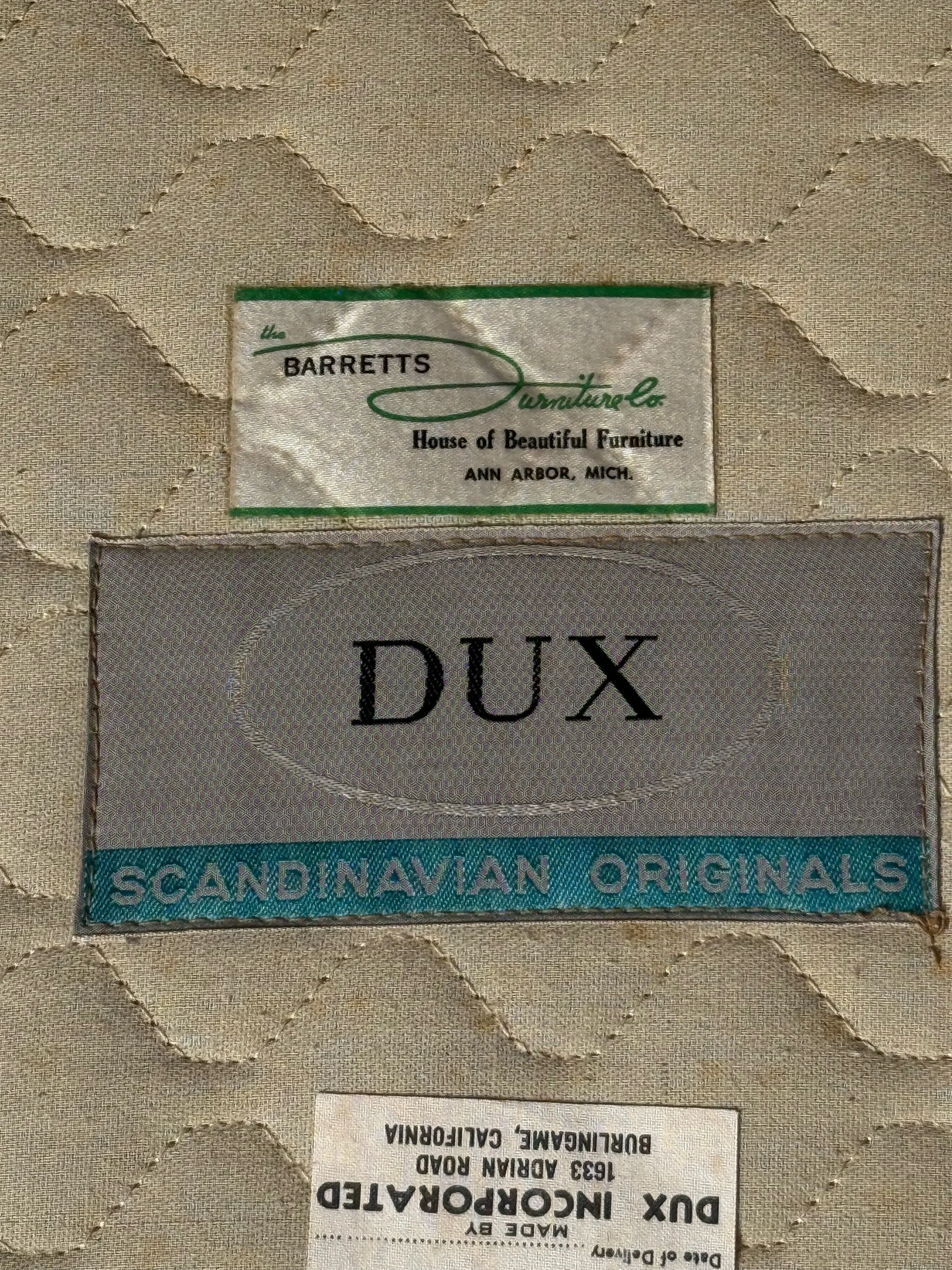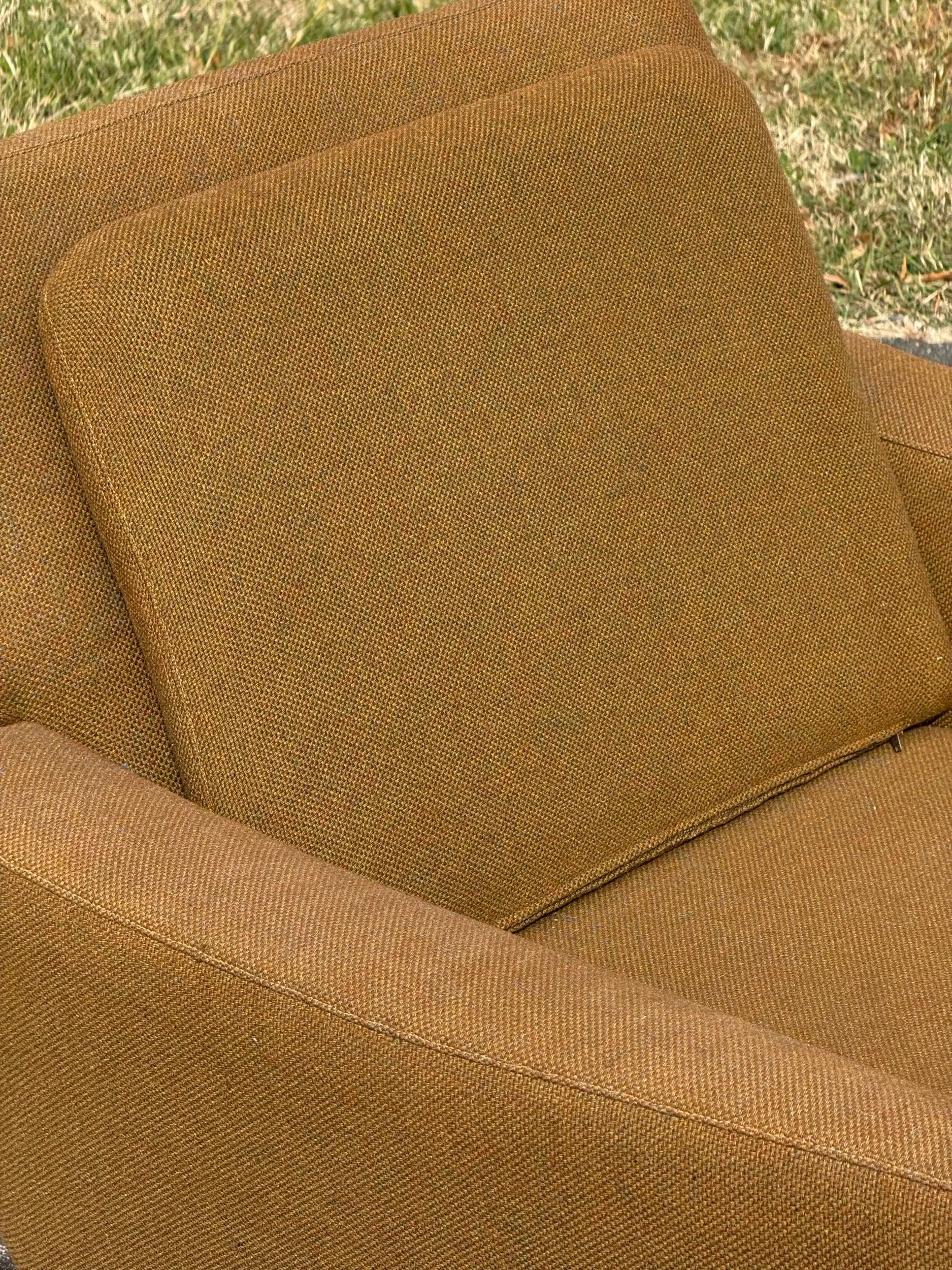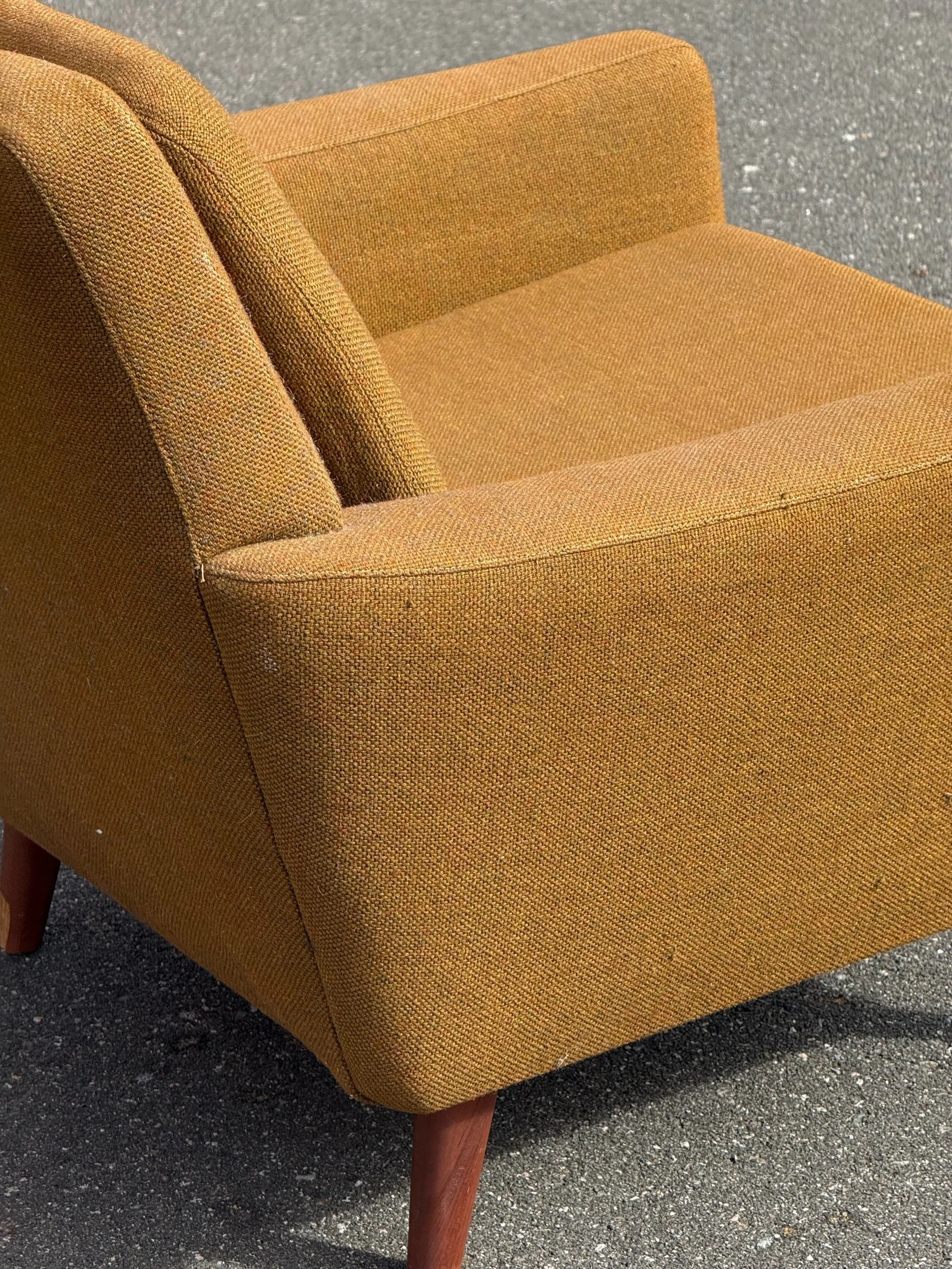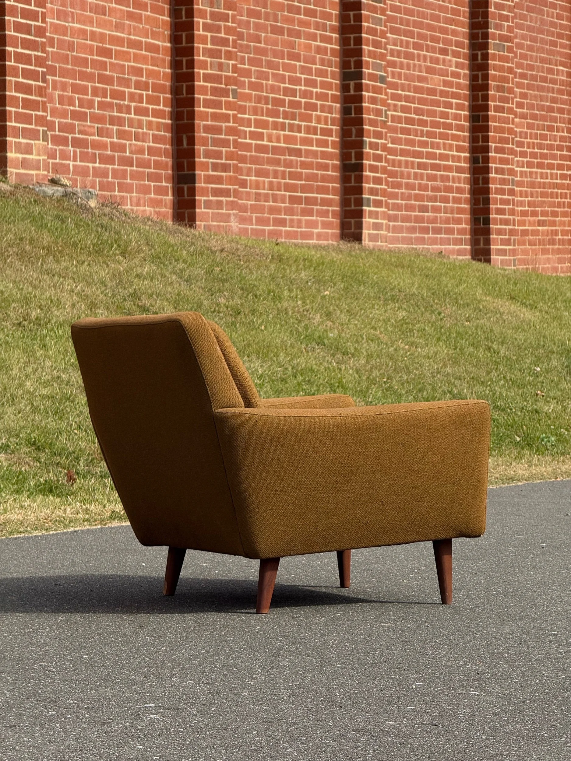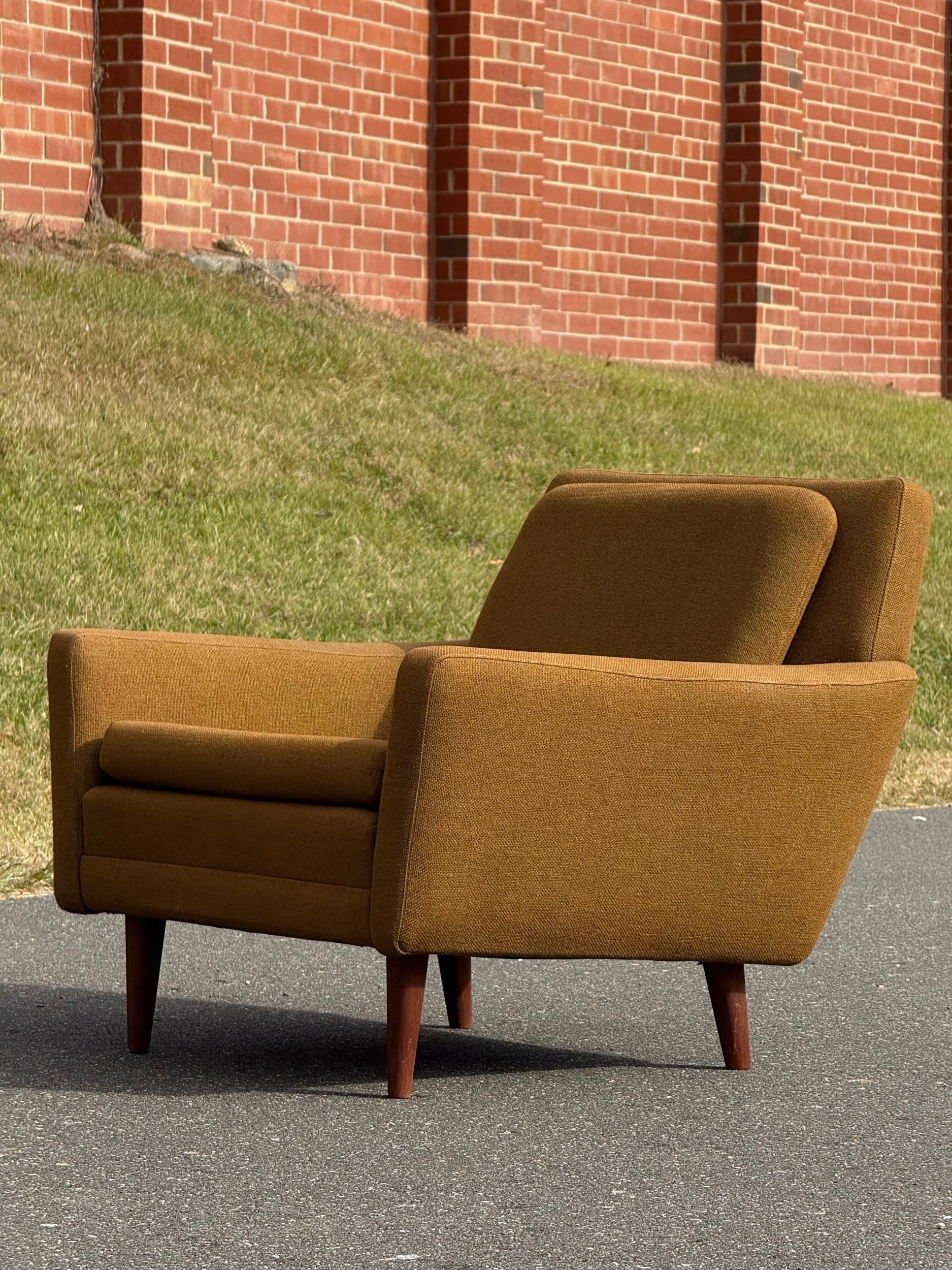 Mid-century armchair designed by Folke Ohlsson for Dux, circa 1960s. Classic mid-century lines and a boxy profile. This piece looks great from every angle. Fantastic armrests and sitting atop four wooden tapered legs. A perfect addition for those looking for a classic corner chair. Equipped with original tags as pictured. This piece features the original neutral brown upholstery unaltered. The condition of the fabric does have wear. Recover in a fabric that maintains the mid-century aesthetic or would look great in an updated fabric choice.