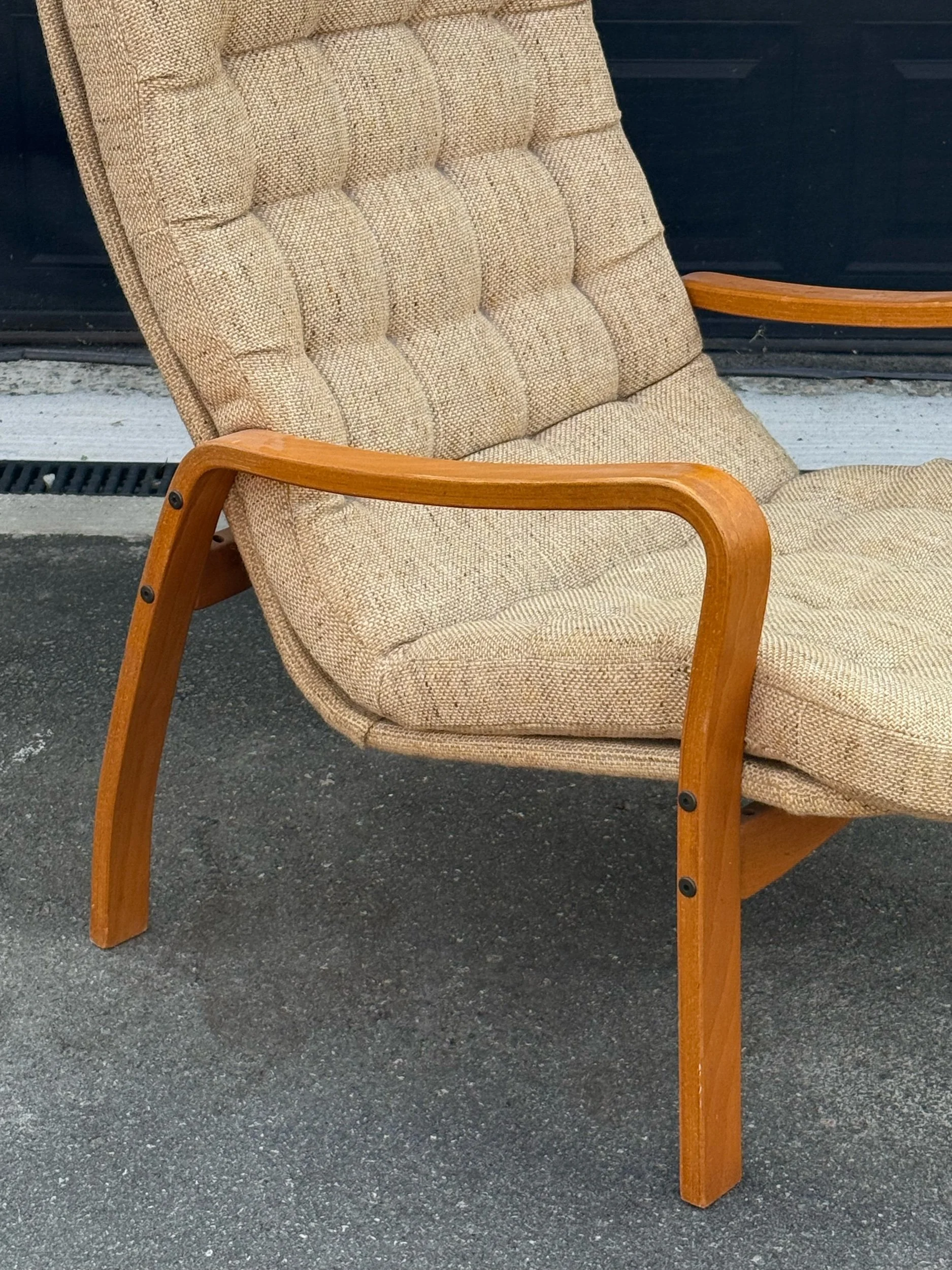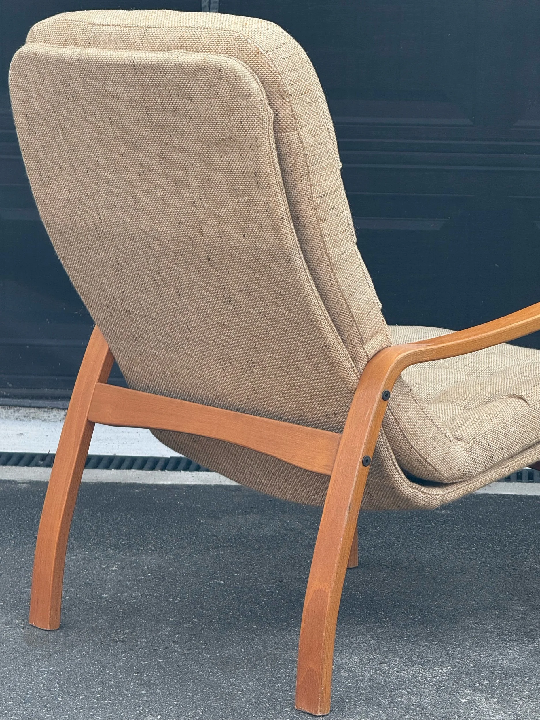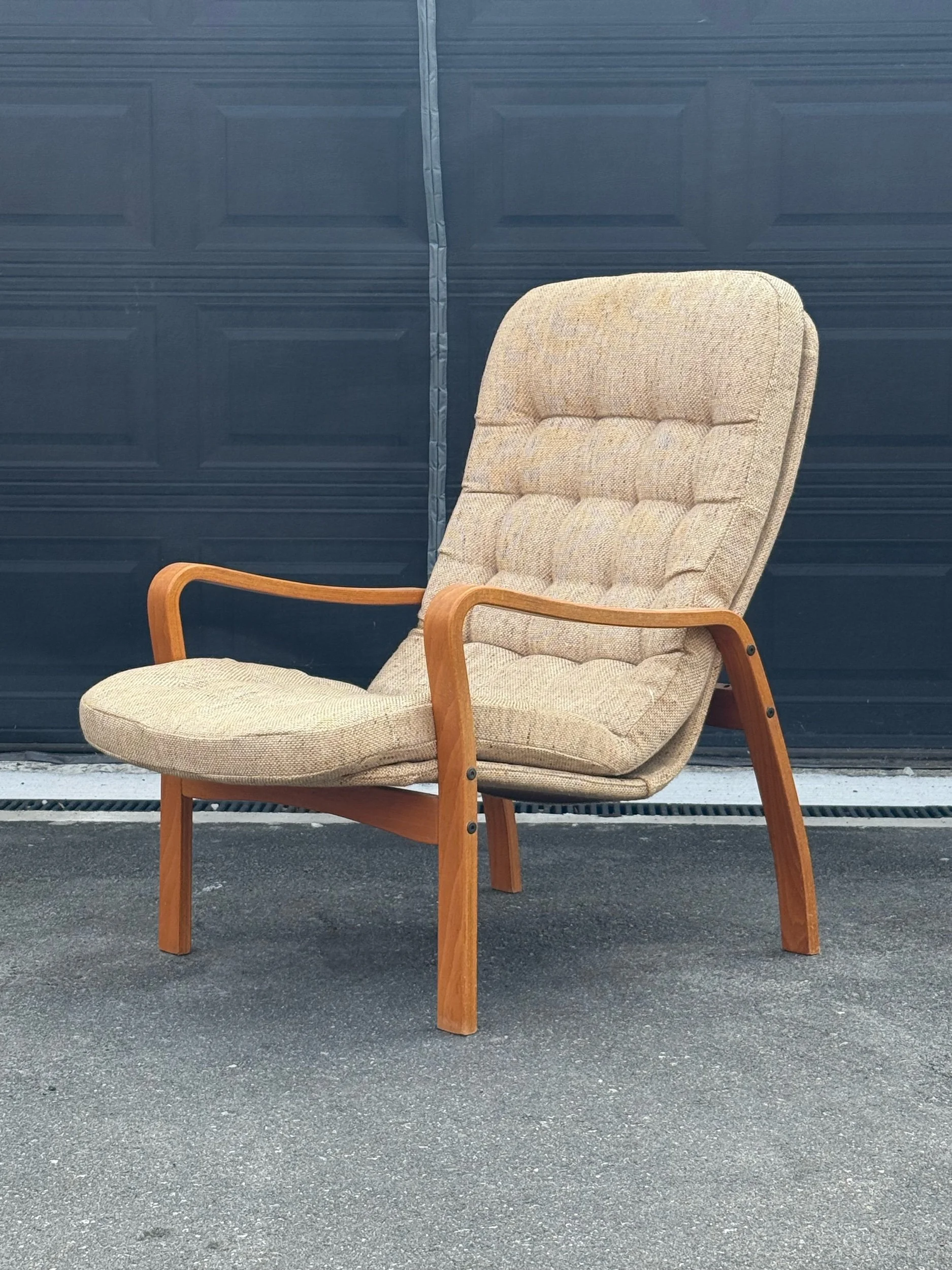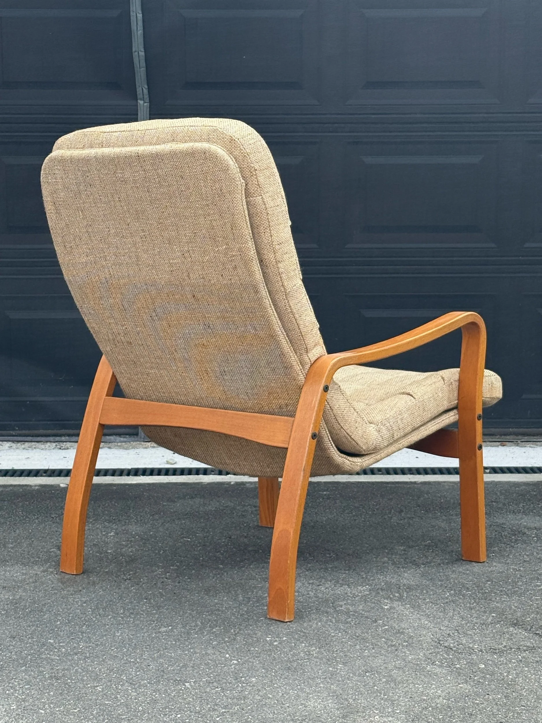 Mid-century ‘Fortino’ high back armchair designed by Yngve Ekström for Swedese. This Swedish design features a connected bentwood beech wood frame. The frame is the most impressive from the side profile to see the slight curvature of the legs and rounded armrests. The chair with its high back is extremely comfortable. A minimal, but wonderfully designed lounge. This piece features the original neutral tweed upholstery unaltered. The condition of the fabric does have wear.
