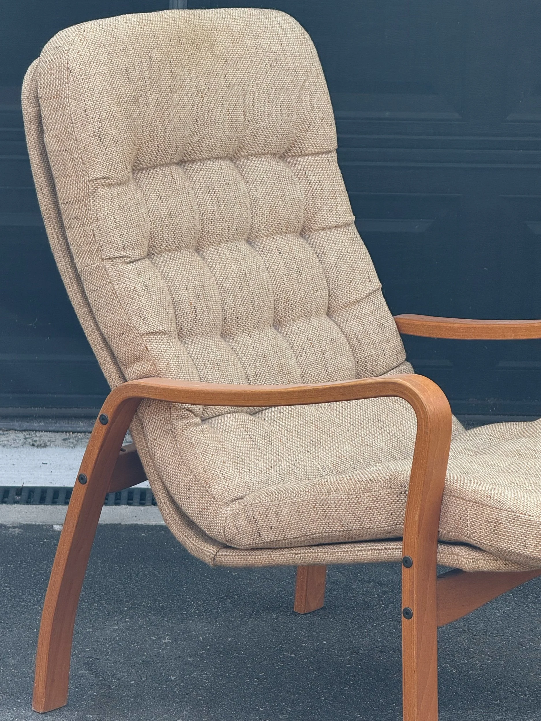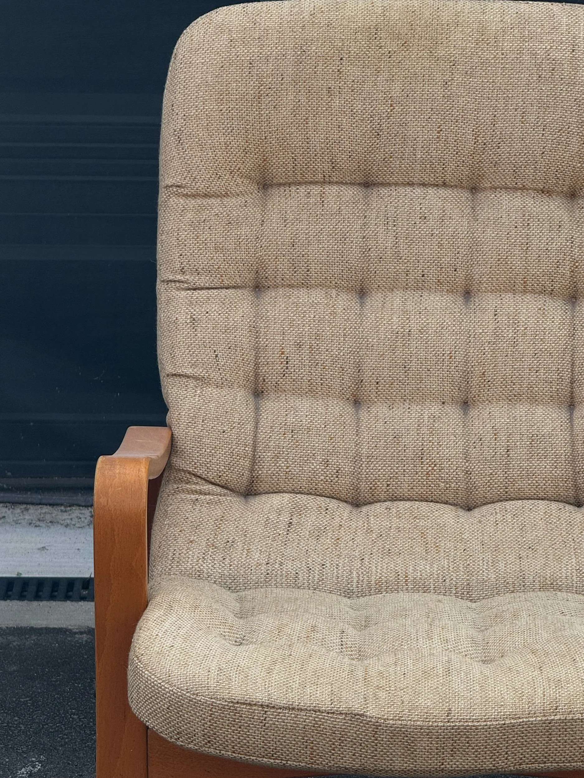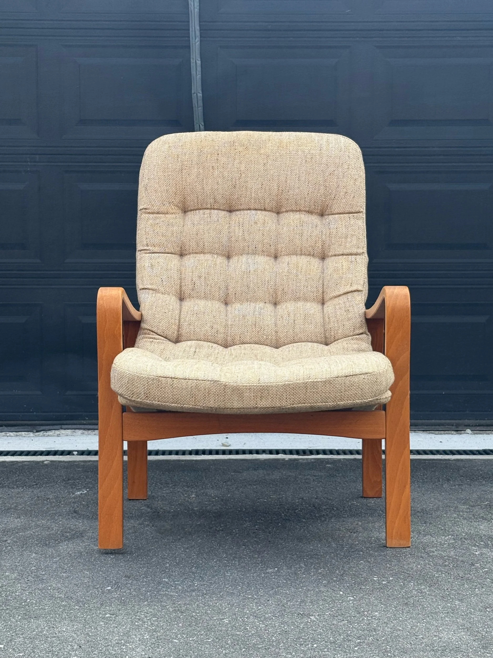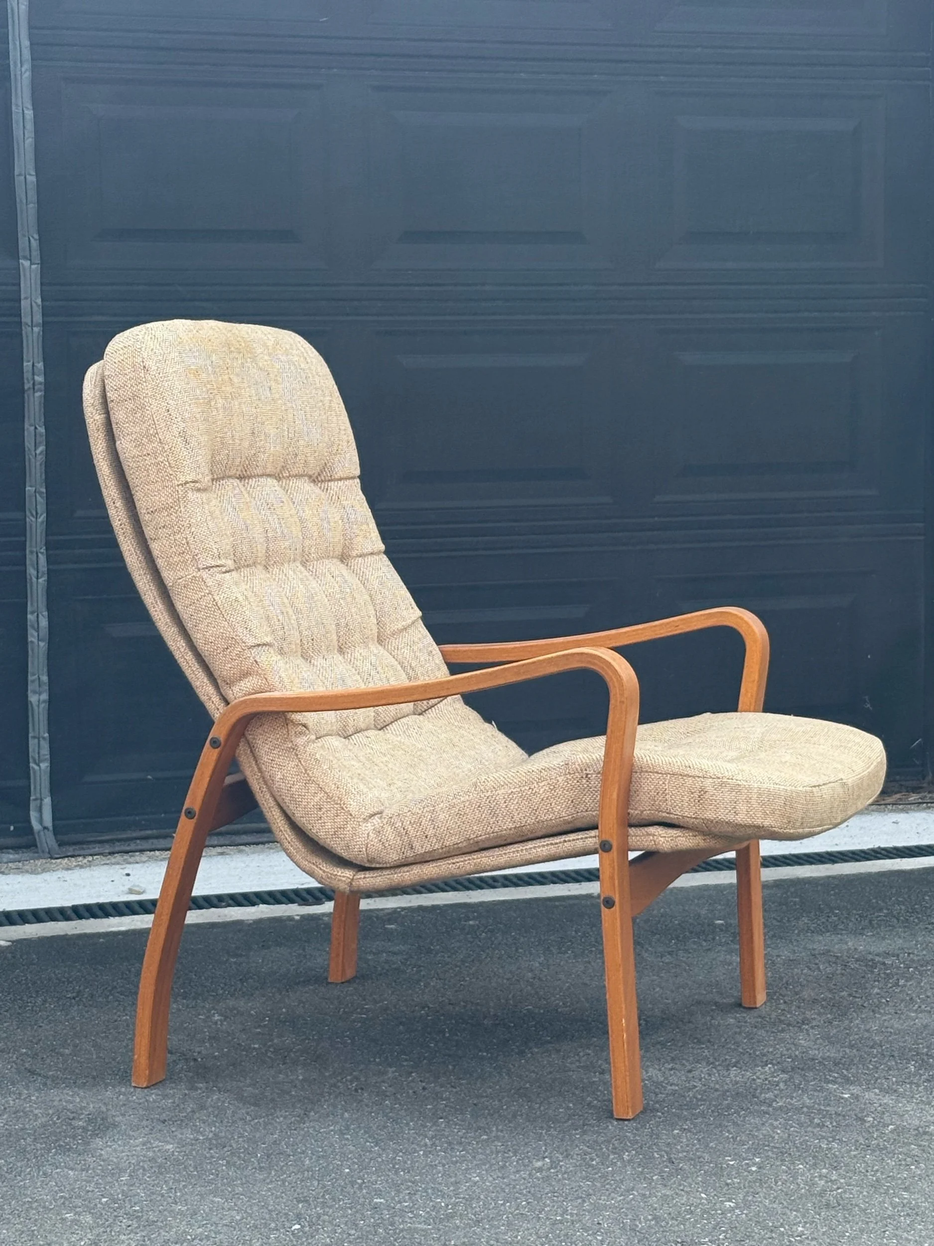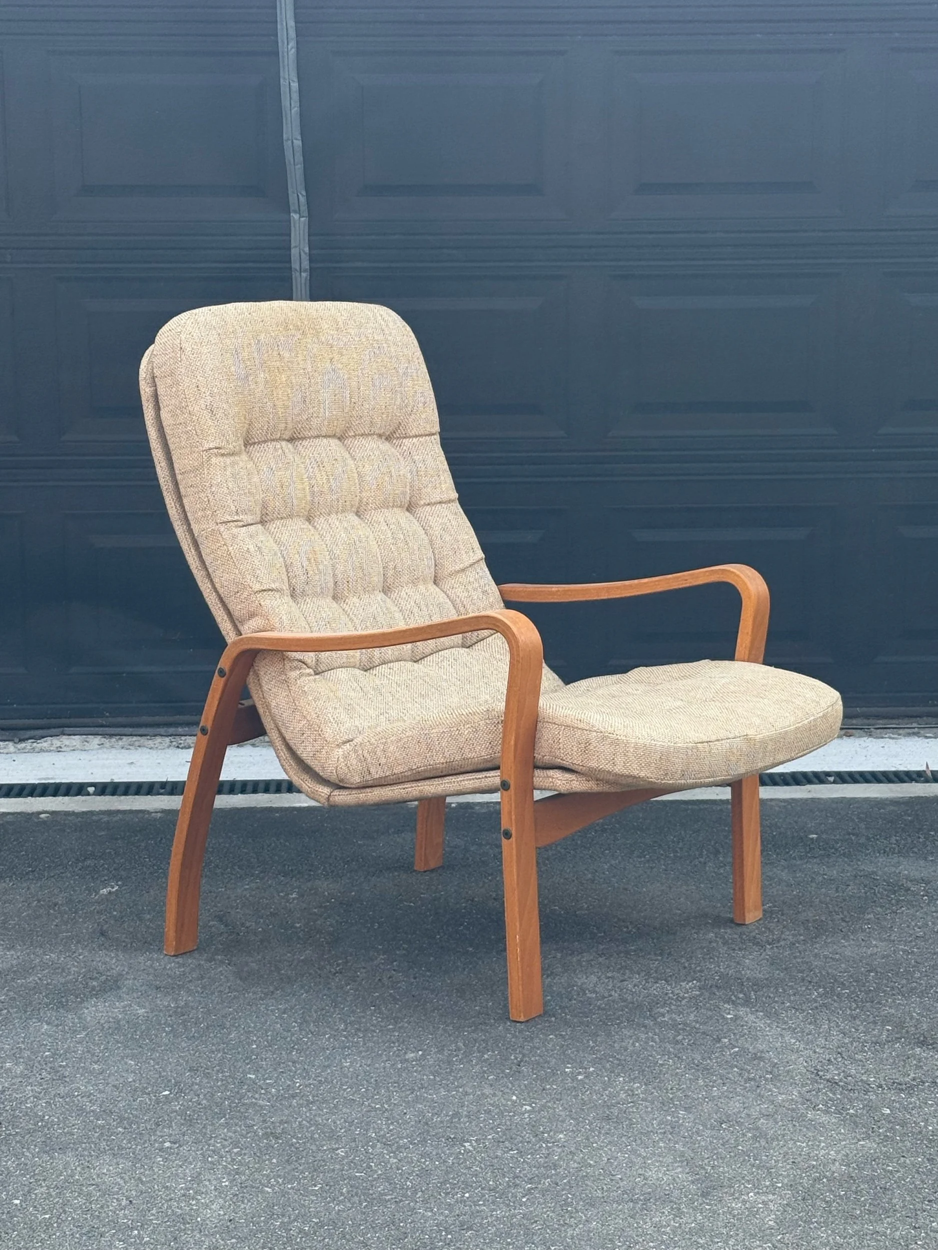 Mid-century ‘Fortino’ high back armchair designed by Yngve Ekström for Swedese. This Swedish design features a connected bentwood beech wood frame. The frame is the most impressive from the side profile to see the slight curvature of the legs and rounded armrests. The chair with its high back is extremely comfortable. A minimal, but wonderfully designed lounge. This piece features the original neutral tweed upholstery unaltered. The condition of the fabric does have wear.