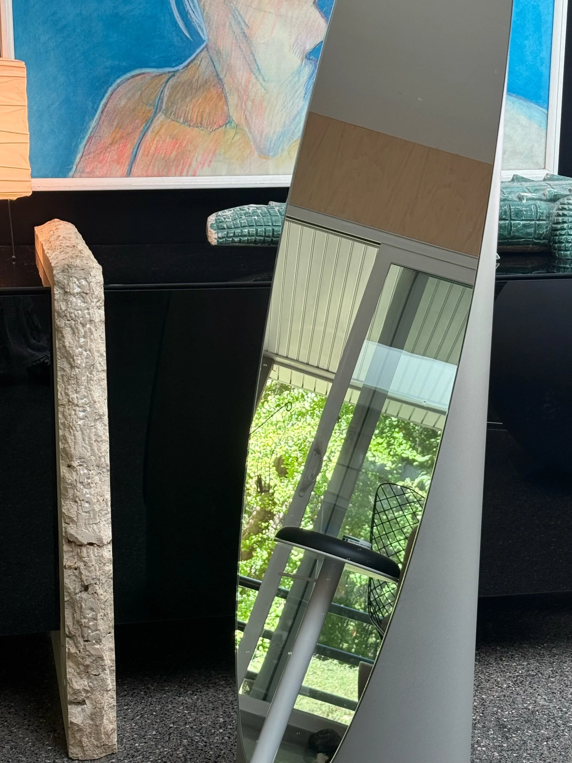 1980s lipstick floor mirror by GAIA in the style of Roger Lecal. A long oval shaped floor mirror with a gray pedestal backing and base. In overall great vintage condition with minor wear consistent with age and use. Please note this item is located in storage and not currently in store. If you are interested in viewing this piece in person prior to purchasing, please contact us.