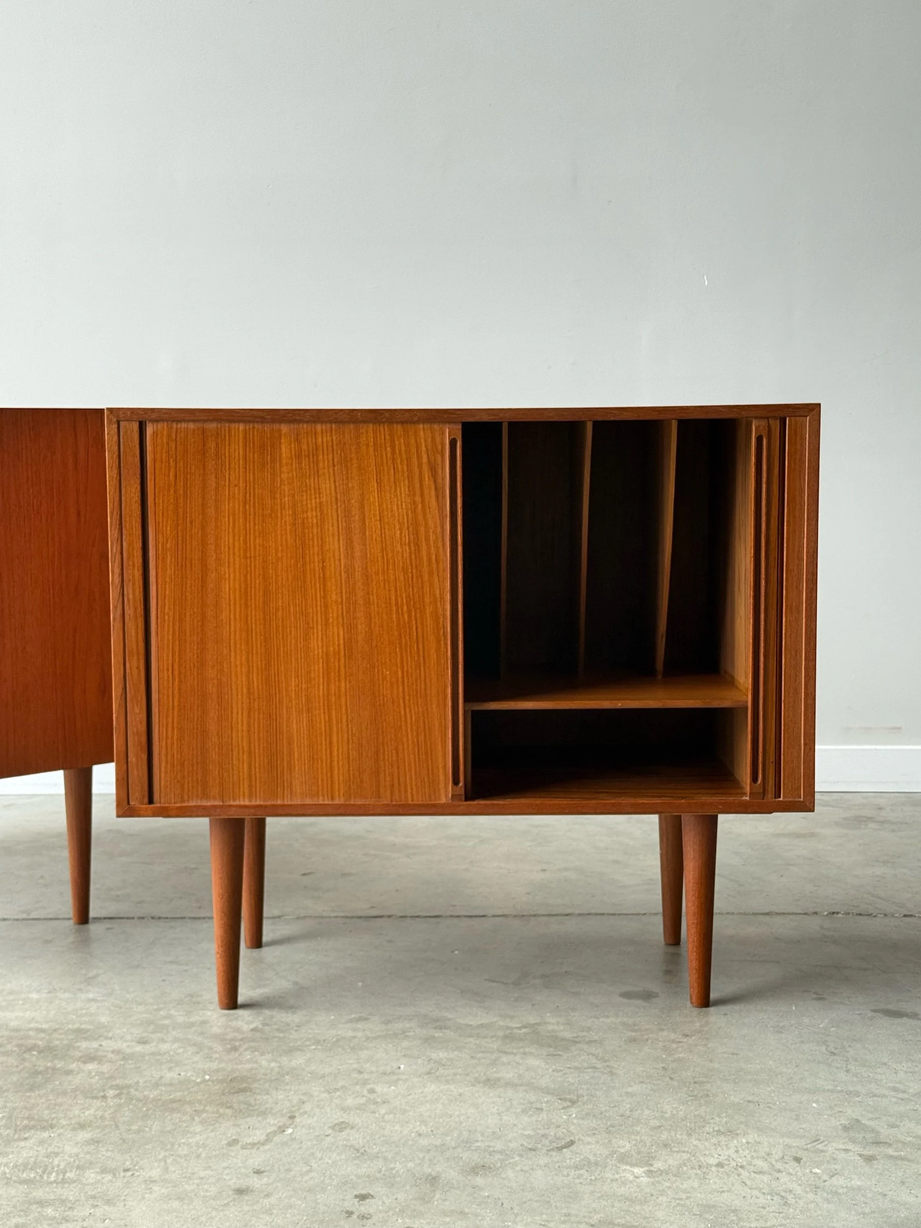 Mid-century Danish sideboards / record cabinets designed by Kai Kristiansen, circa 1970s. We have two of these cabinets available, priced per cabinet or purchase both and push together to create a long credenza.