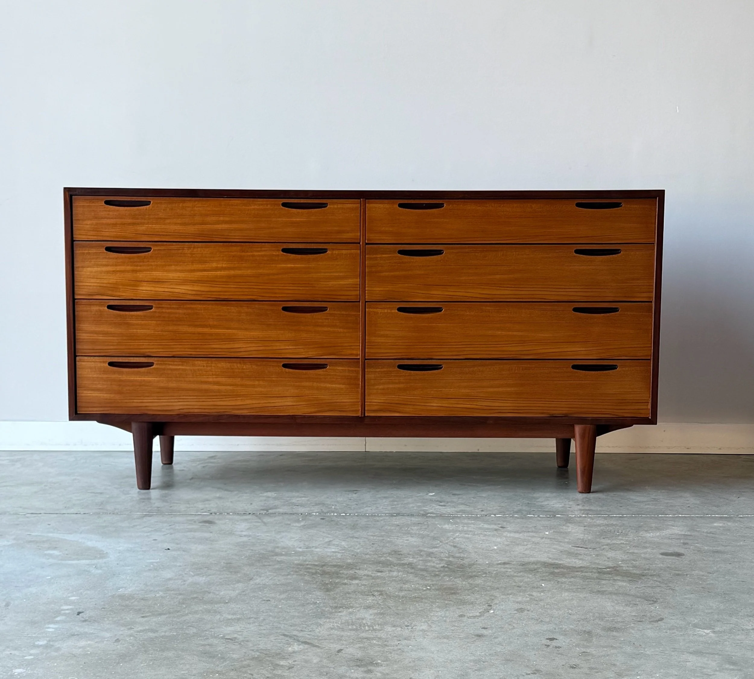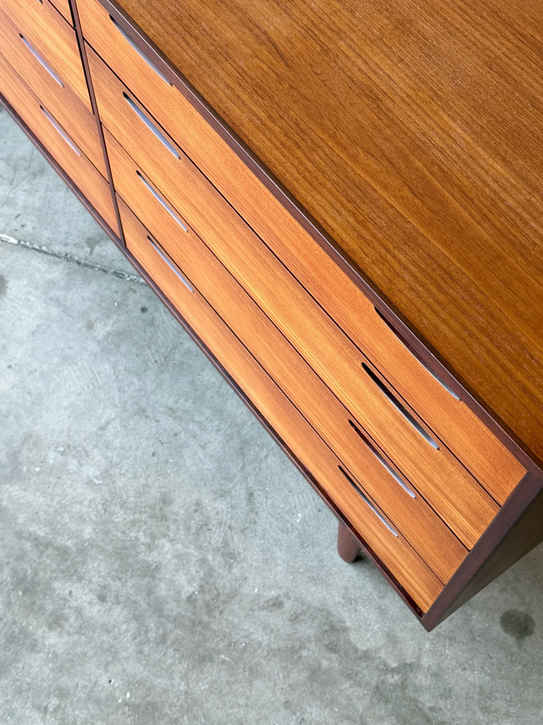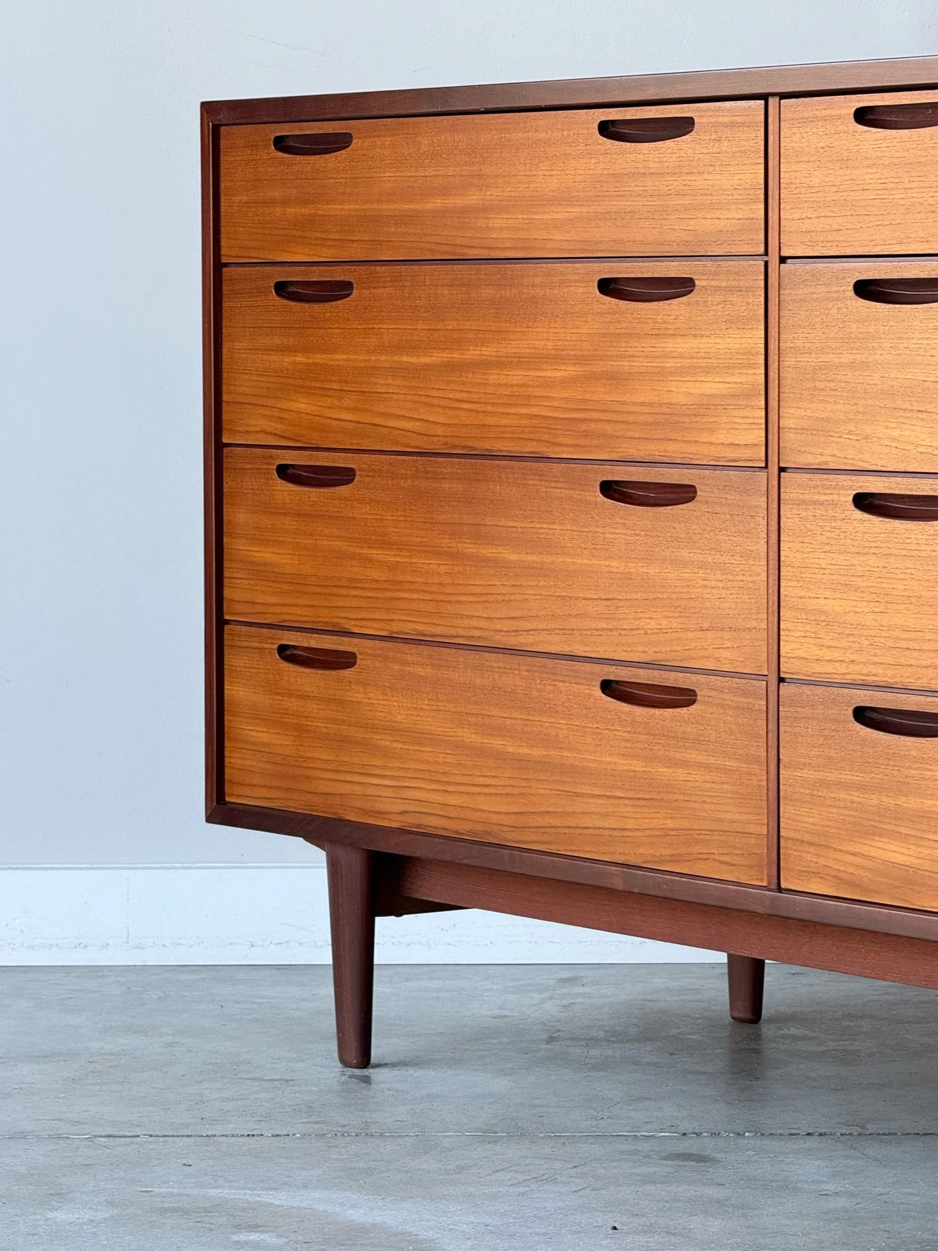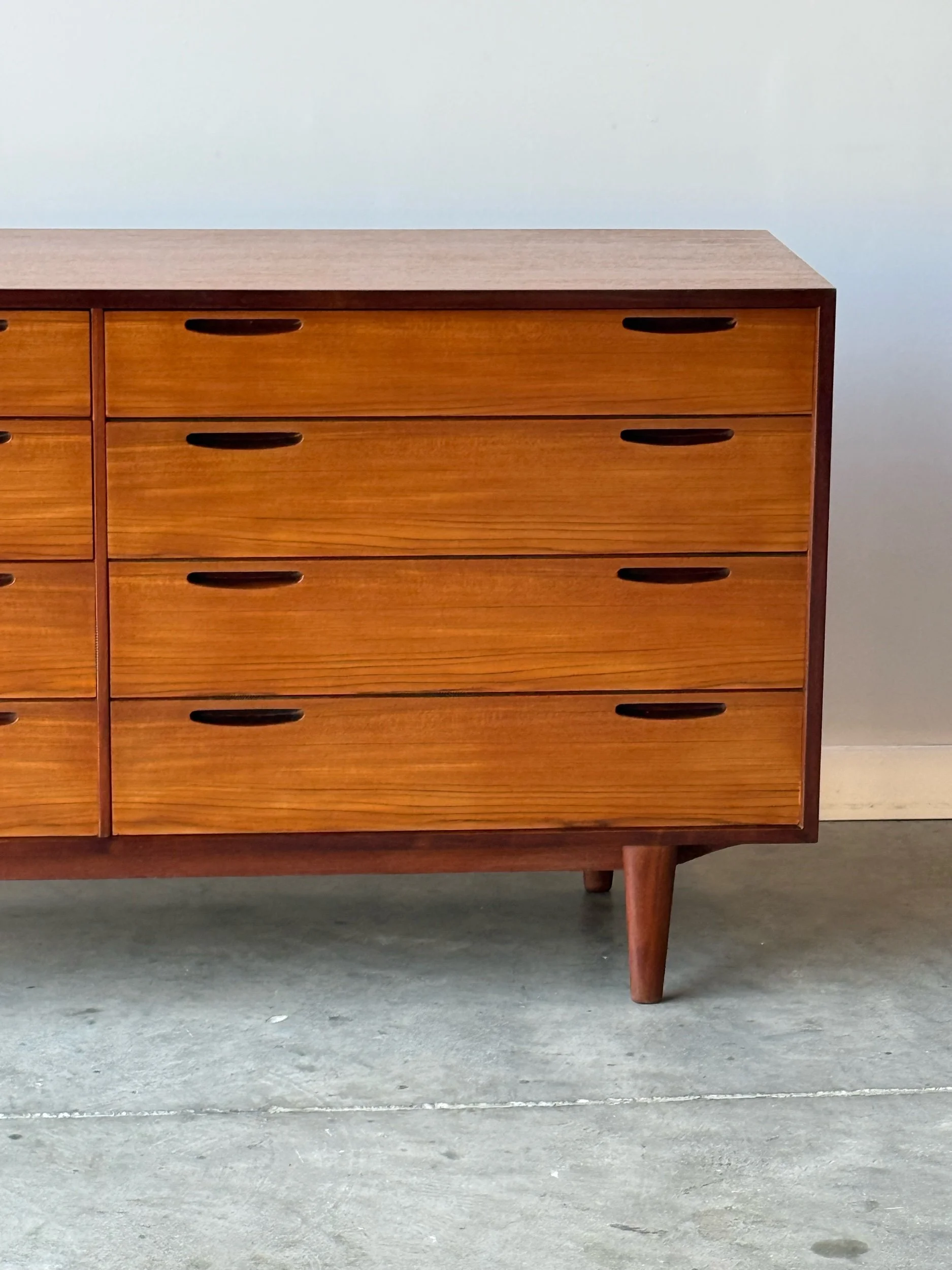 Classically Danish in its approach by allowing the teak wood to be the focal point. Our favorite part of the dresser are the simple carved drawer handles, two on each drawer. The eight drawers allow for ample storage potential. Sitting atop teak tapered legs. If you’re looking for a minimalist styled piece that still has character, this is the perfect piece. In overall great vintage condition with minor wear consistent with age and use.