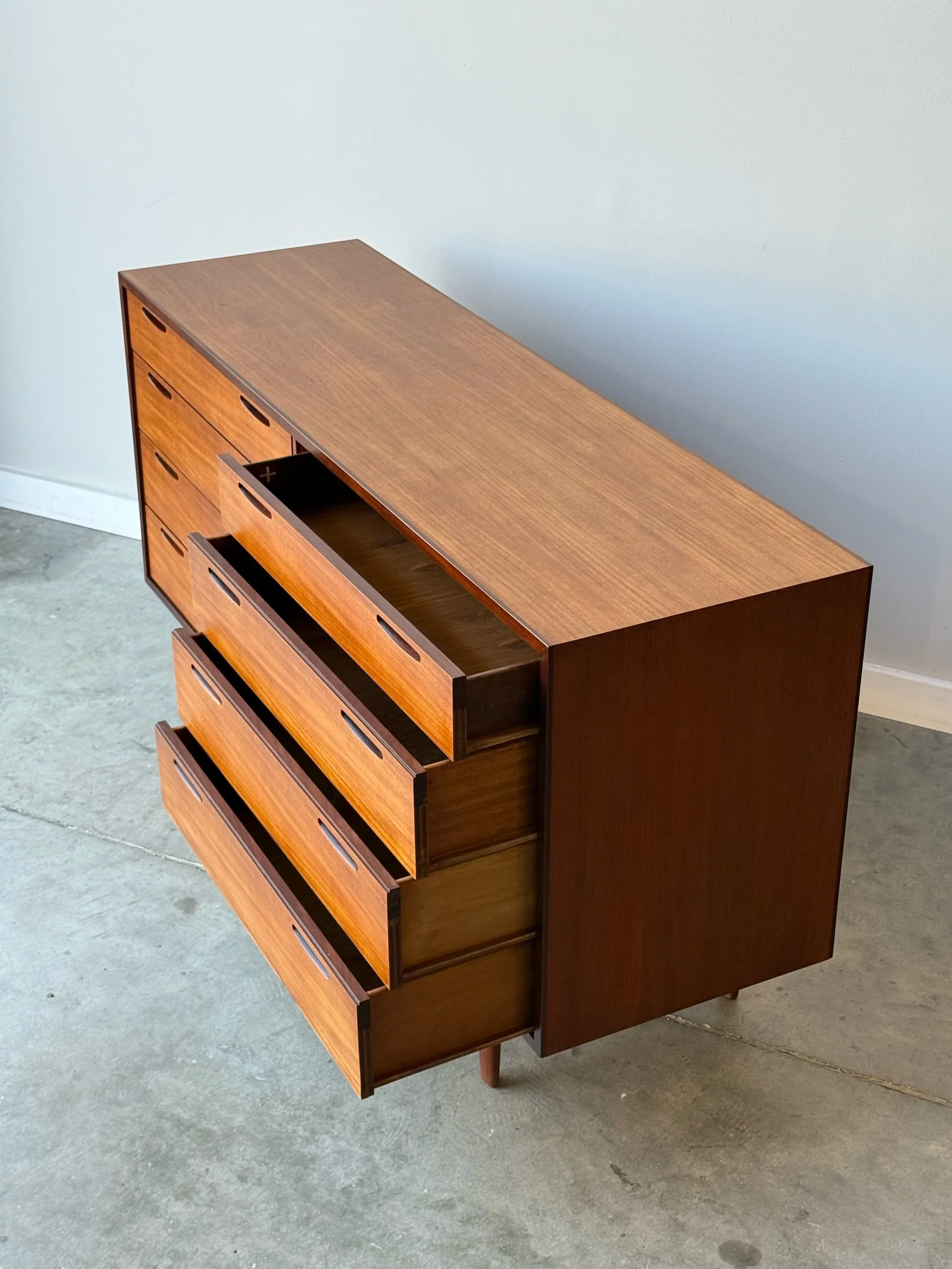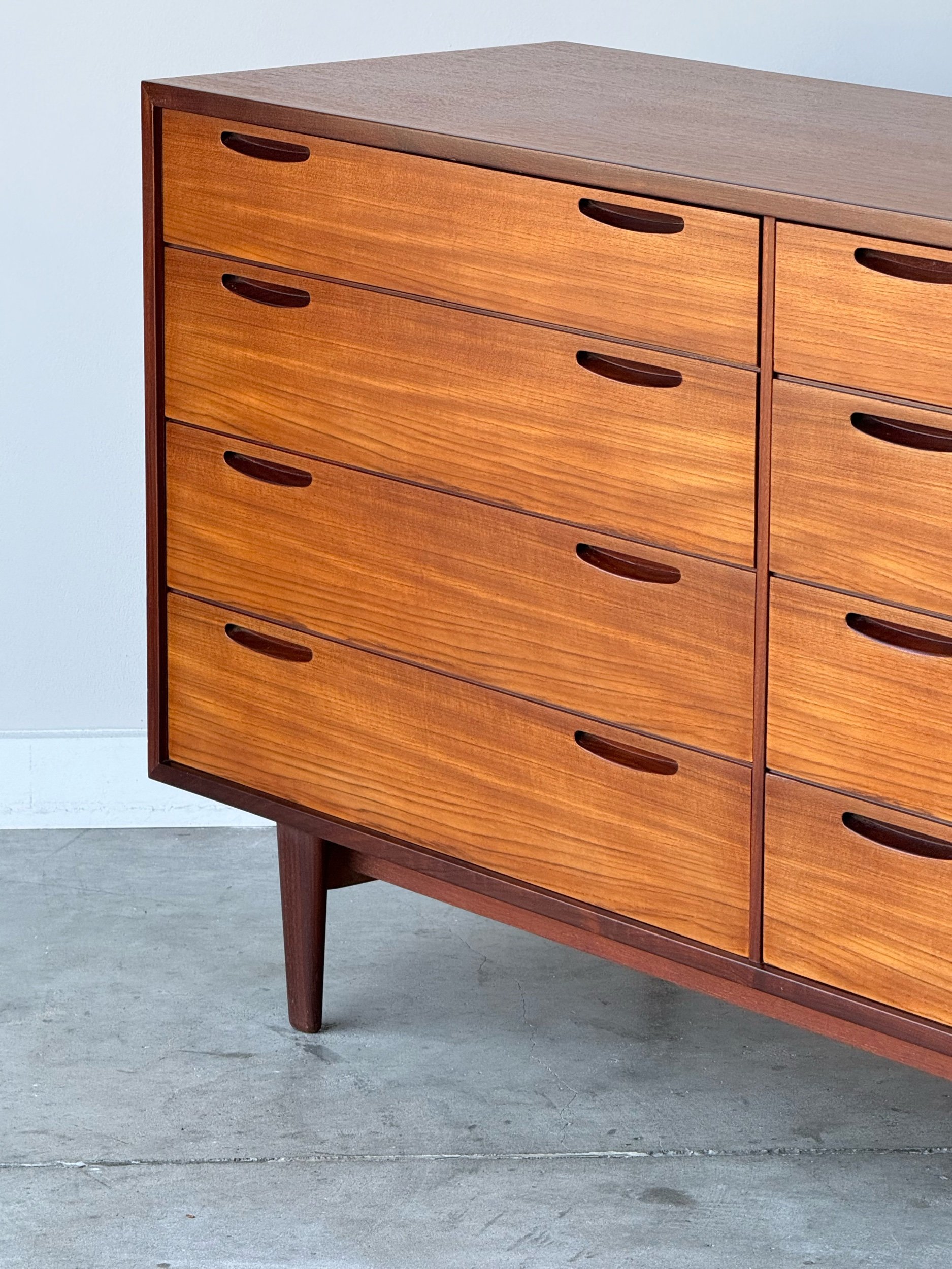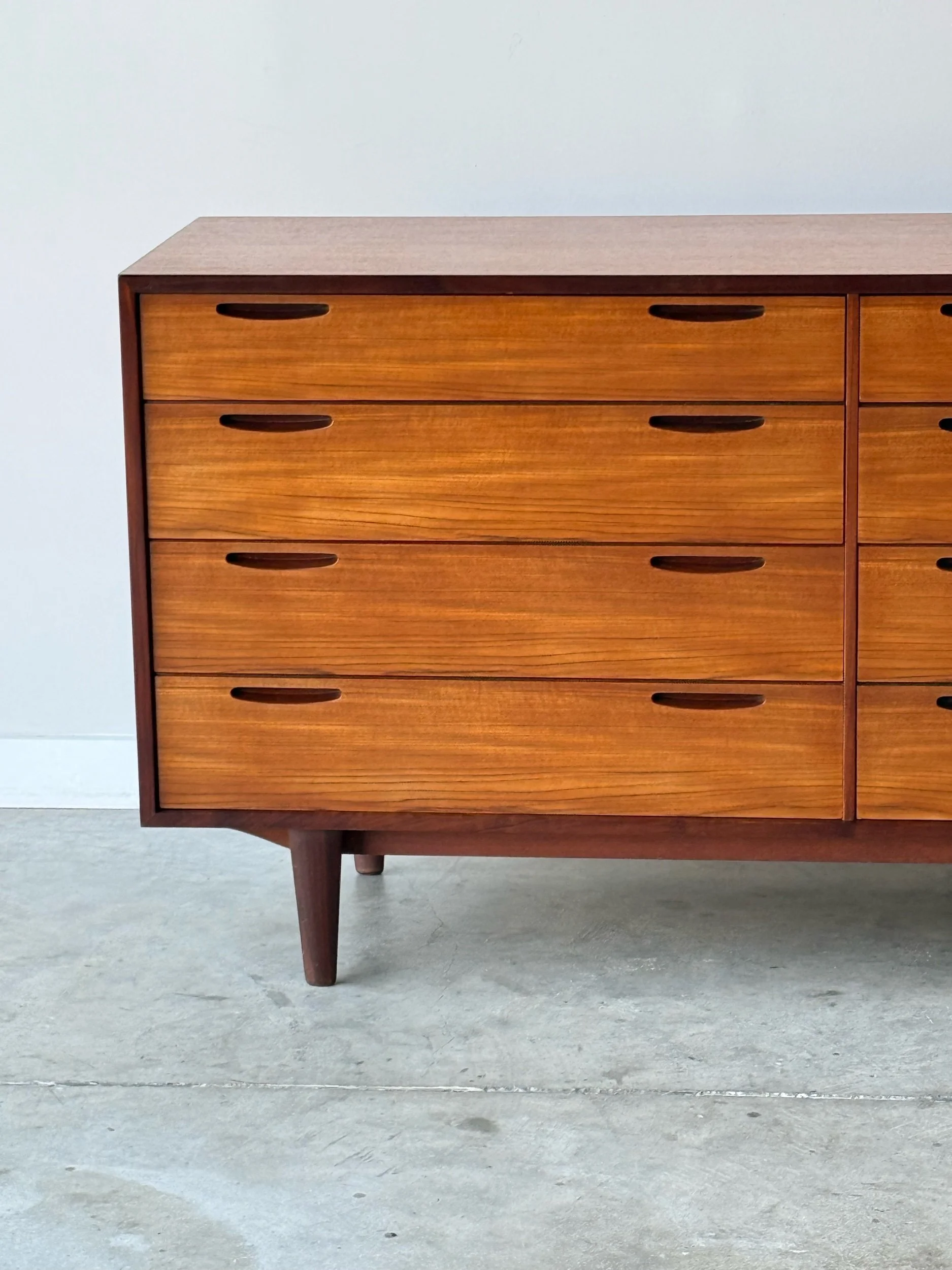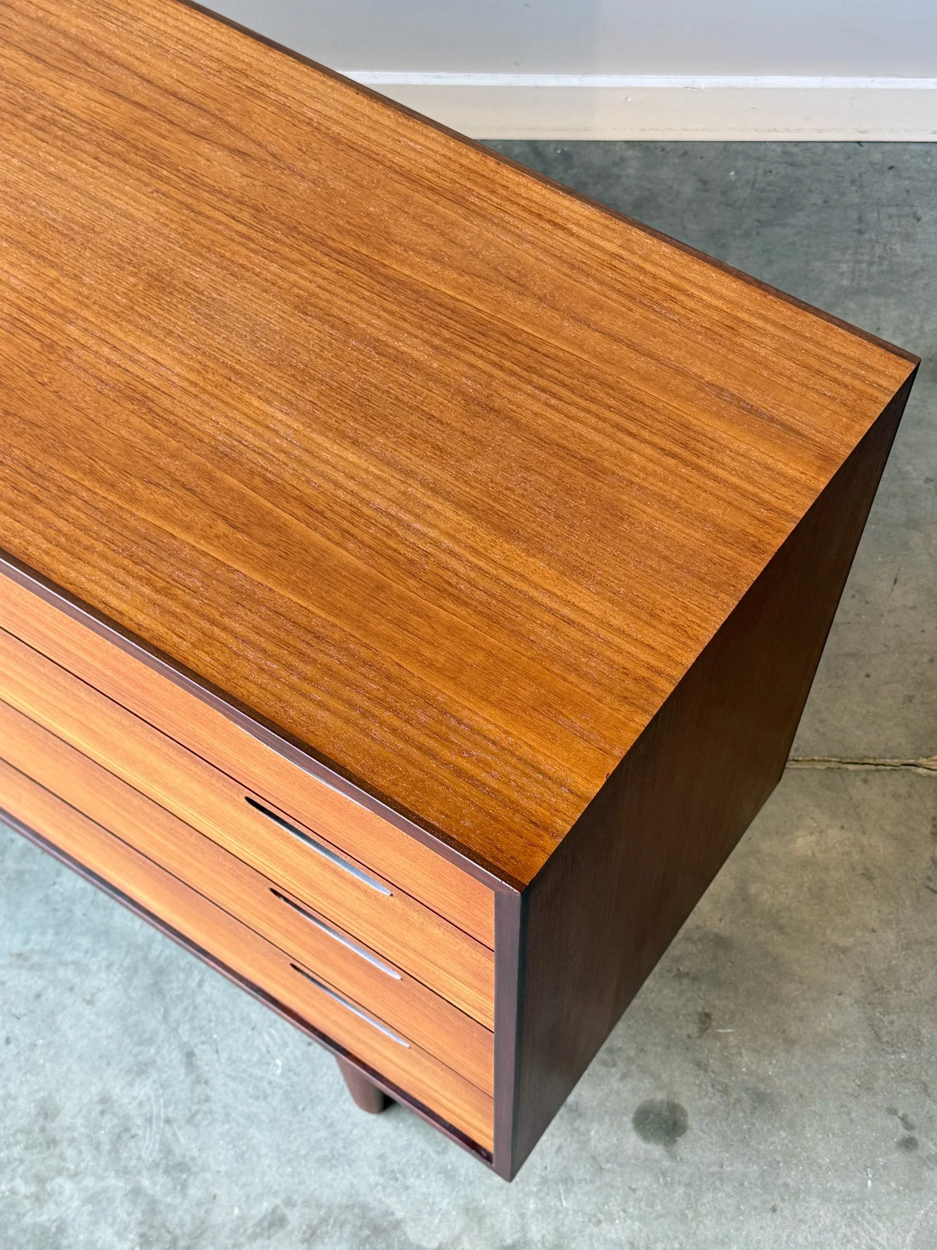 Classically Danish in its approach by allowing the teak wood to be the focal point. Our favorite part of the dresser are the simple carved drawer handles, two on each drawer. The eight drawers allow for ample storage potential. Sitting atop teak tapered legs. If you’re looking for a minimalist styled piece that still has character, this is the perfect piece. In overall great vintage condition with minor wear consistent with age and use.