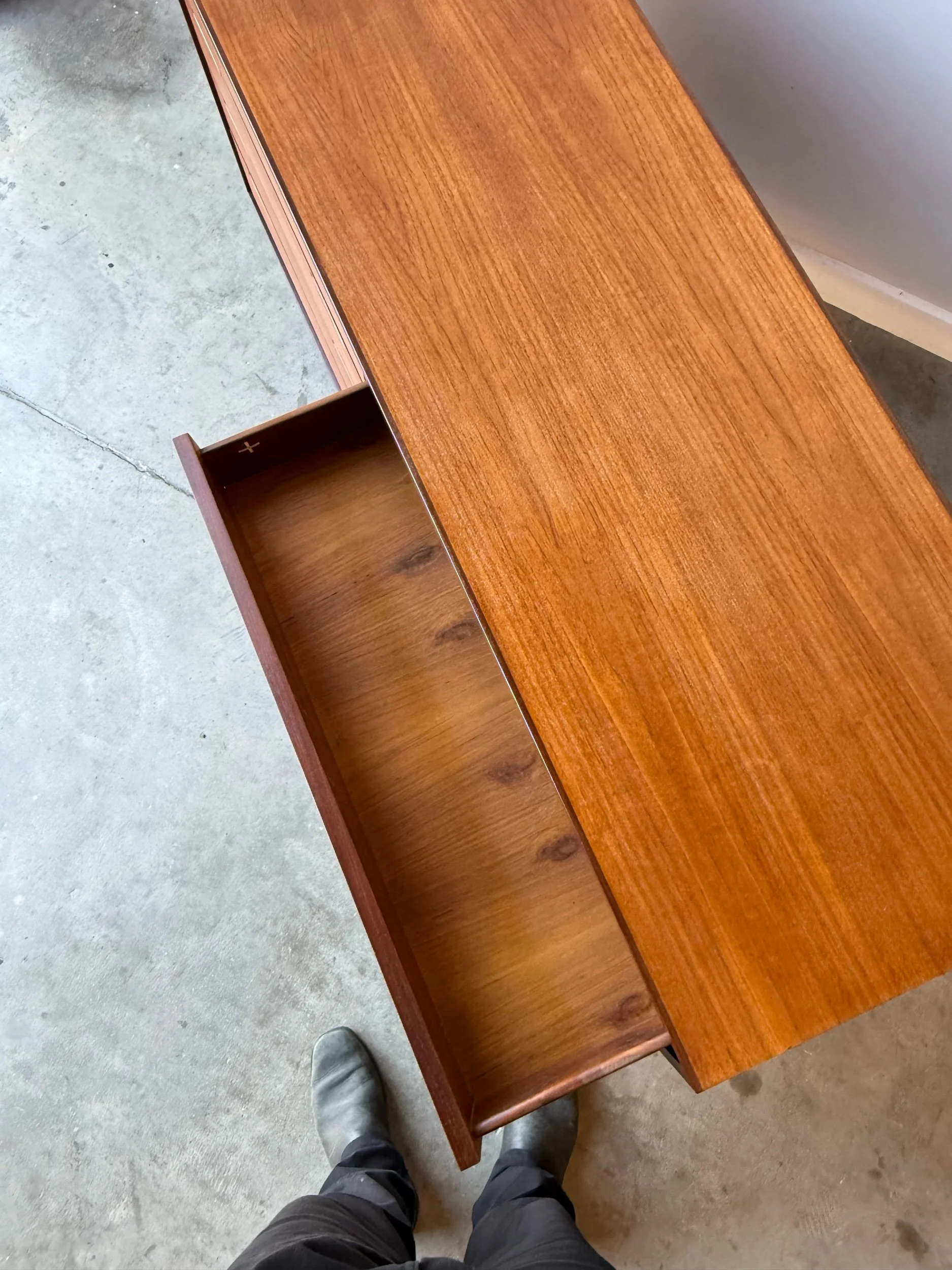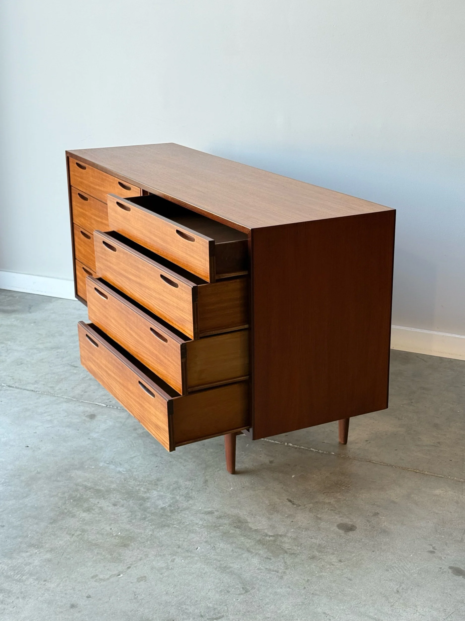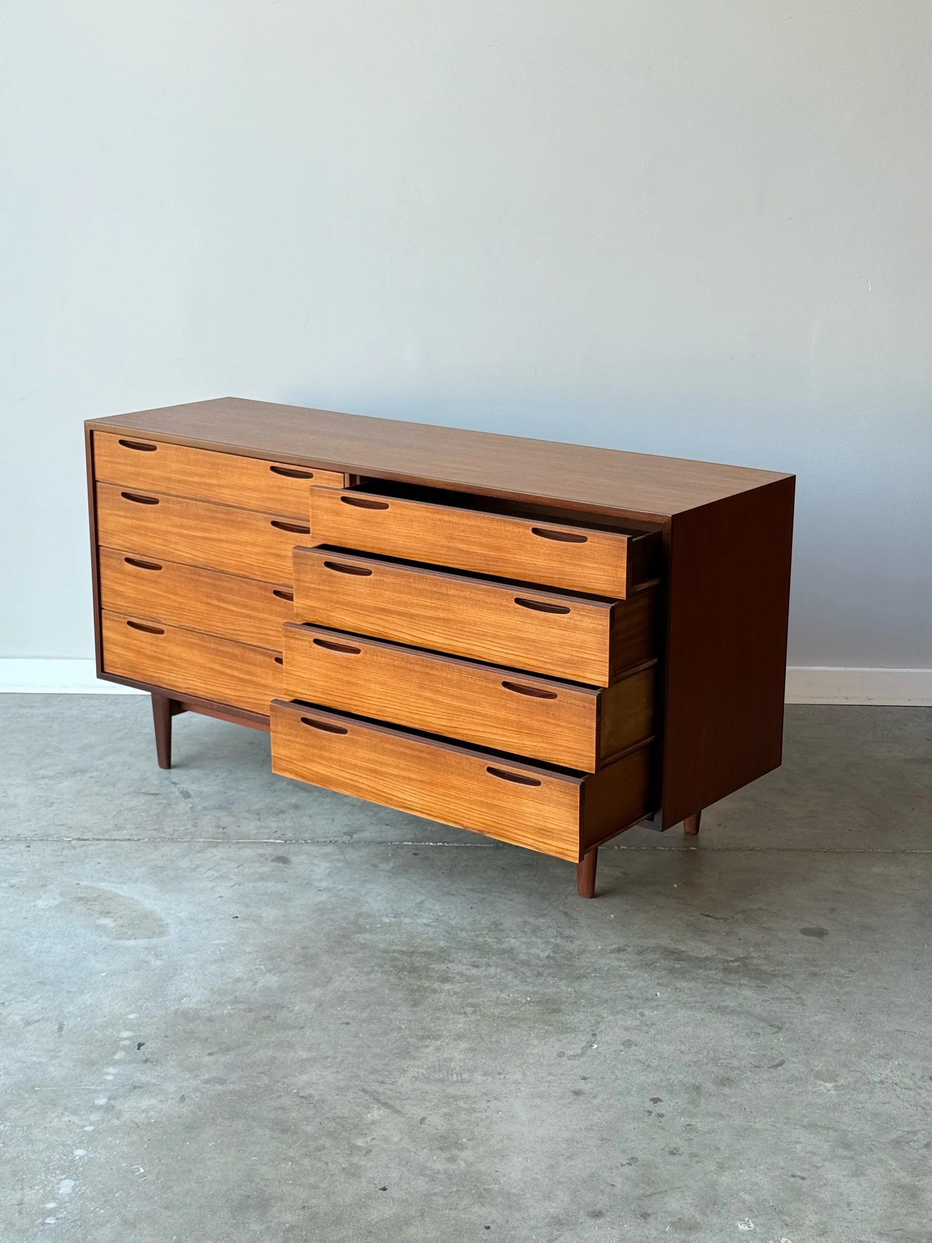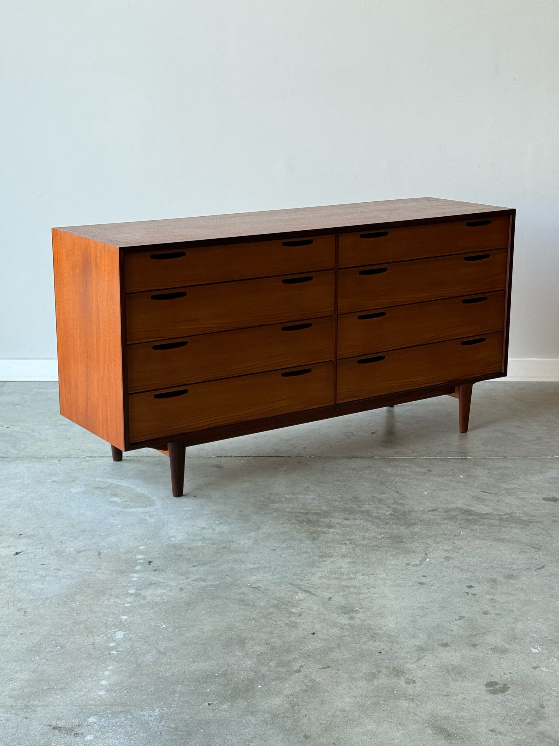 Classically Danish in its approach by allowing the teak wood to be the focal point. Our favorite part of the dresser are the simple carved drawer handles, two on each drawer. The eight drawers allow for ample storage potential. Sitting atop teak tapered legs. If you’re looking for a minimalist styled piece that still has character, this is the perfect piece. In overall great vintage condition with minor wear consistent with age and use.