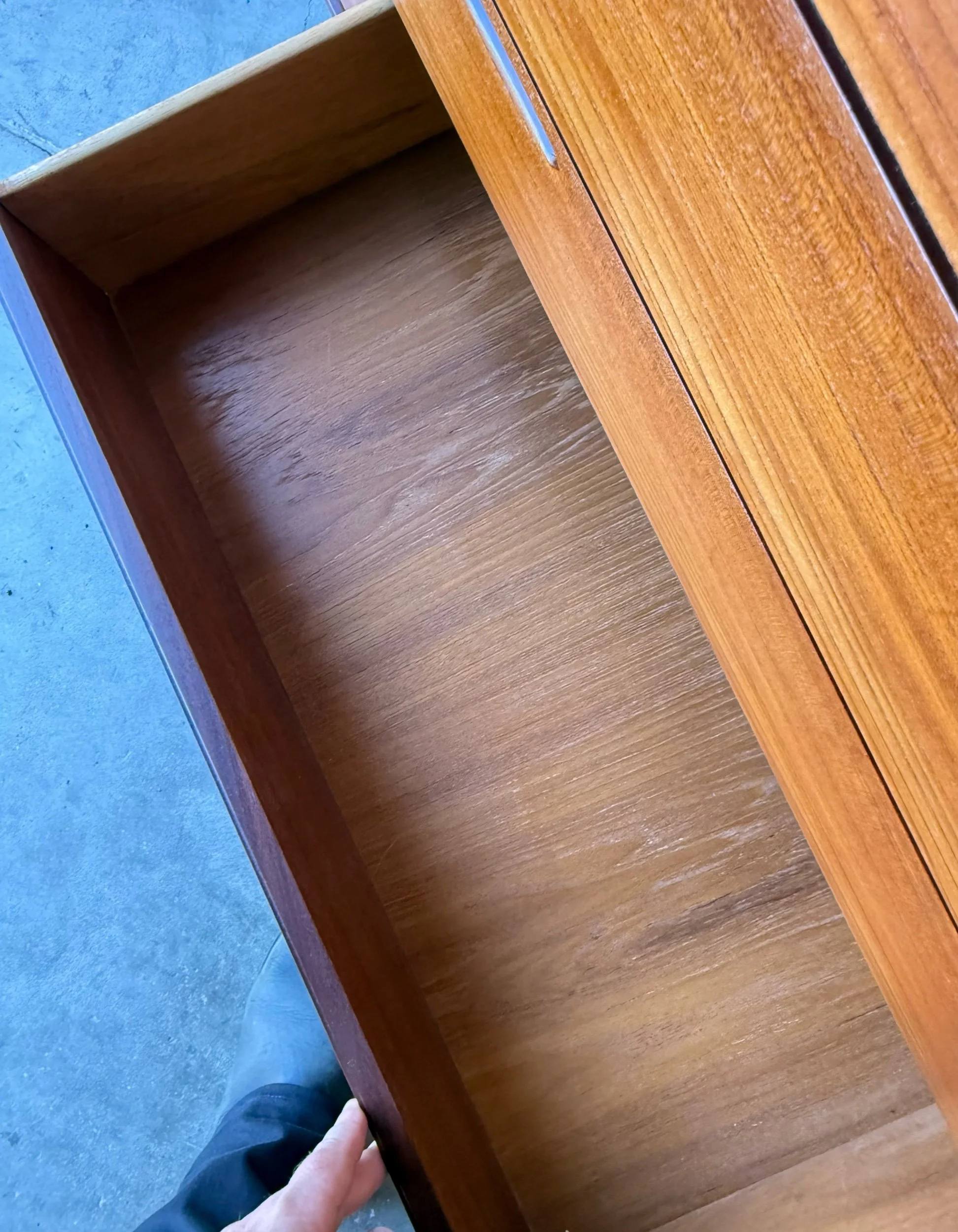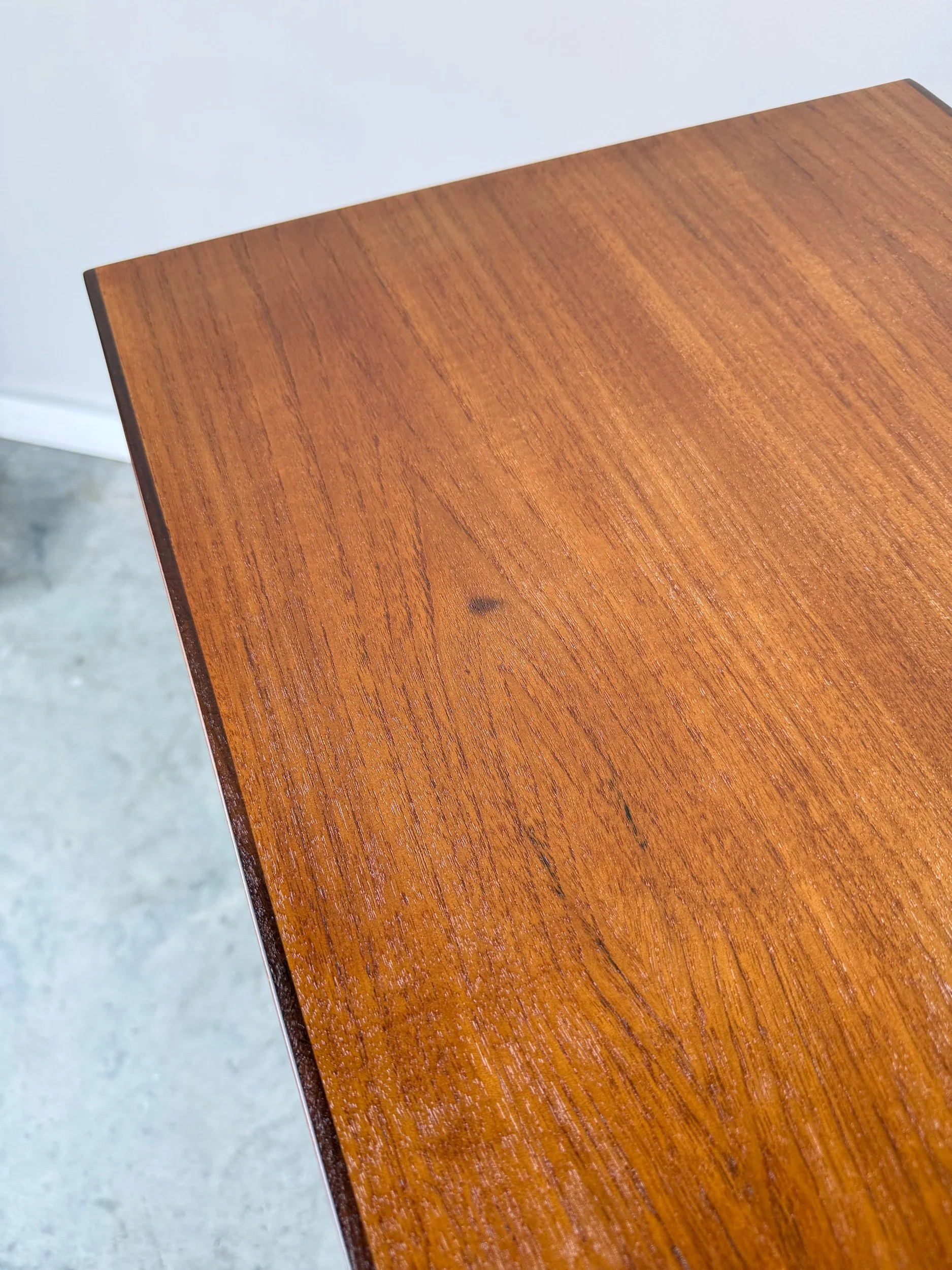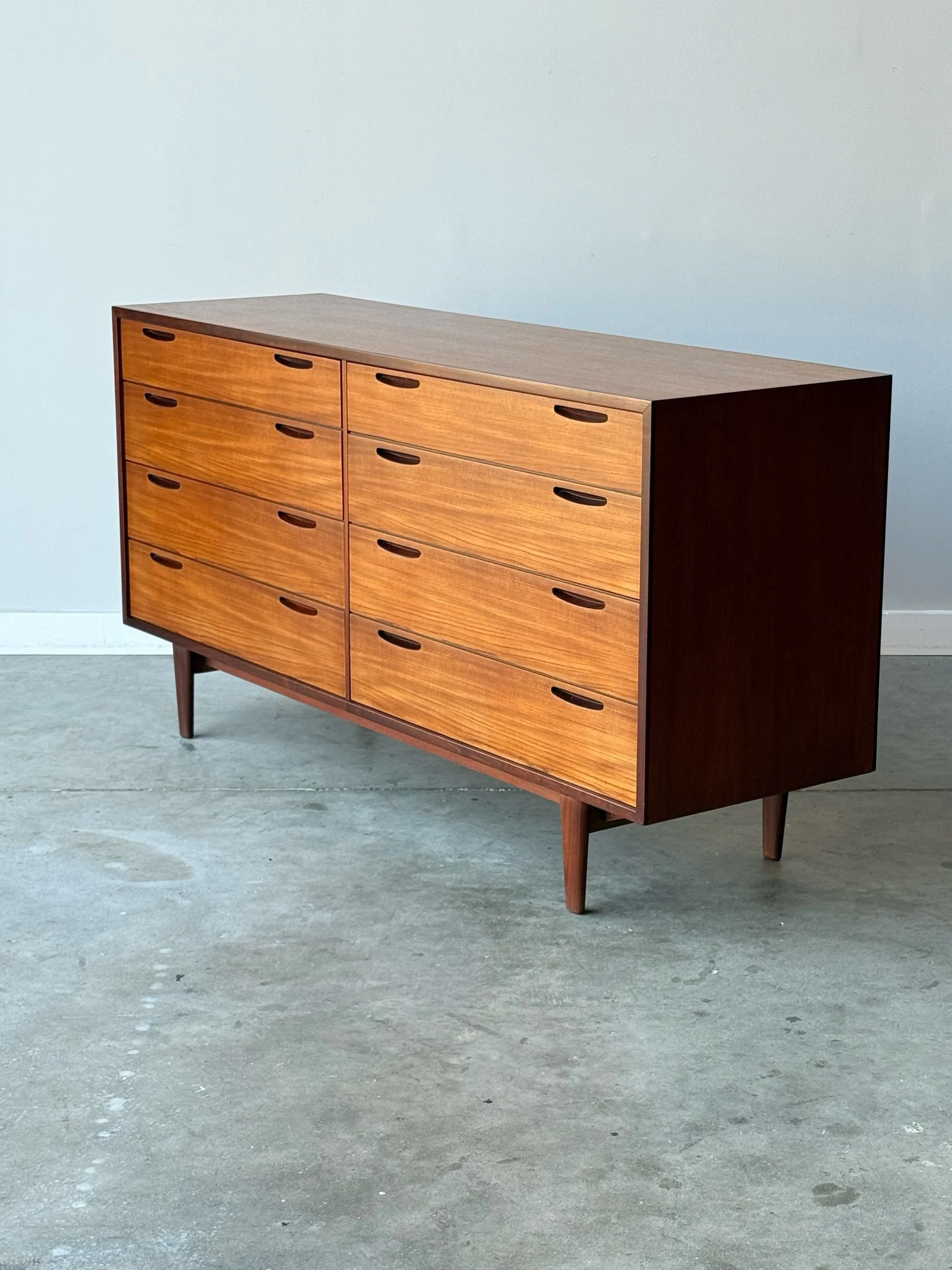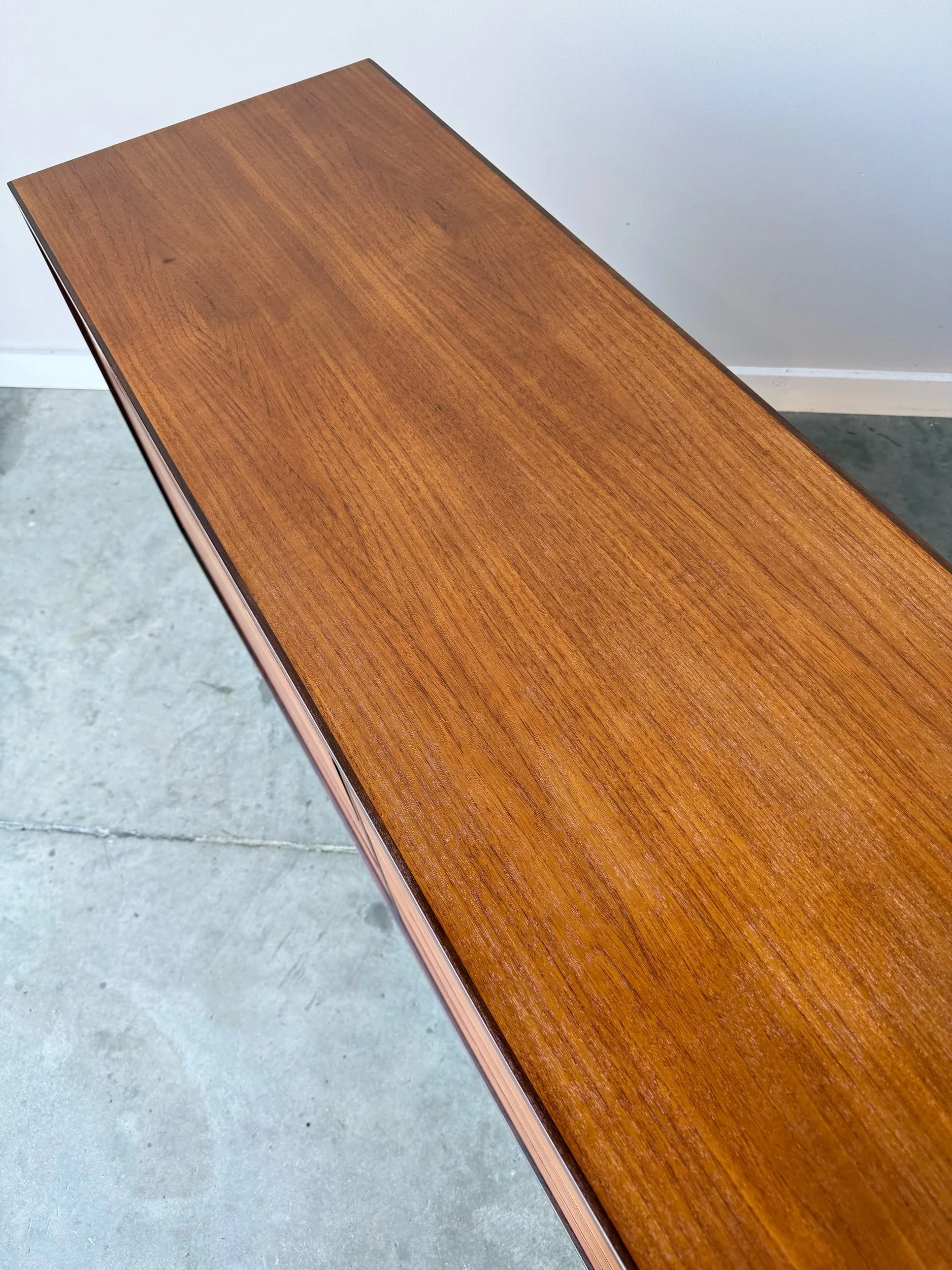 Classically Danish in its approach by allowing the teak wood to be the focal point. Our favorite part of the dresser are the simple carved drawer handles, two on each drawer. The eight drawers allow for ample storage potential. Sitting atop teak tapered legs. If you’re looking for a minimalist styled piece that still has character, this is the perfect piece. In overall great vintage condition with minor wear consistent with age and use.