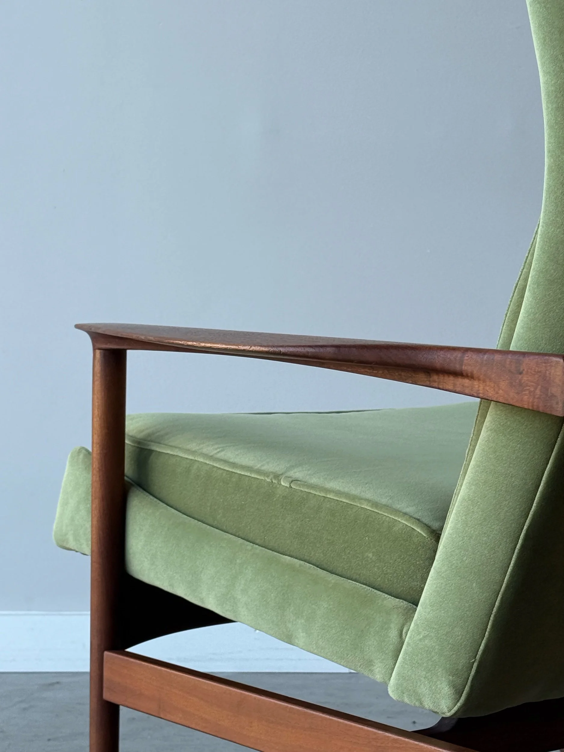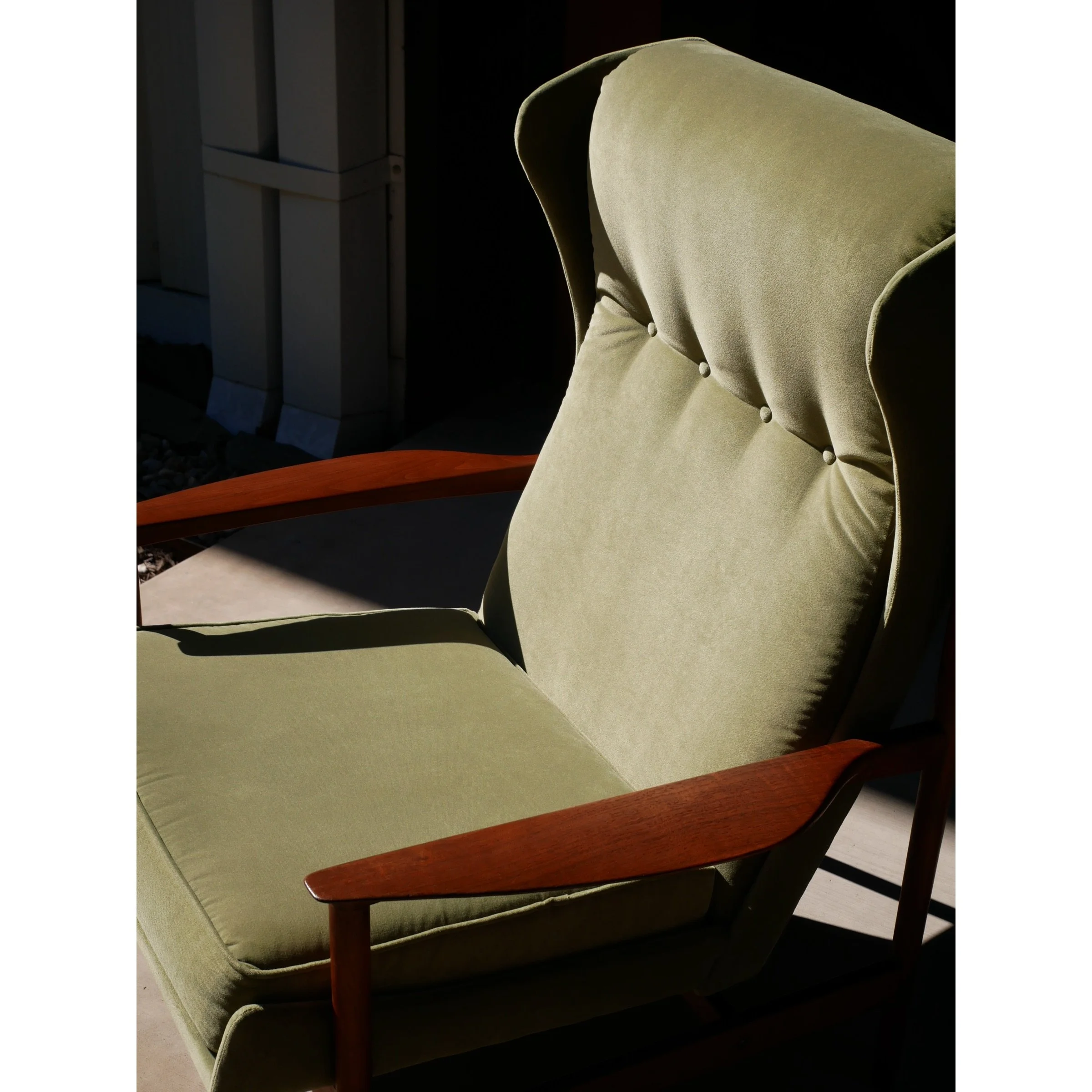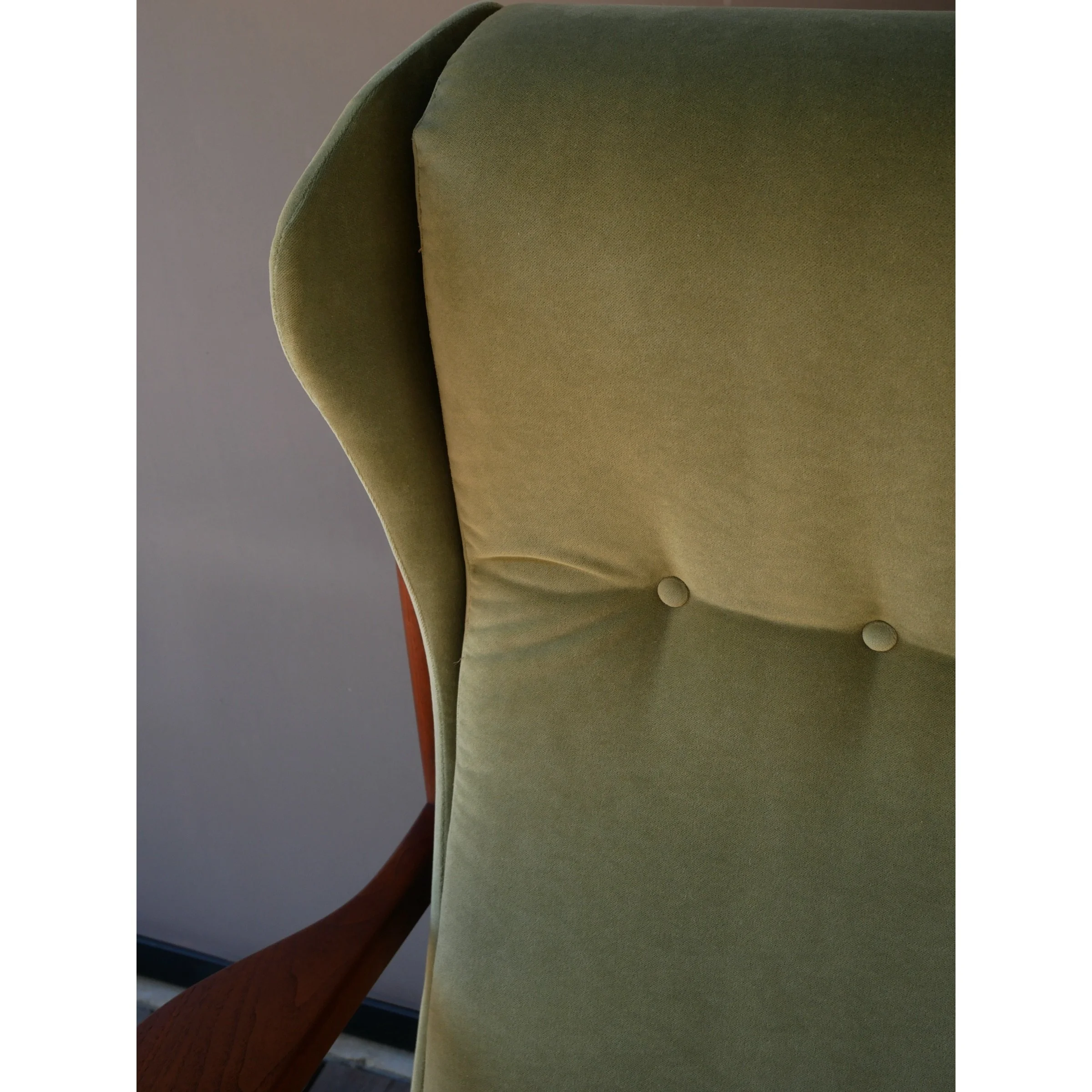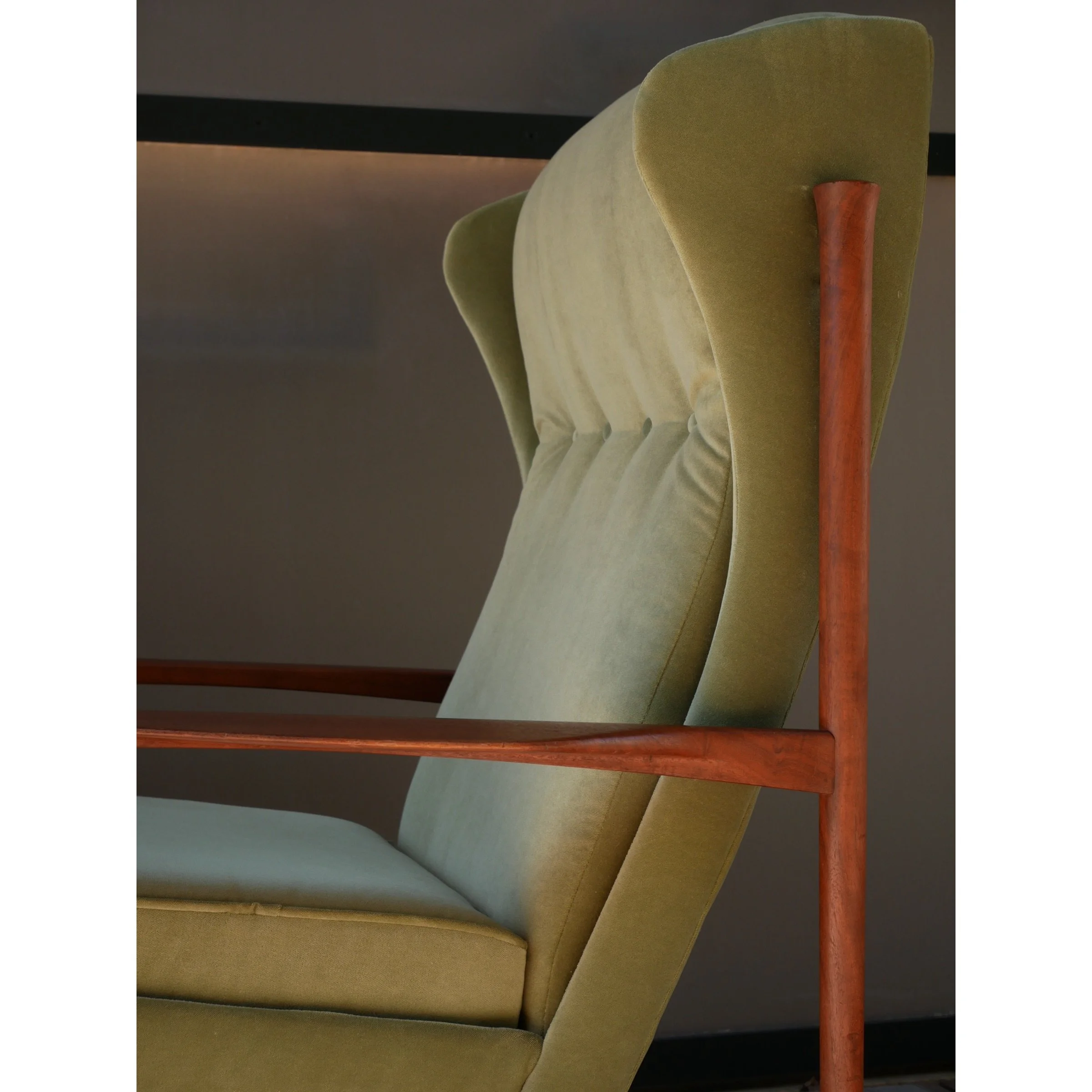 The seated section of the lounge continues with the sculptural aspect. The seat slants down into the back of the chair. The back is tall and features the wingback accent at the headrest. This lounge has been newly reupholstered in a light green velvet. The color compliments the teak wood tone while also creating a modern appeal. The seated position of this lounge is upright, perfect for a reading nook or occasional chair. In overall fantastic vintage condition with minor wear consistent with age and use.