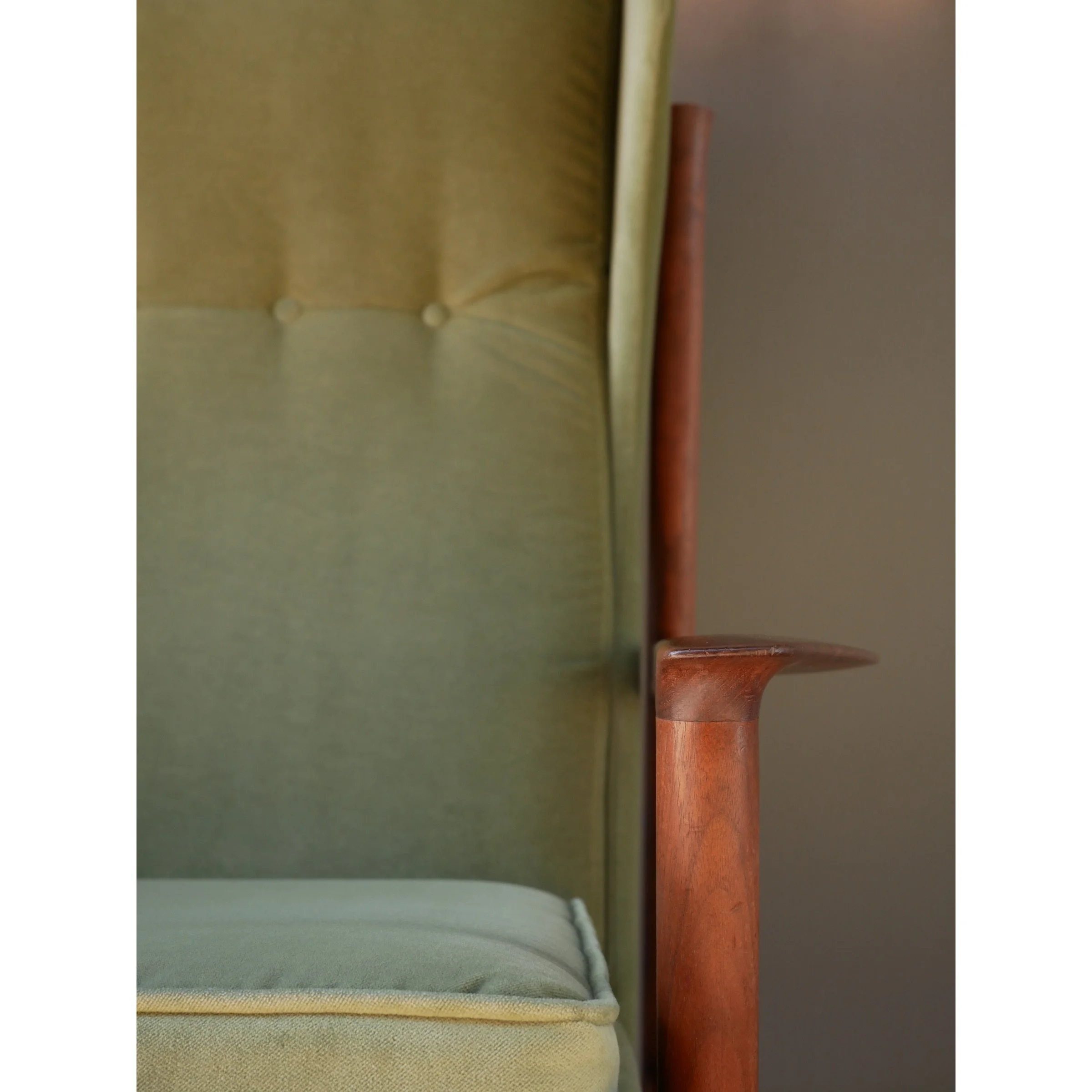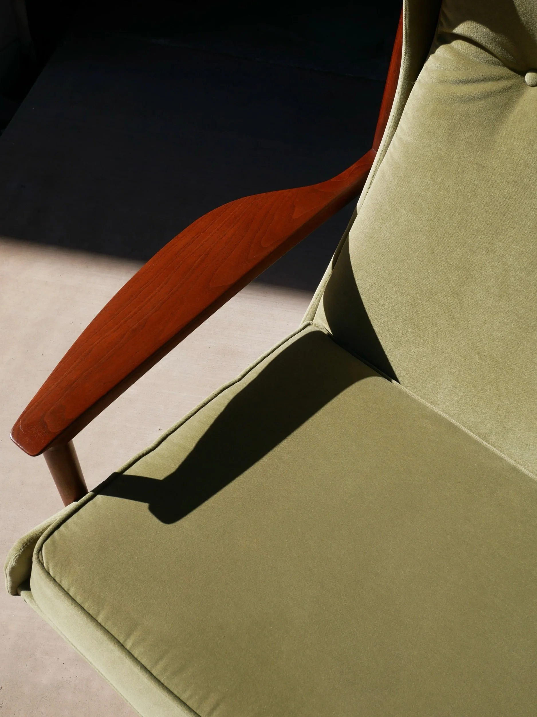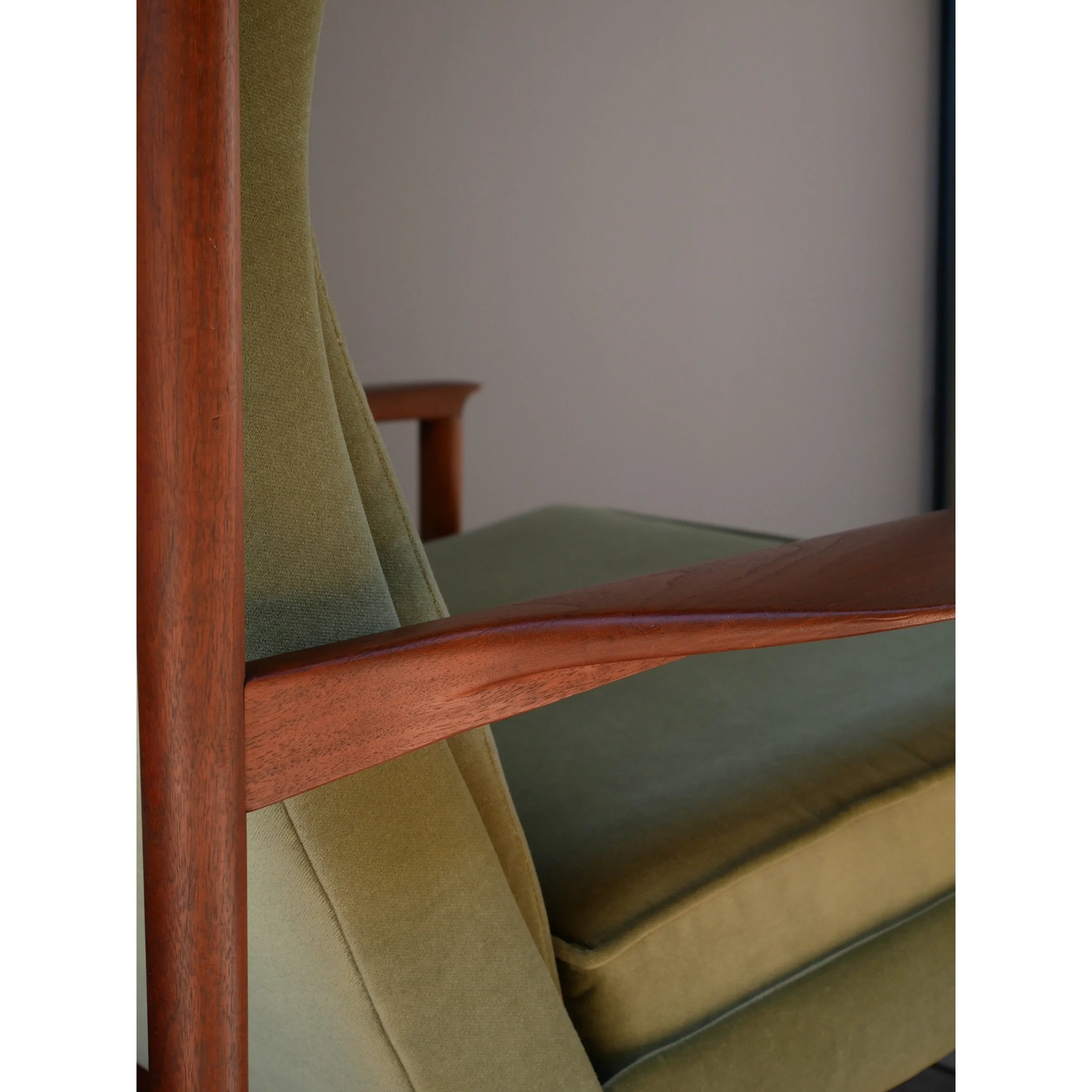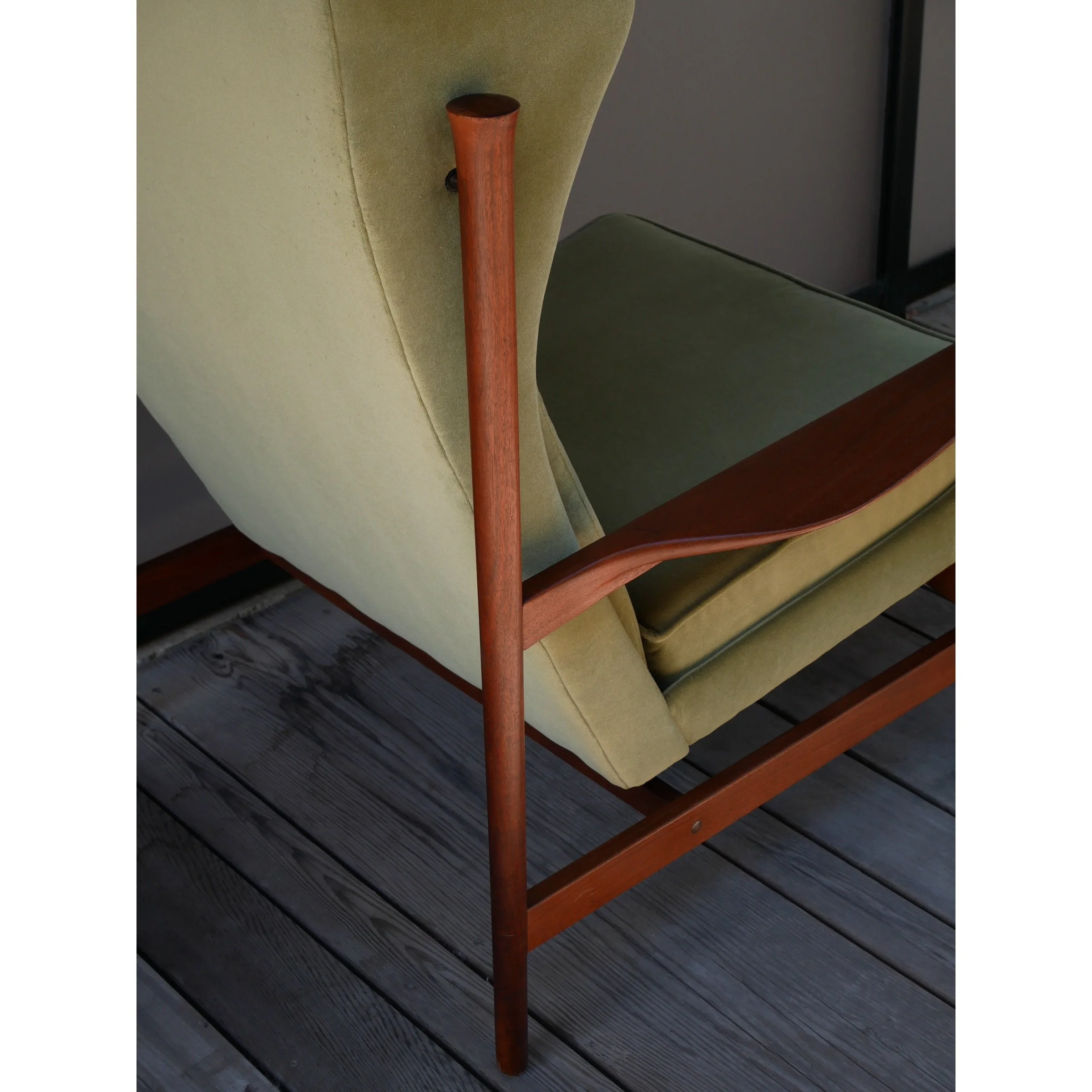 The seated section of the lounge continues with the sculptural aspect. The seat slants down into the back of the chair. The back is tall and features the wingback accent at the headrest. This lounge has been newly reupholstered in a light green velvet. The color compliments the teak wood tone while also creating a modern appeal. The seated position of this lounge is upright, perfect for a reading nook or occasional chair. In overall fantastic vintage condition with minor wear consistent with age and use.