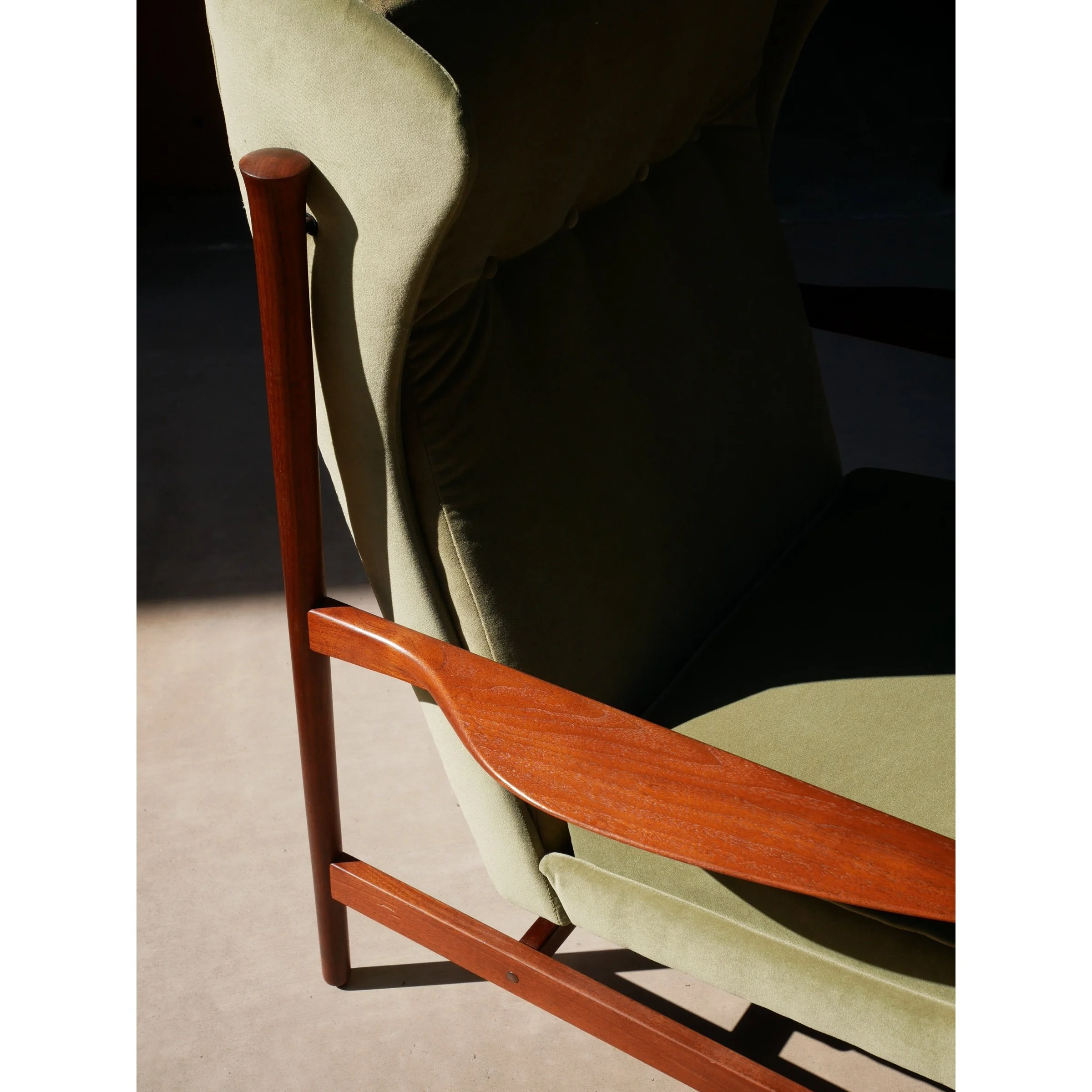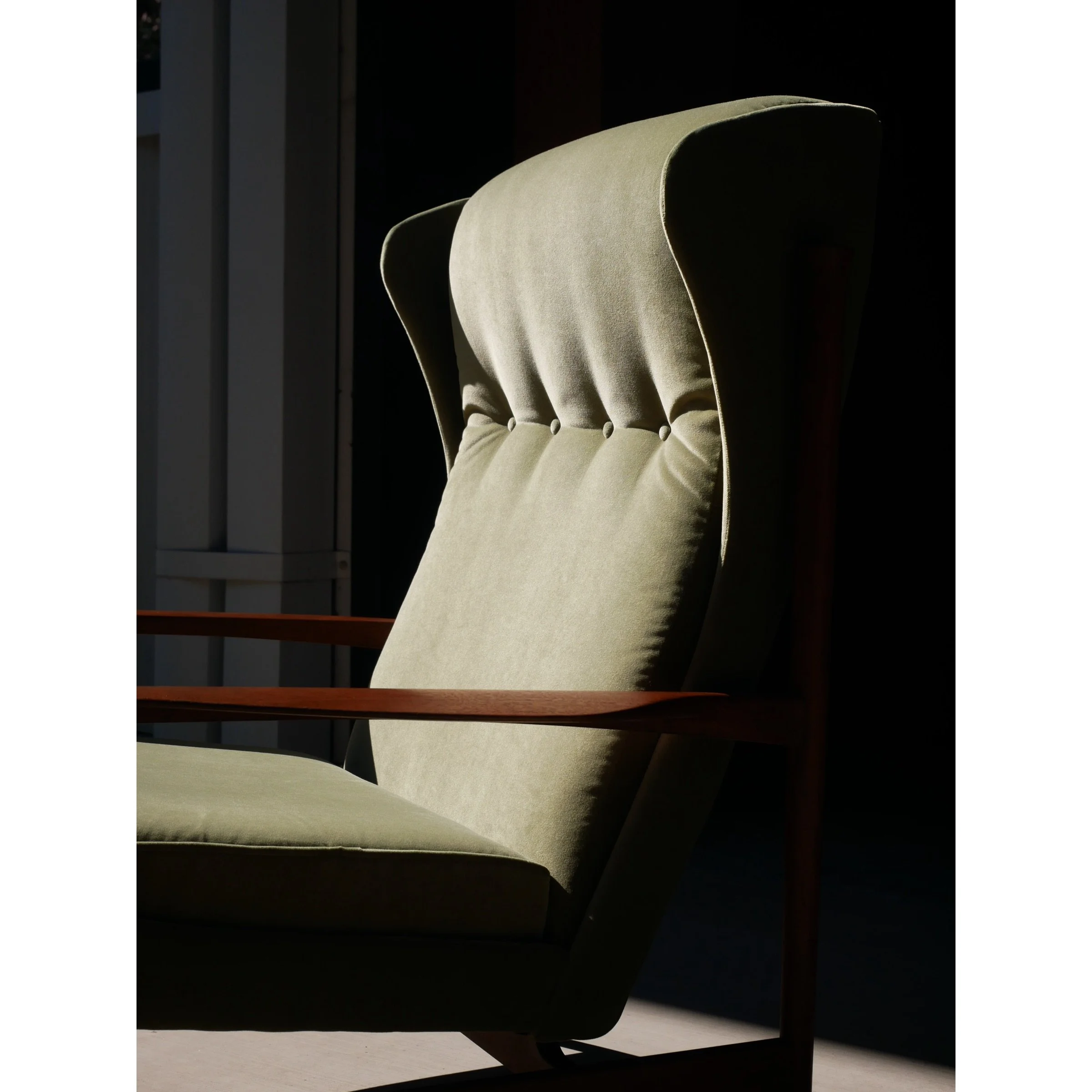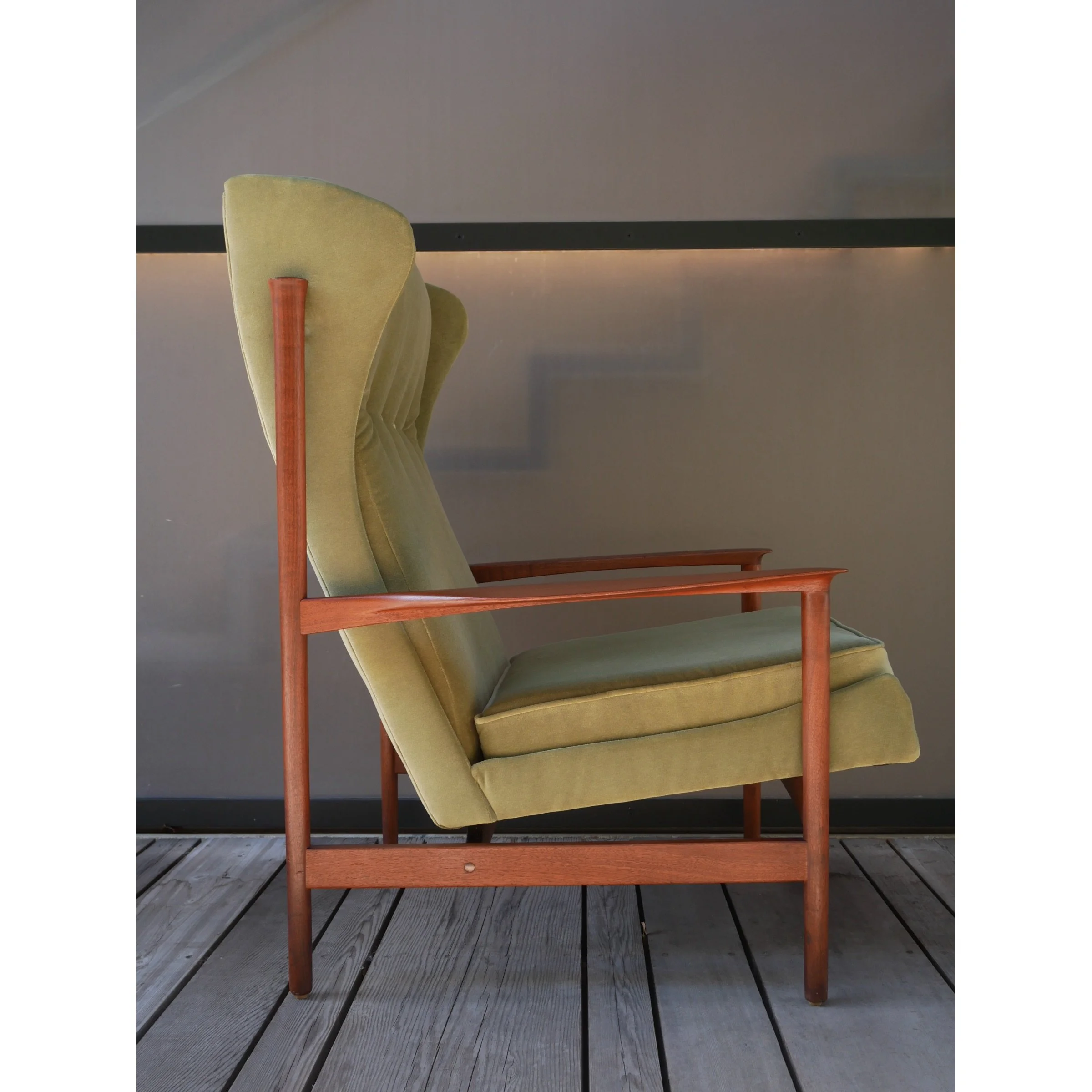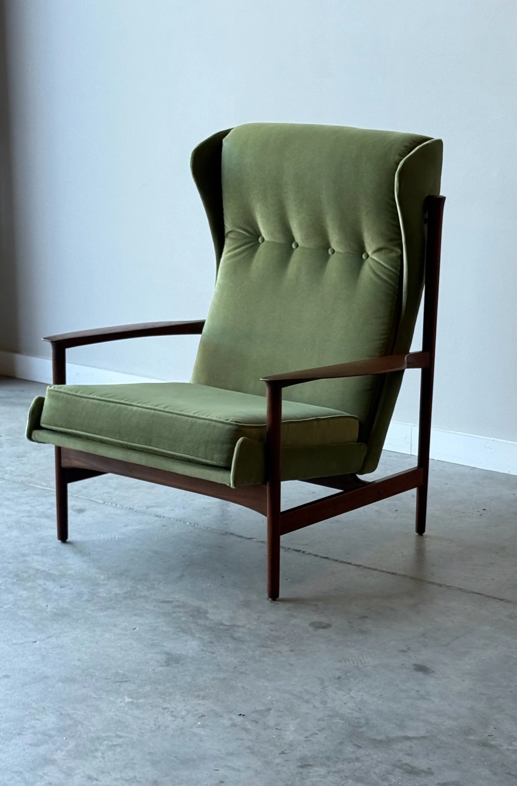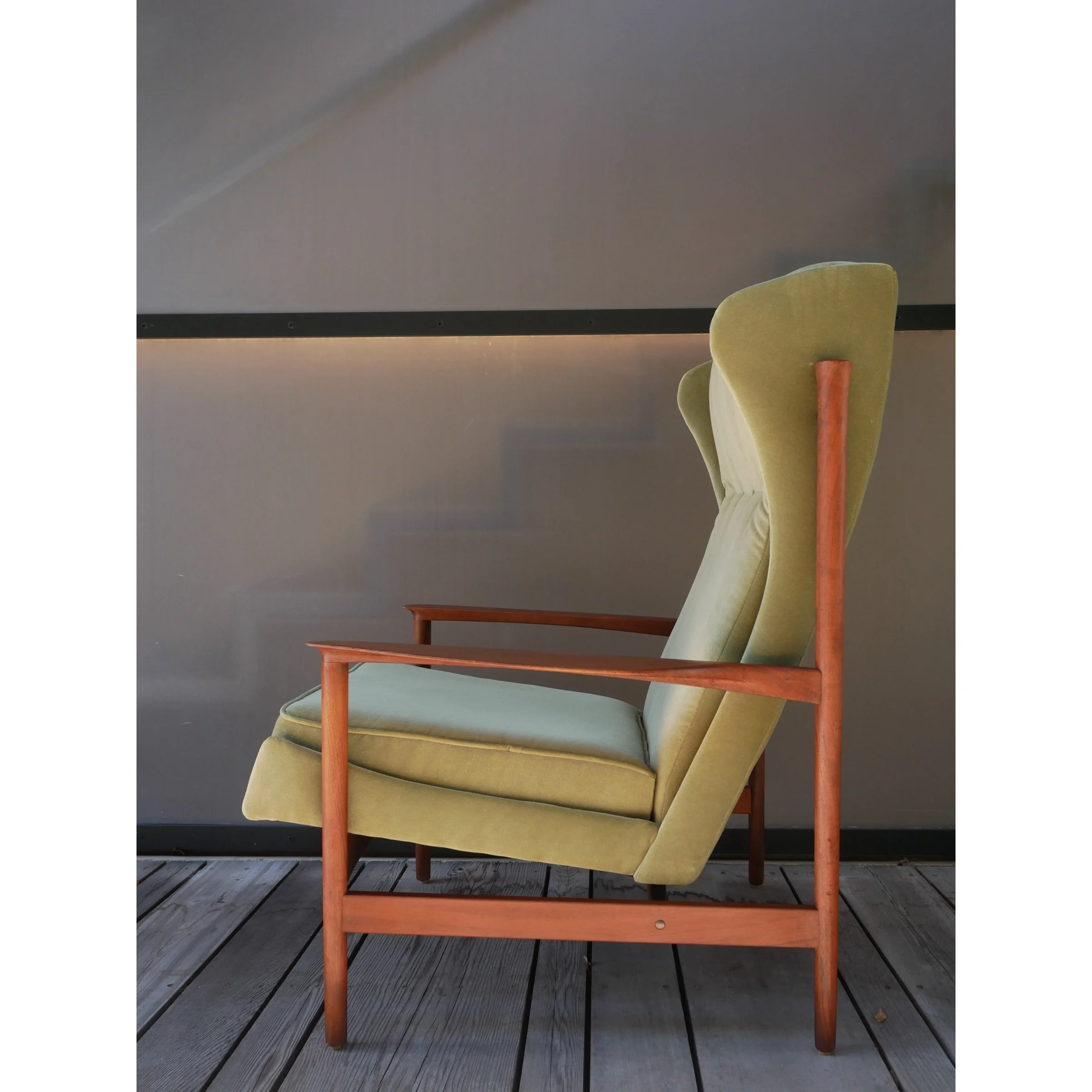 The seated section of the lounge continues with the sculptural aspect. The seat slants down into the back of the chair. The back is tall and features the wingback accent at the headrest. This lounge has been newly reupholstered in a light green velvet. The color compliments the teak wood tone while also creating a modern appeal. The seated position of this lounge is upright, perfect for a reading nook or occasional chair. In overall fantastic vintage condition with minor wear consistent with age and use.