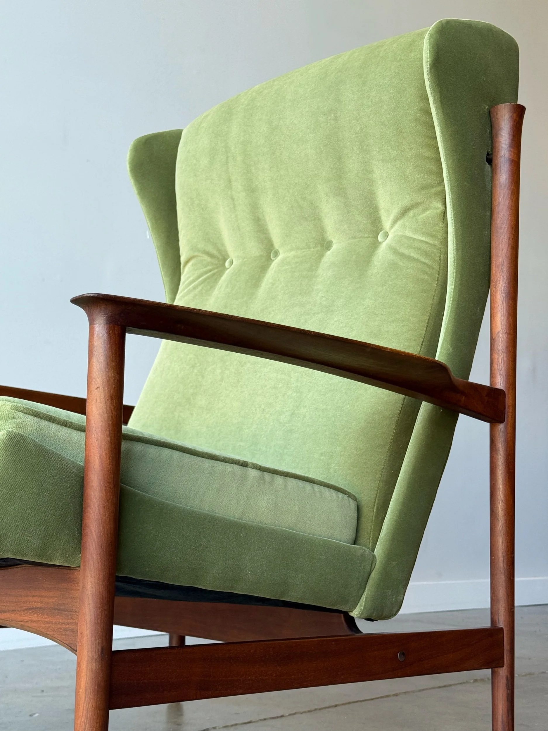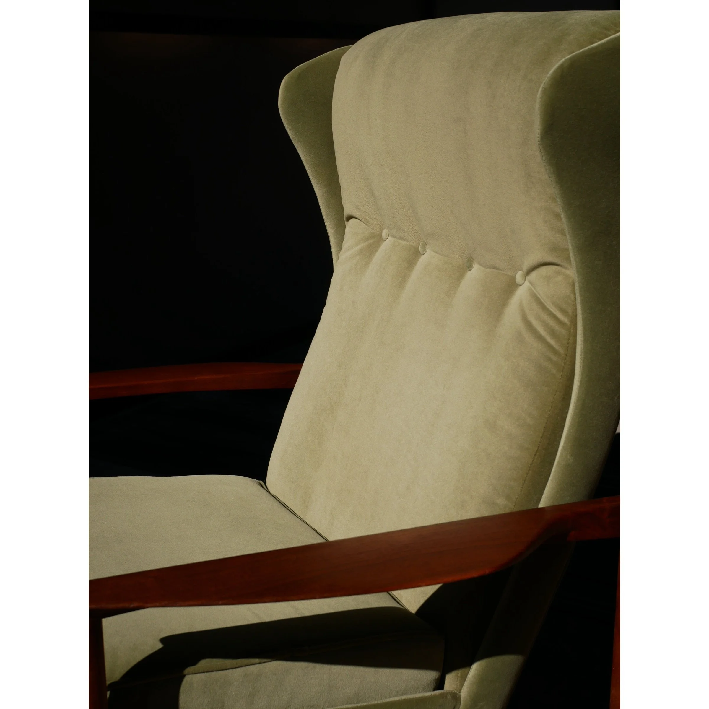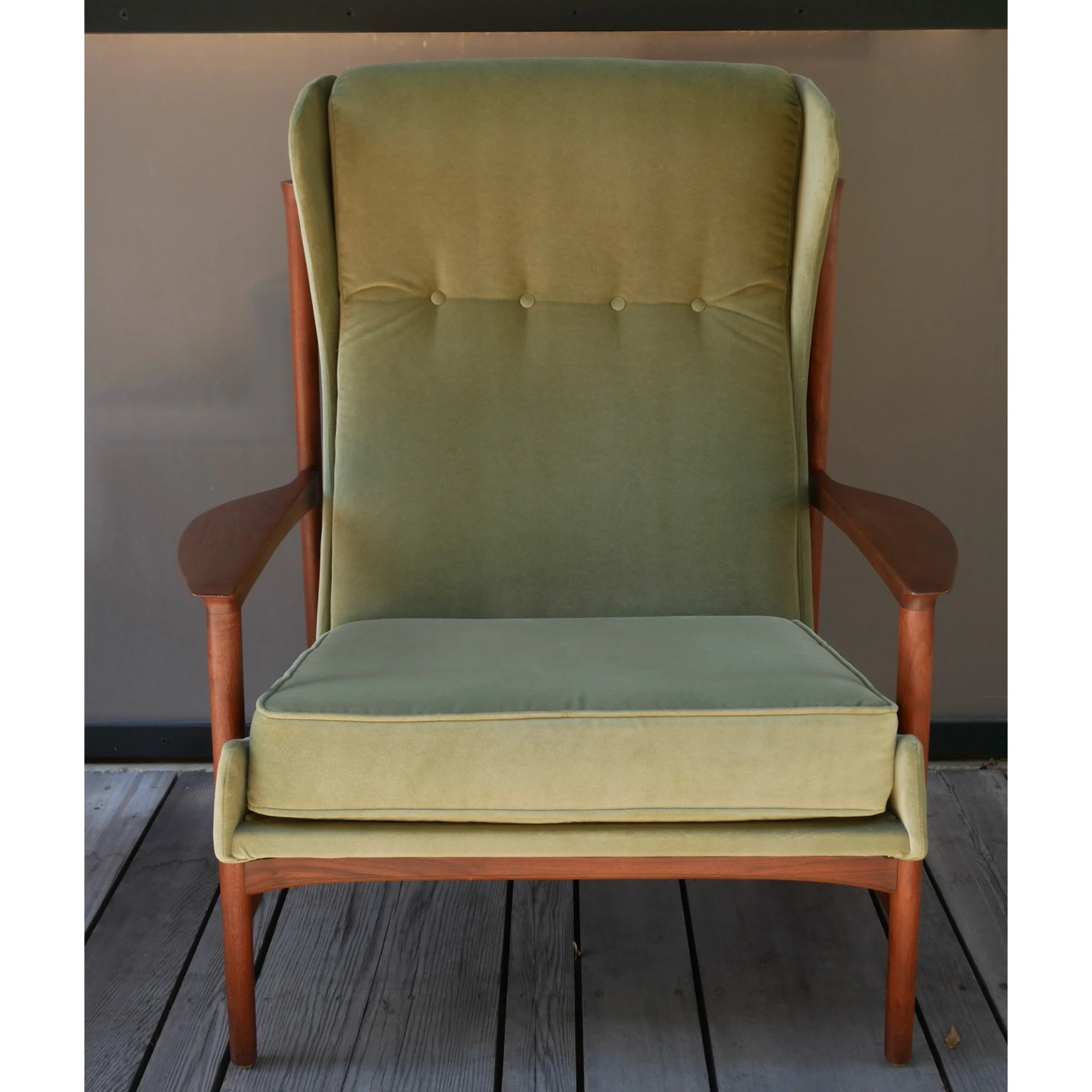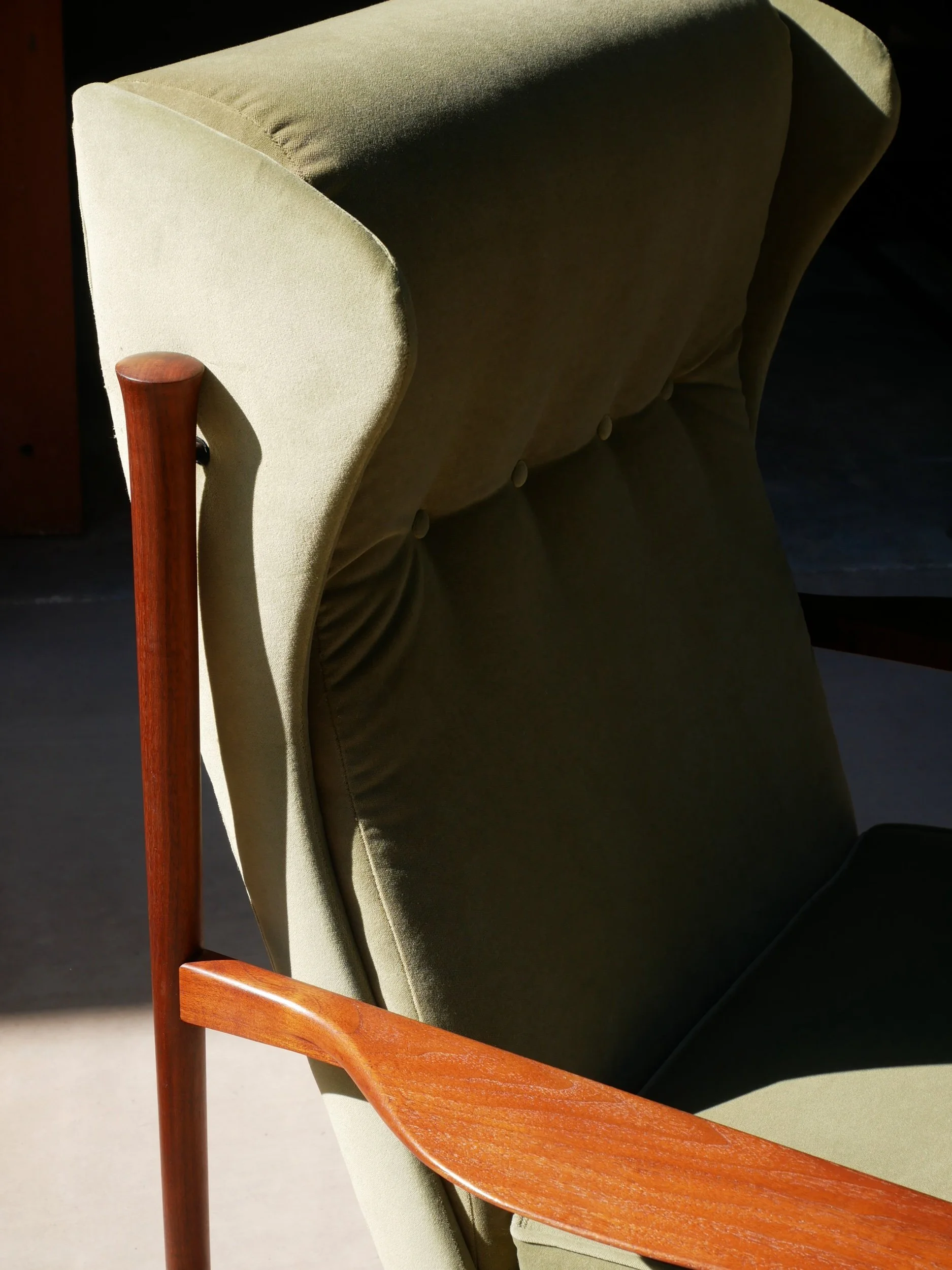 The seated section of the lounge continues with the sculptural aspect. The seat slants down into the back of the chair. The back is tall and features the wingback accent at the headrest. This lounge has been newly reupholstered in a light green velvet. The color compliments the teak wood tone while also creating a modern appeal. The seated position of this lounge is upright, perfect for a reading nook or occasional chair. In overall fantastic vintage condition with minor wear consistent with age and use.