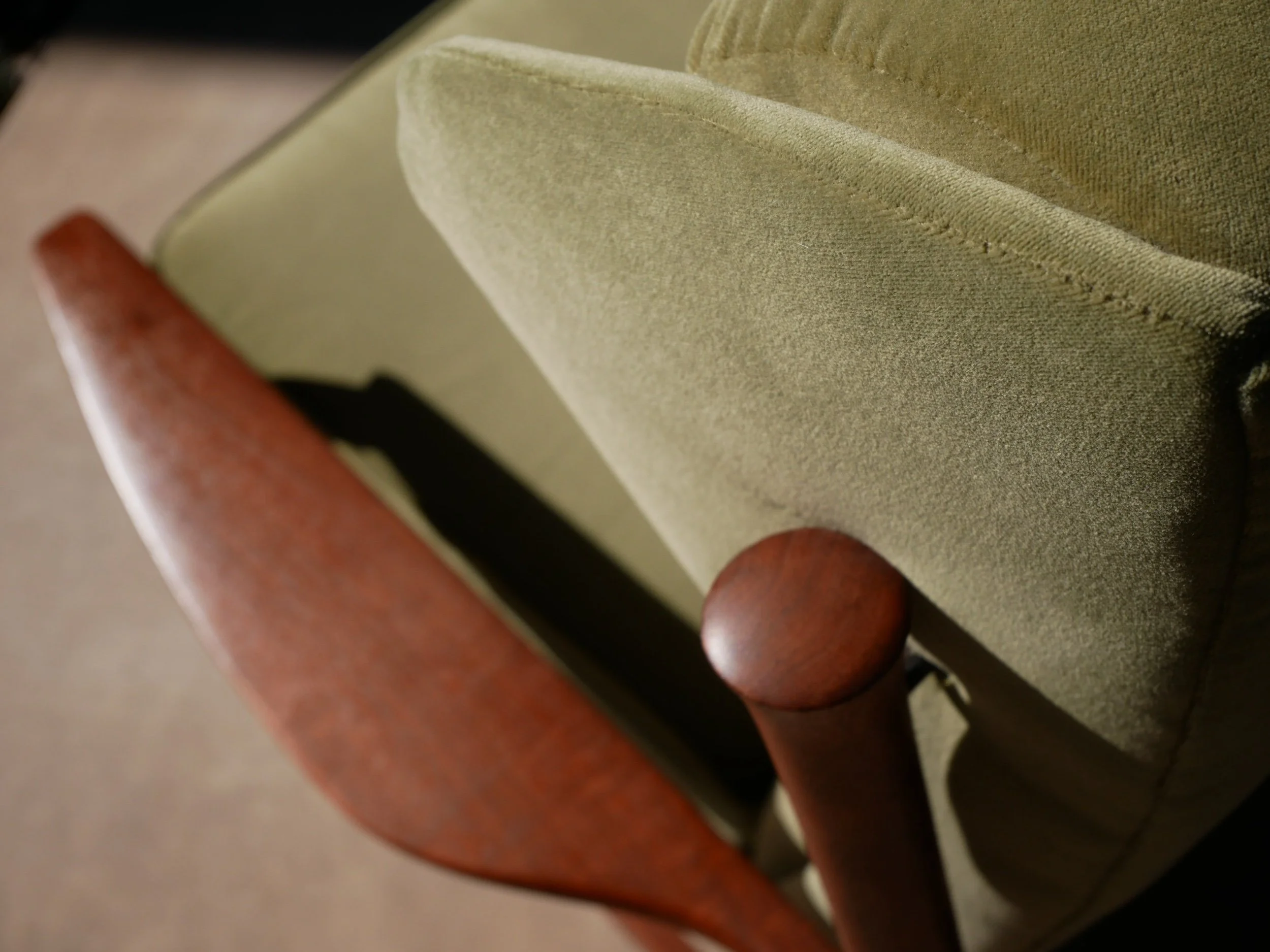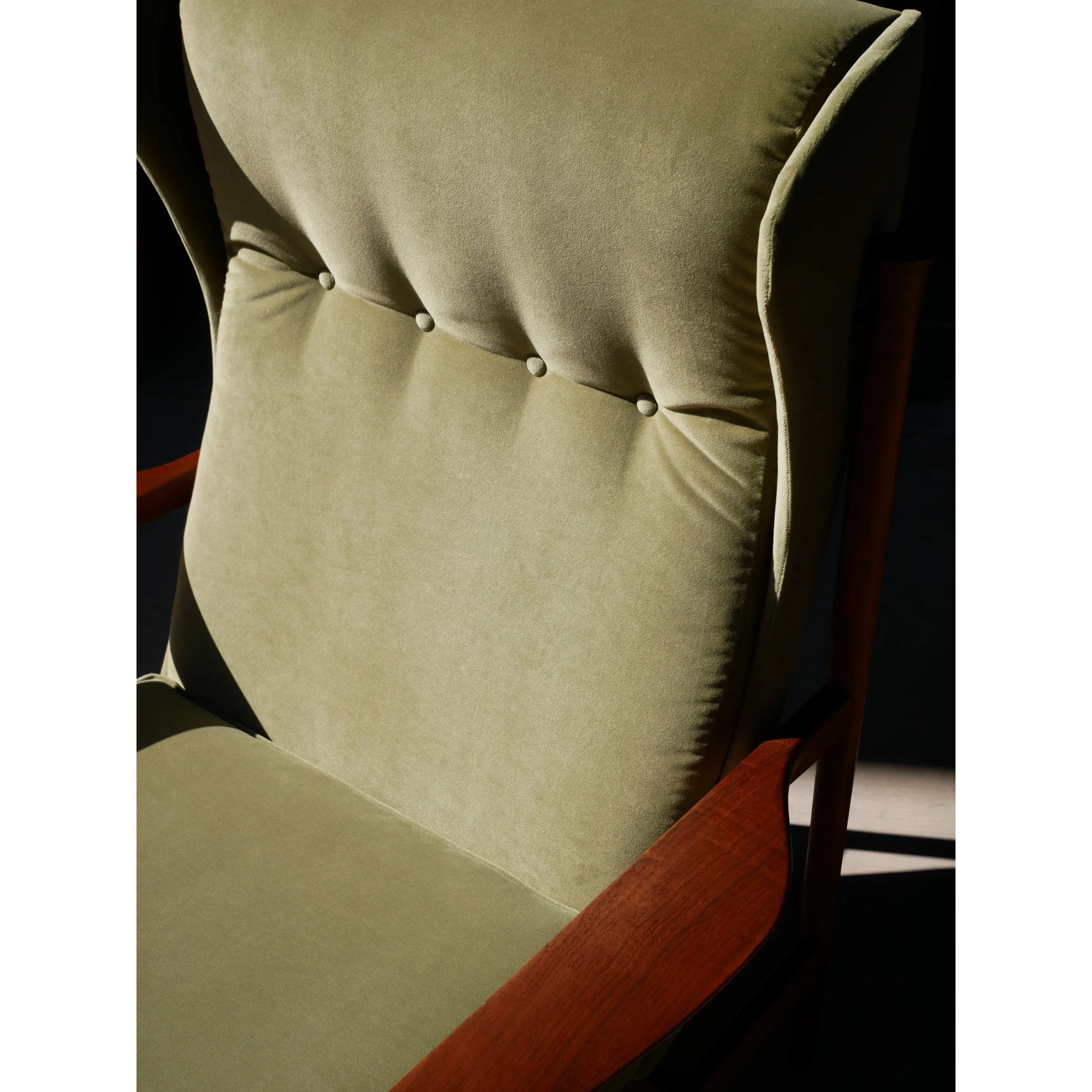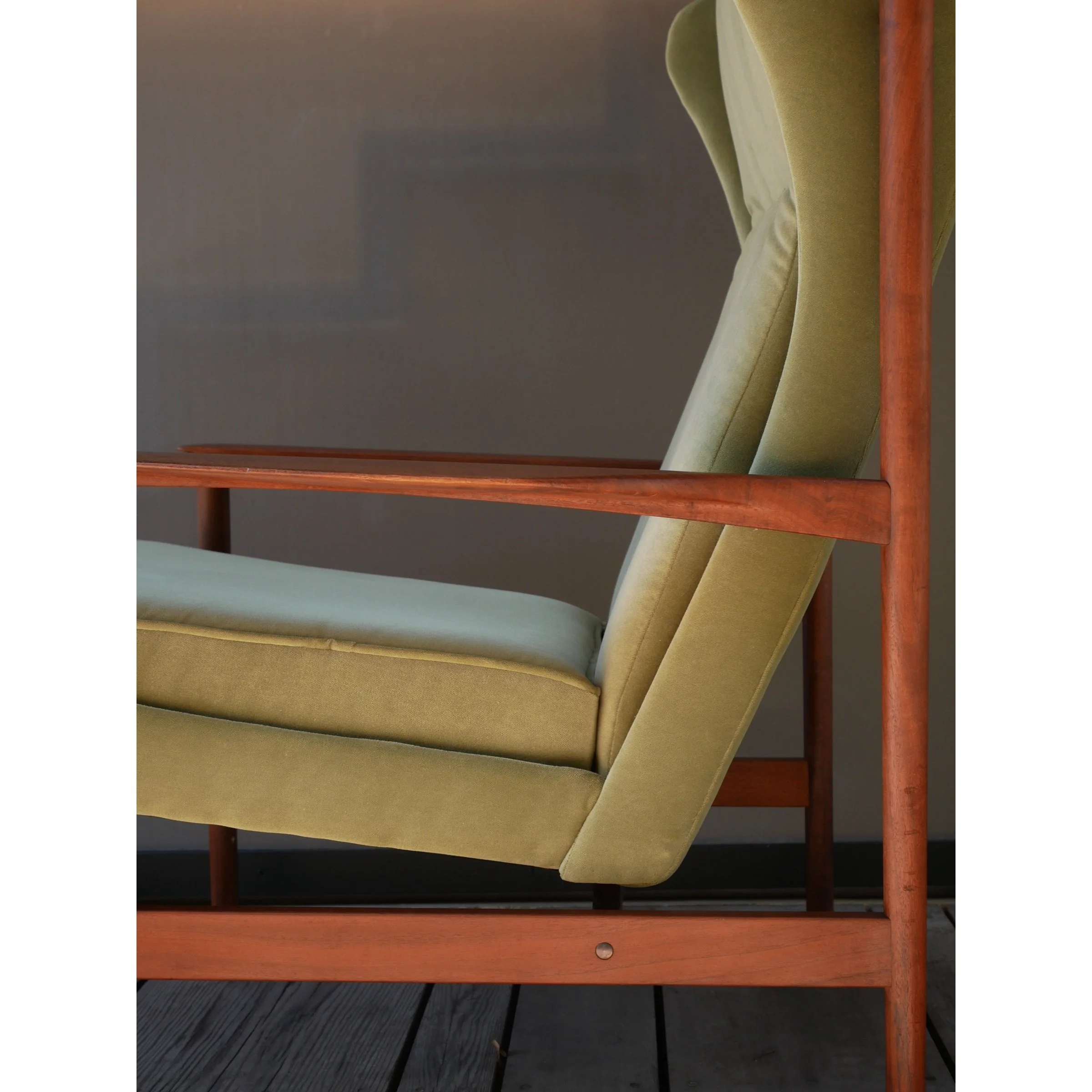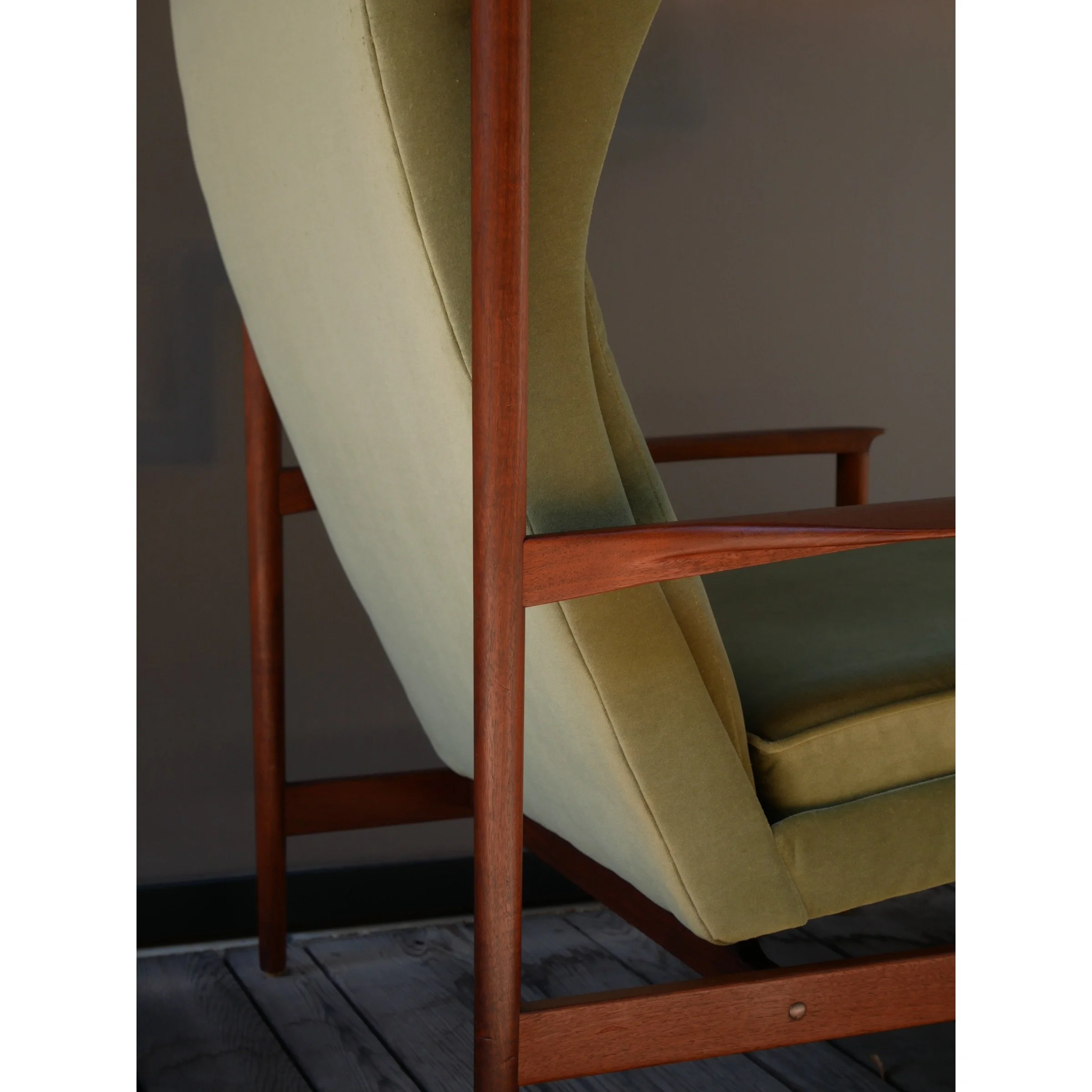 The seated section of the lounge continues with the sculptural aspect. The seat slants down into the back of the chair. The back is tall and features the wingback accent at the headrest. This lounge has been newly reupholstered in a light green velvet. The color compliments the teak wood tone while also creating a modern appeal. The seated position of this lounge is upright, perfect for a reading nook or occasional chair. In overall fantastic vintage condition with minor wear consistent with age and use.