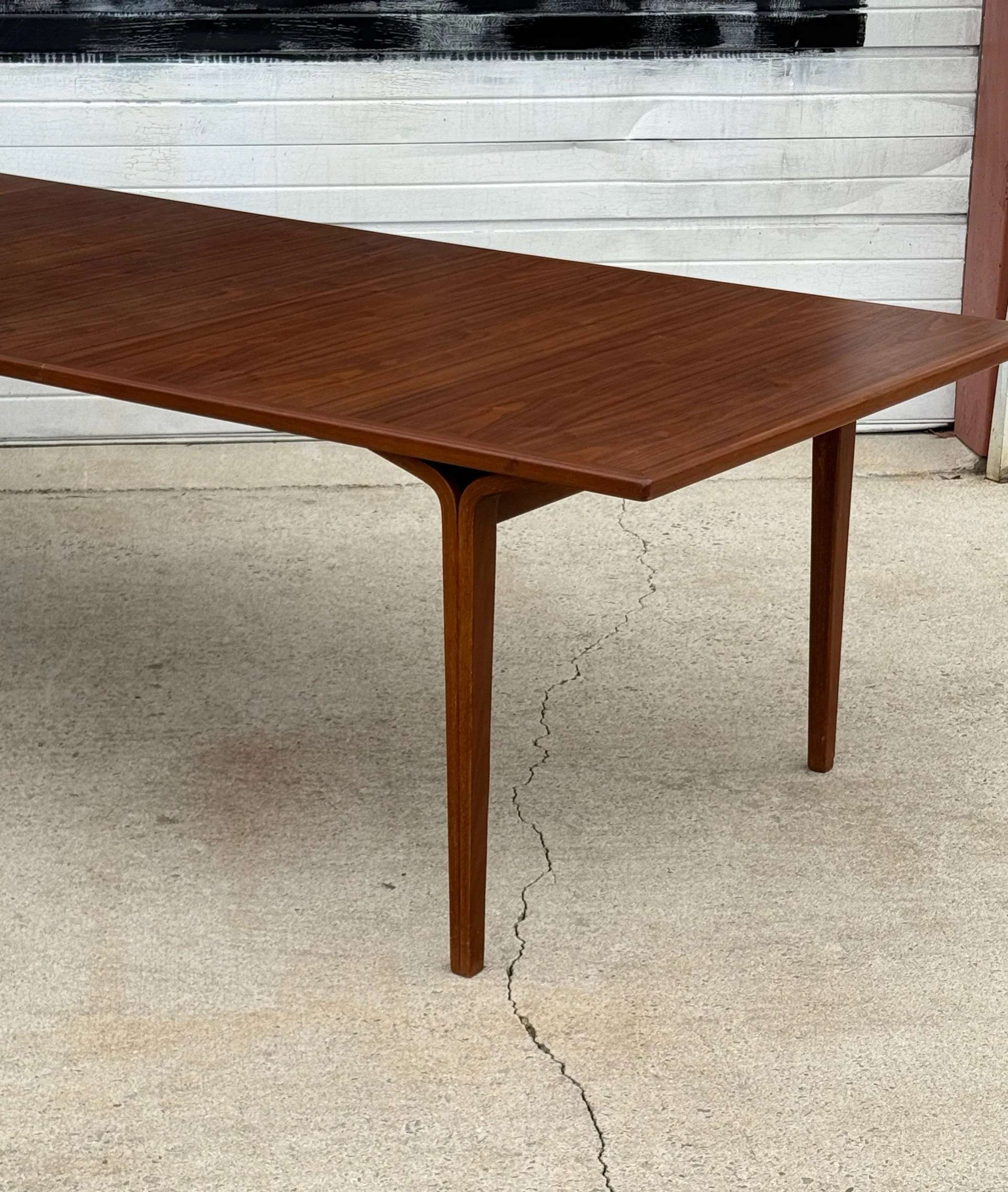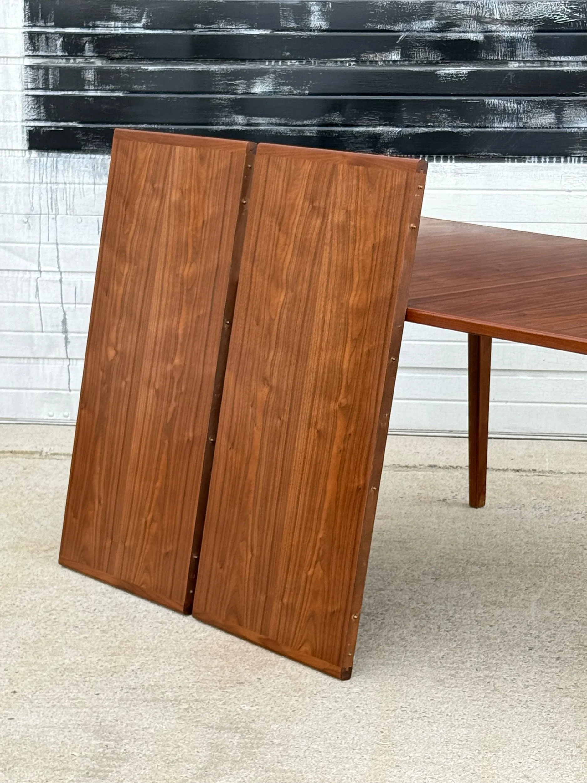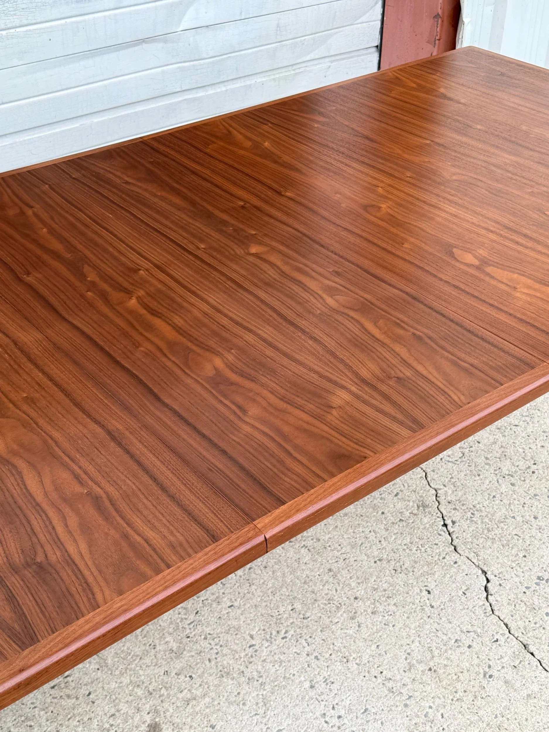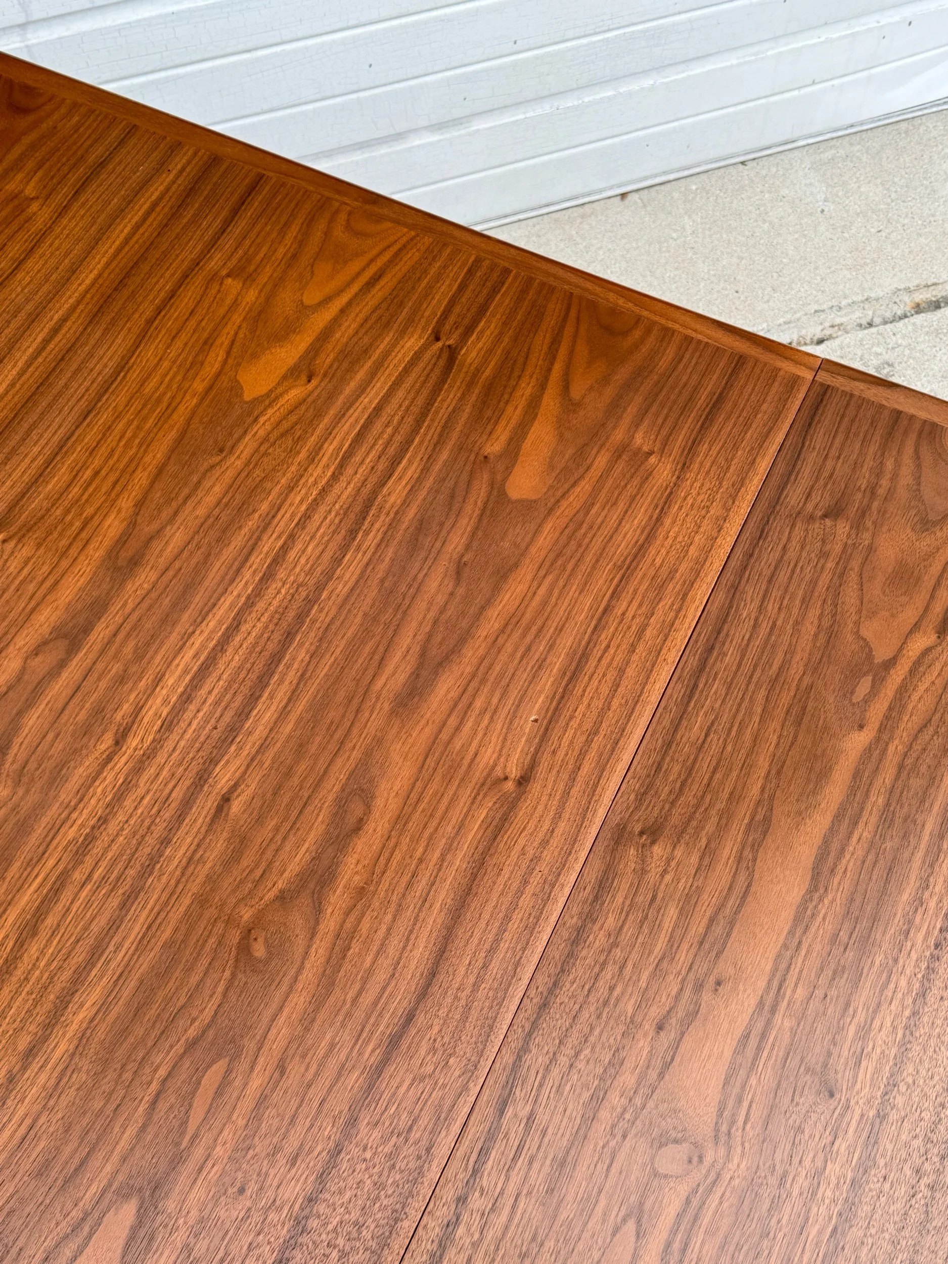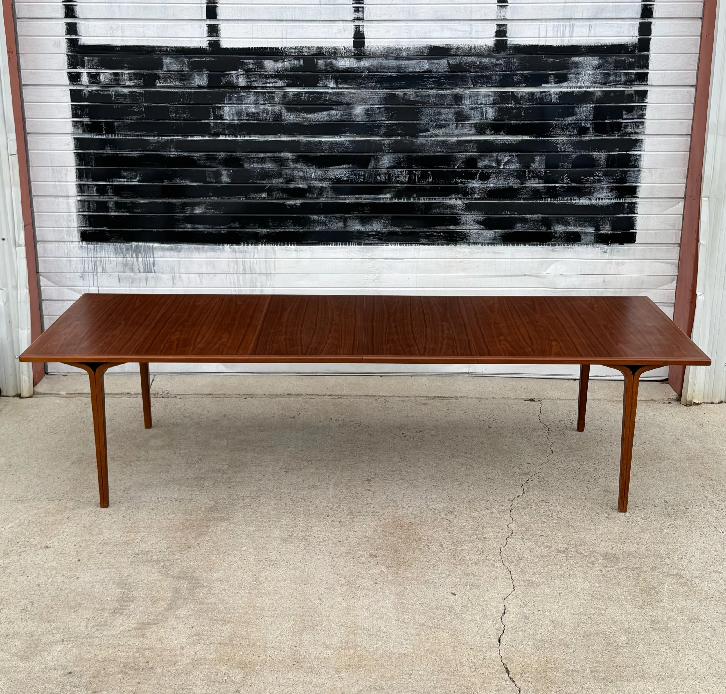 The long legs are made from bentwood walnut. They taper towards the floor and split into v-shape meeting the table with a black middle section. The shape of the legs and black accent gives this piece a mid-century Danish vibe mixed with the mid-century American aesthetic. Would work well within a vintage or contemporary styled home. This table includes two leaves, each leaf adds an additional 19” in length. Perfect for those looking for a massive table full time or adjustable to your hosting needs. In overall good vintage condition with minor wear consistent with age and use.