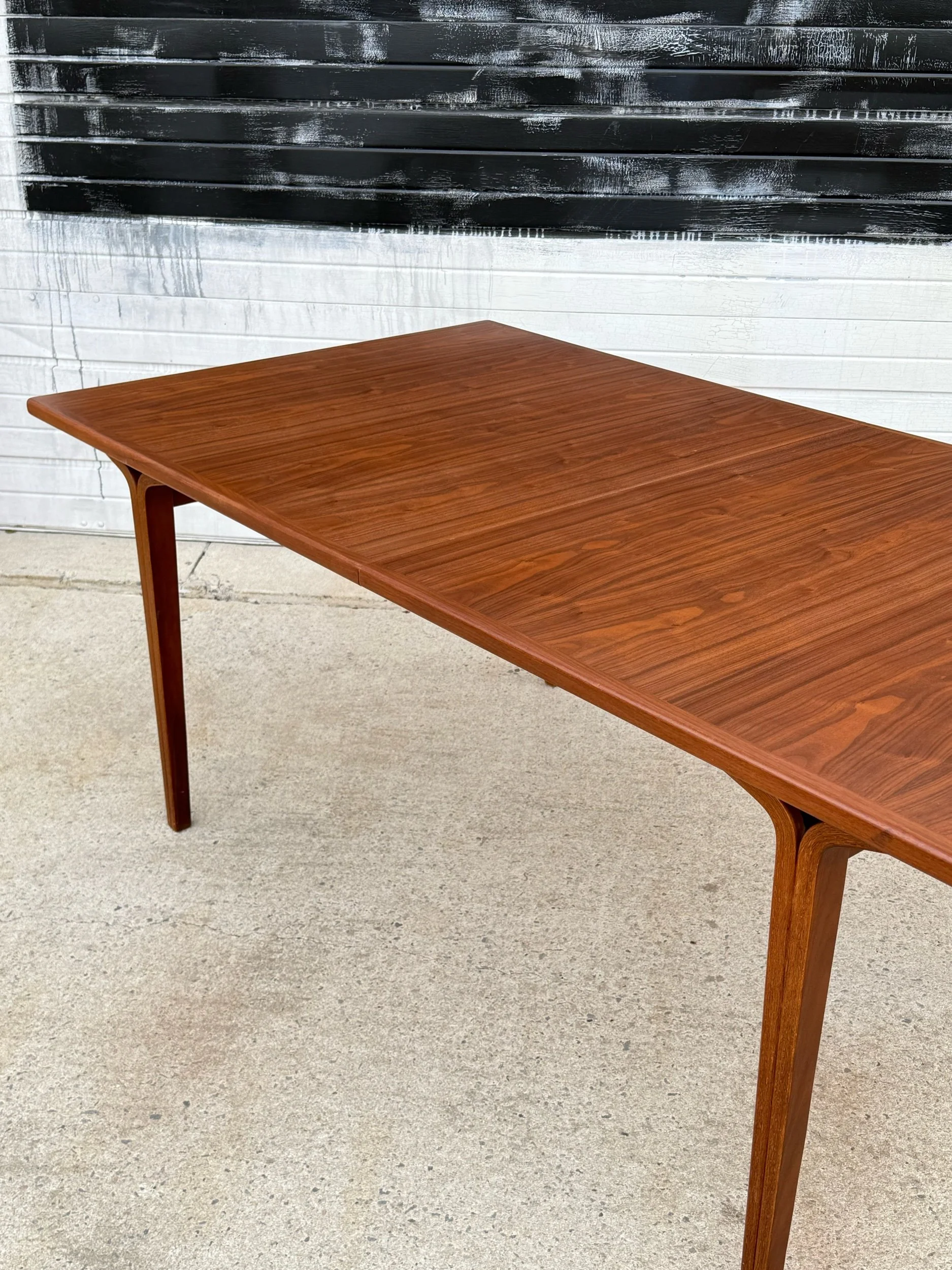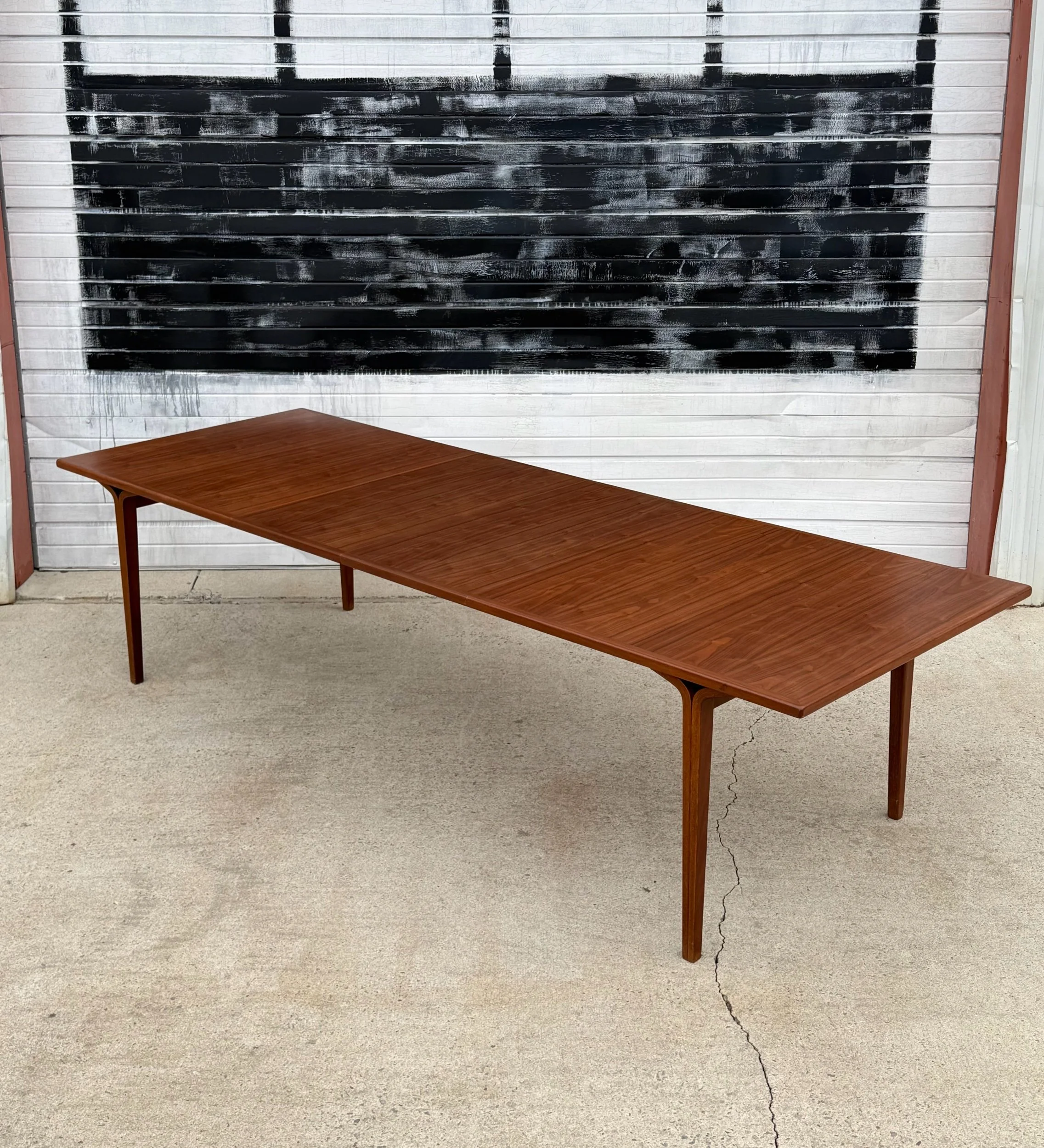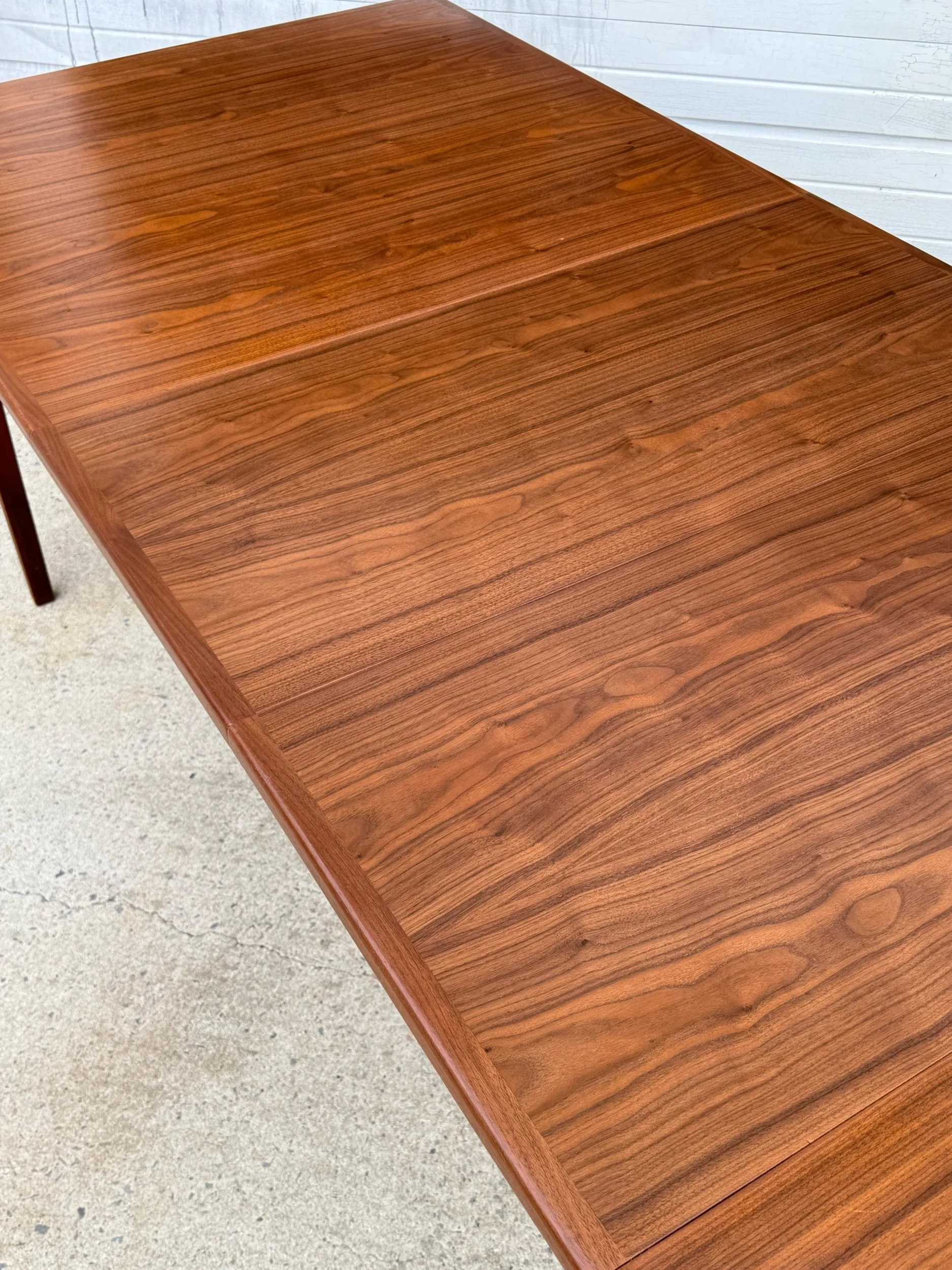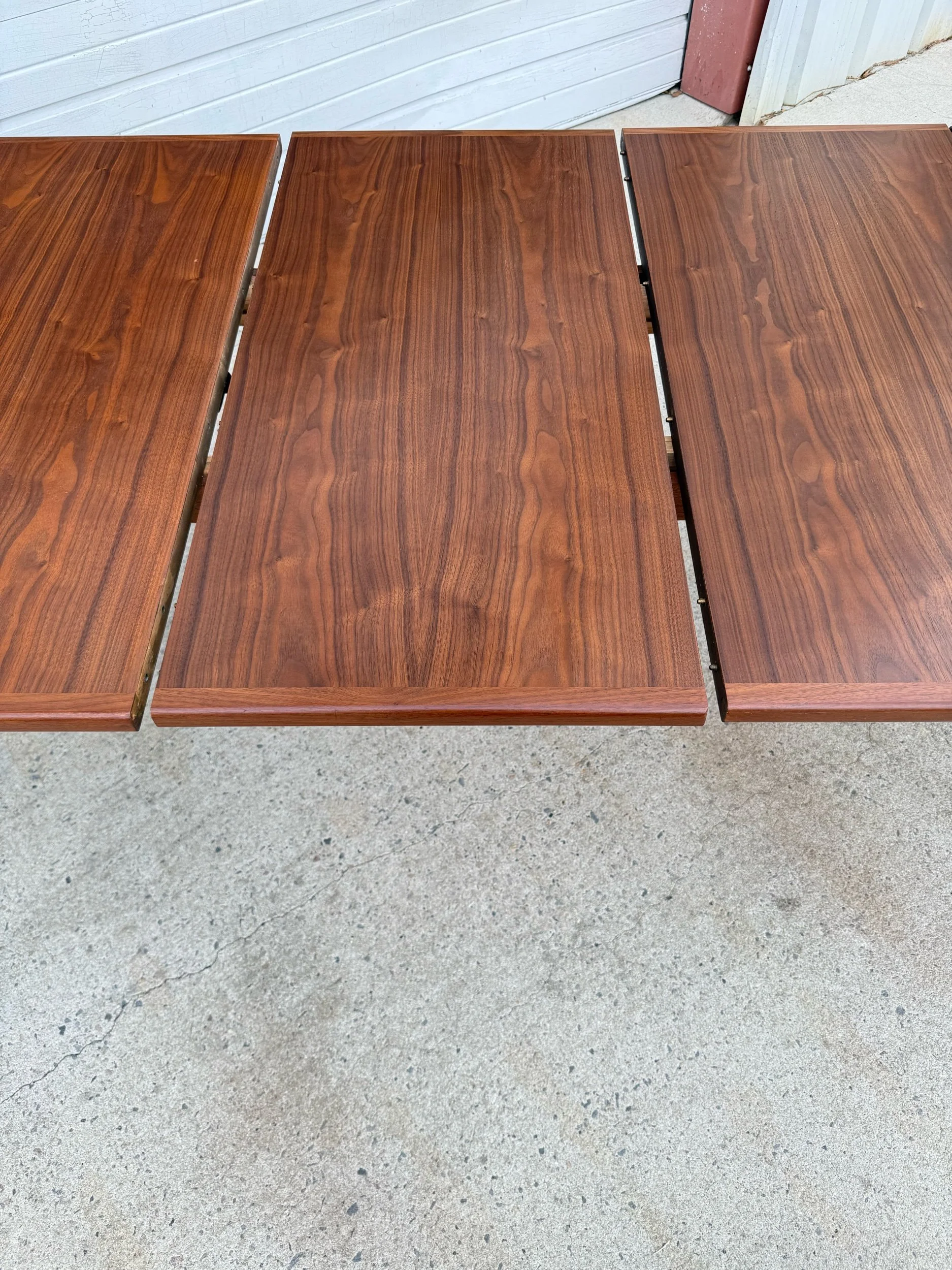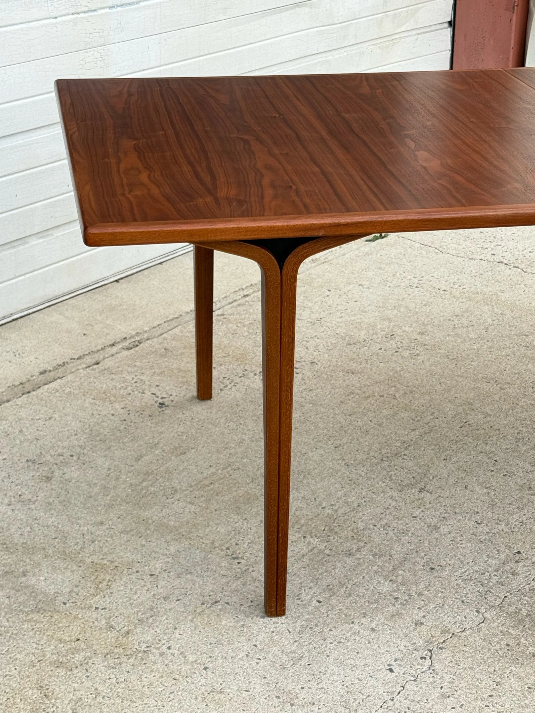 The long legs are made from bentwood walnut. They taper towards the floor and split into v-shape meeting the table with a black middle section. The shape of the legs and black accent gives this piece a mid-century Danish vibe mixed with the mid-century American aesthetic. Would work well within a vintage or contemporary styled home. This table includes two leaves, each leaf adds an additional 19” in length. Perfect for those looking for a massive table full time or adjustable to your hosting needs. In overall good vintage condition with minor wear consistent with age and use.