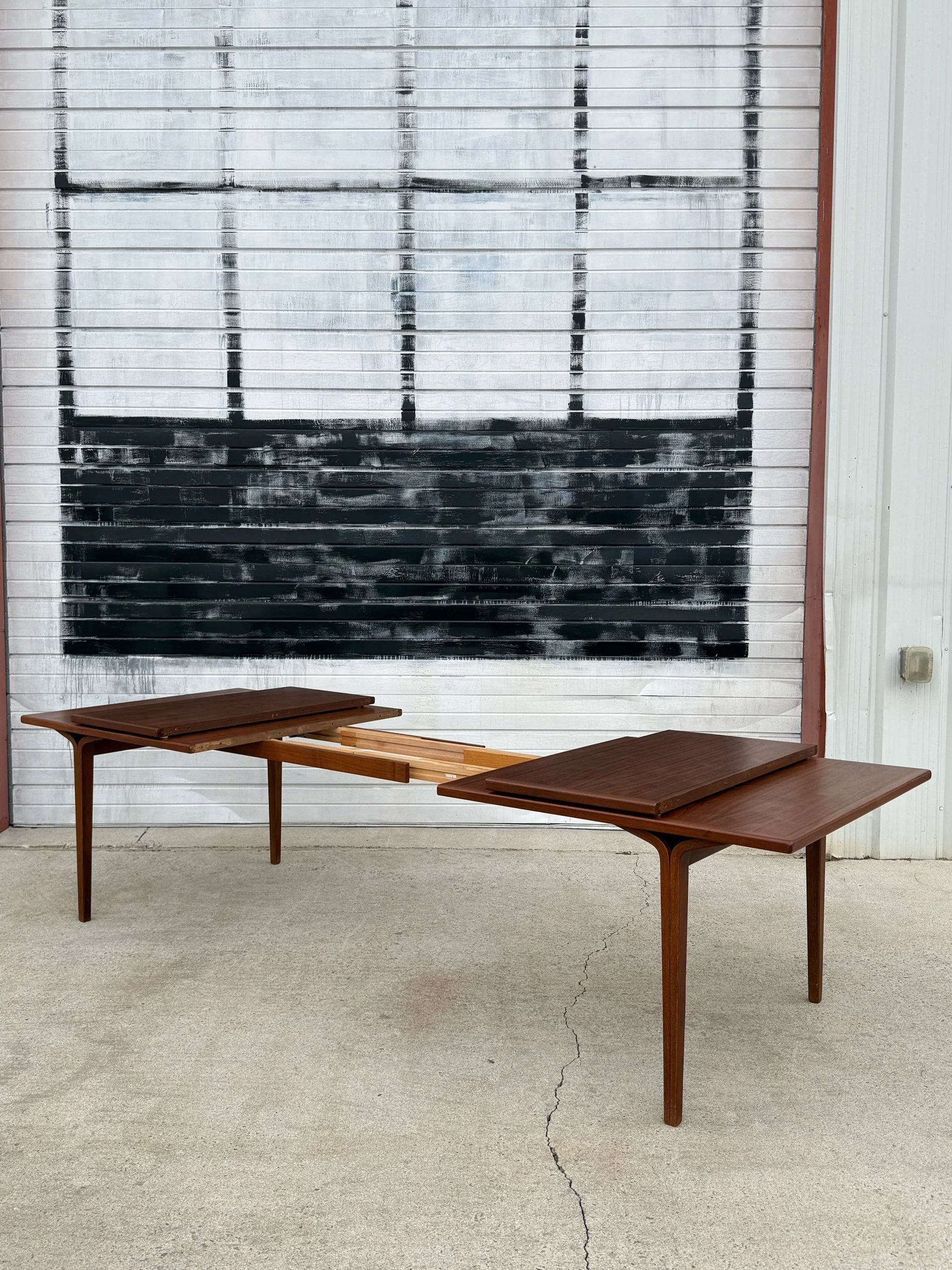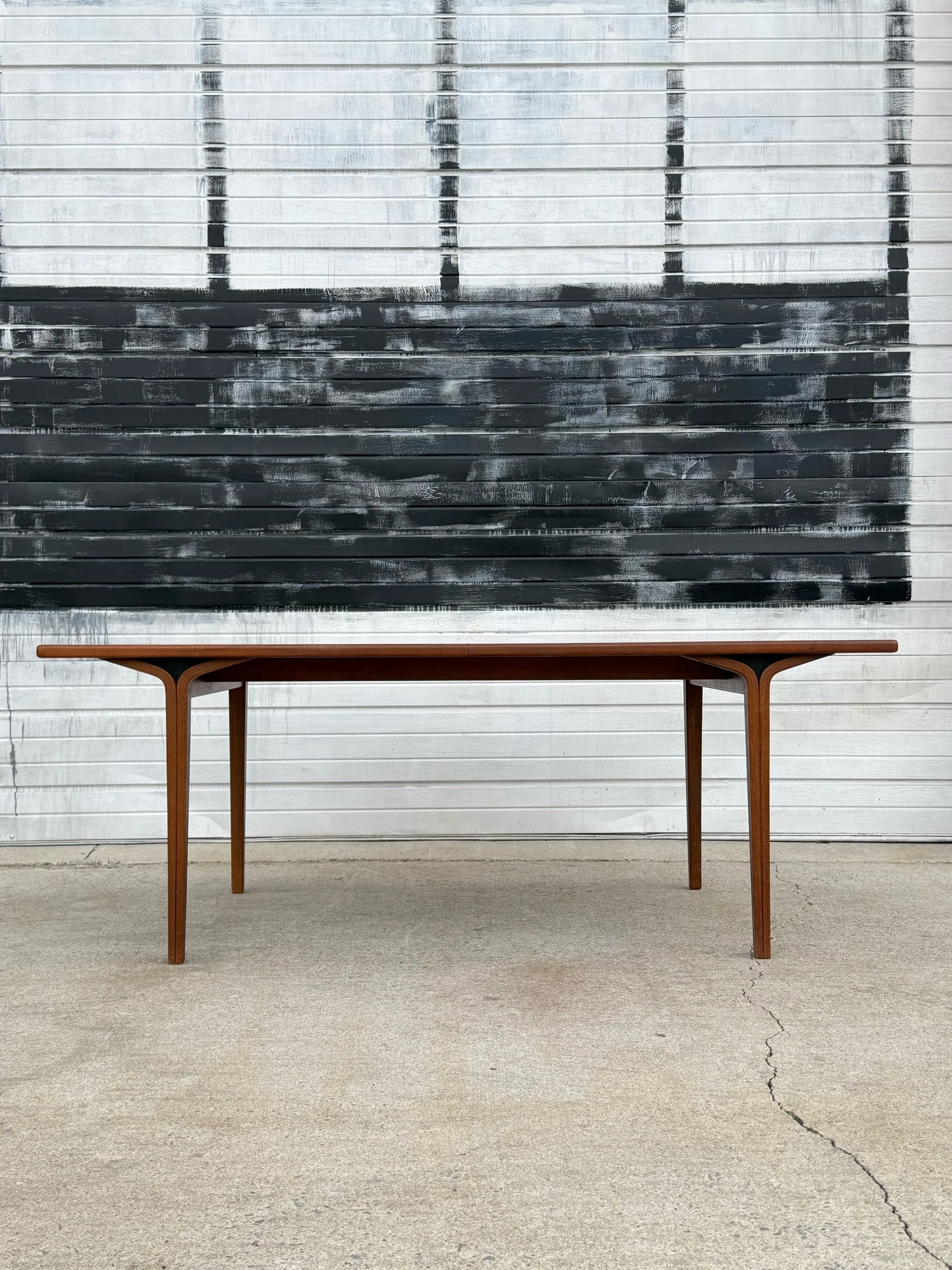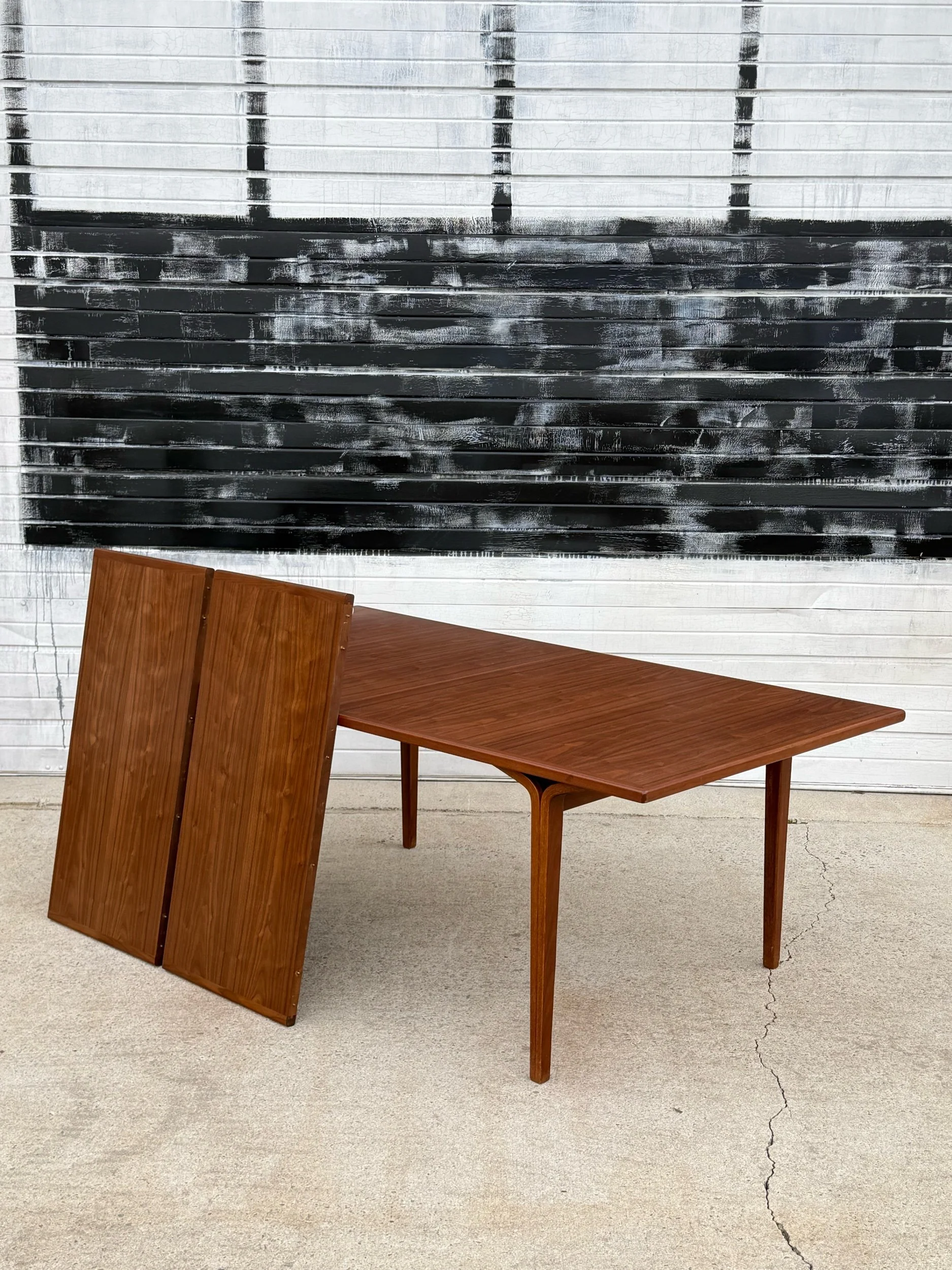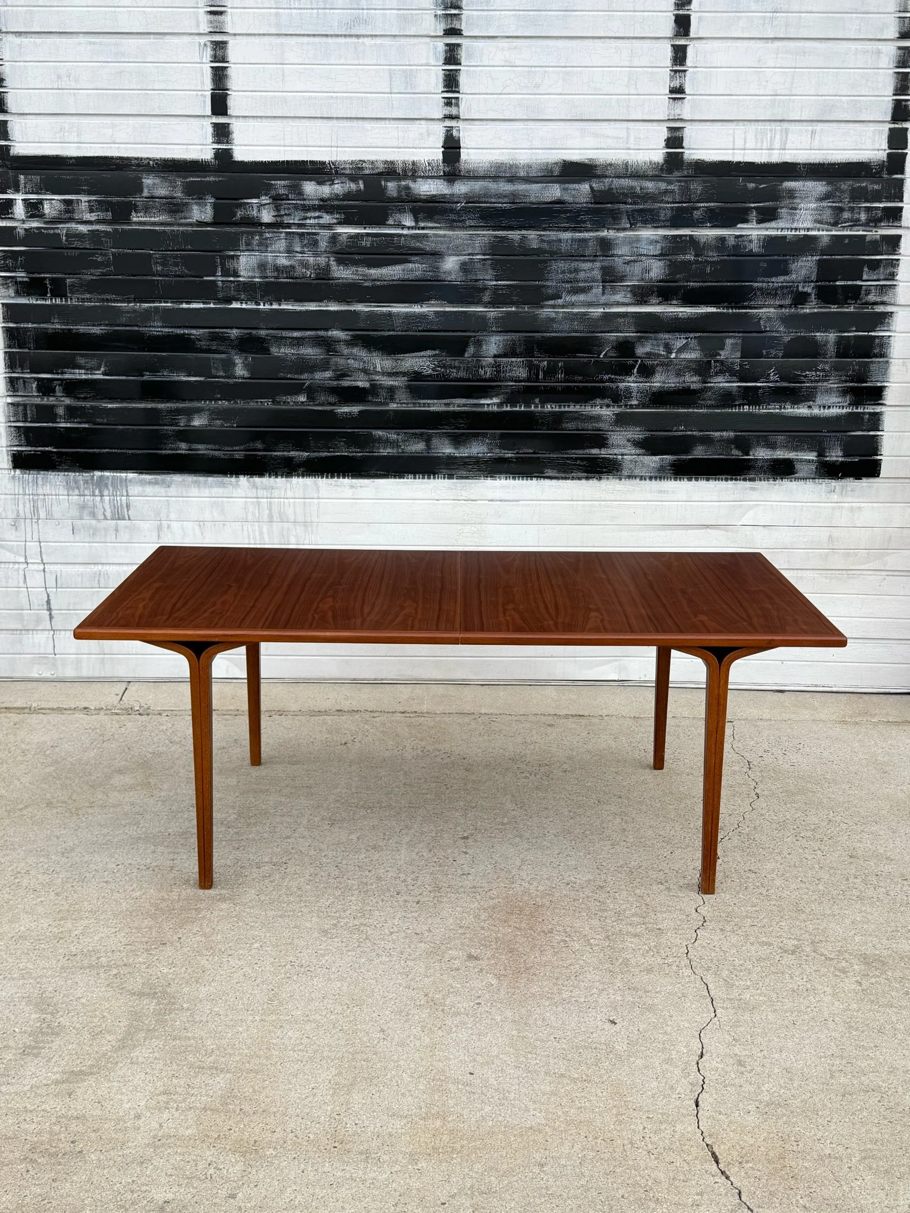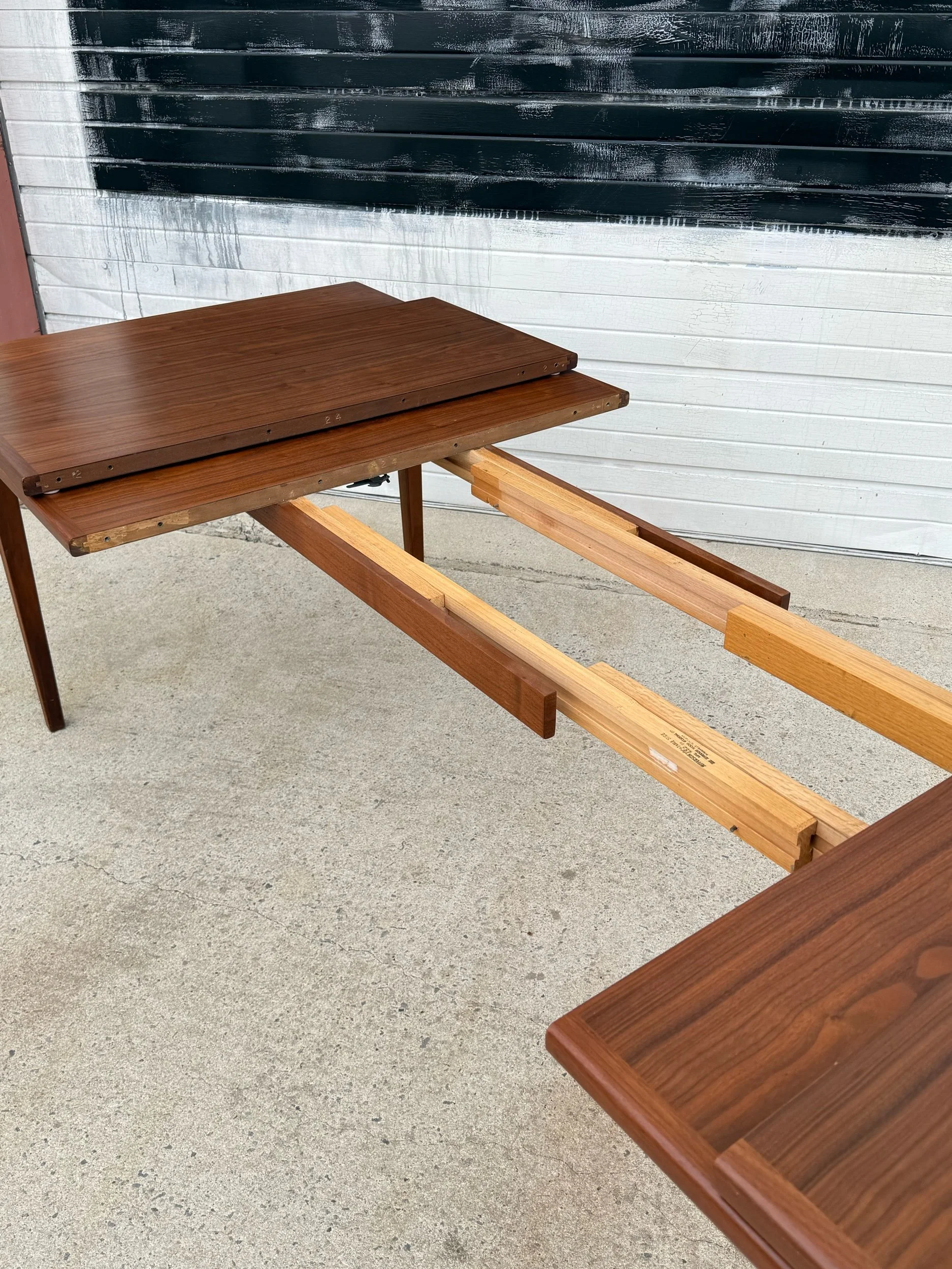 The long legs are made from bentwood walnut. They taper towards the floor and split into v-shape meeting the table with a black middle section. The shape of the legs and black accent gives this piece a mid-century Danish vibe mixed with the mid-century American aesthetic. Would work well within a vintage or contemporary styled home. This table includes two leaves, each leaf adds an additional 19” in length. Perfect for those looking for a massive table full time or adjustable to your hosting needs. In overall good vintage condition with minor wear consistent with age and use.