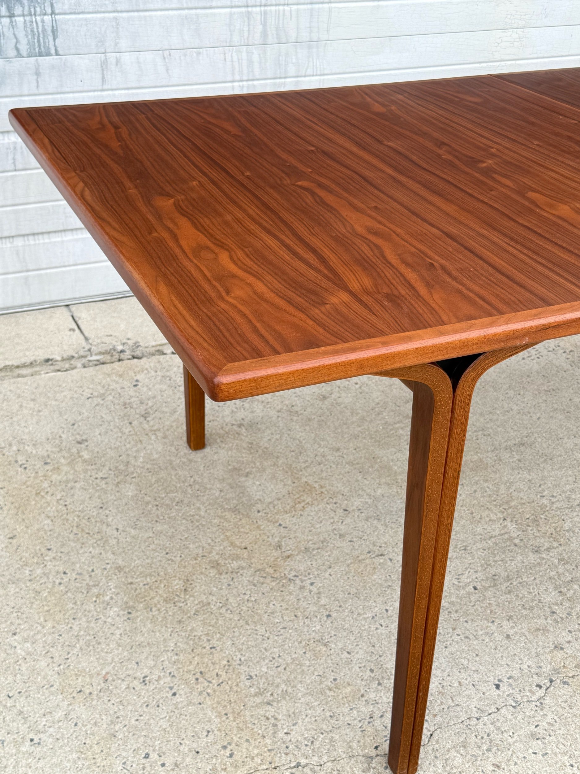 Mid-century bentwood walnut dining table with two leaves designed by Bill Stephens for Knoll, circa 1970s. This unique dining table features a rectangular shaped table top with warm woodgrain and rounded corners. The legs are really what steal the show.