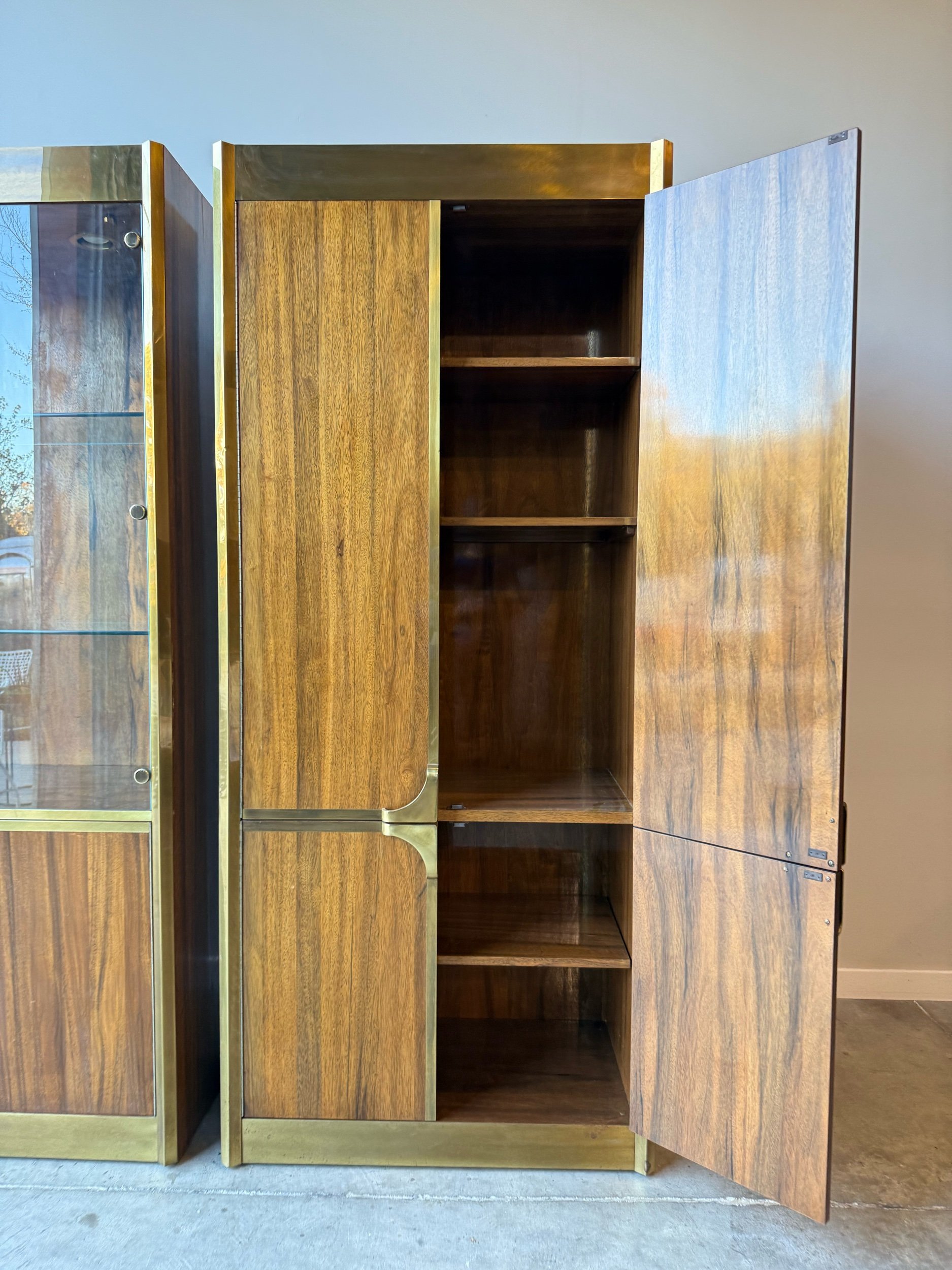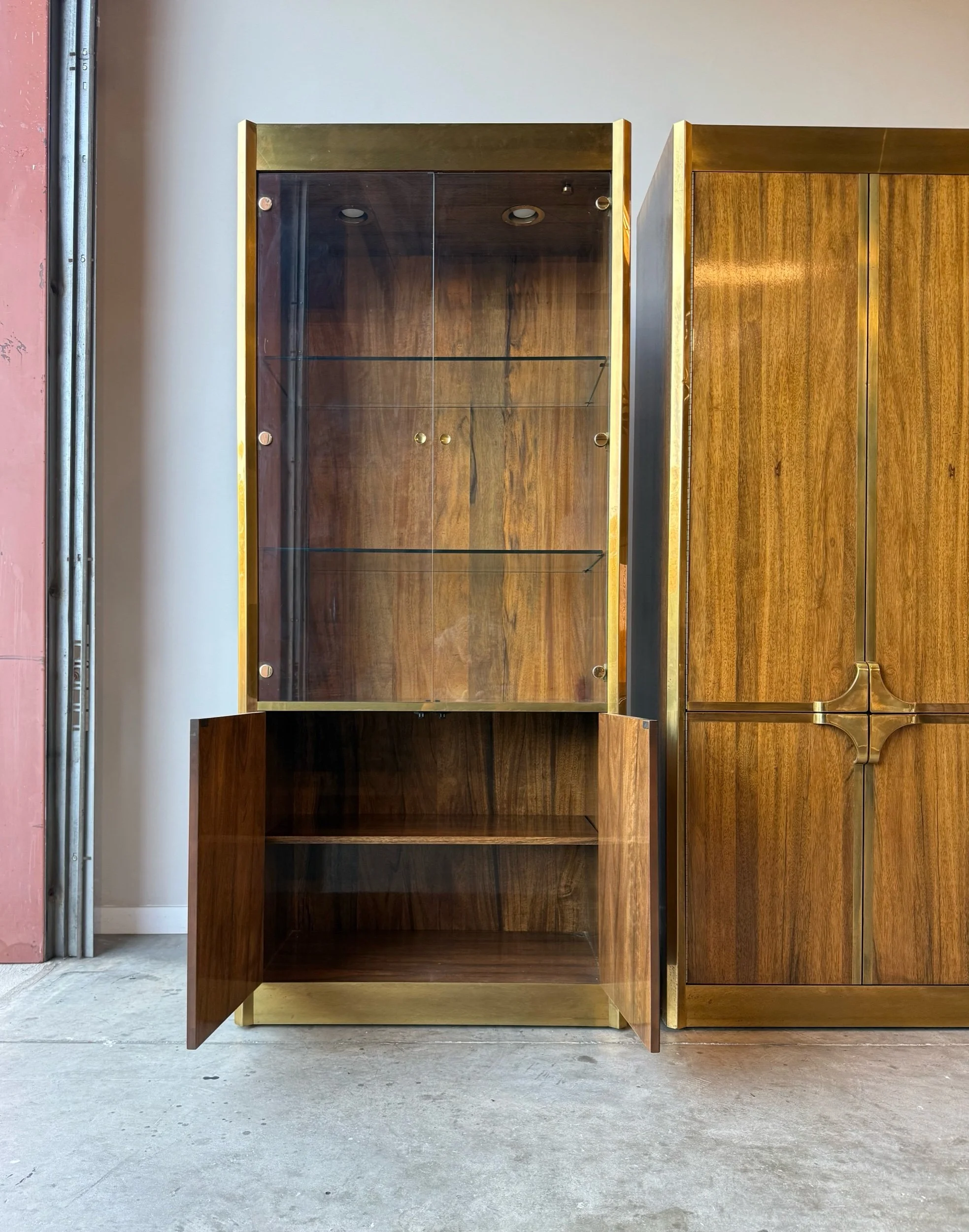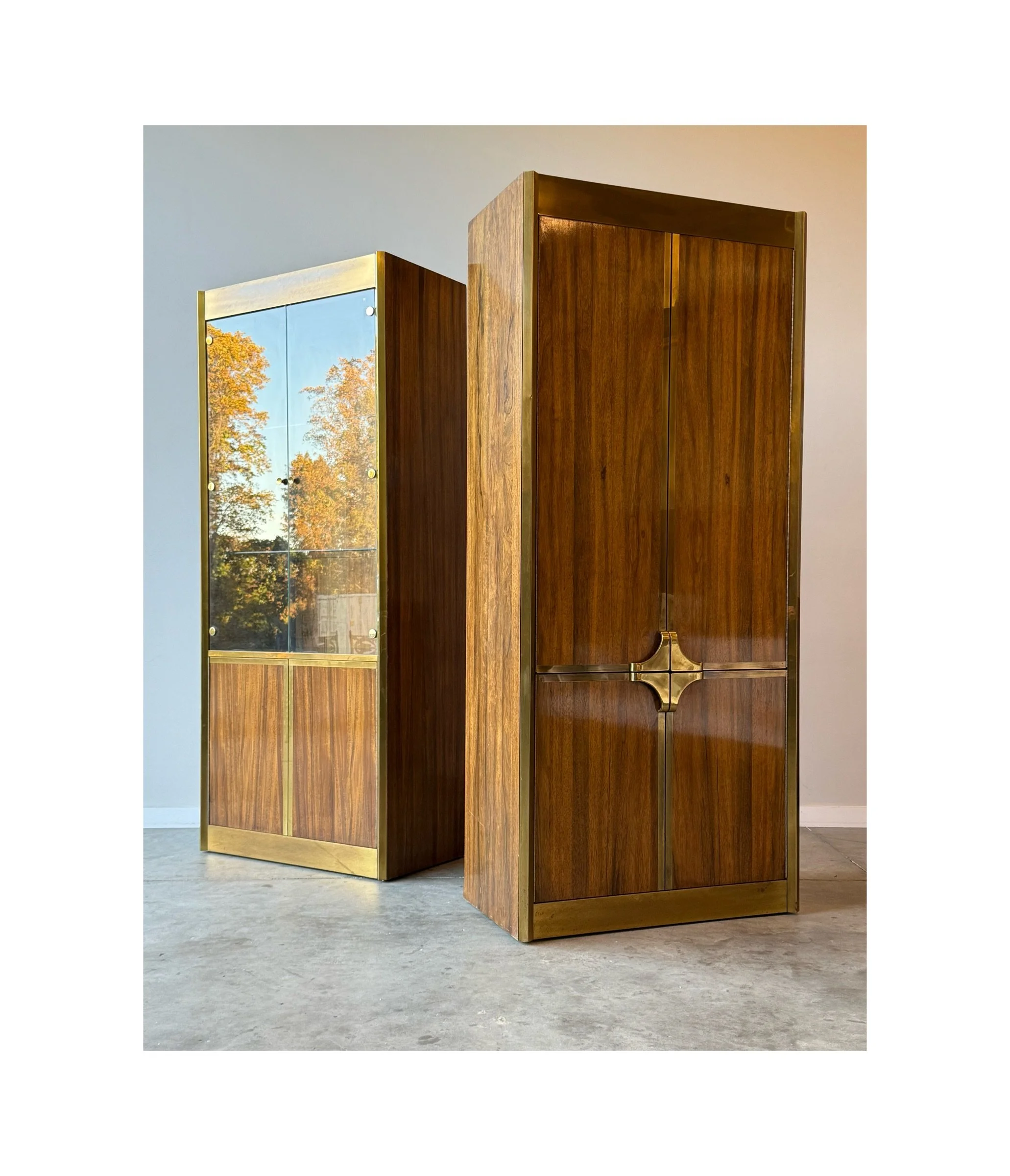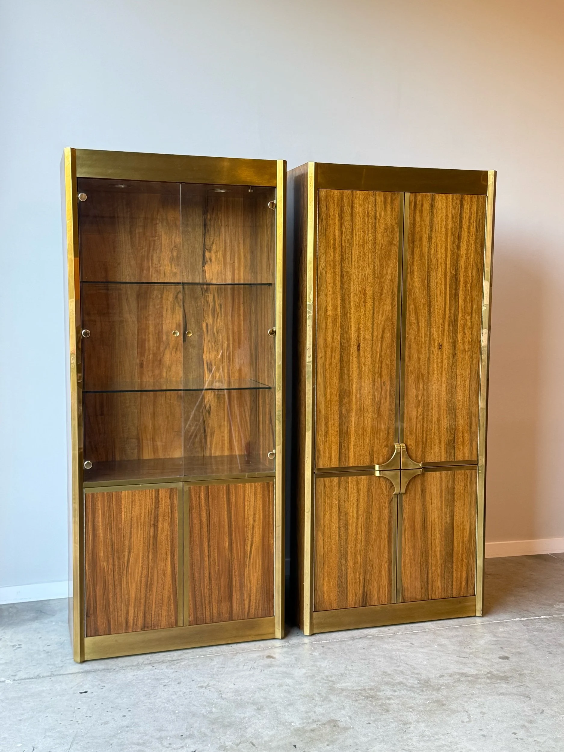 One cabinet features two glass doors that open to interior glass shelves and lighting. Original rounded brass hardware and circular rounded brass accents on the door fronts. The bottom features two more doors with wooden fronts that open to a smaller storage cabinet. A truly unique piece that would show off your collection of items. We can imagine this piece being used for a rare glass collection, fragrance collection, bar storage, or whatever you may want to show off as a statement piece.