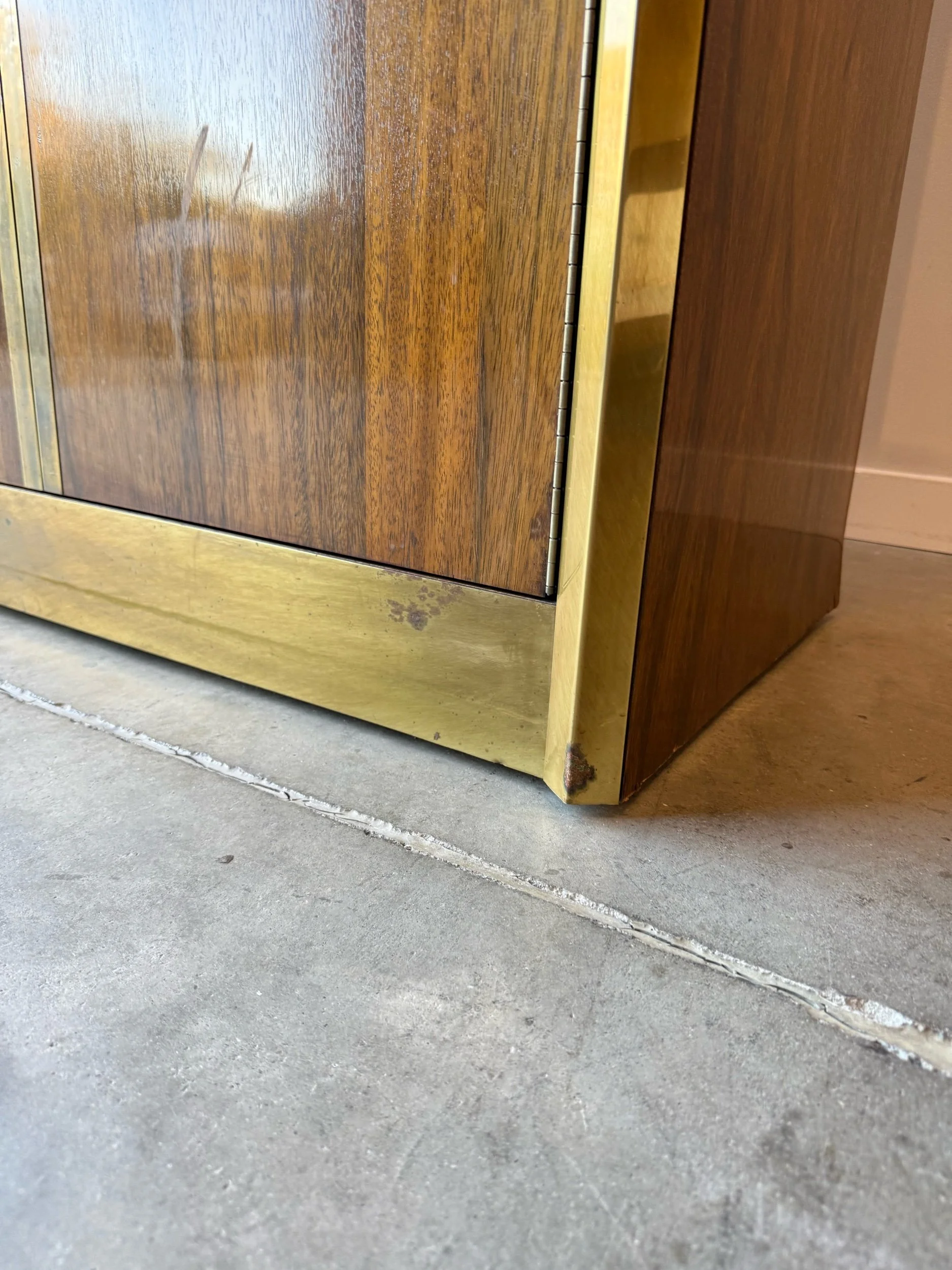 This piece features wooden fronts with excellent grain. The brass motif continues into the diamond shaped door handles. Store your items in style with this statement piece. The top section features two large doors that open to internal shelves. The bottom also features two doors that open to shelving. Sturdy as it sits on a plinth base. A prime storage option for extra linens, bar storage, clothing storage, or kids toys.