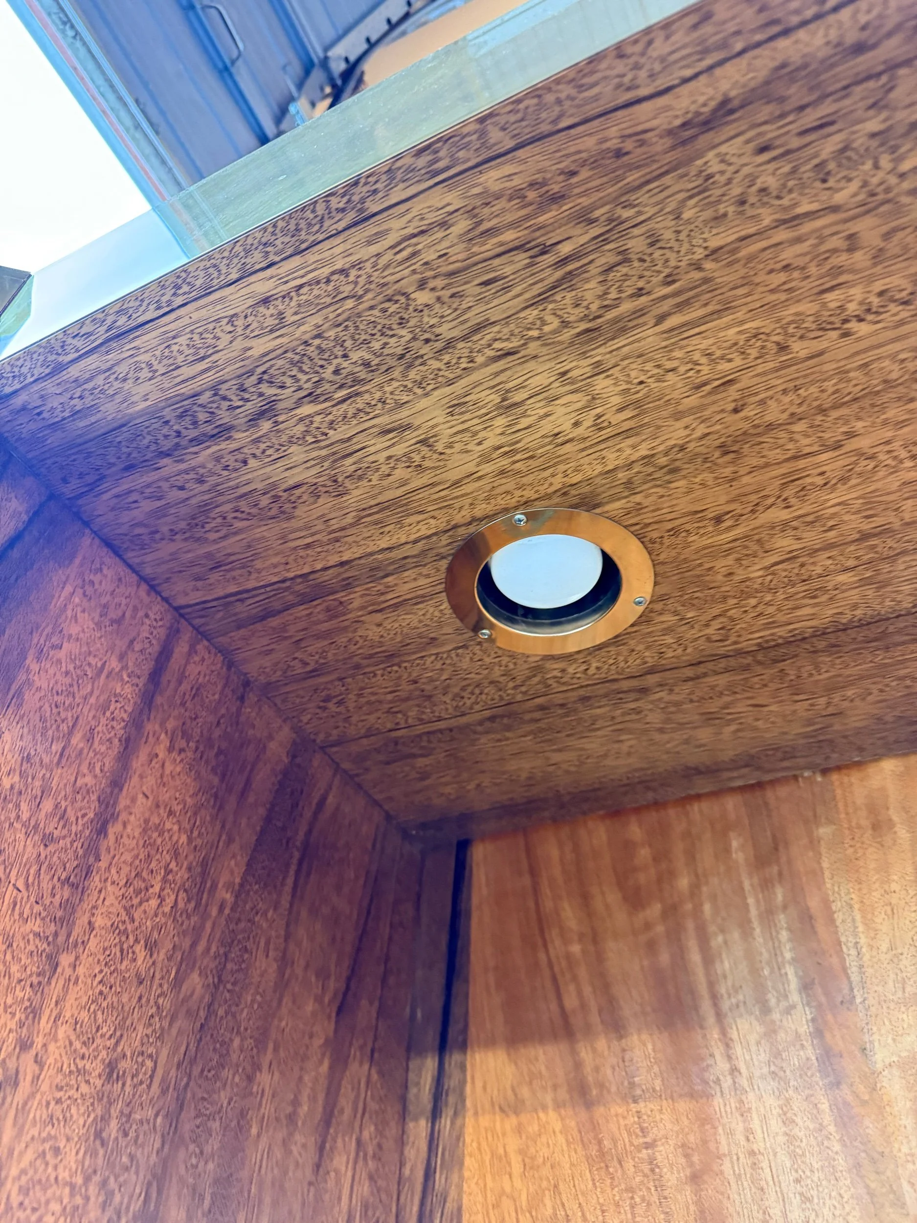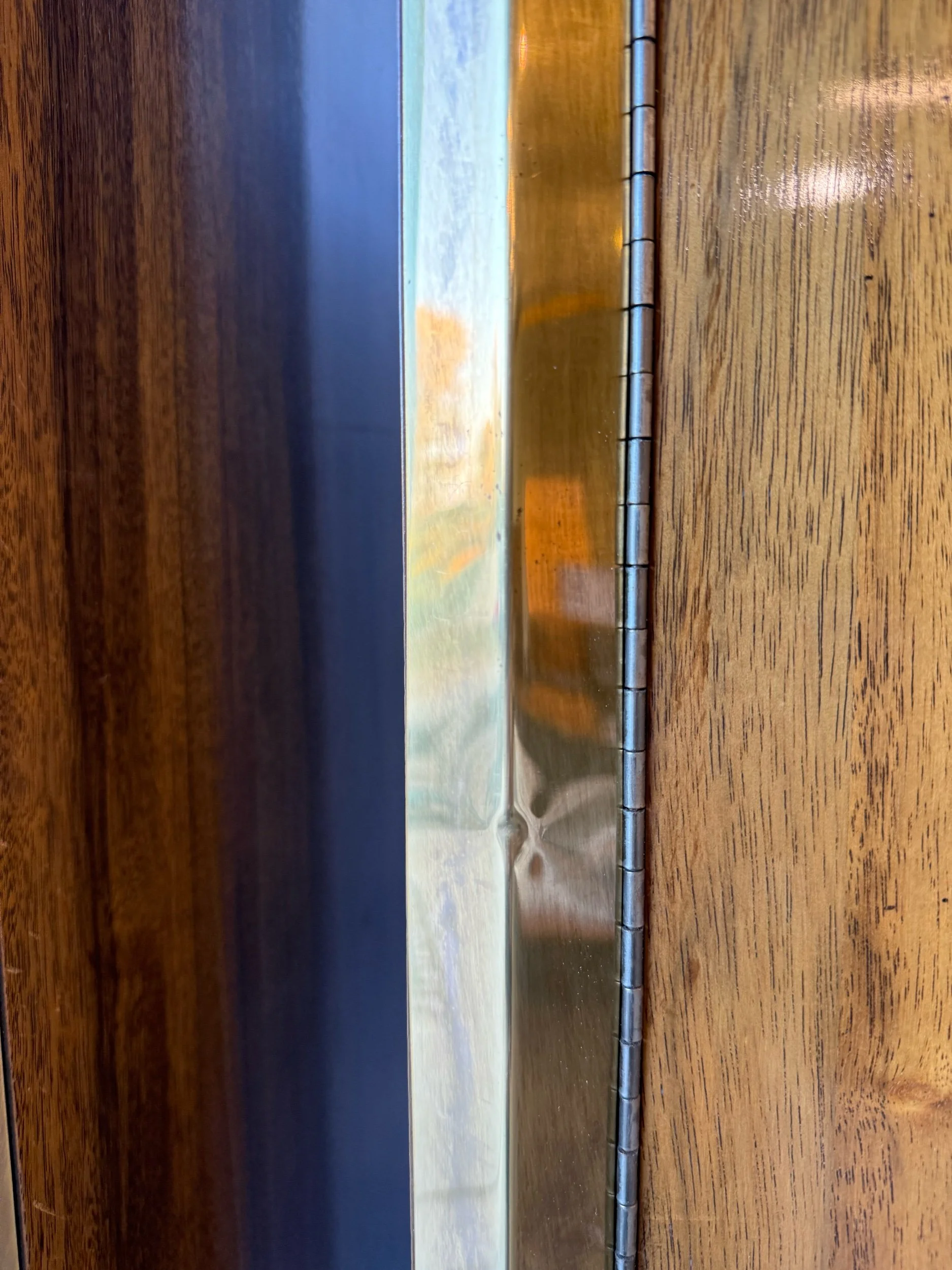 Each piece is encased in rich wood with incredible grain. Brass accents accompany the wood and give this piece a lux appeal. The mix of materials is top tier.