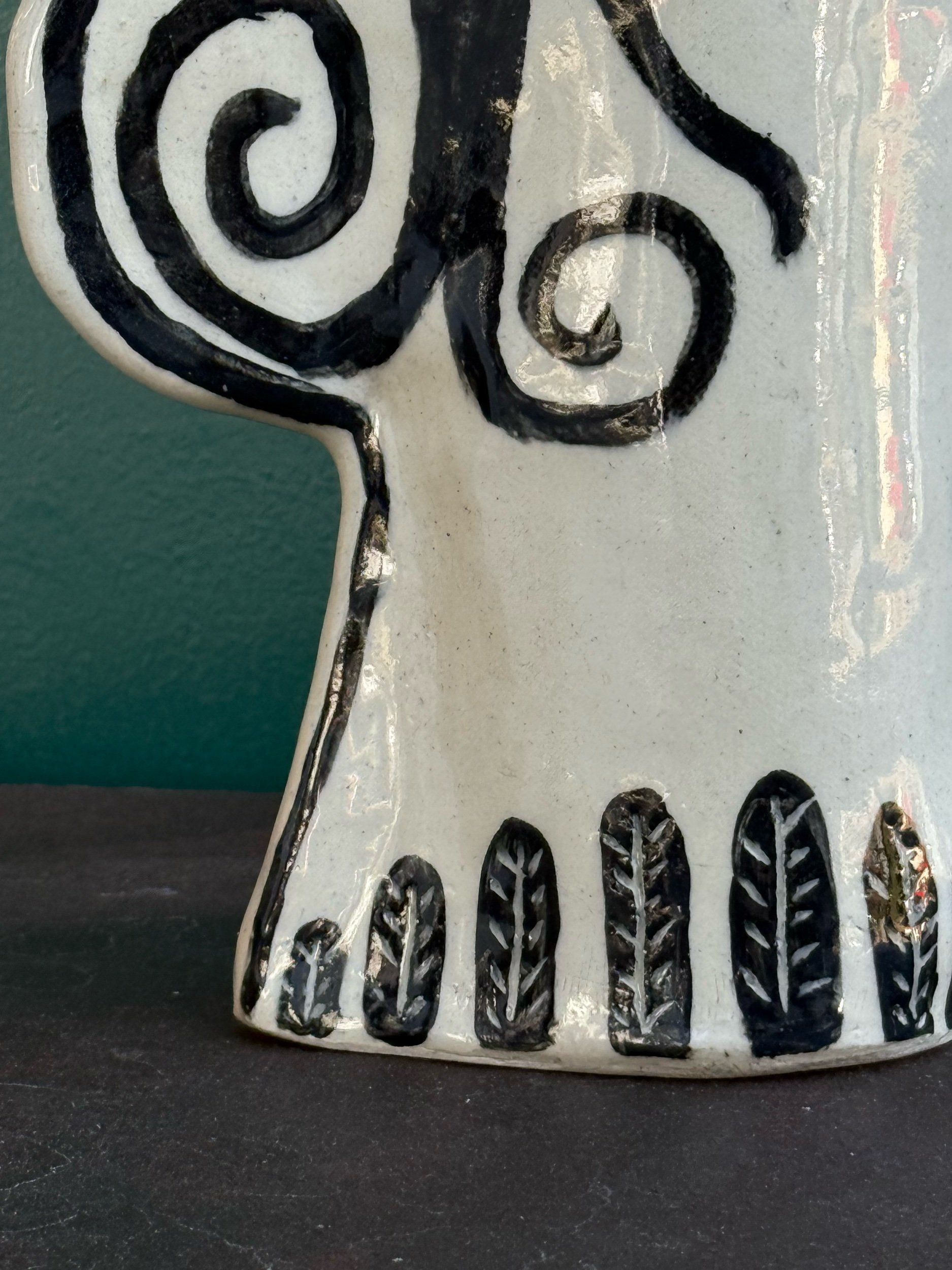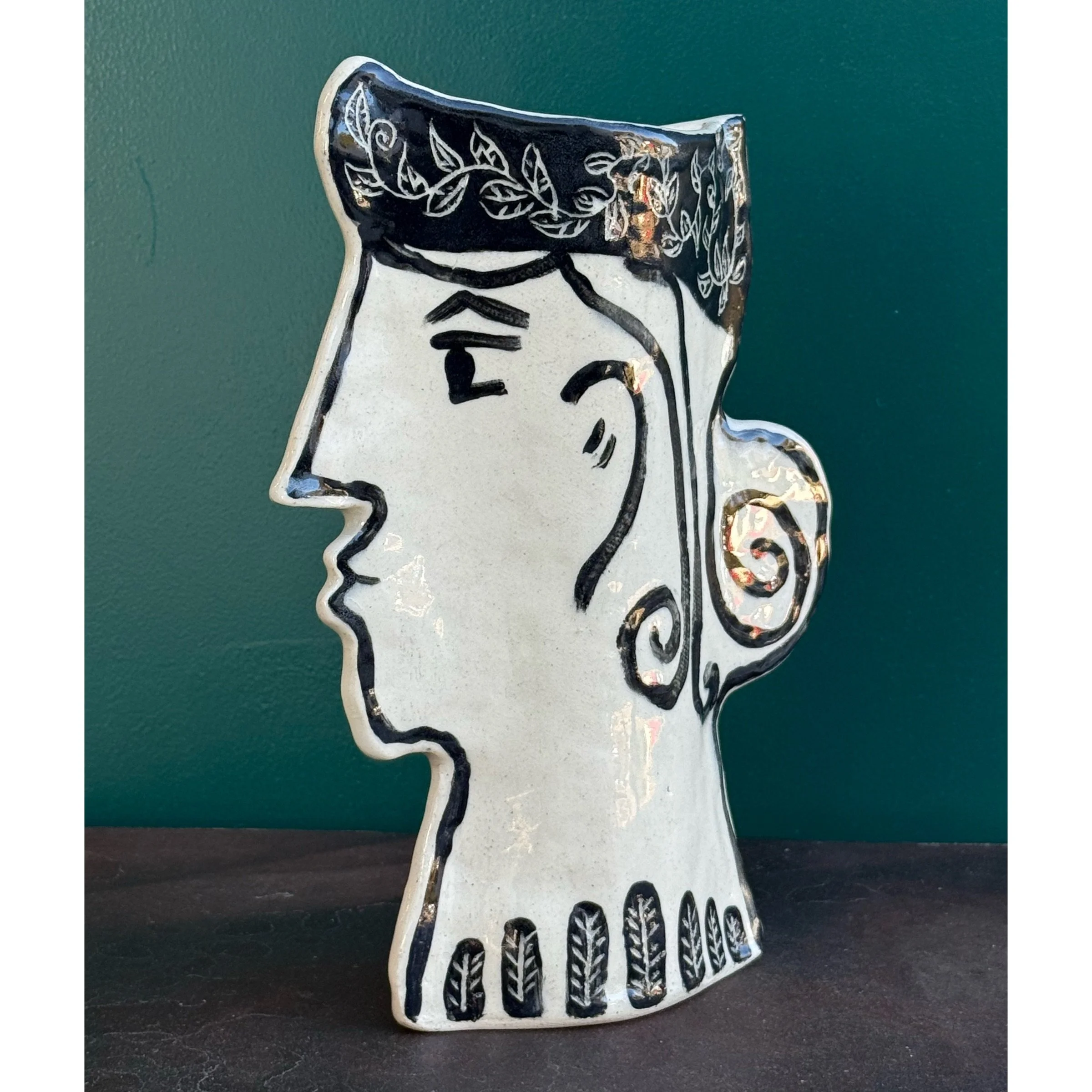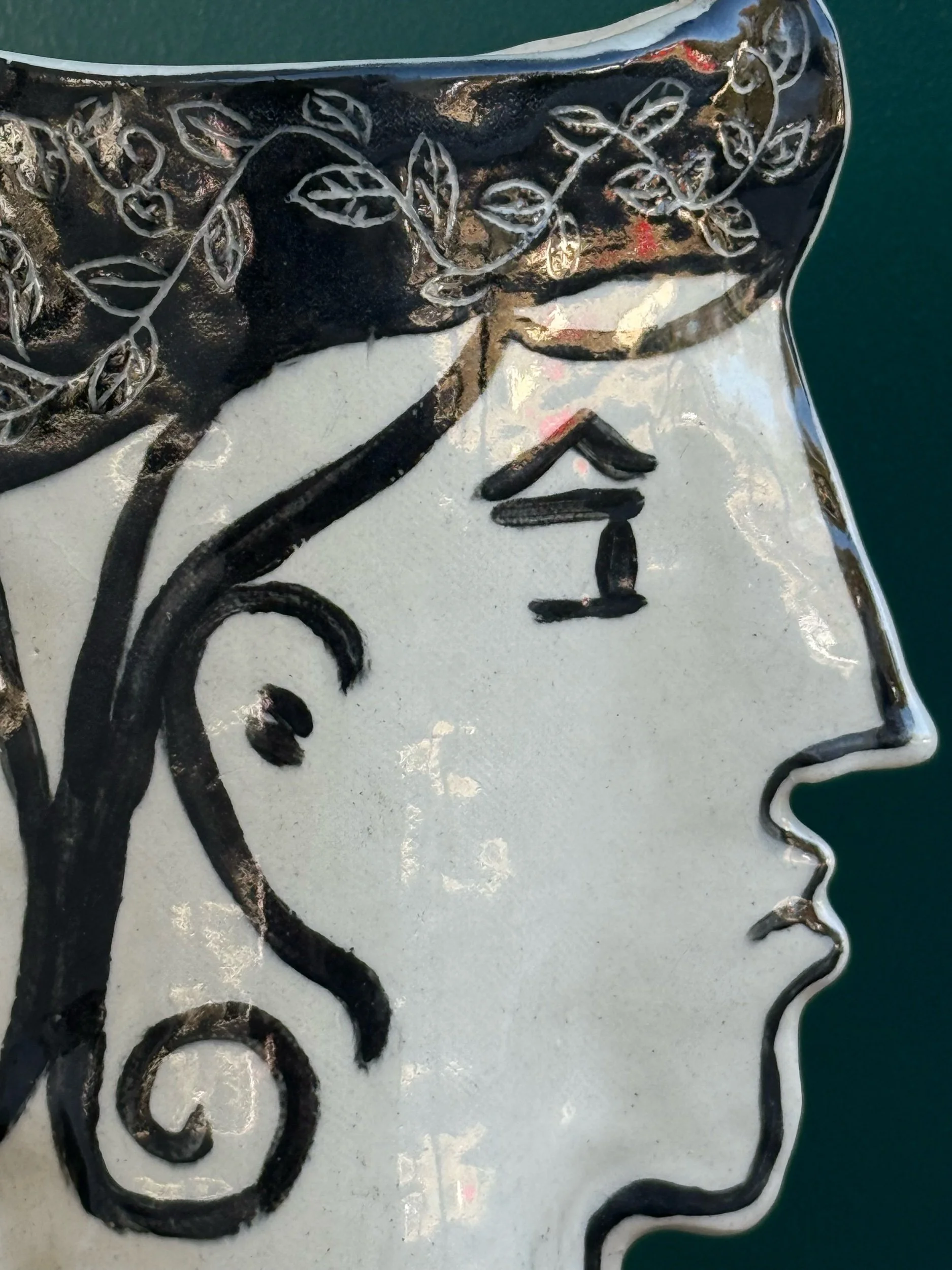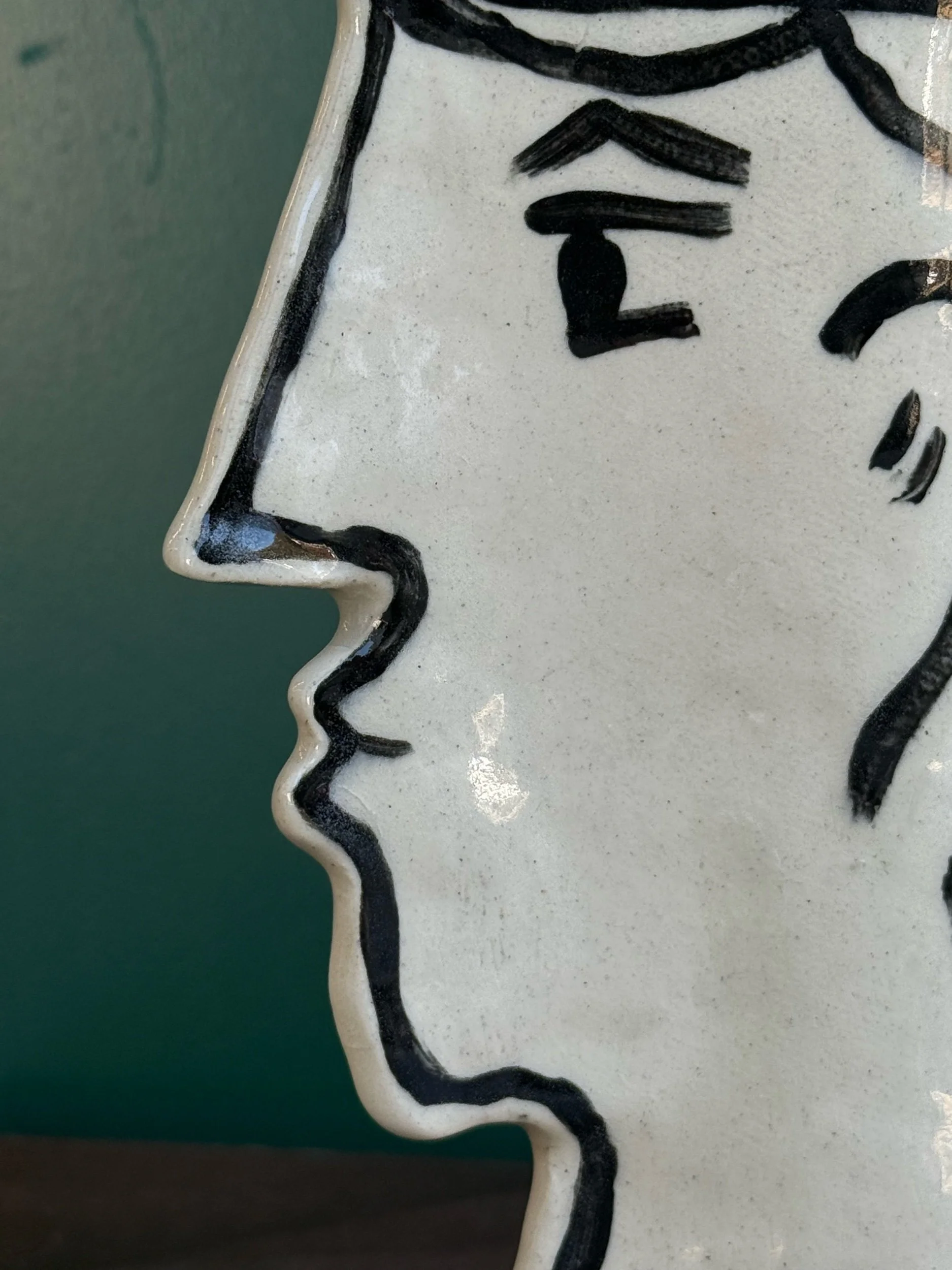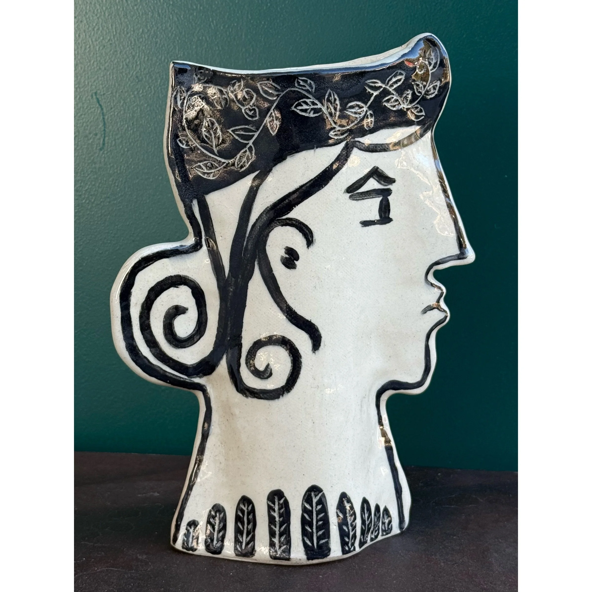 A mix of the old world and new age technique. Highly sculpted styled design made from stoneware, underglaze painted on leather hard clay and clear glaze high fired to cone six. The piece is off white in color with black contrasting coloration. The black further defines the feminine facial structure and pops against the neutral tone while making it easily visible from afar.