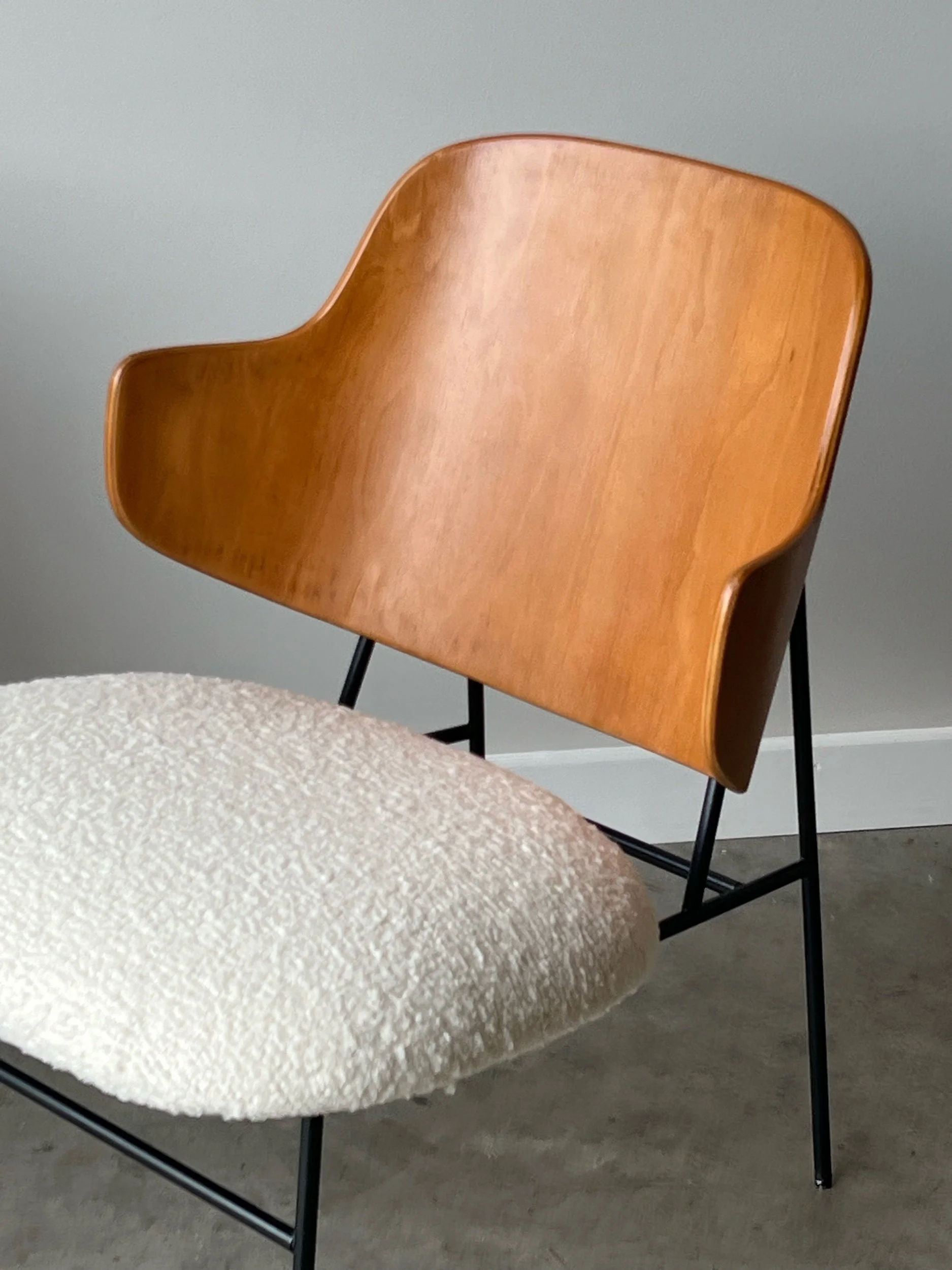 Mid-century pair of ‘Penguin’ accent chairs. Designed by Ib Kofod Larsen for Selig, Denmark. These iconic chairs were designed in the 1950s with a limited production in the 1960s. They feature a uniquely bentwood back with a geometric frame and legs. This pair has been newly reupholstered in a soft white bouclé. In great vintage condition with minor wear consistent with age and use.
