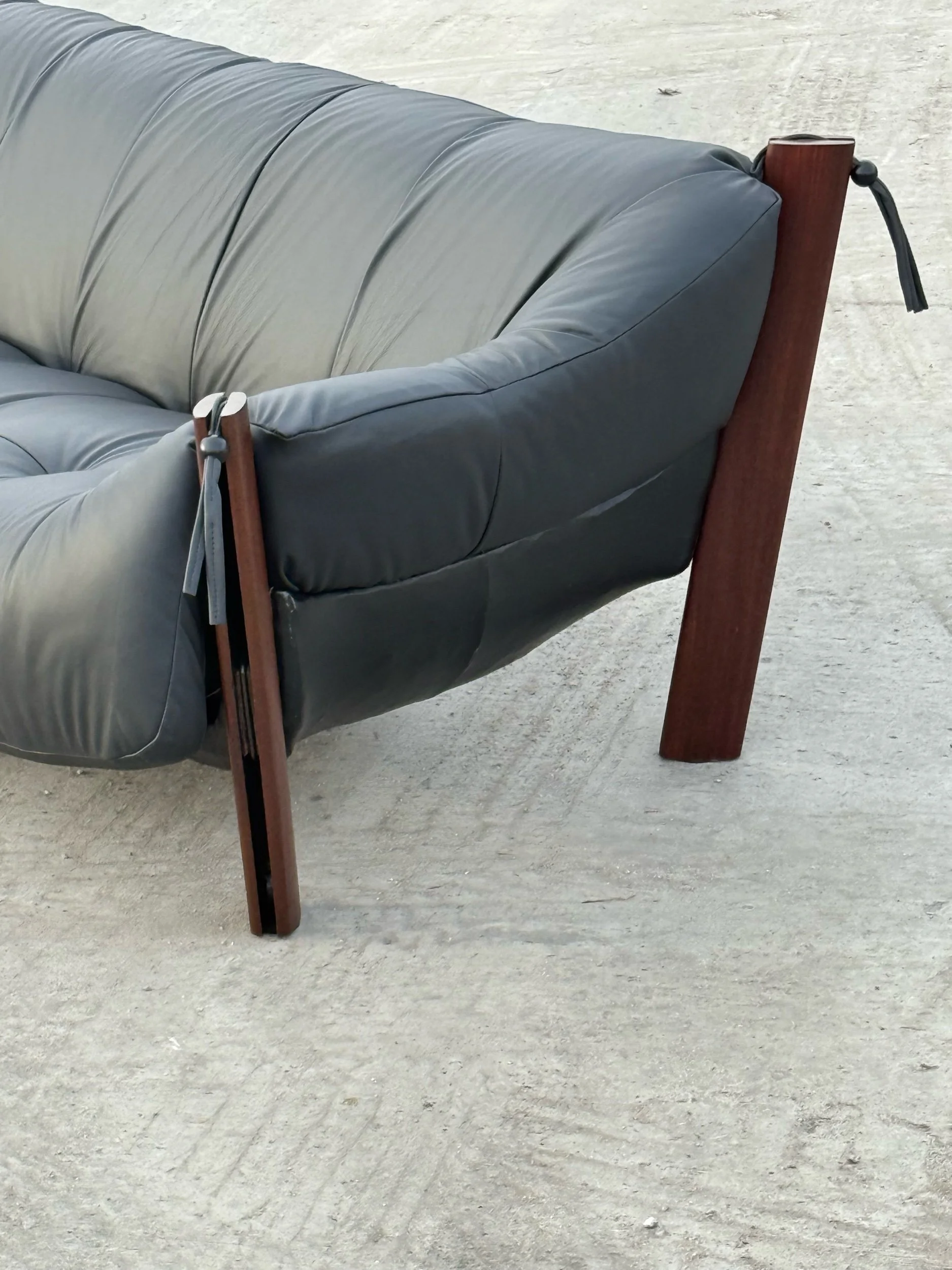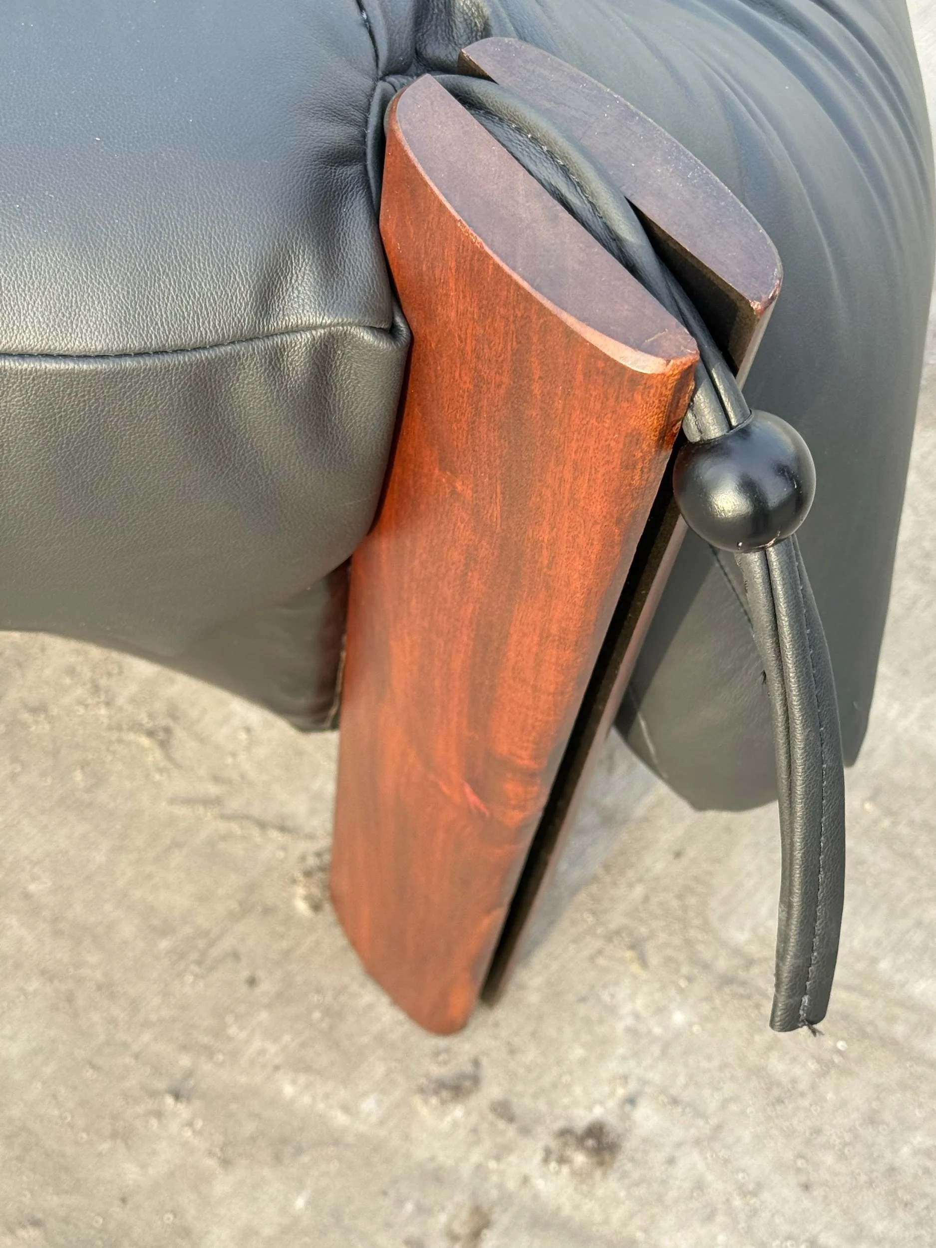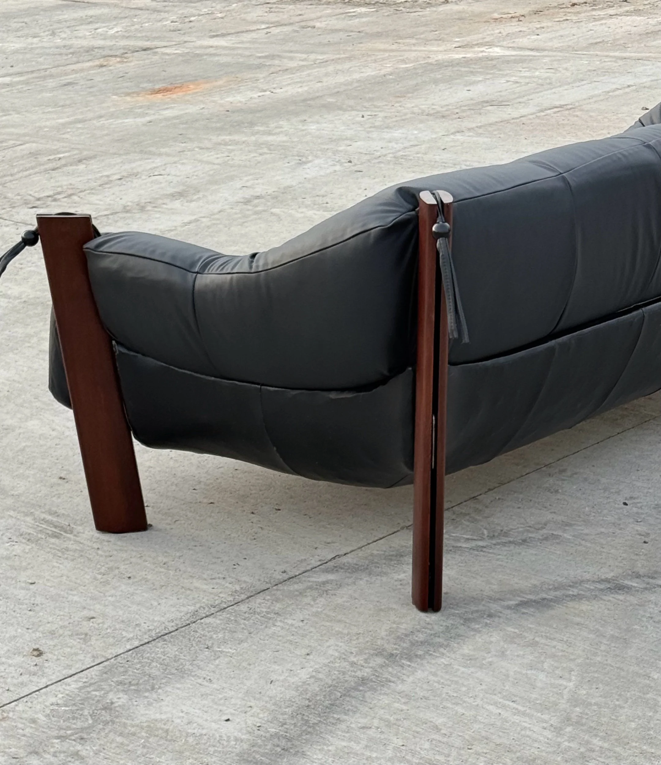 The cushion rests atop the frame and curves over the edges of the frame for both aesthetic and comfort purposes. We reinforced the original foam and reupholstered the sofa in black leather to remain true to the original design. The leather is segmented into sections with seams running vertically. Buttons were added to create a bit of delineation. Leather ties were added to each corner to incorporate with the legs as the original upholstery did.