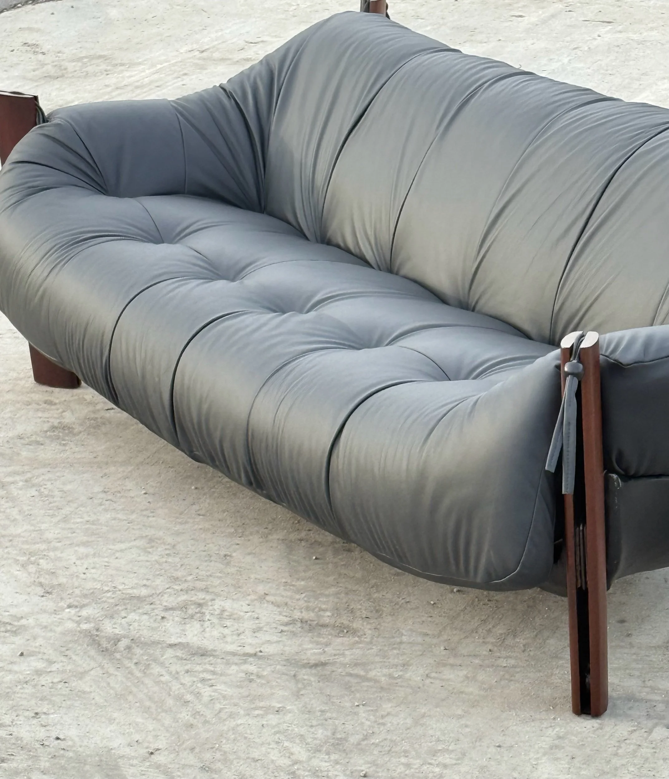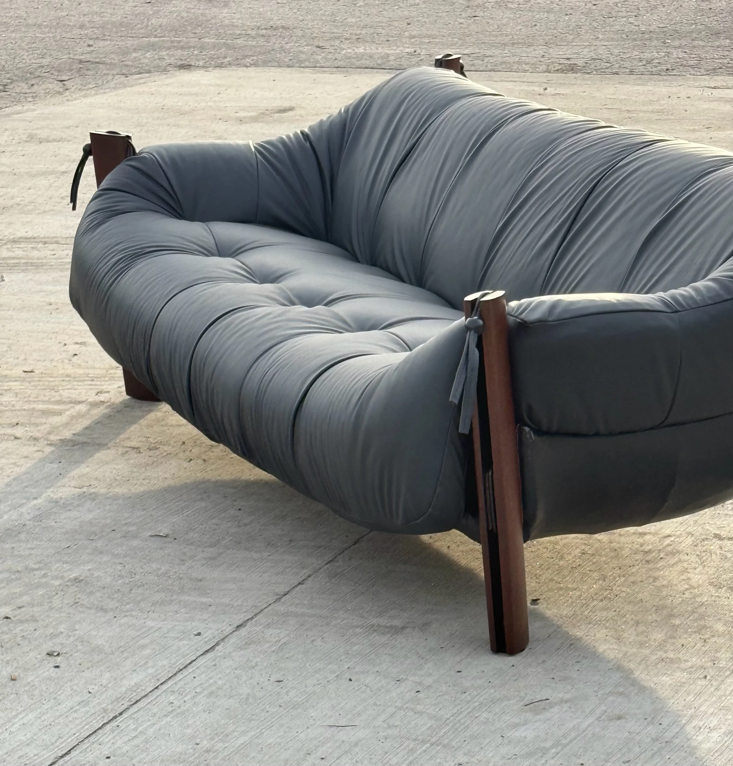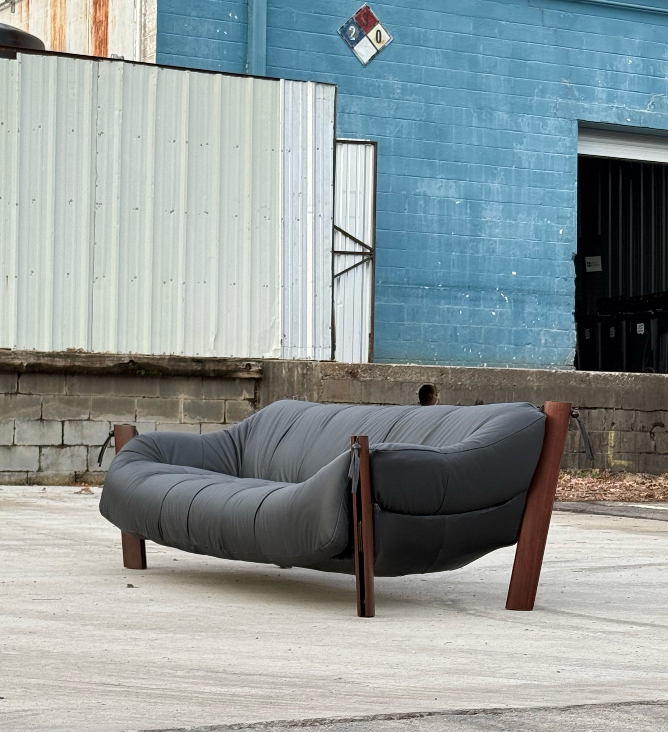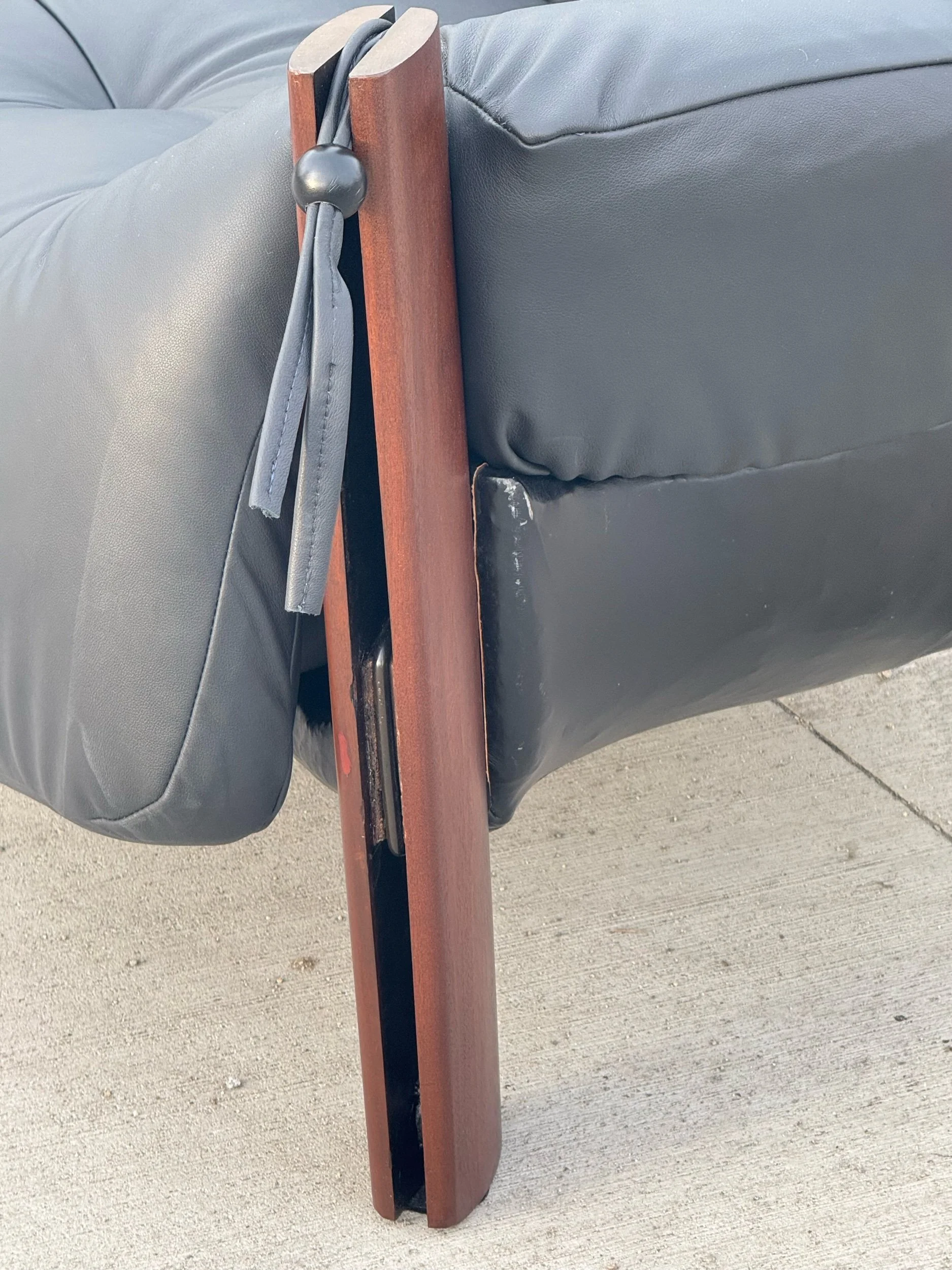 The cushion rests atop the frame and curves over the edges of the frame for both aesthetic and comfort purposes. We reinforced the original foam and reupholstered the sofa in black leather to remain true to the original design. The leather is segmented into sections with seams running vertically. Buttons were added to create a bit of delineation. Leather ties were added to each corner to incorporate with the legs as the original upholstery did.