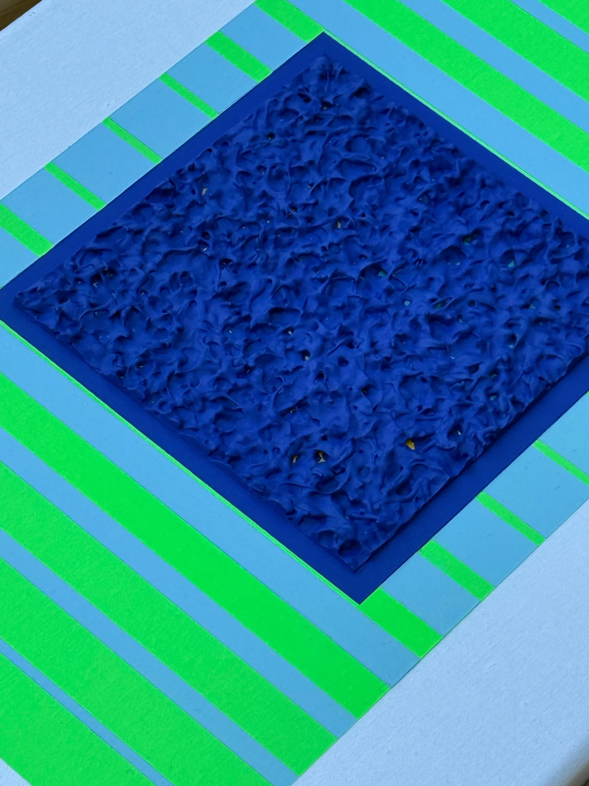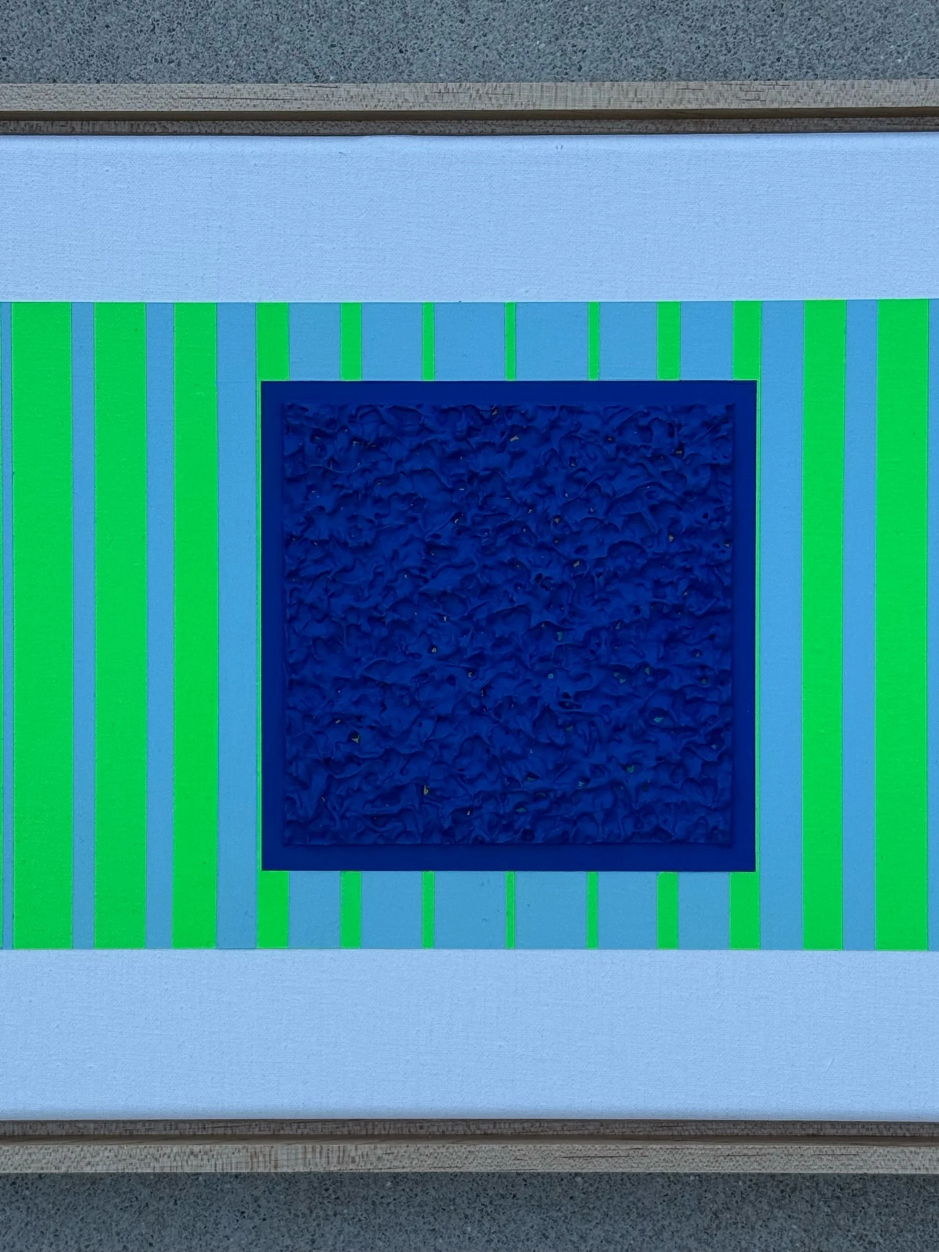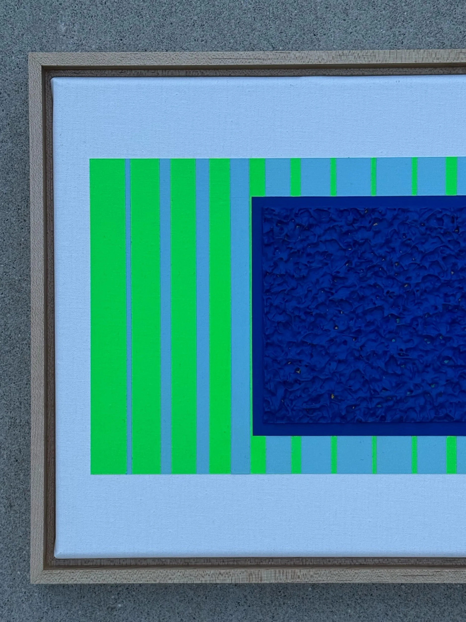 Mixed media painting framed in a wooden maple frame. This piece showcases neon green lines of varying thickness. The lines get thinner towards the focal point. The focal point is a heavily textured dark blue square. The contrast of the punchy green and deep blue looks fantastic from across the room and draws the viewer into it. A wonderful addition for those with vintage or contemporary style homes.
