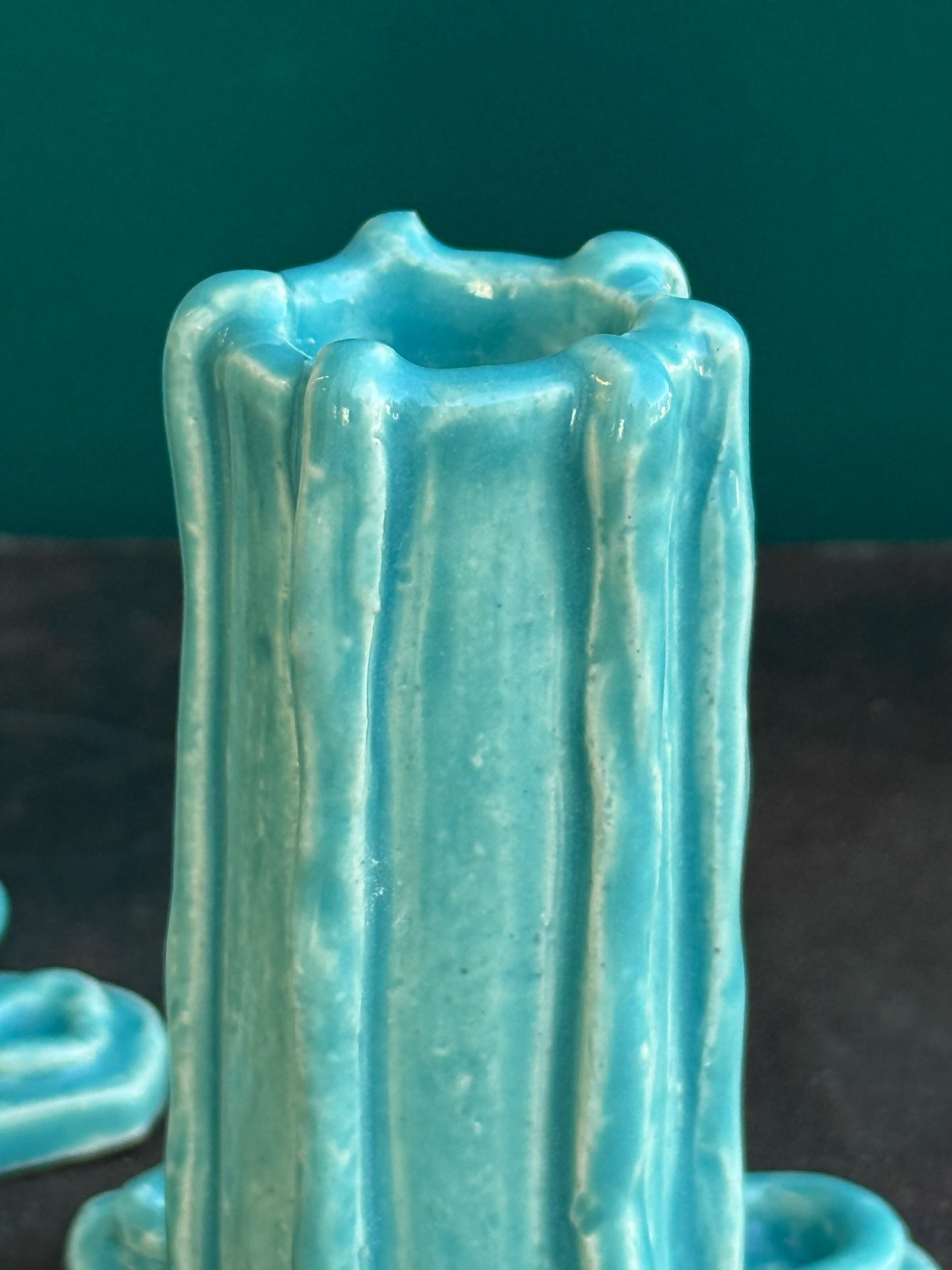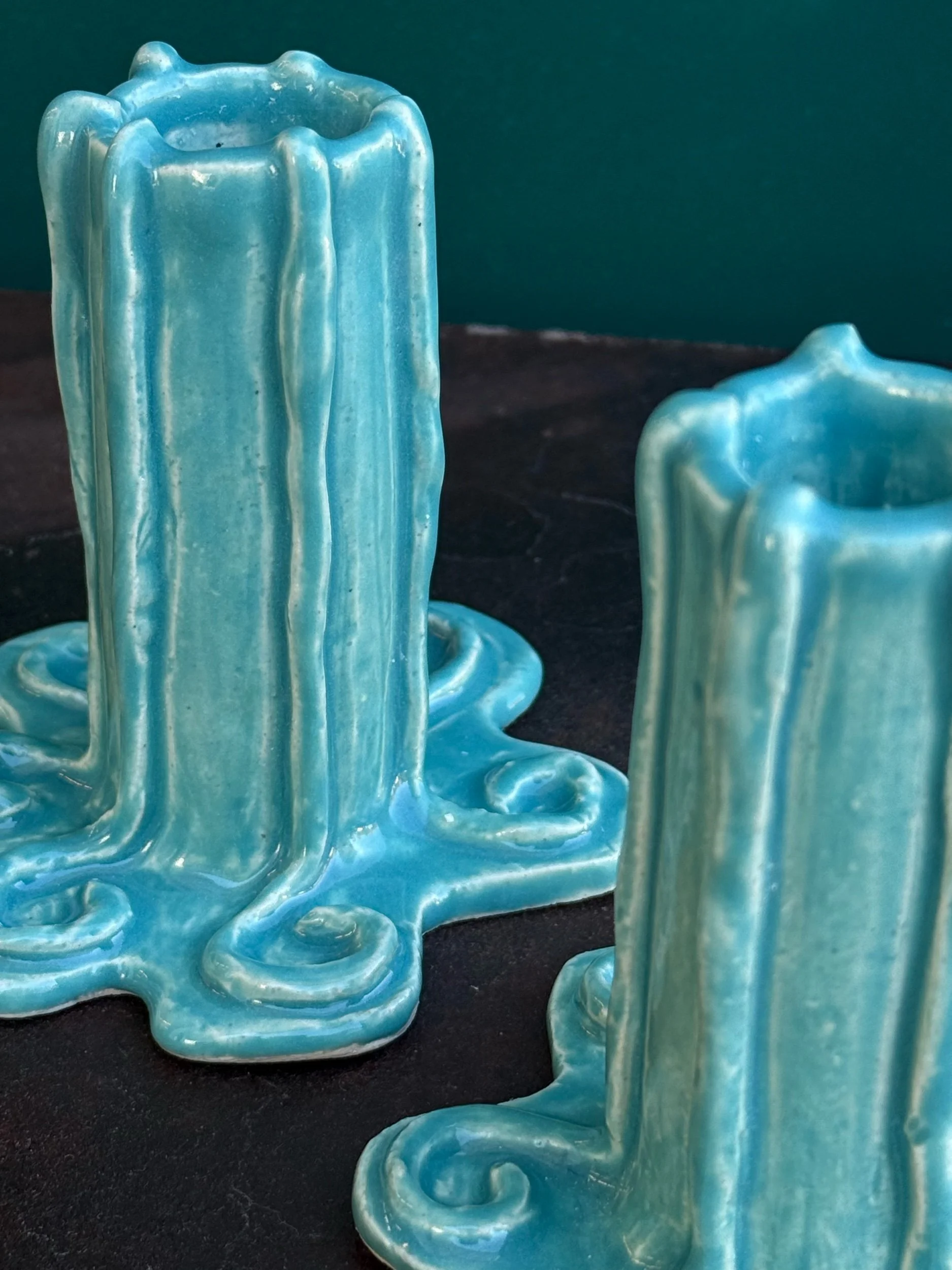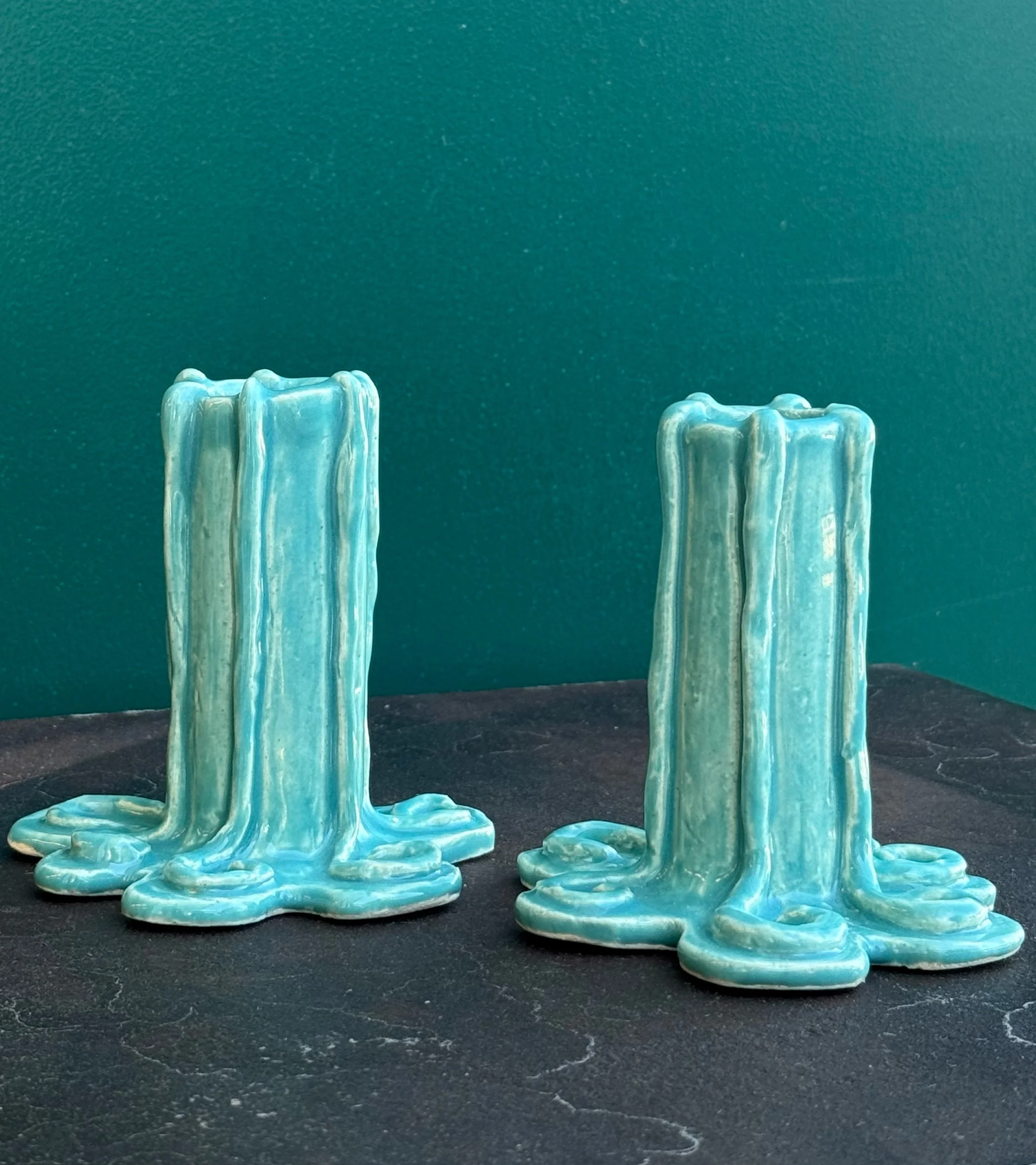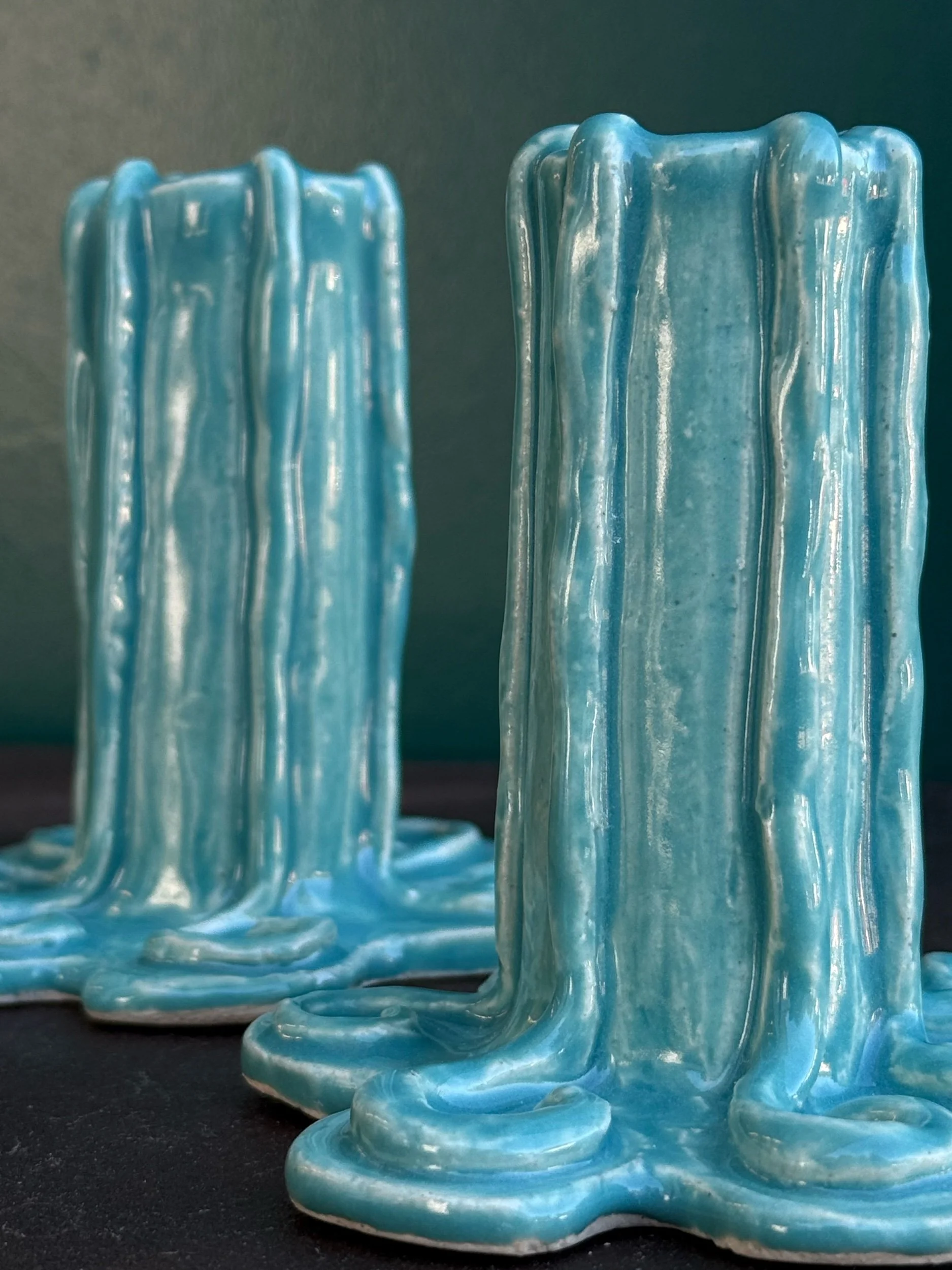 This version is the smaller pair of the two pairs we have available by Portanova. A gorgeous light blue underglaze makes this pair pop and adds a bit of fun to your decor. The cylindrical body is accented with raised lines lead down the body and curve at the base. The lines create dimension and is reminiscent of a melted tapered candle or octopus tentacles. A perfect pair for your dining table decor or atop a credenza.