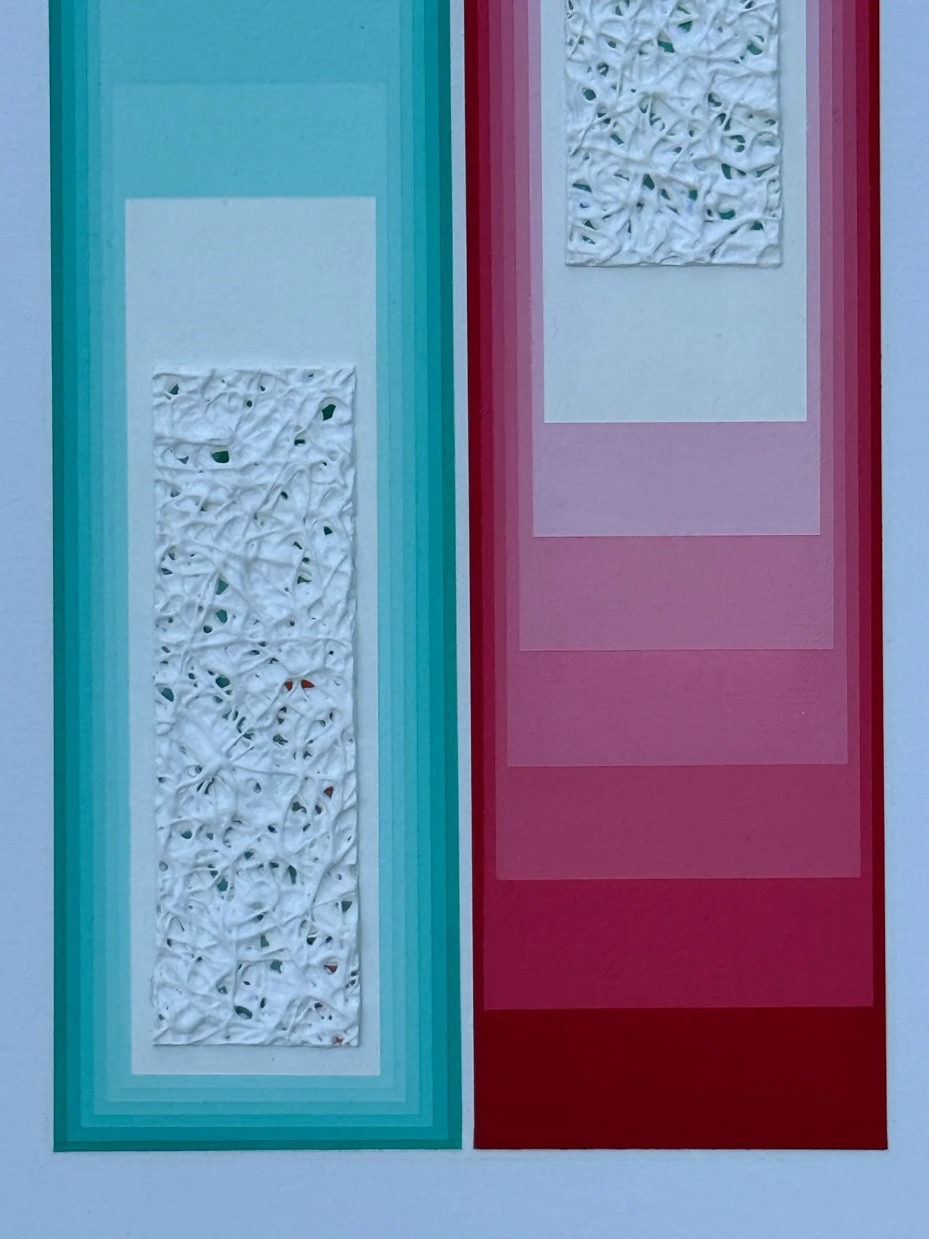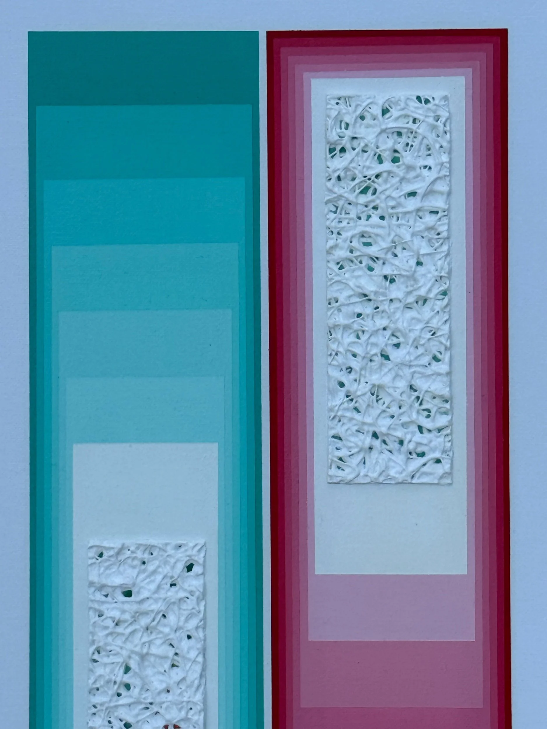 A vertical painting that showcases a blue and red color block, seemingly moving in two different direction. Each colorful rectangle is gradient as lighter tones move toward the heavily textured focal point. The texture feels as if it is controlling the direction and showcases speckles of color underneath adding depth. A wonderful mix of precise line work and texture. Framed in a wooden maple floater frame. A wonderful addition to those with vintage or contemporary style homes.
