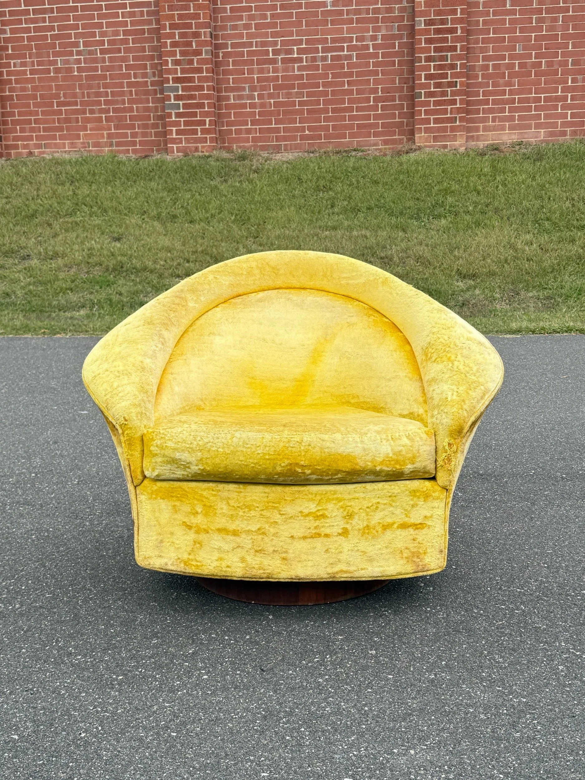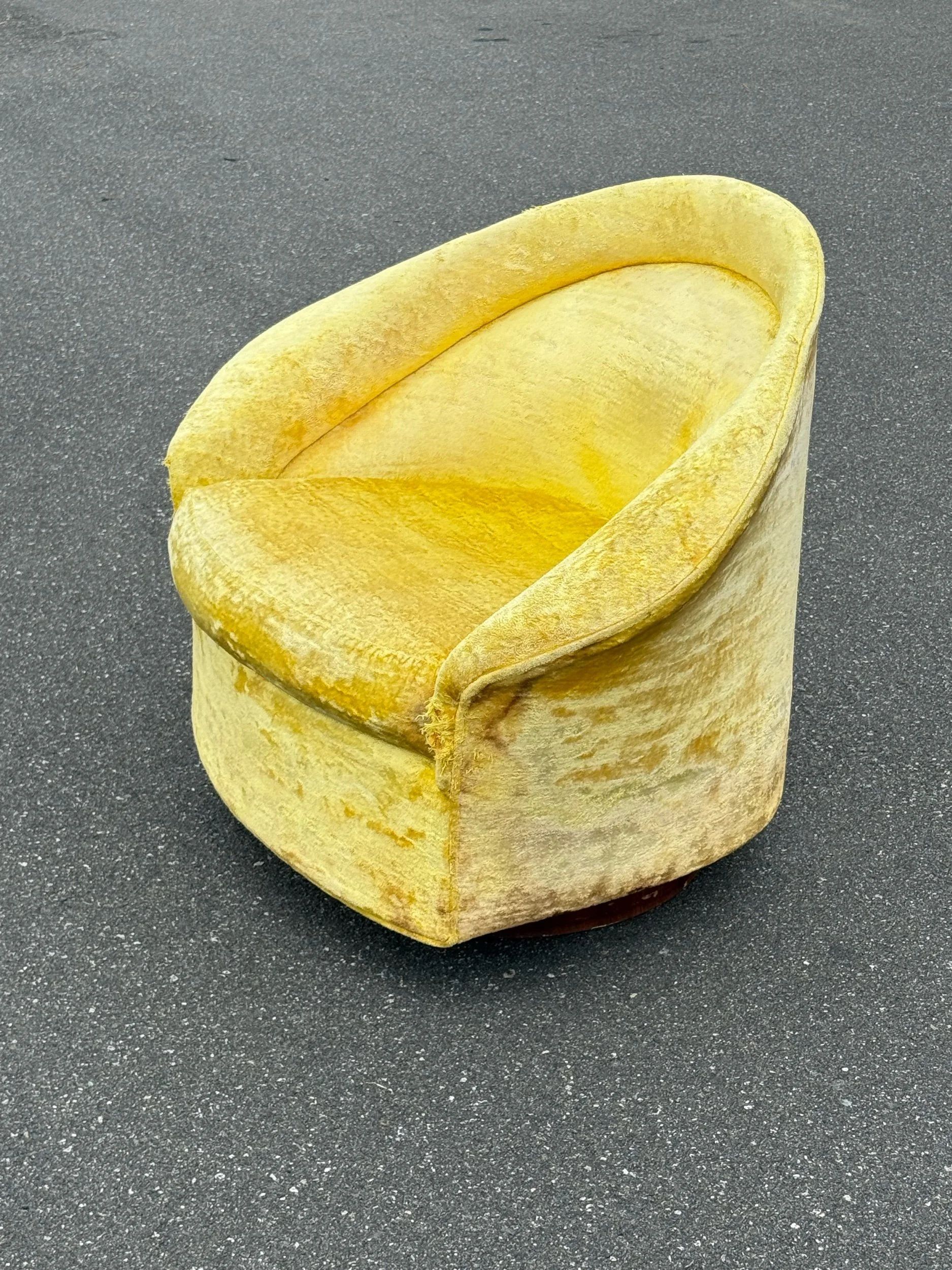 Single swivel and tilt lounge designed by Adrian Pearsall for Craft Associates. A rounded back design reminiscent of several of Baughman’s designs. In contrast, the armrests flair outward creating a more sculptural aesthetic. Sitting atop a rounded wooden plinth base. One of the more unique styles of swivels and extremely comfortable. This piece features the original yellow velvet upholstery unaltered. The condition of the fabric does have wear.