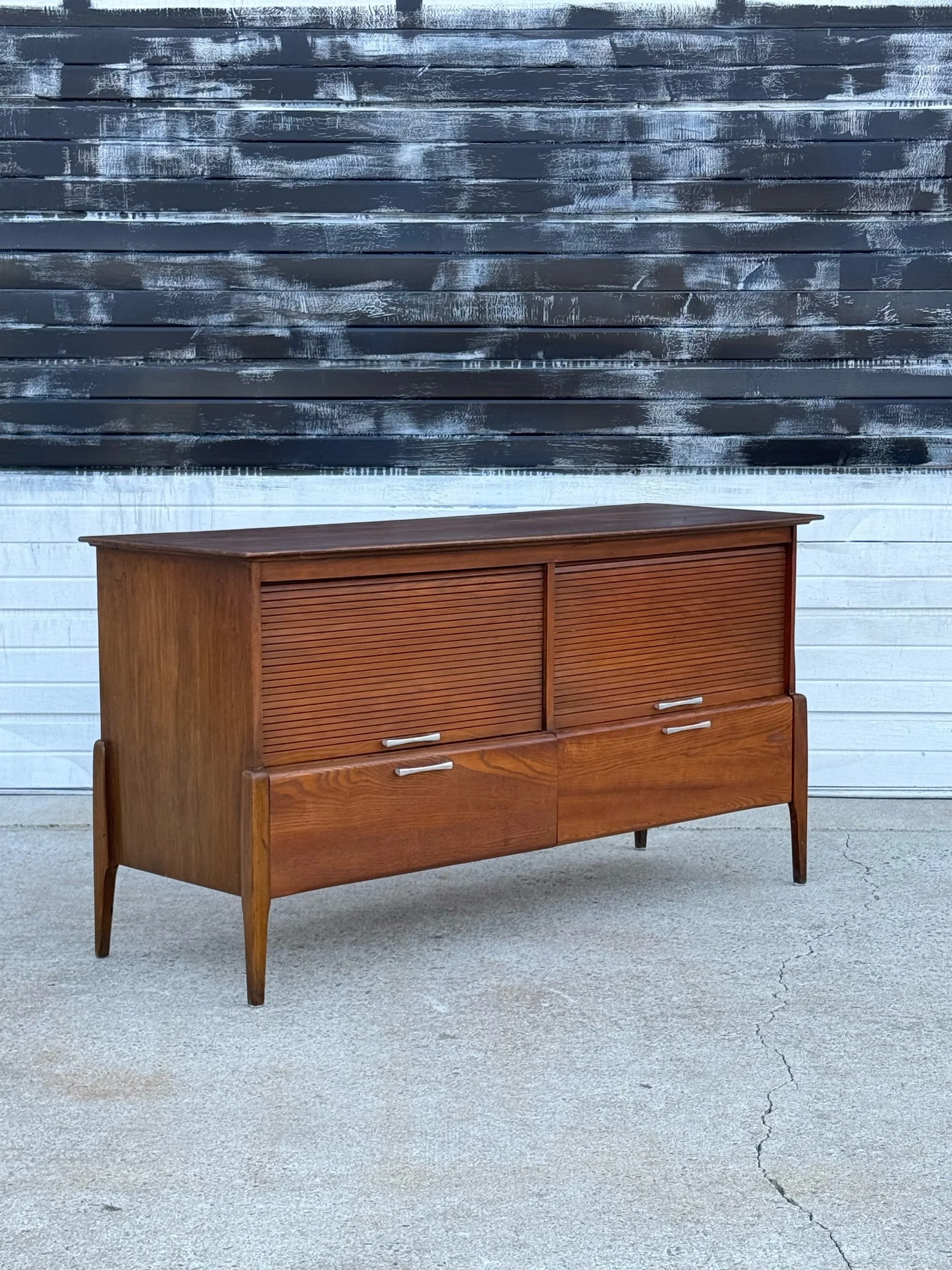 There are two large drawers aligning the bottom half. Both drawers have original metal drawer handles with a bow tie shape. The upper half has two tambour (slatted) doors that open vertically. The tambour doors have the same metal handles as the drawers below. Behind each tambour door are two slimmer internal shelves.