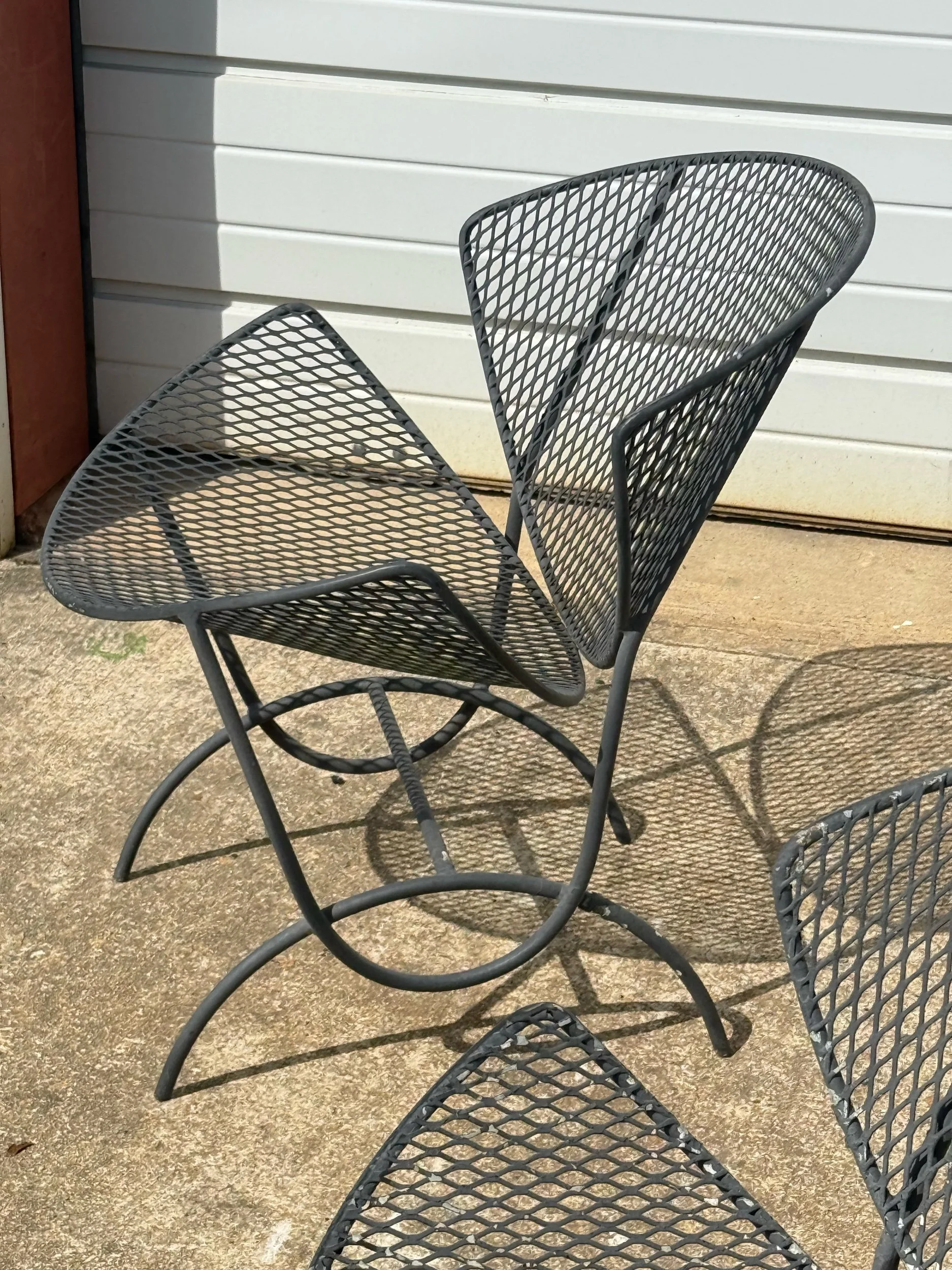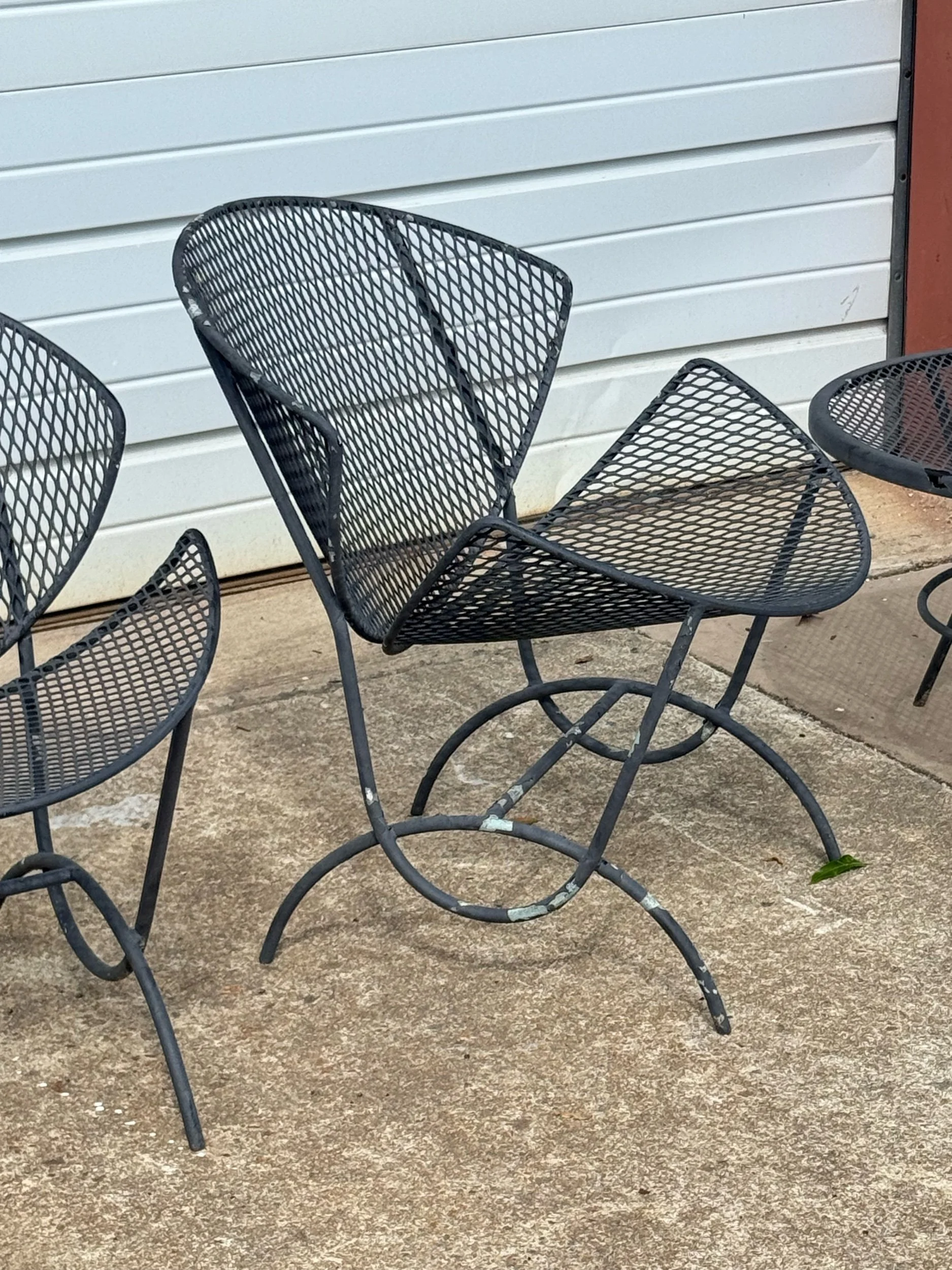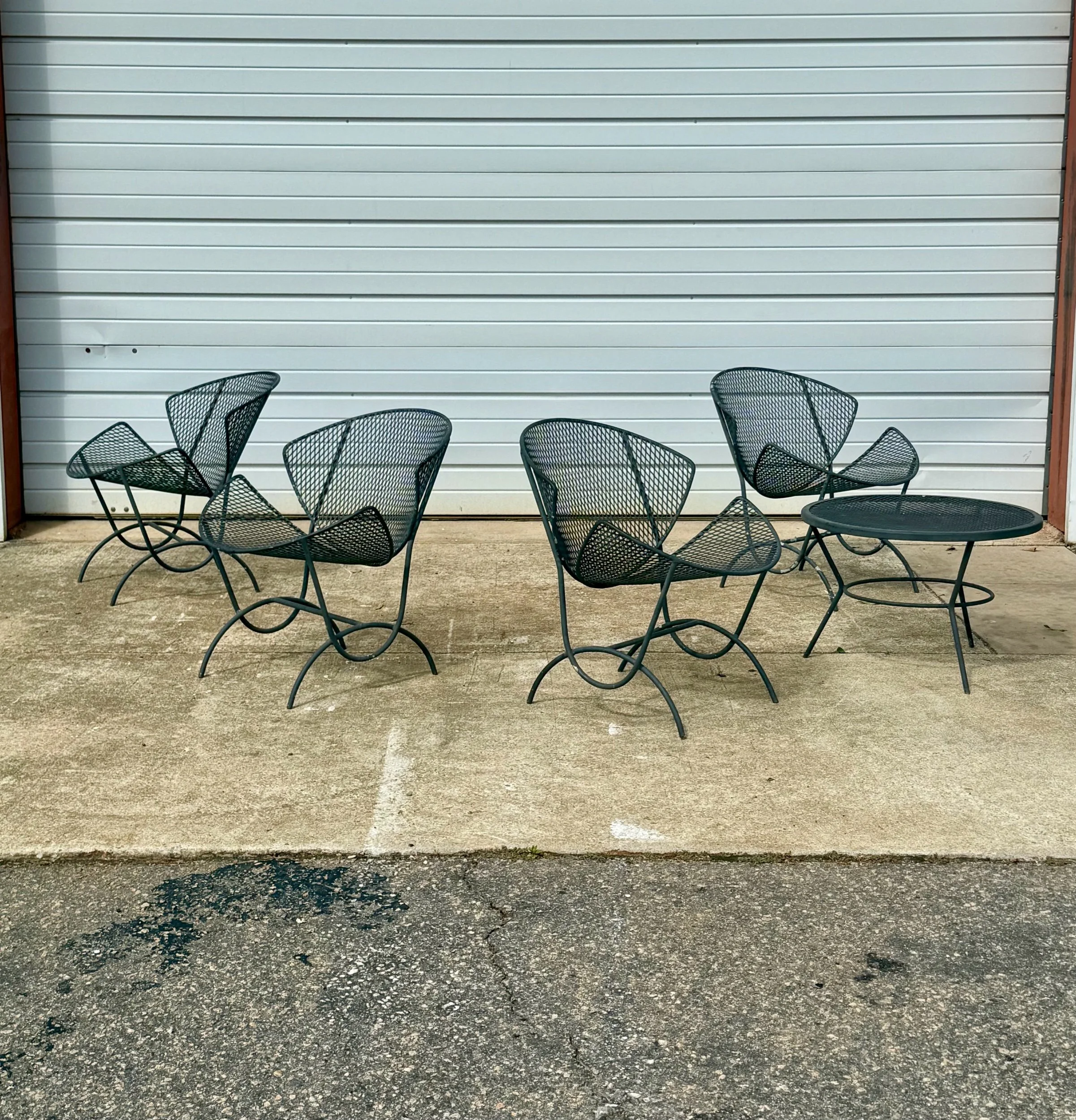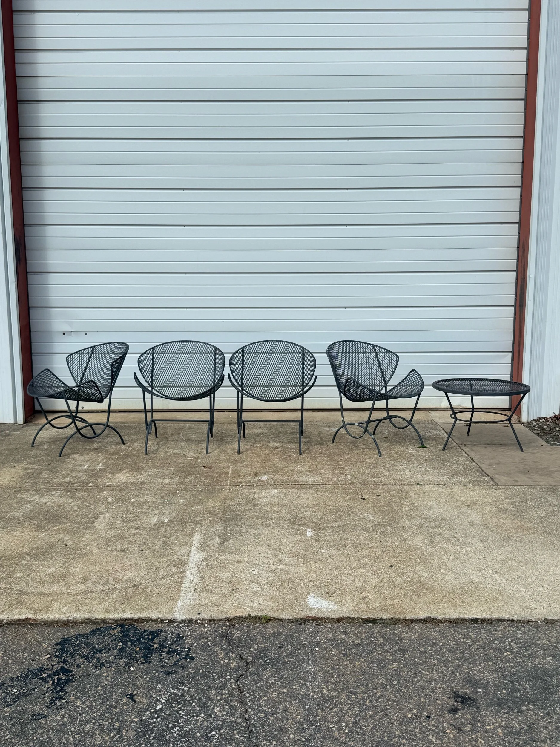 Mid-century patio set designed by Maurizio Tempestini for Salterini. Often referred to as the ‘orange slice’ due to the shape of the chairs. This set includes four chairs and one small side table, all of which are made from hand-wrought iron which is durable and weather resistant.