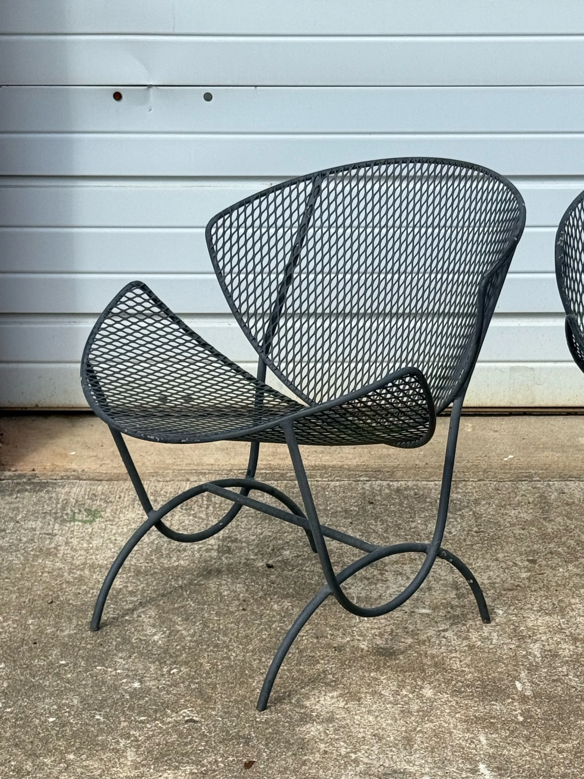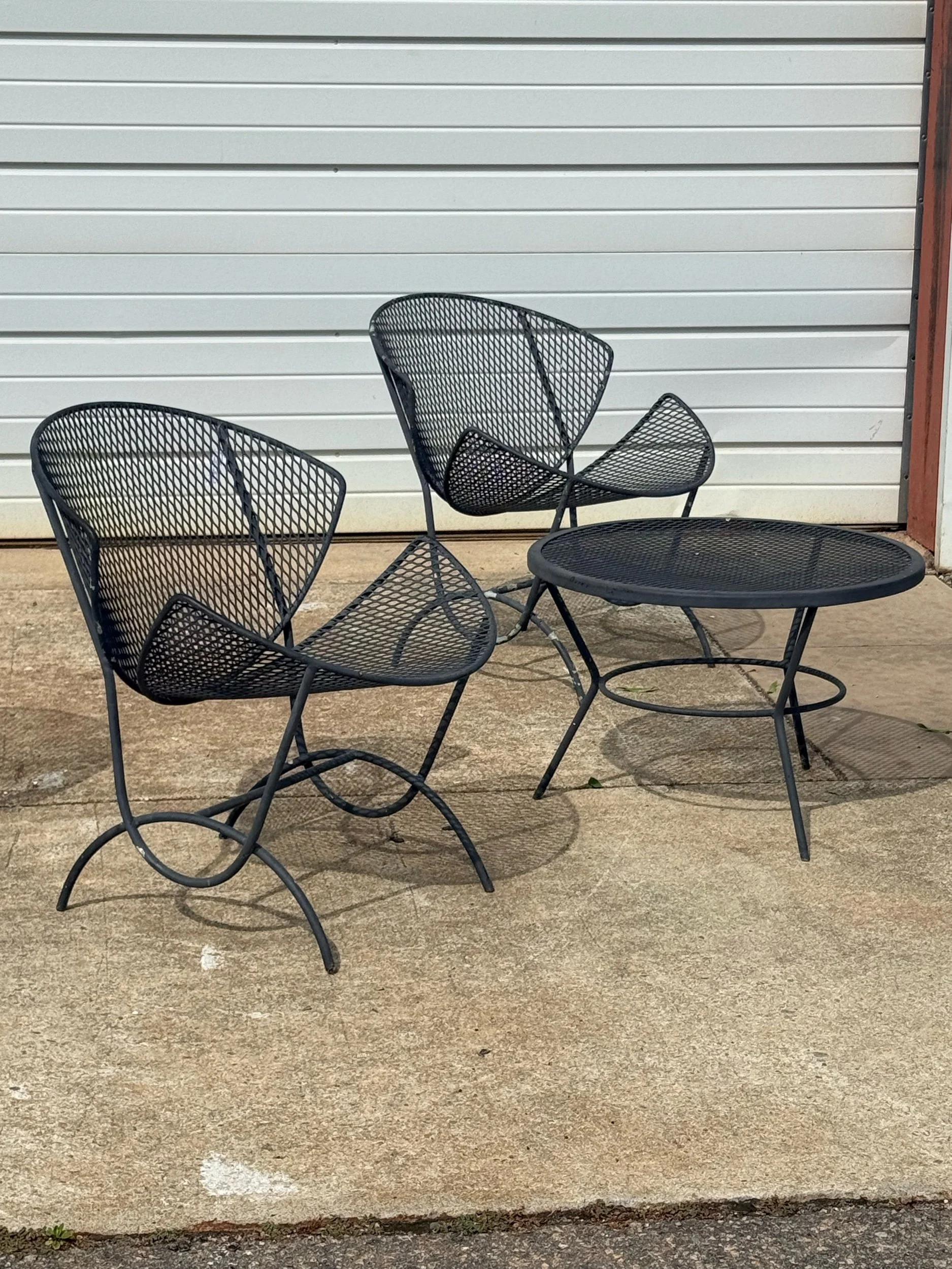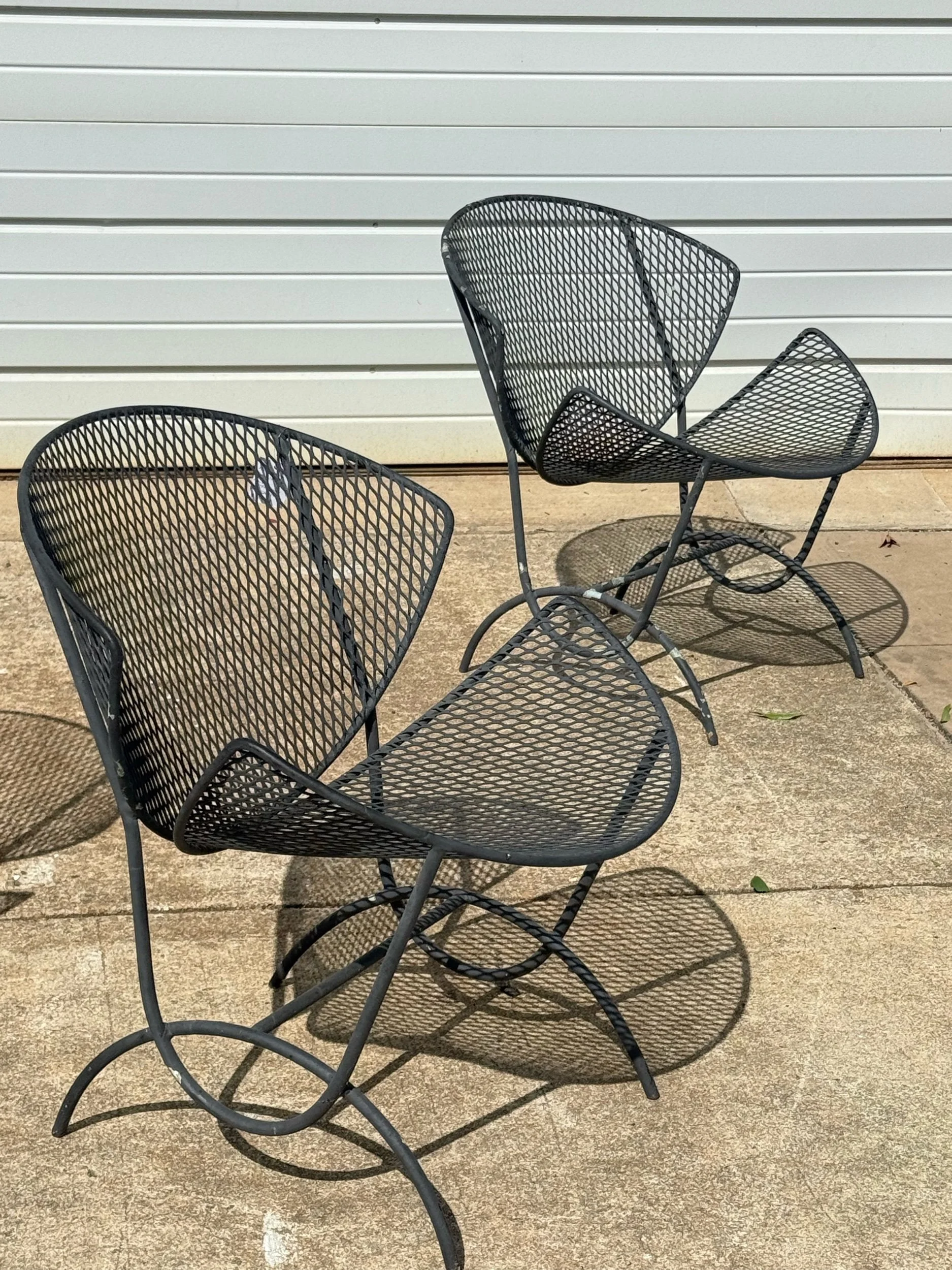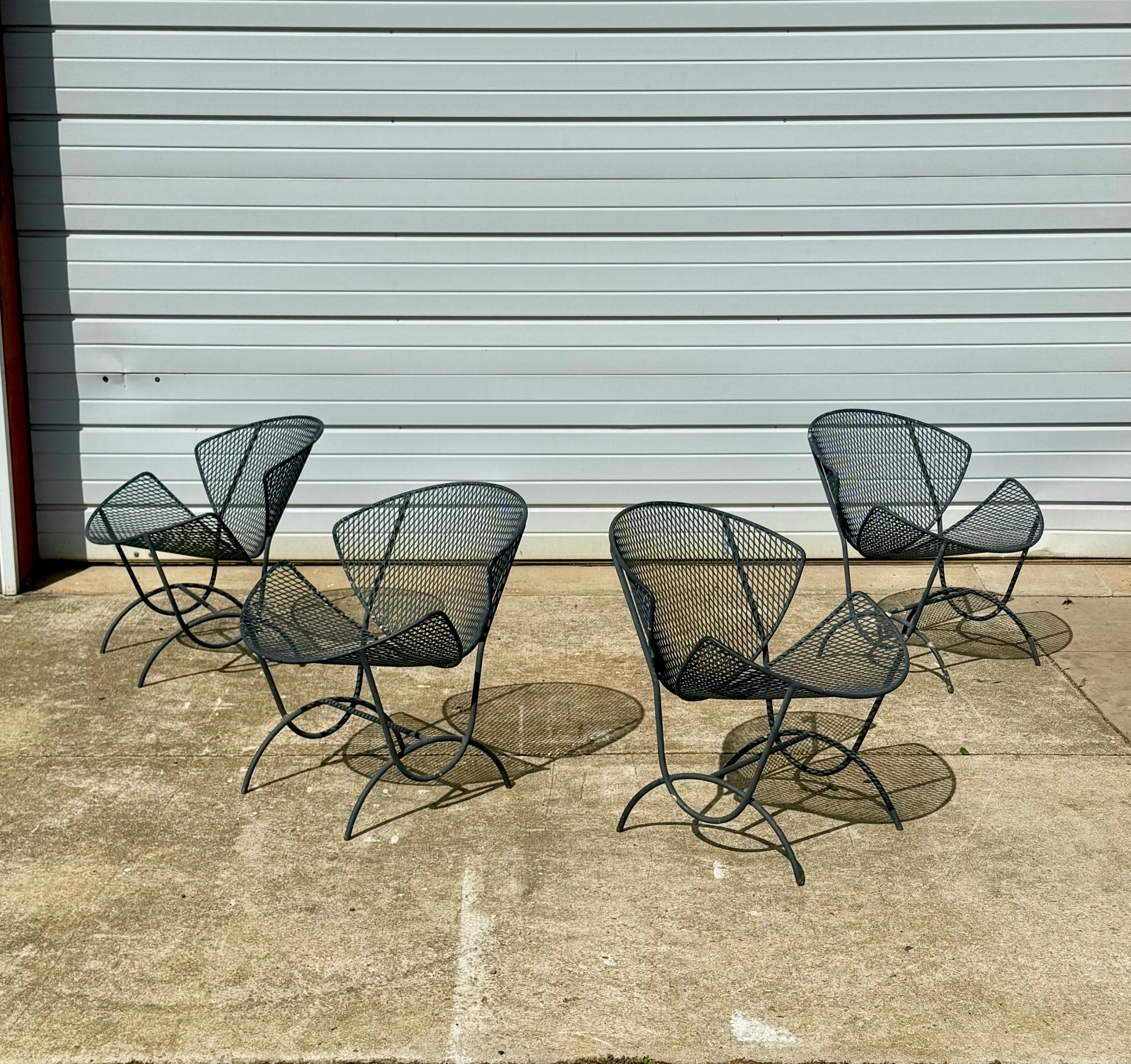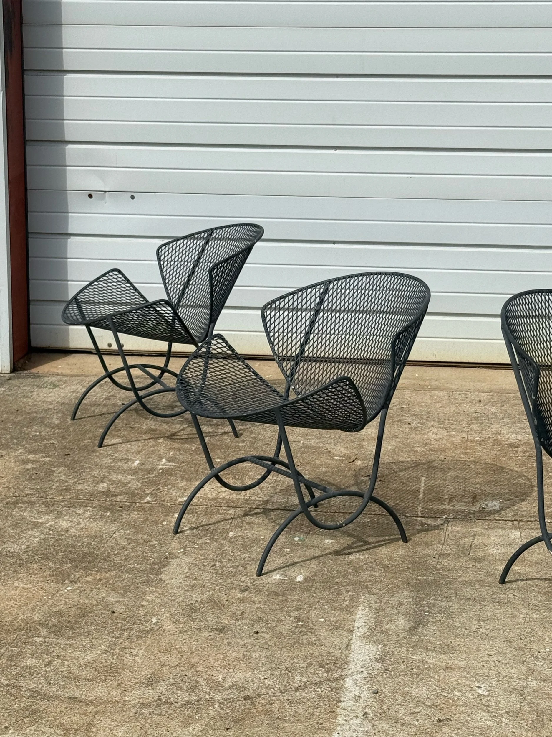 Mid-century patio set designed by Maurizio Tempestini for Salterini. Often referred to as the ‘orange slice’ due to the shape of the chairs. This set includes four chairs and one small side table, all of which are made from hand-wrought iron which is durable and weather resistant.