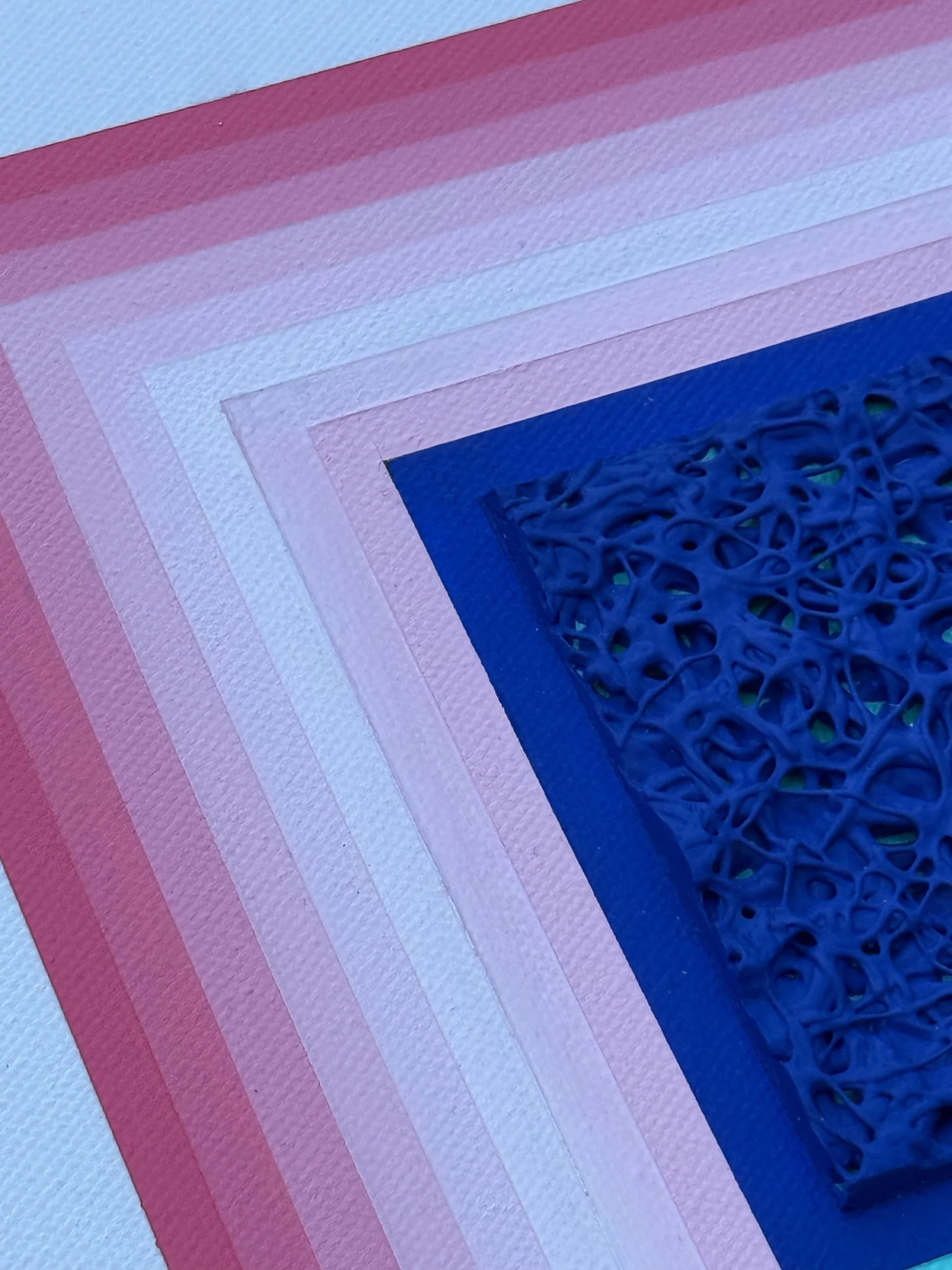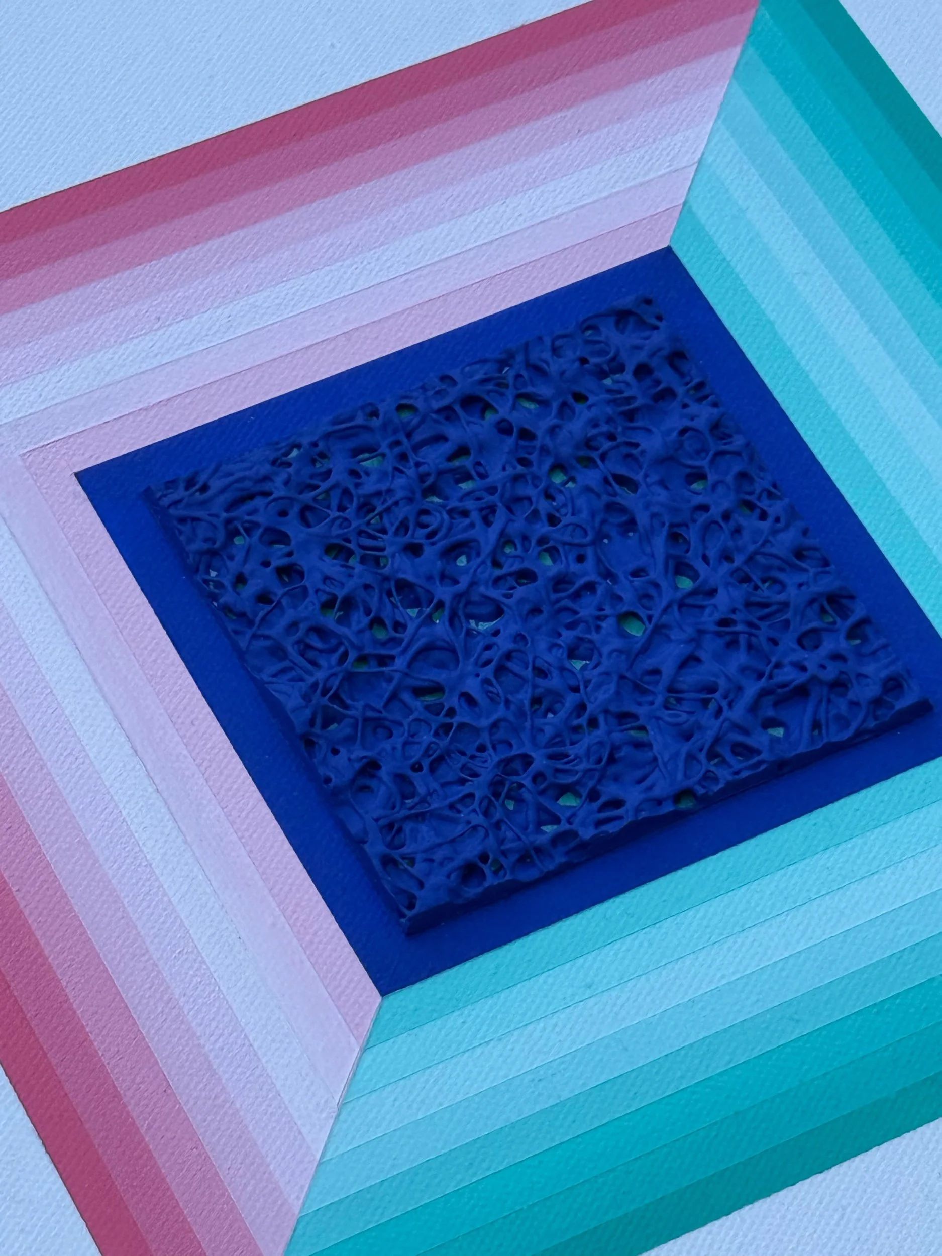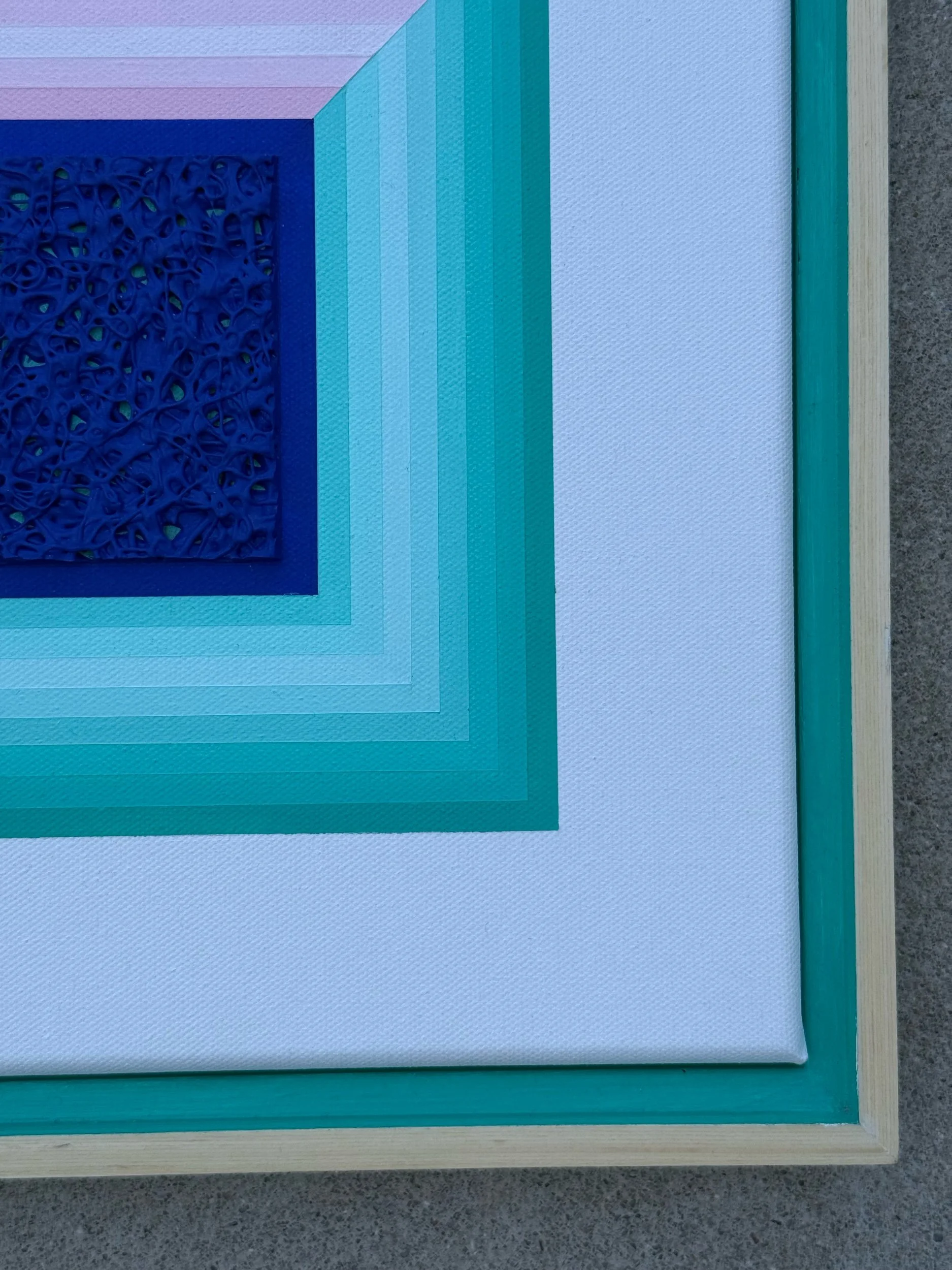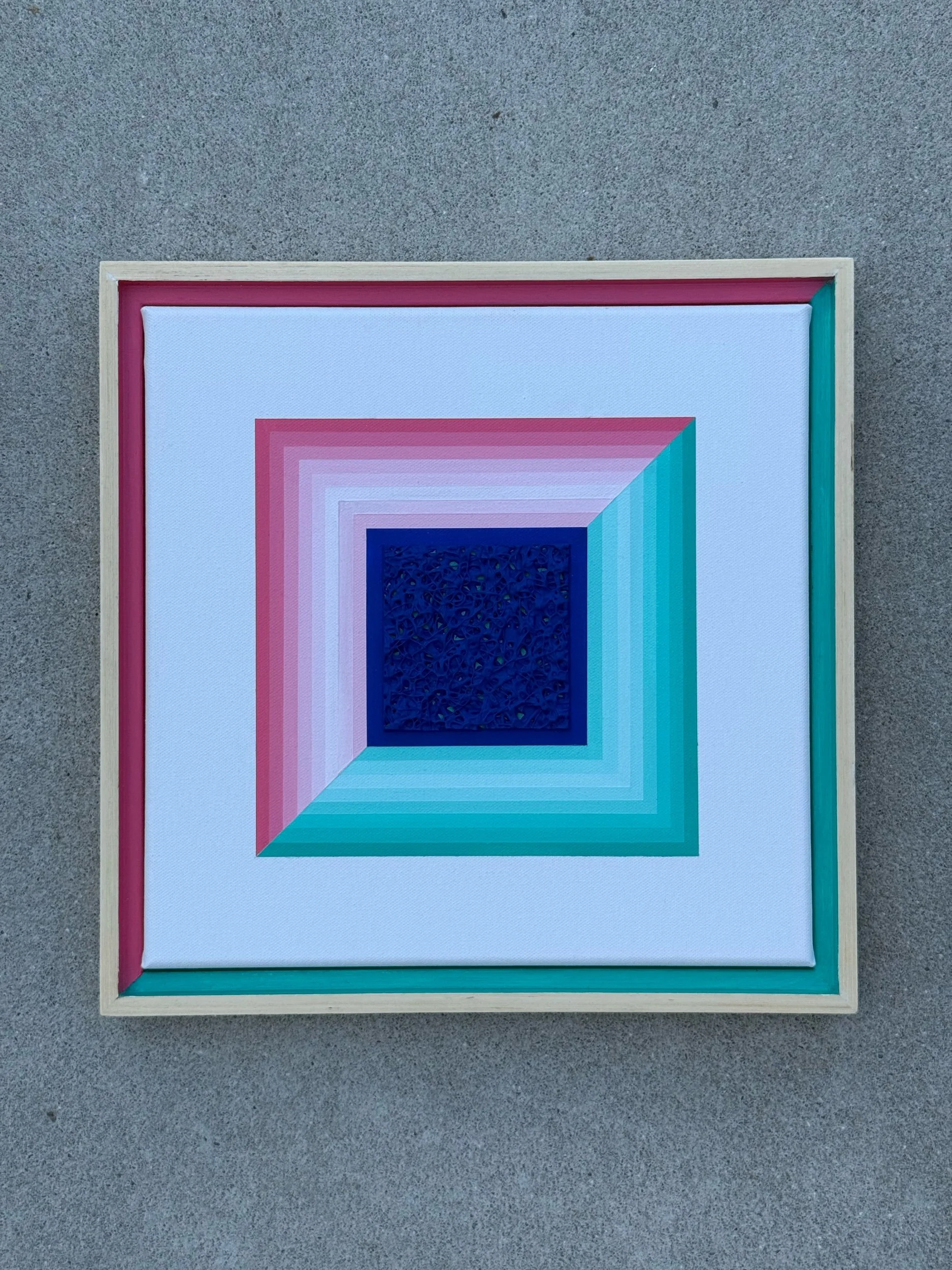 Mixed media painting framed in a wooden frame. This piece showcases a center square split by color. One side is a coral pink and the other is an aquamarine blue. The colors form a gradient pattern. The focal point is a heavily textured dark blue square. The contrast of the lighter tones and deep blue looks fantastic from across the room and draws the viewer into it. A wonderful addition for those with vintage or contemporary style homes.