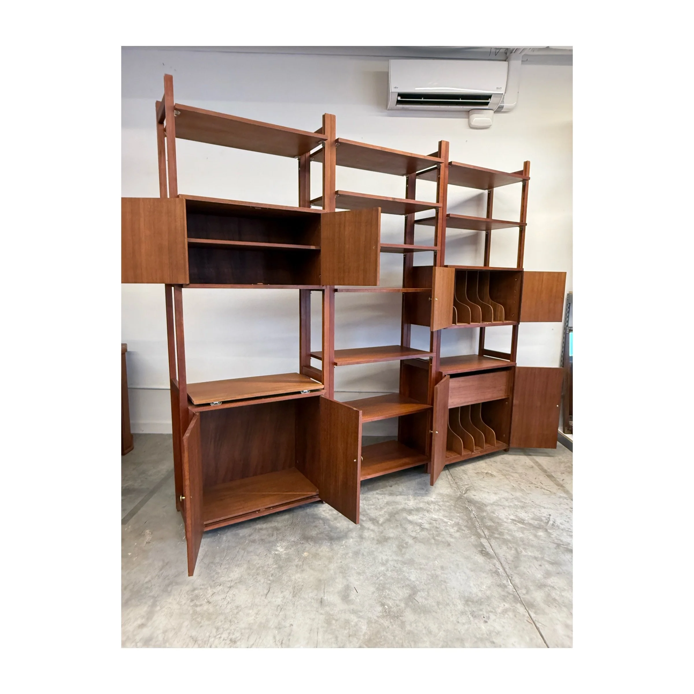 Vintage freestanding wall unit, made from teak. This piece features three separate bays that can be bolted together, positioned to your liking, or used as separated single unites. A wonderful piece with a lot of different possibilities.
