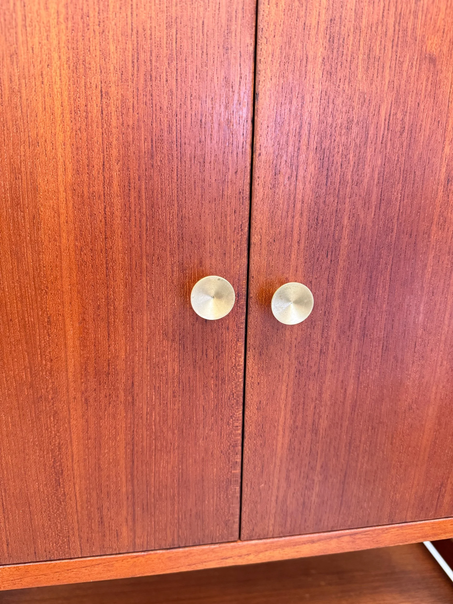 Each section is attached to a teak rail system and the shelves and cabinets are modular allowing you to adjust to your height preference. The cabinets have the original brass rounded hardware that pops against the teak wood. A wonderful piece for a turntable, especially on the slide out shelf, and vinyl storage. In overall fantastic vintage condition with minor wear consistent with age and use.