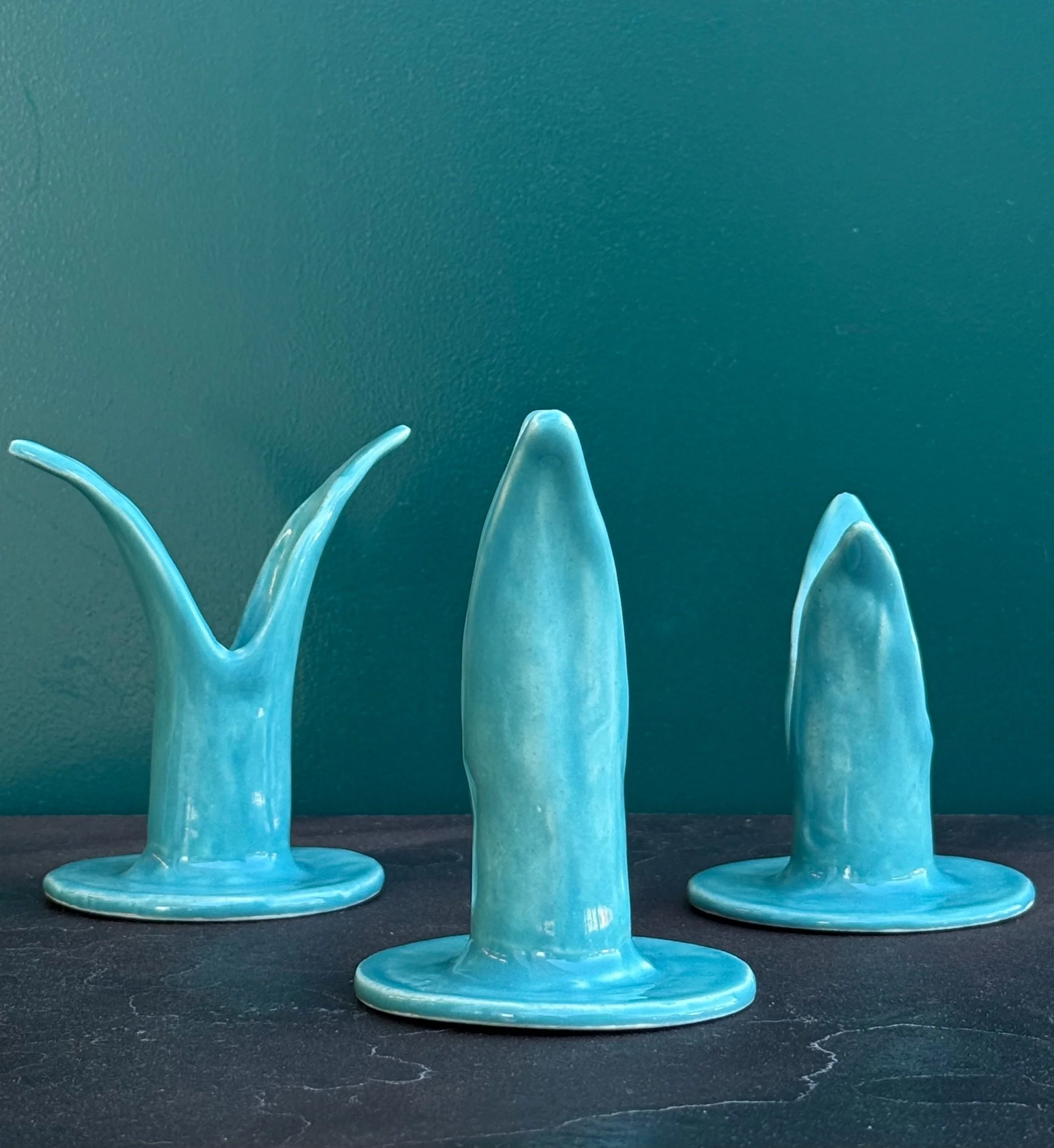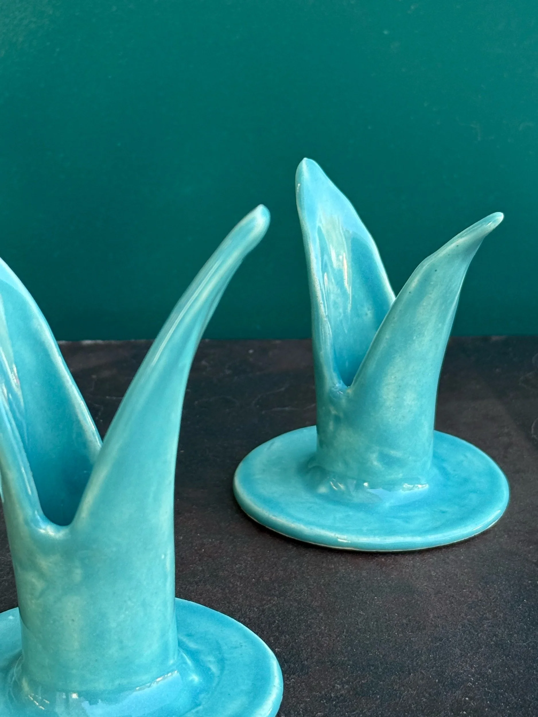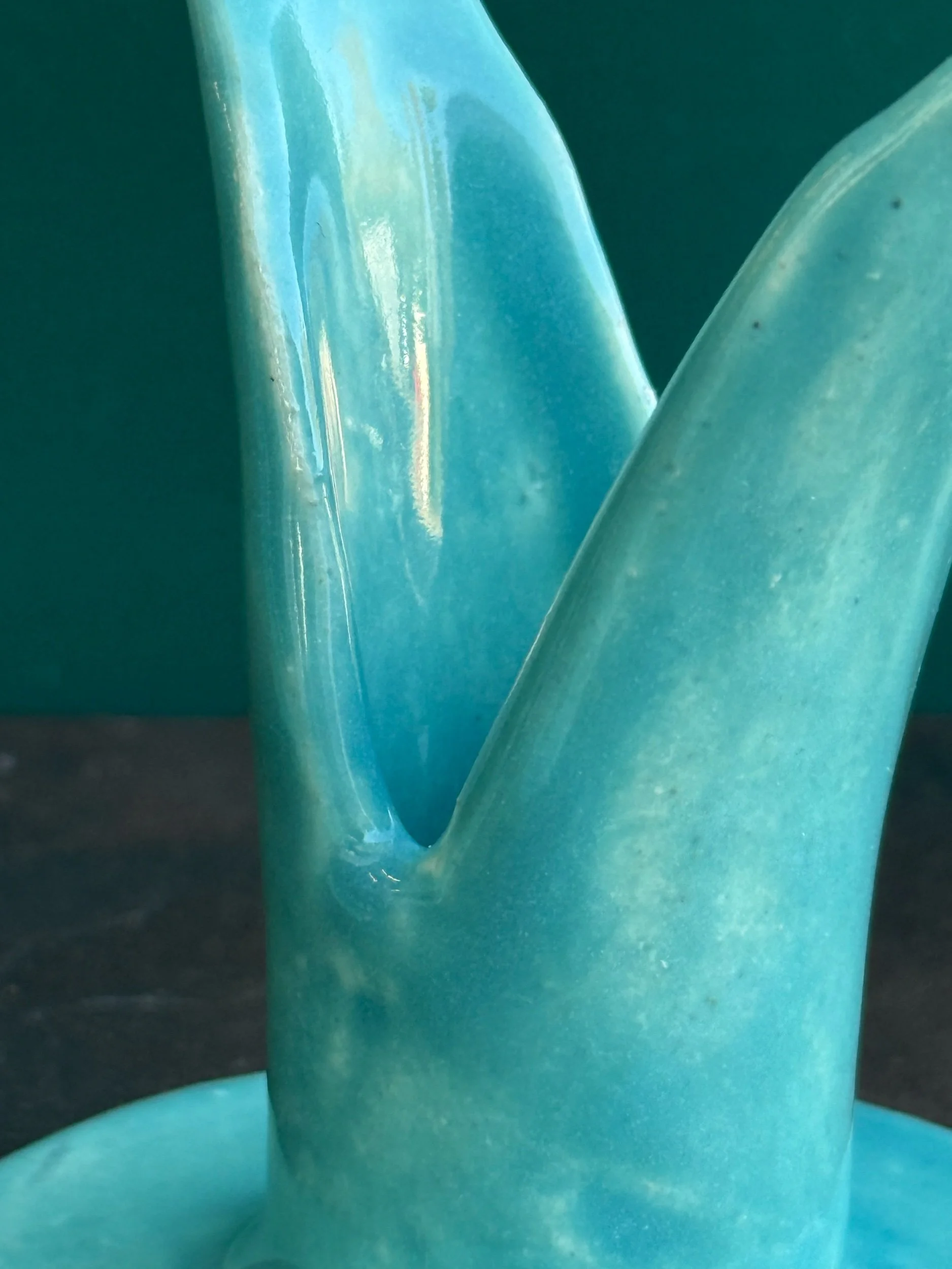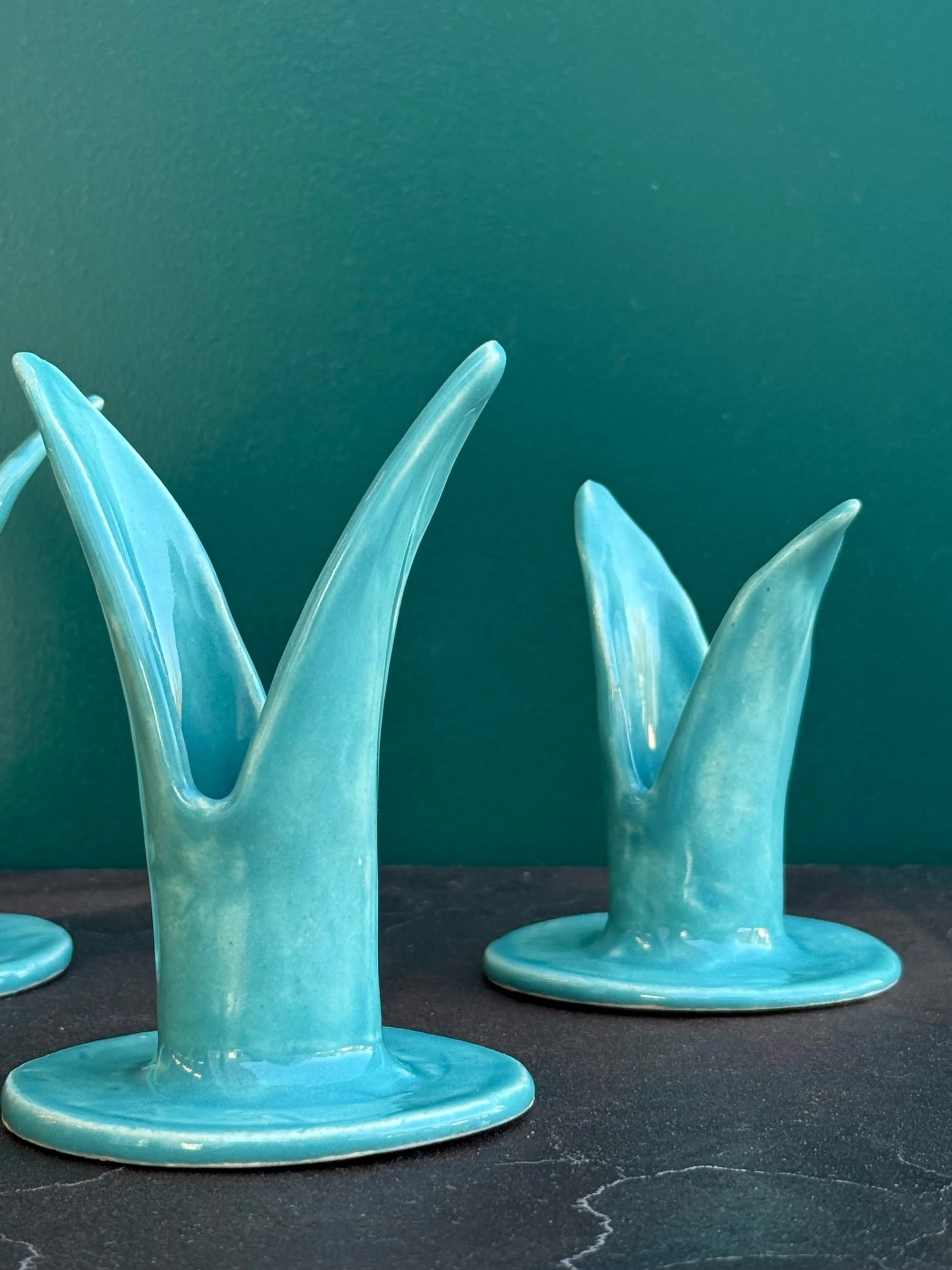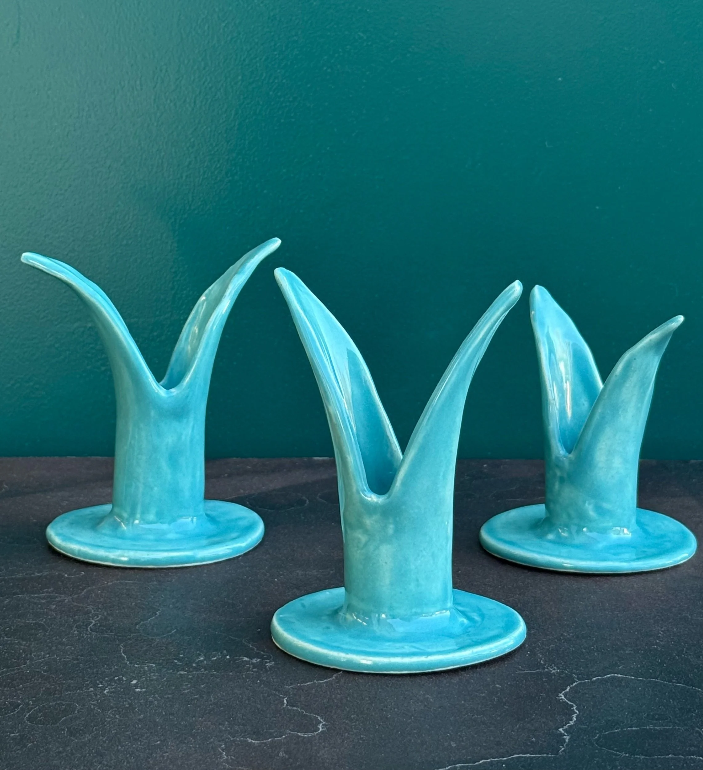 A tulip or ‘v-shape’ with an opening in the middle to hold a tapered candle. Attached to a circular round base. A gorgeous underglaze color of light blue. A perfect piece to add to your dining table decor. We have three available of which you can buy a single or all three. Dimensions are approximate as these pieces are handmade and vary slightly.
