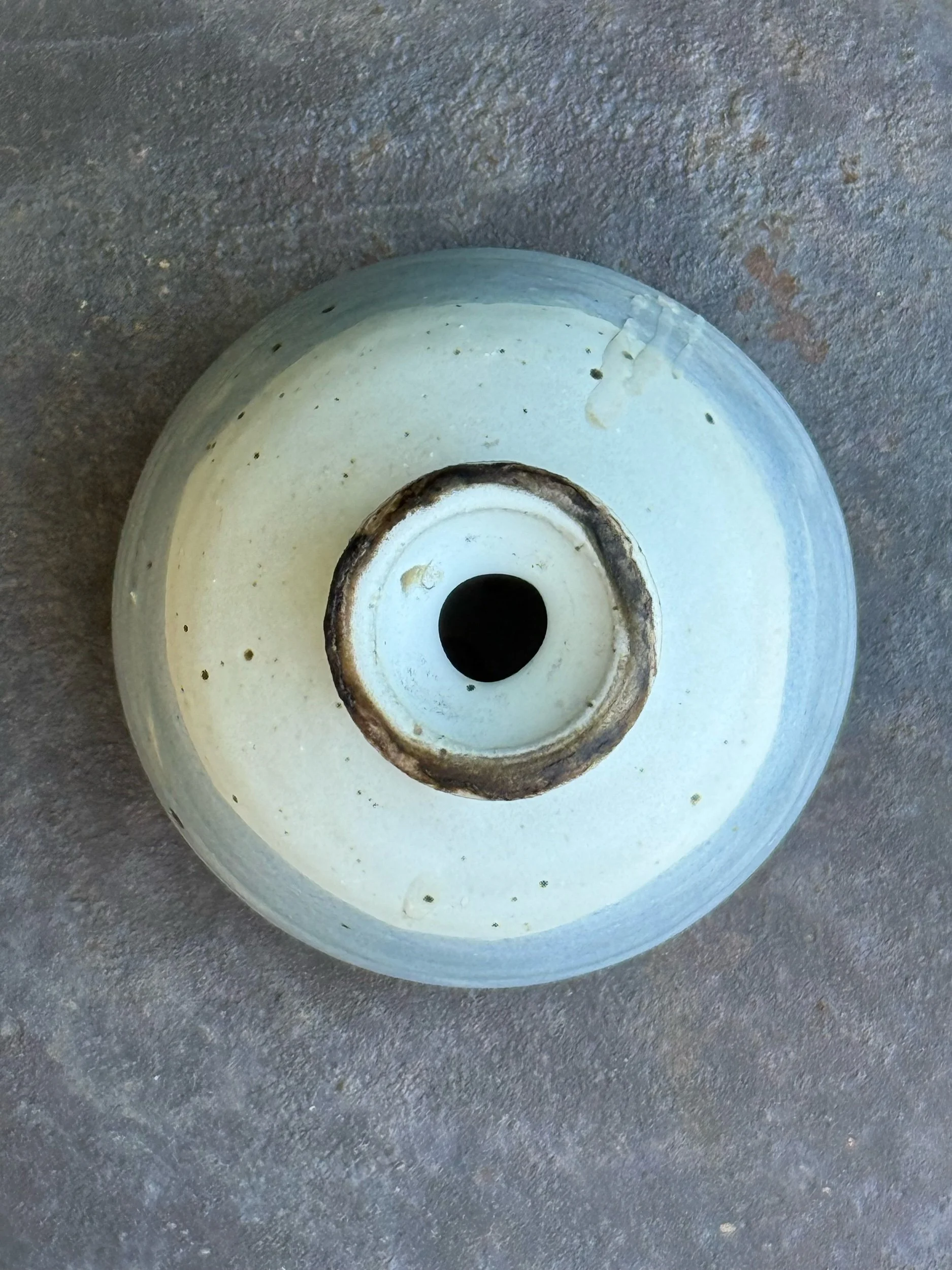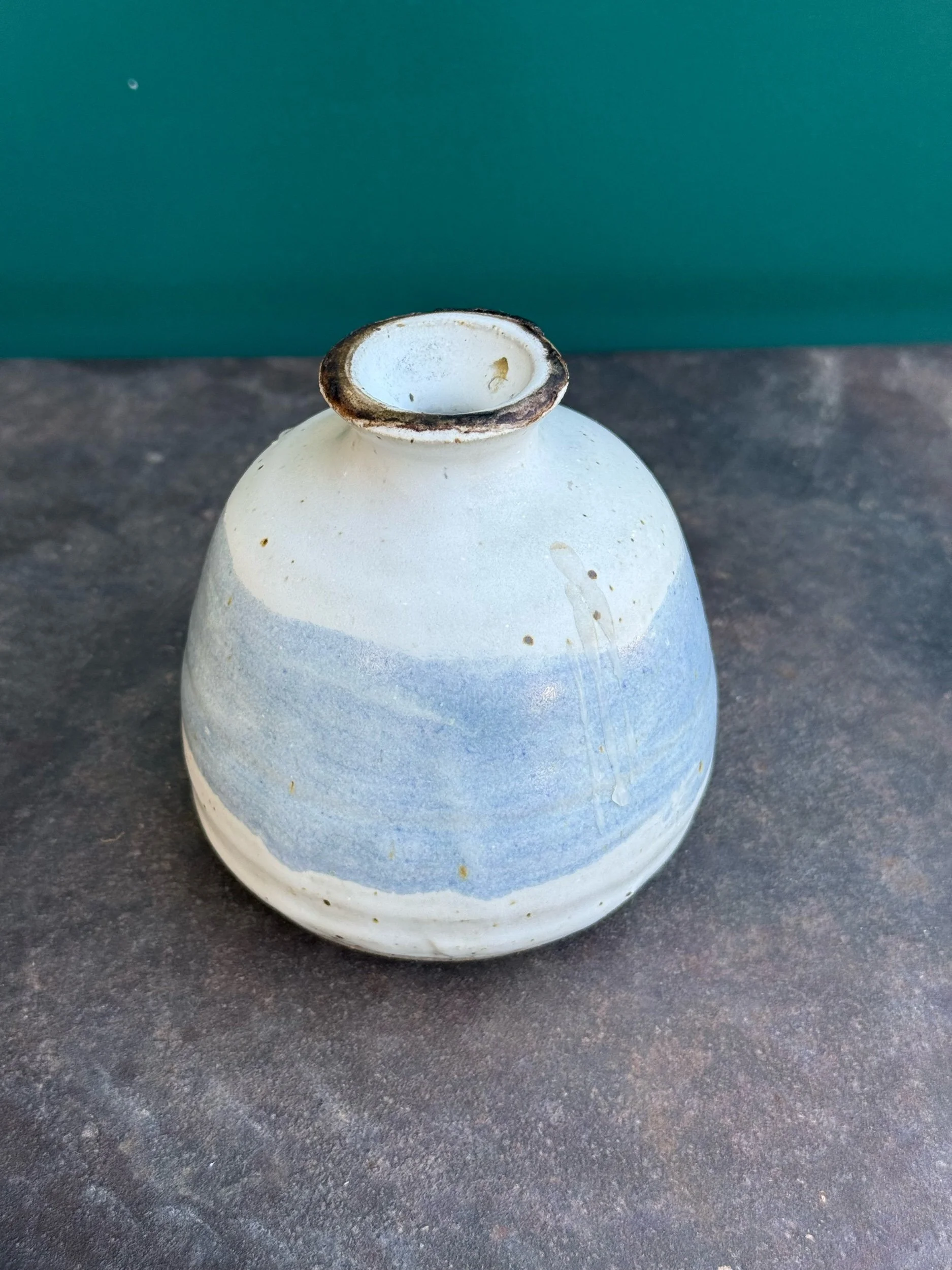 Vintage ceramic small bus vase. White glaze covers the majority of the vase with a stripe of baby blue. Small mouth opening, perfect for tiny buds. In overall good vintage condition with some wear present consistent with age and use.