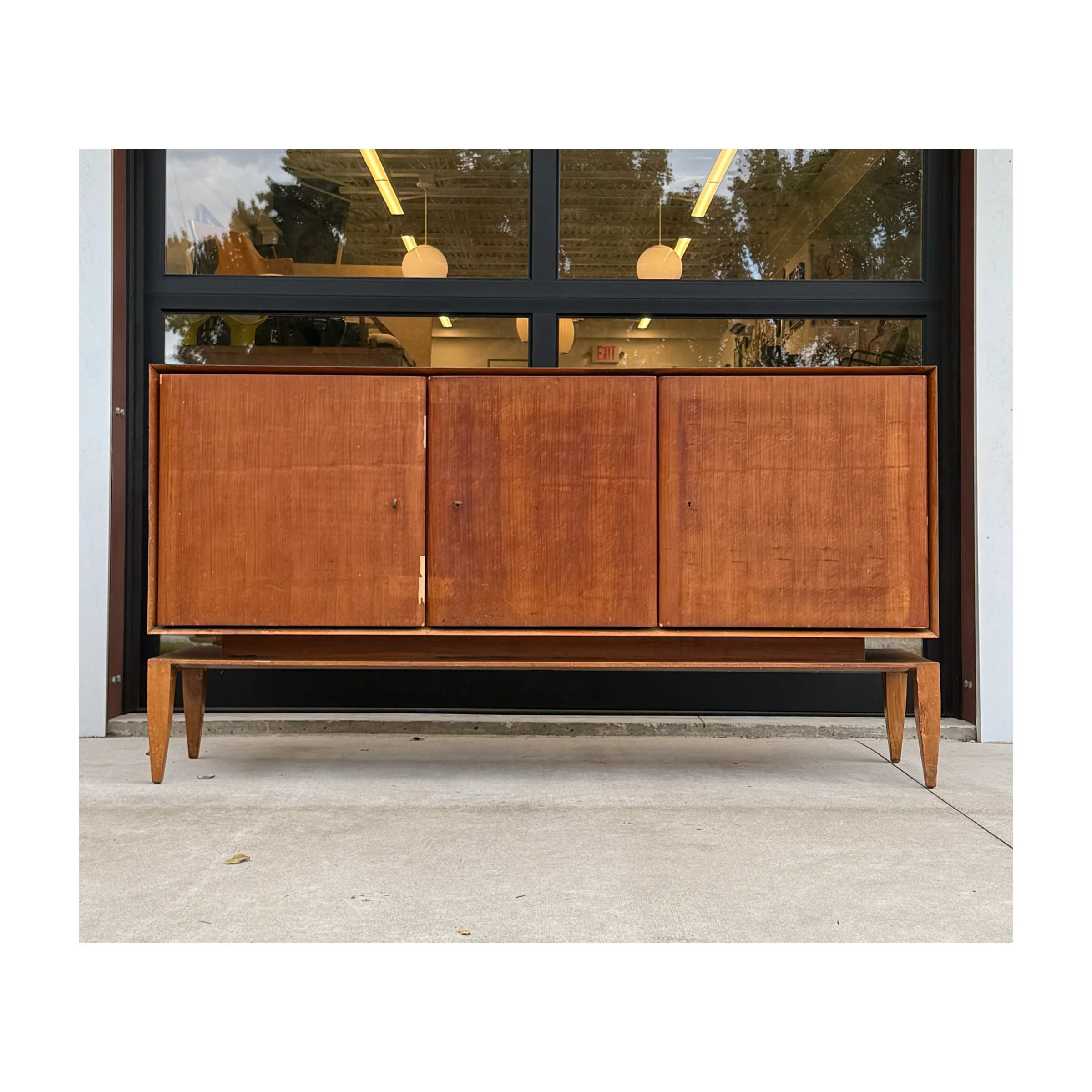 A stunning mid-century modern credenza by the legendary Italian designer Gio Ponti, crafted circa 1950–1951 for M. Singer & Sons. This exquisite Model 2160 features a sleek, low-profile walnut veneer body with three symmetrical flush doors subtle raised panel detailing. Elevated on four elegantly tapered legs that angle outward, the design exudes Ponti’s signature “thinline” aesthetic—light, functional, and effortlessly sophisticated.