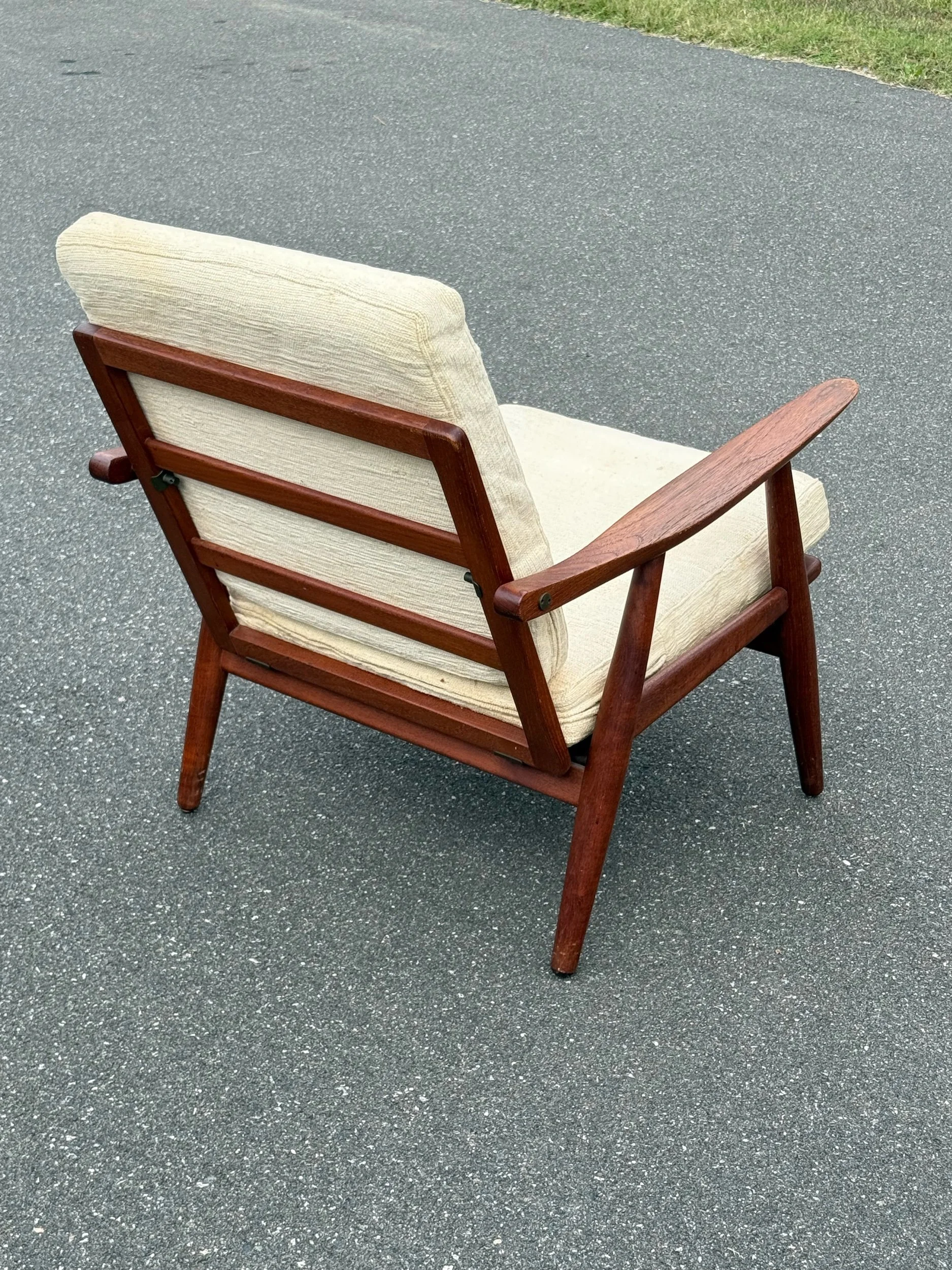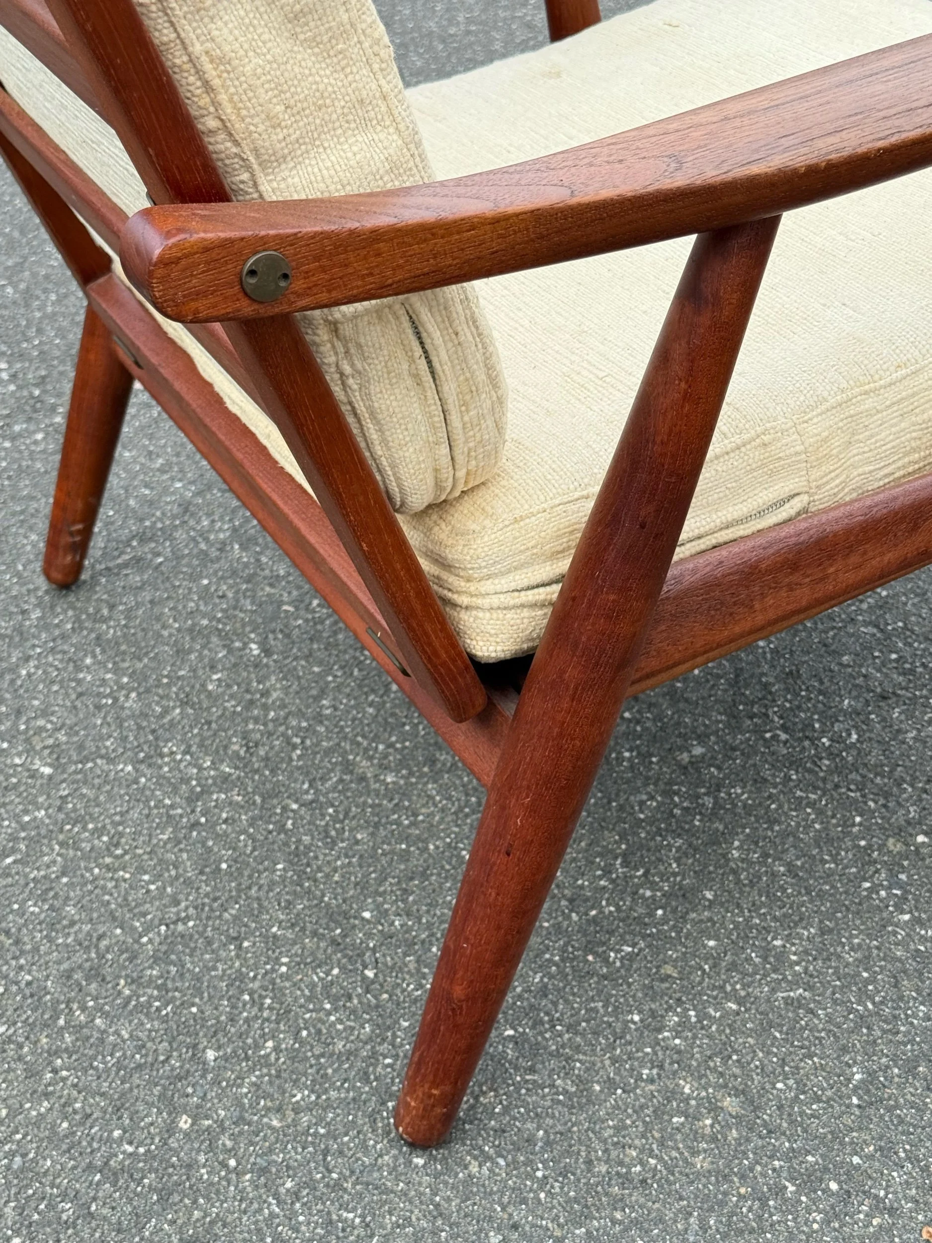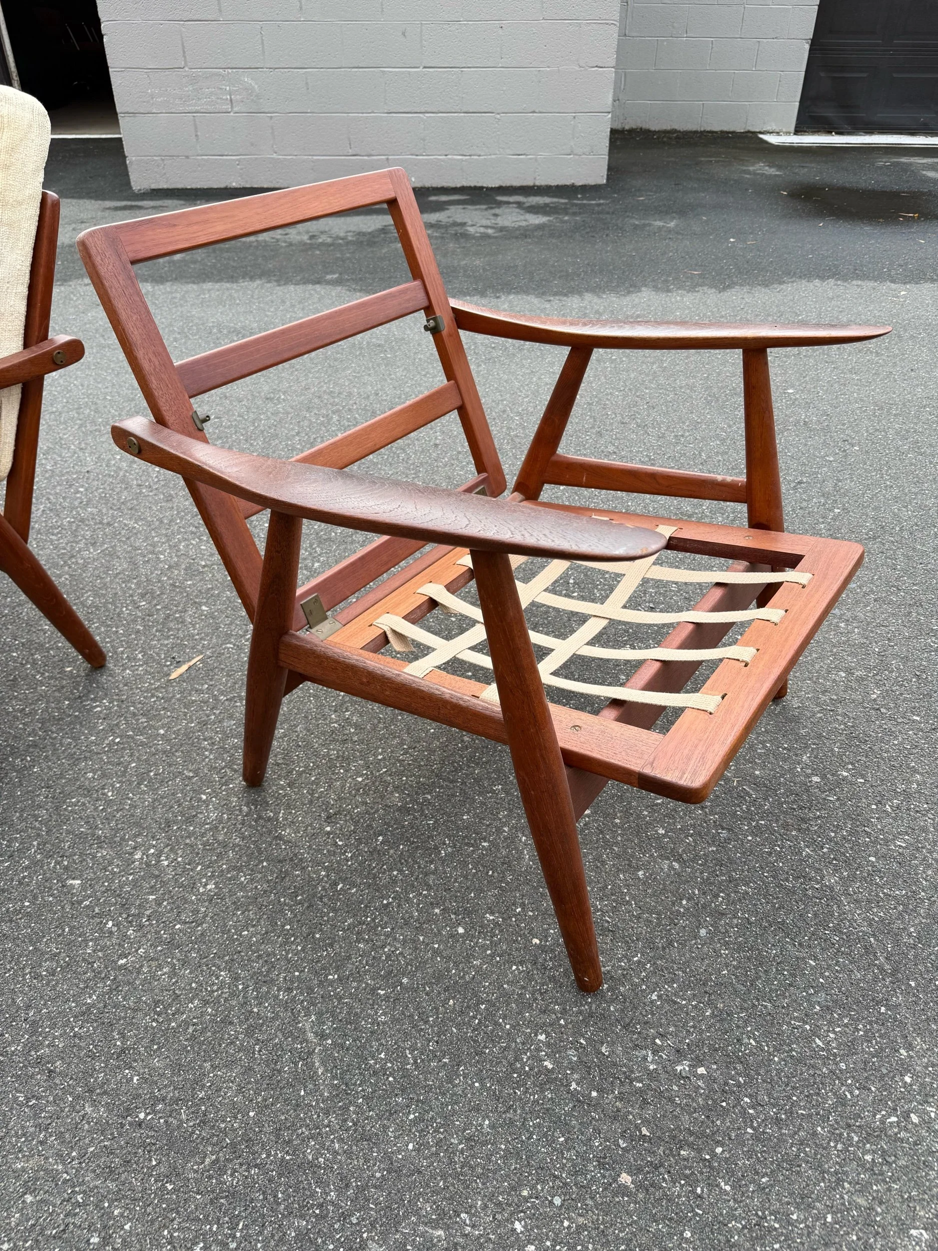 A pair of vintage model GE-70 lounge chairs designed by Hans J. Wegner for Getama, Denmark. A stunning pair made from sculpted teak frames in a warm wood tone. In classic Danish style, the frames are streamlined without being too overcomplicated and showcasing true craftsmanship. The armrests have a gentle swoop and rounded ends. The armrests are connected to the legs of the lounge from the side profile. The legs are long are tapered while their tilted position makes this pair a statement. The joinery is fantastic along with the subtle details. The frames are in great vintage condition. The fabric is original and unaltered. A perfect candidate for reupholstery with new foam and fabric.