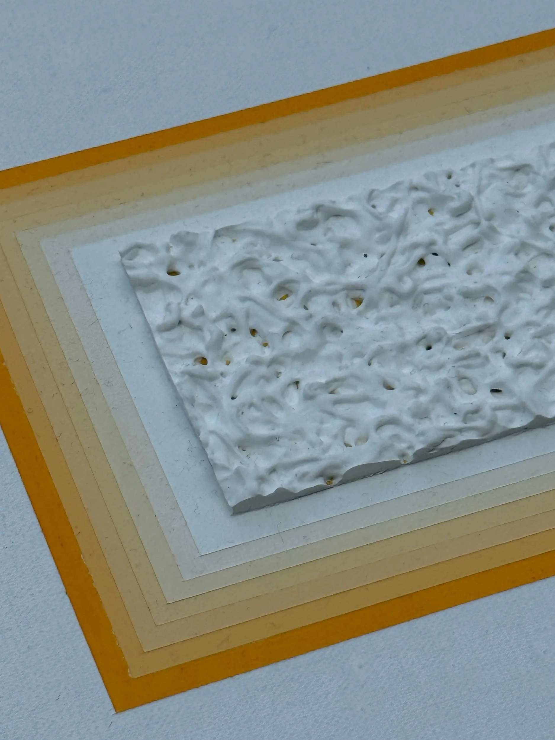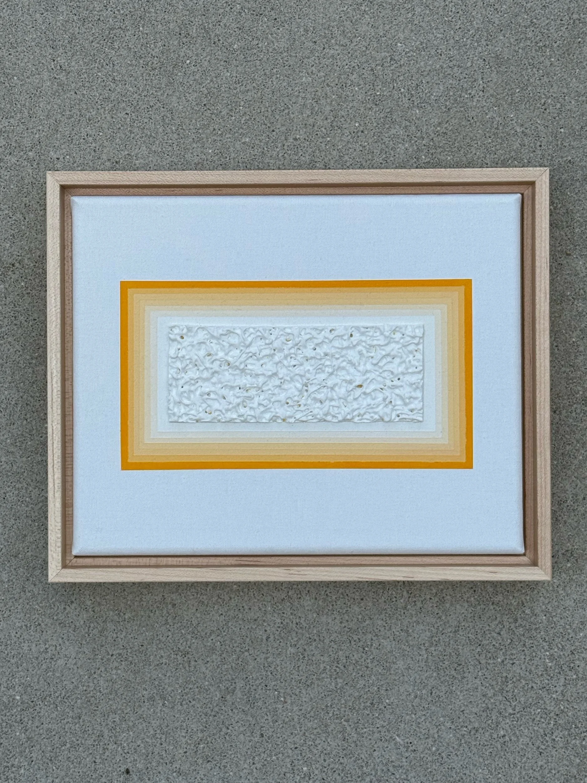 Mixed media artwork with yellow gradient lines that form a rectangular shape. The focal point of the canvas leads to a heavily textured middle. McKellar contrasts fine and precise line work with texture - a wonderful and quite fun balance. Framed in a wooden maple floater frame. This piece is small-scale, yet draws you into it and would be a wonderful addition to those with vintage or contemporary style homes.